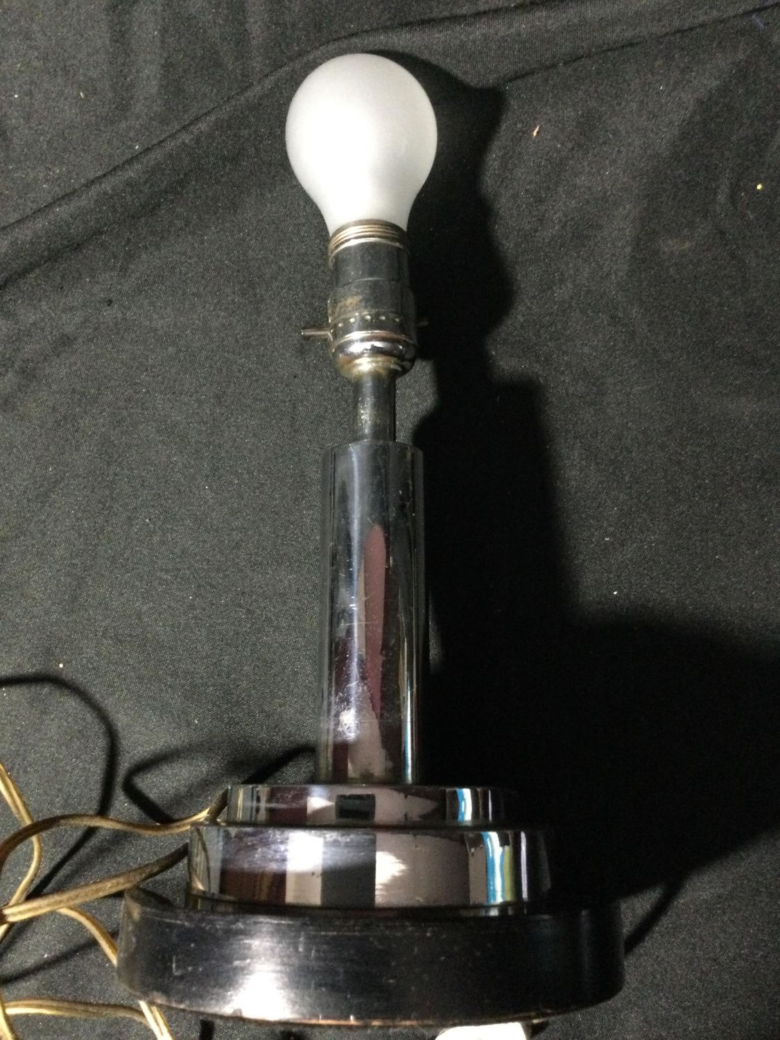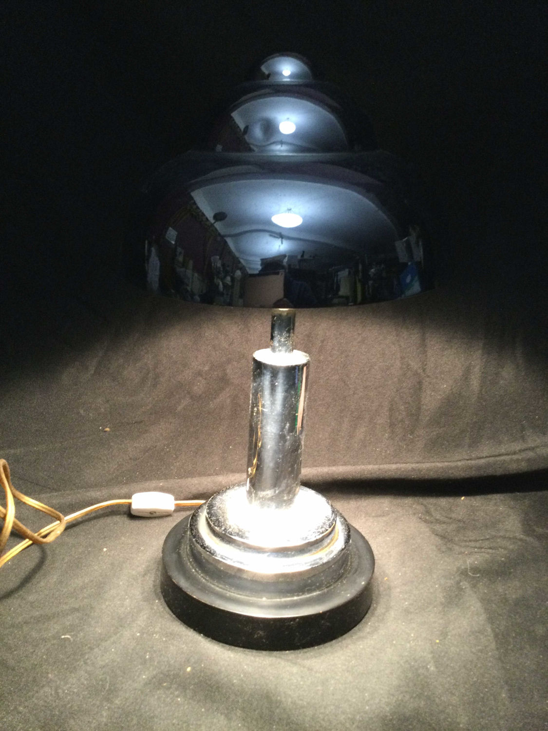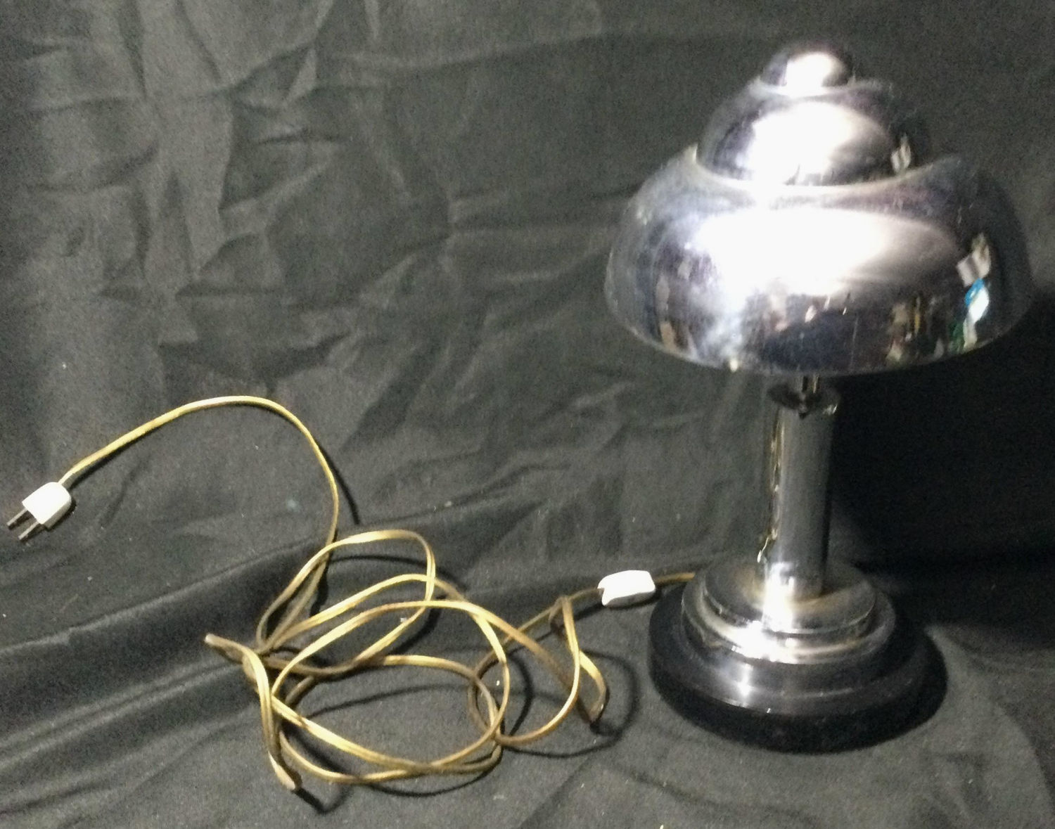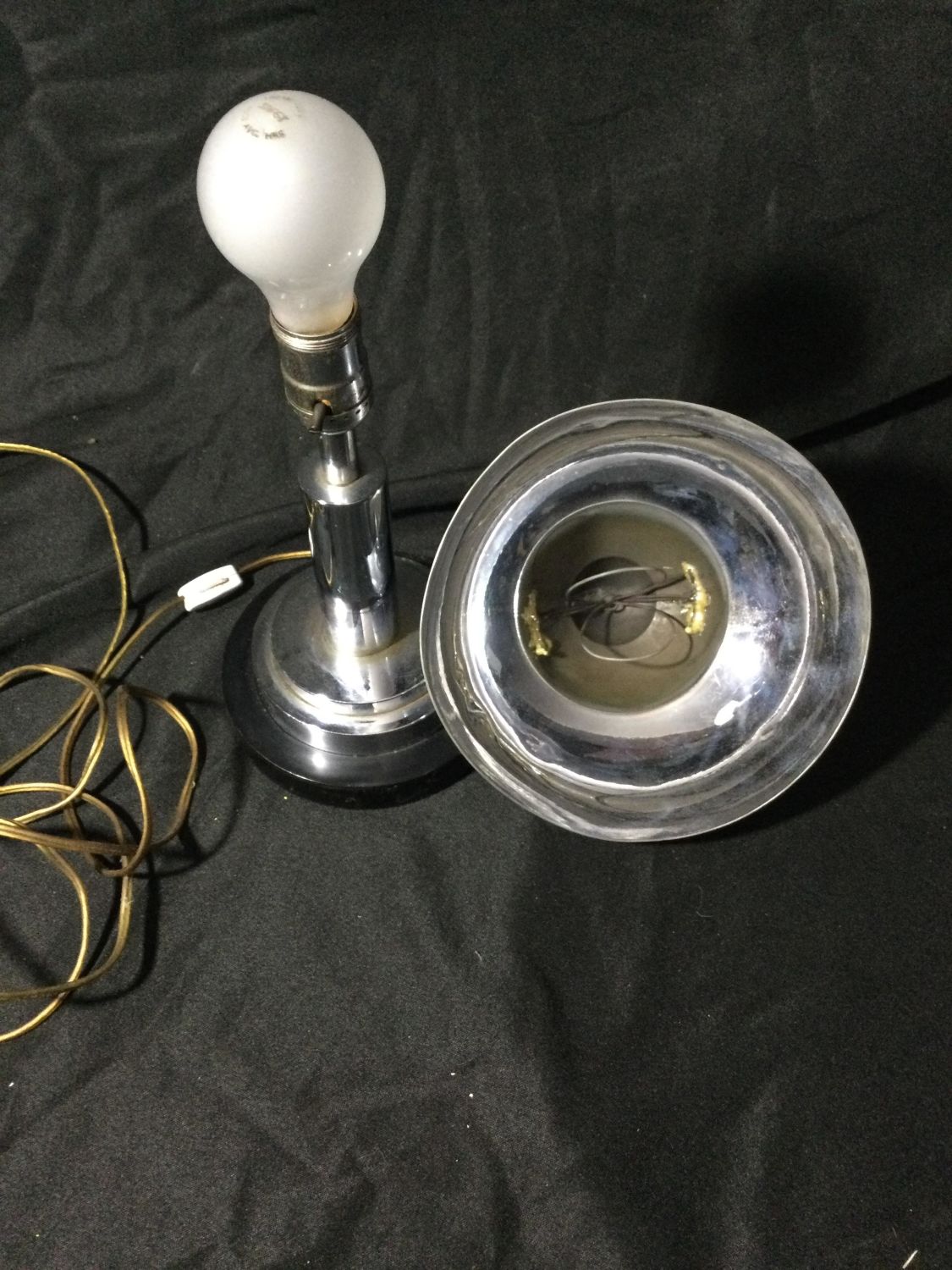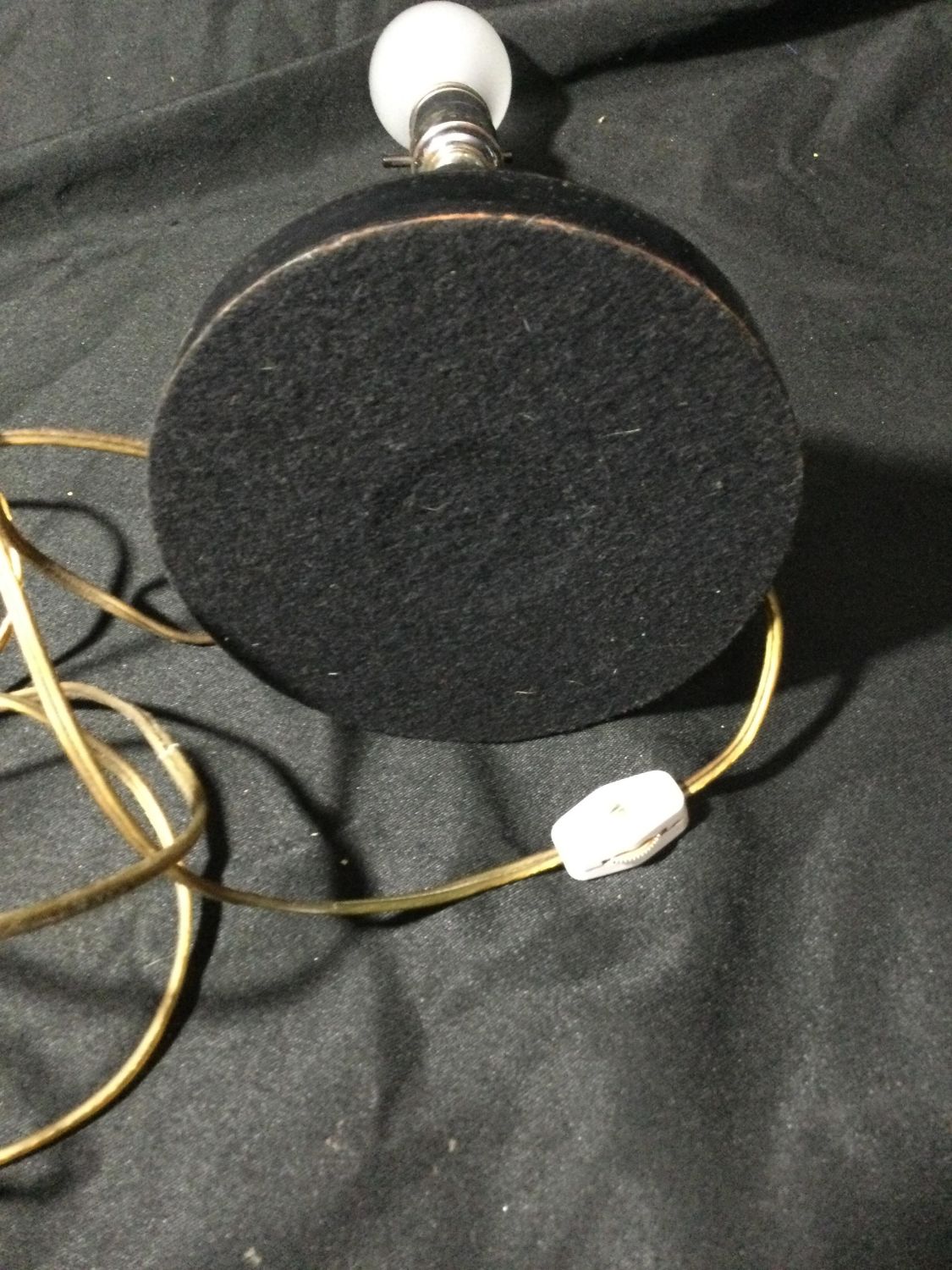 Metal, measures 14 inches high, shade is 8 inches wide, with in-line switch