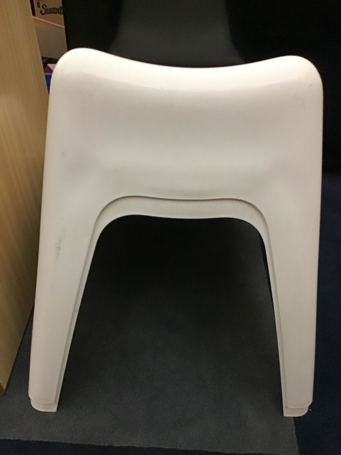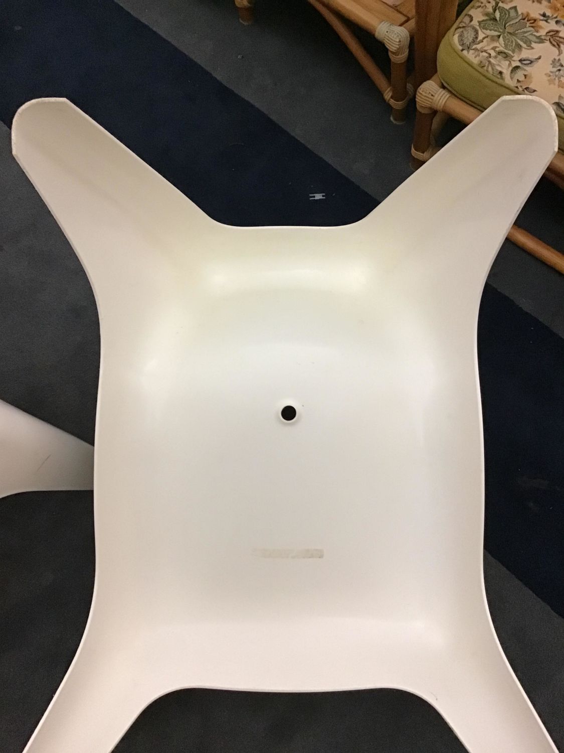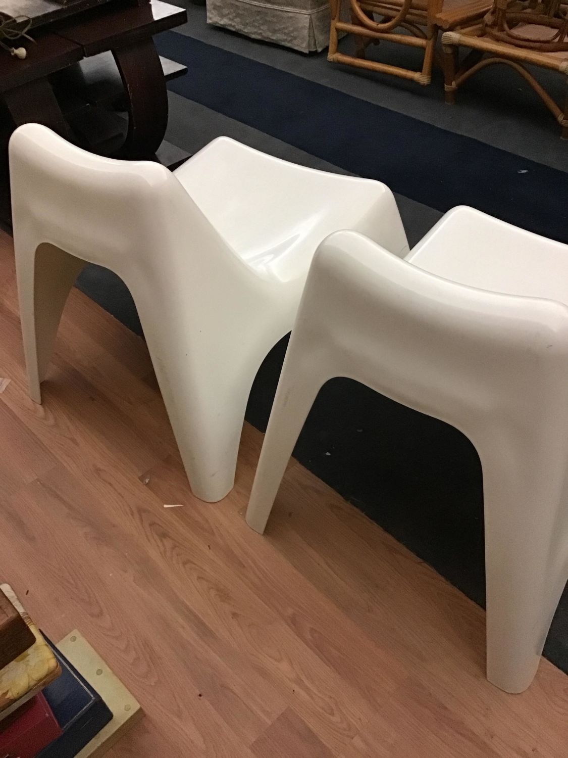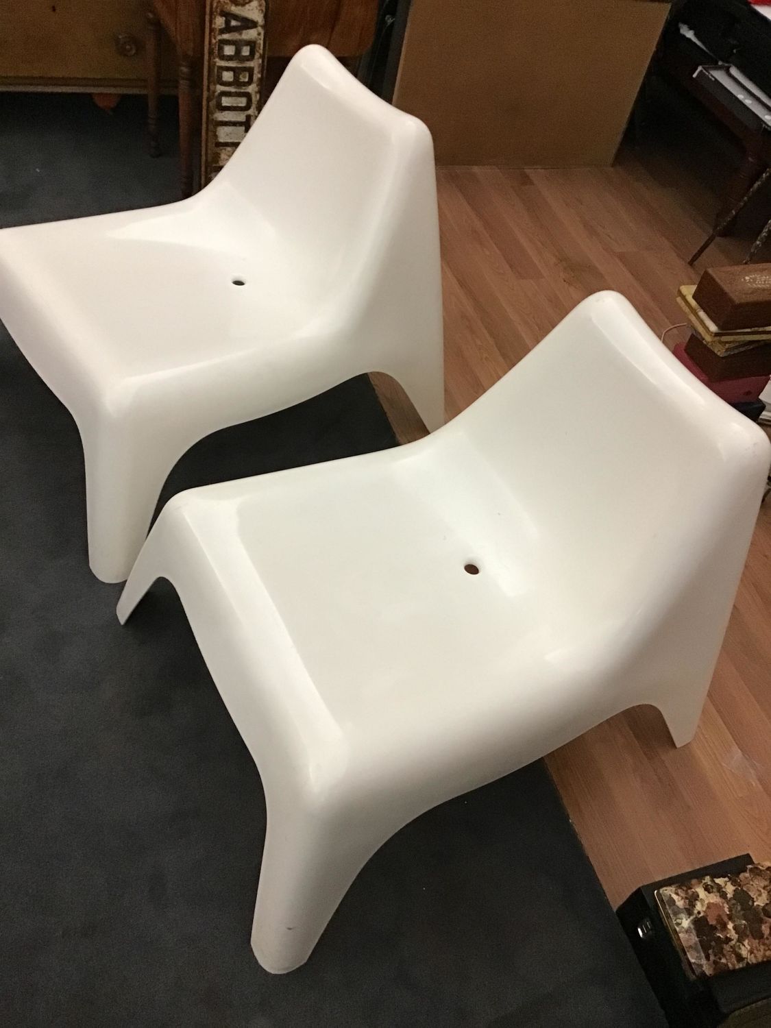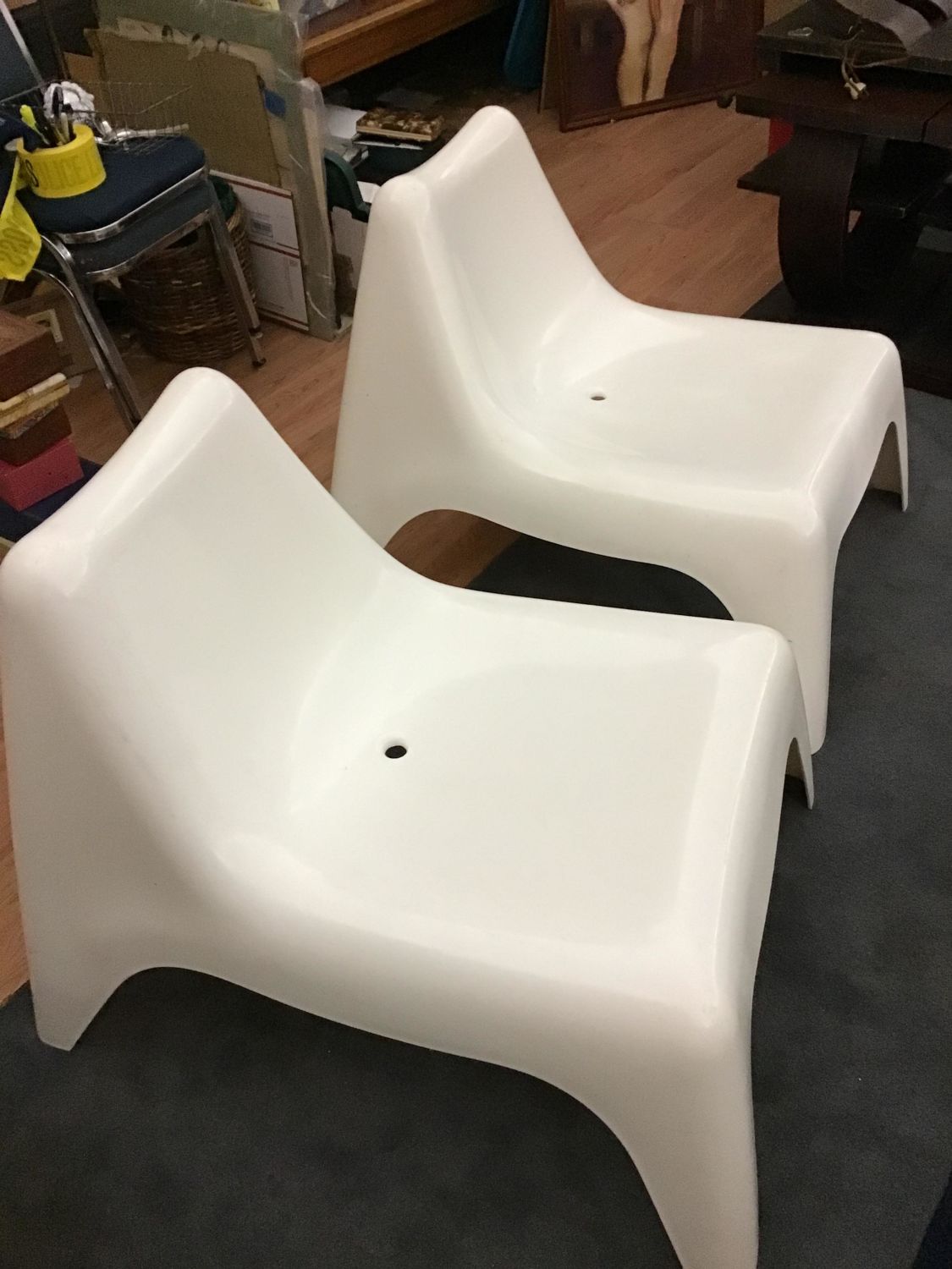 Made of hard plastic. Form Stacking with mild scratches on back legs. Each measures 28 inches tall at back by 34 inches front to back by 25 inches wide