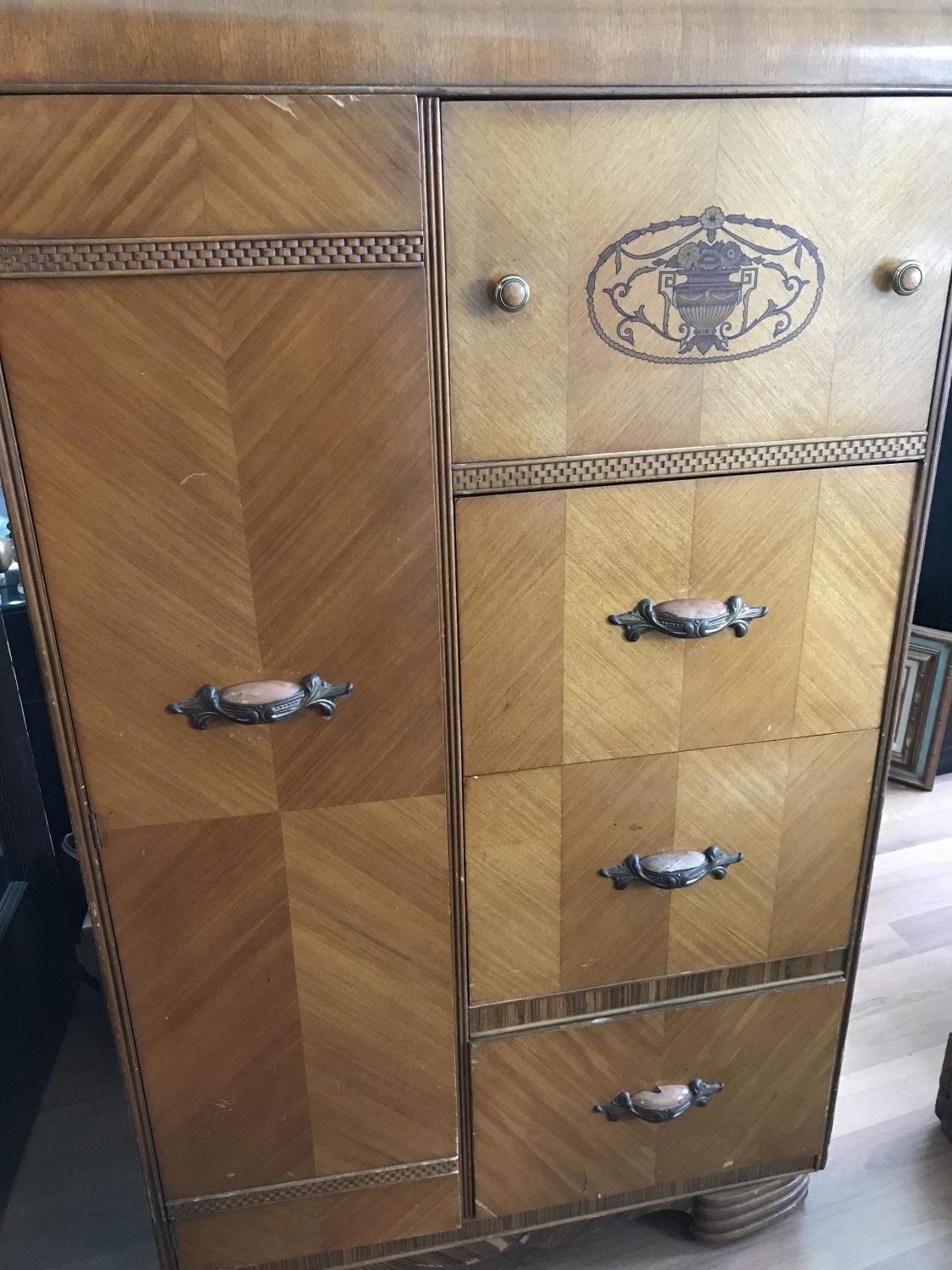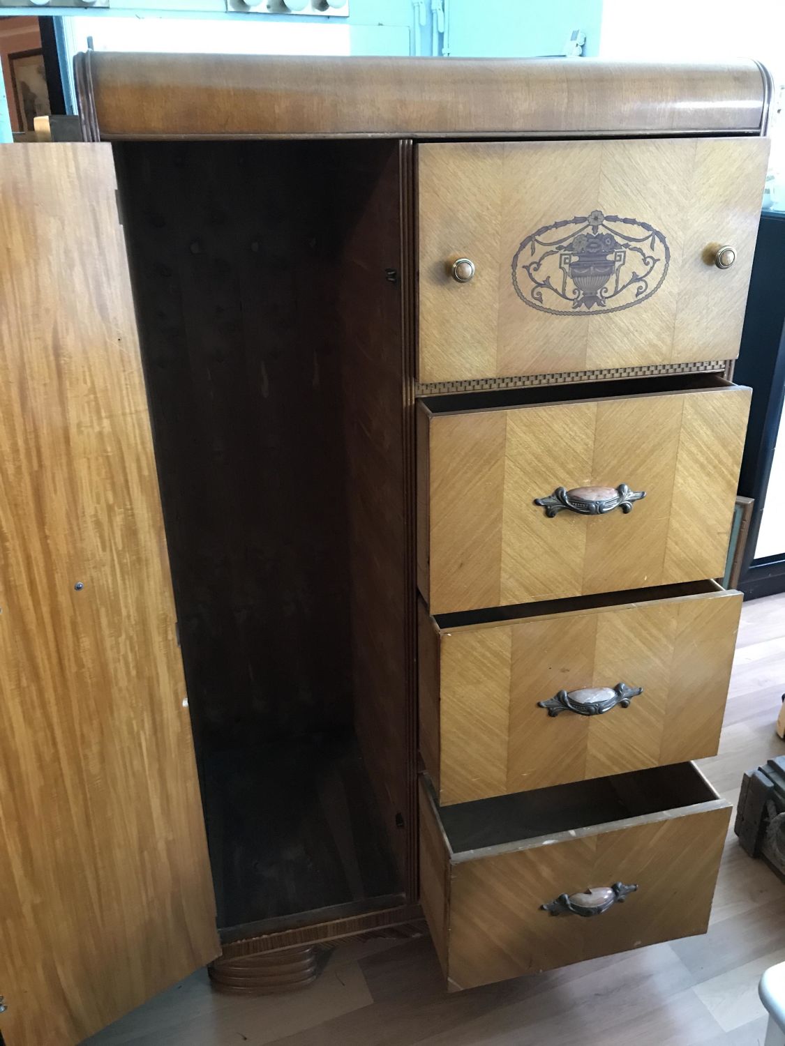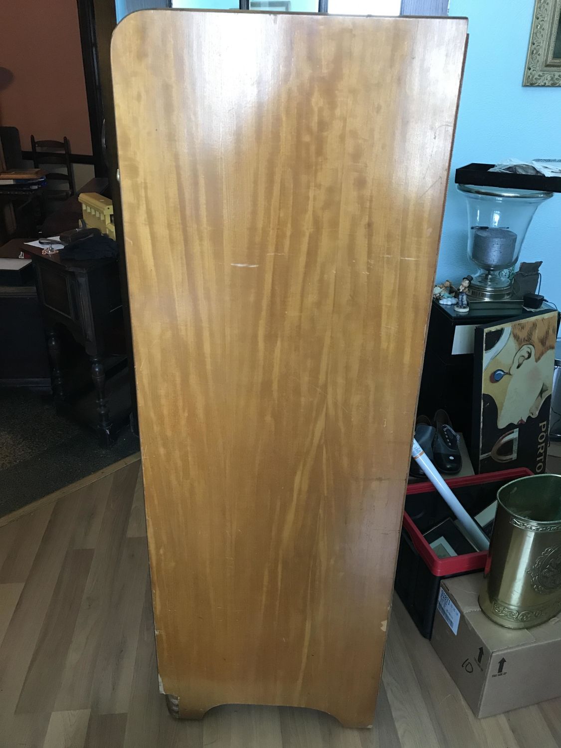 with garment area, measures 62 inches tall by 35 3/4 wide by 21 inches deep. Beautiful handles, one handle broke.