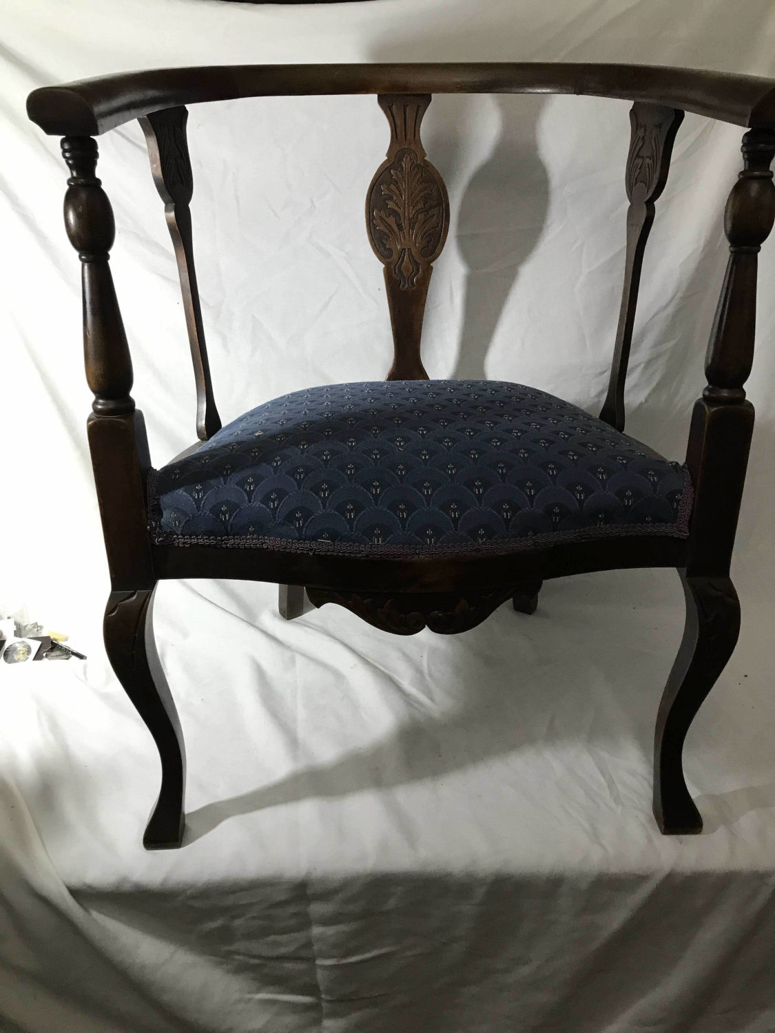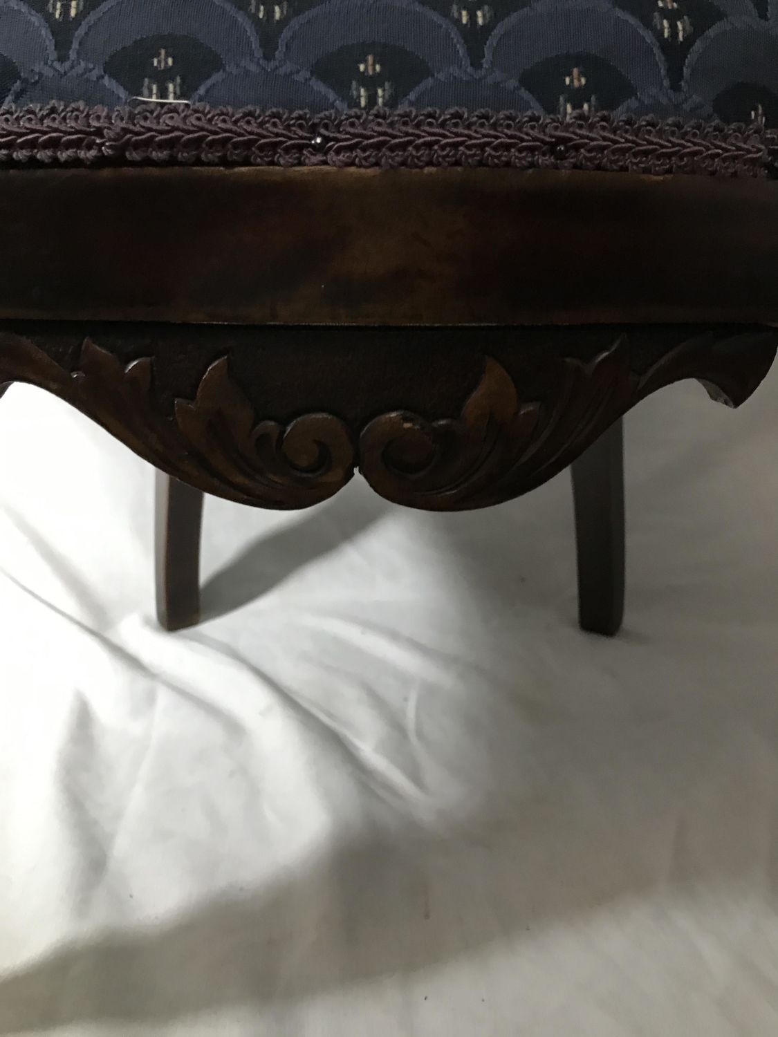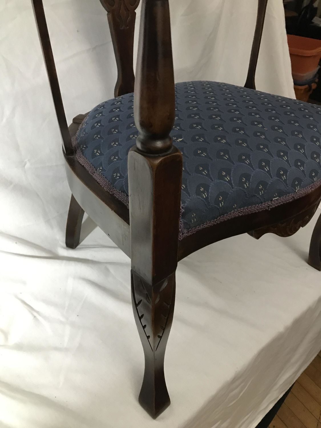 Wooden Etchings in supports in front with vintage blue covered seat, Measures 24 x 29 inches