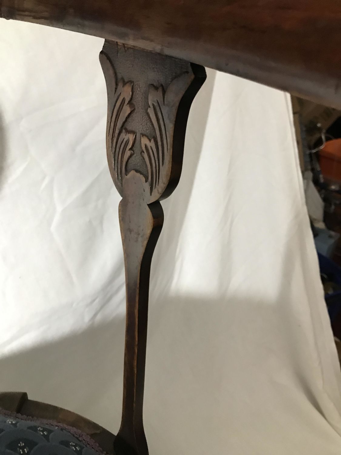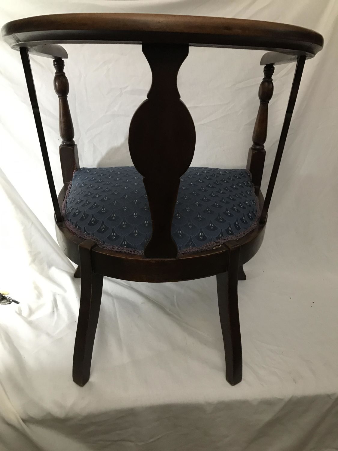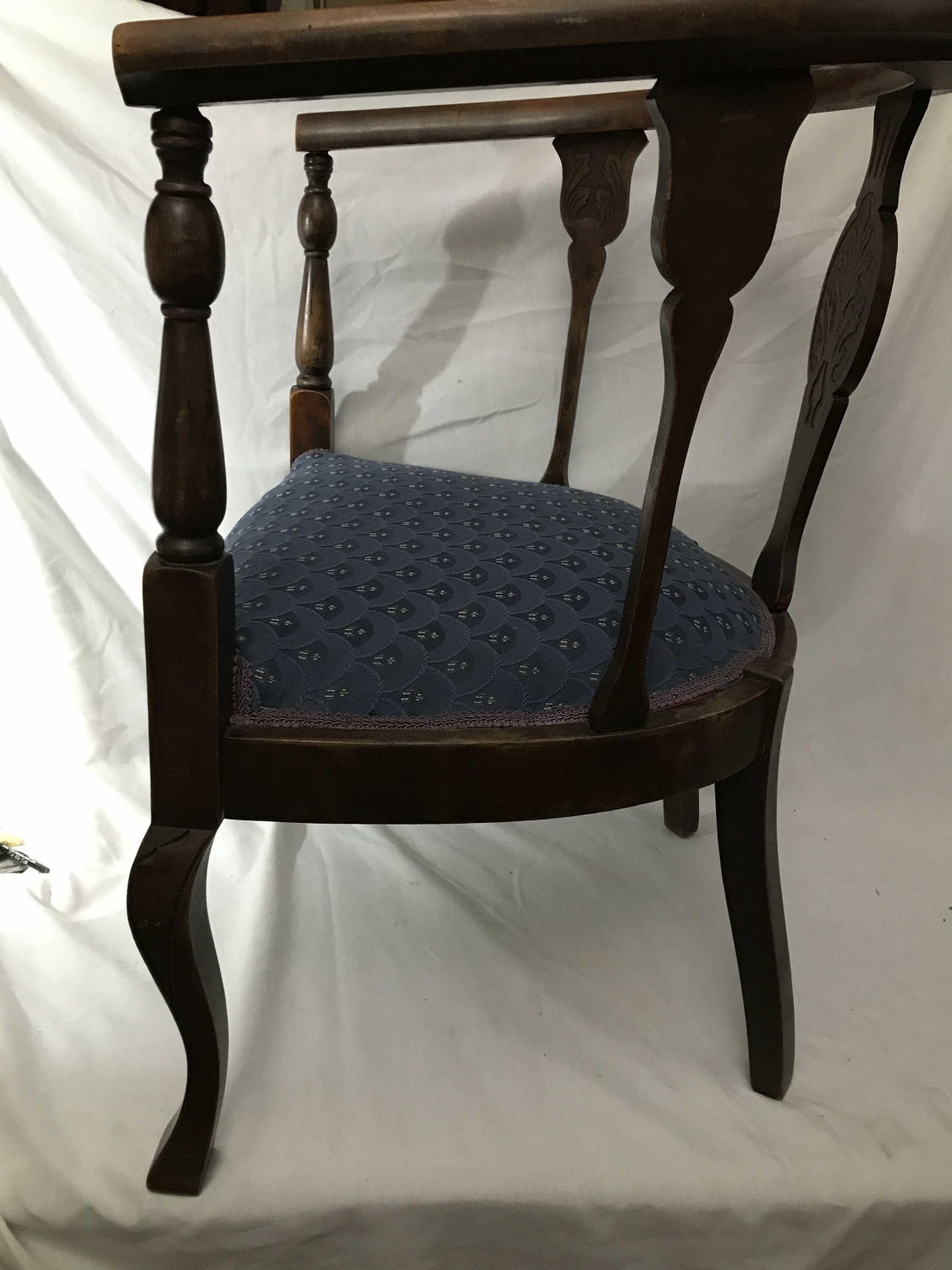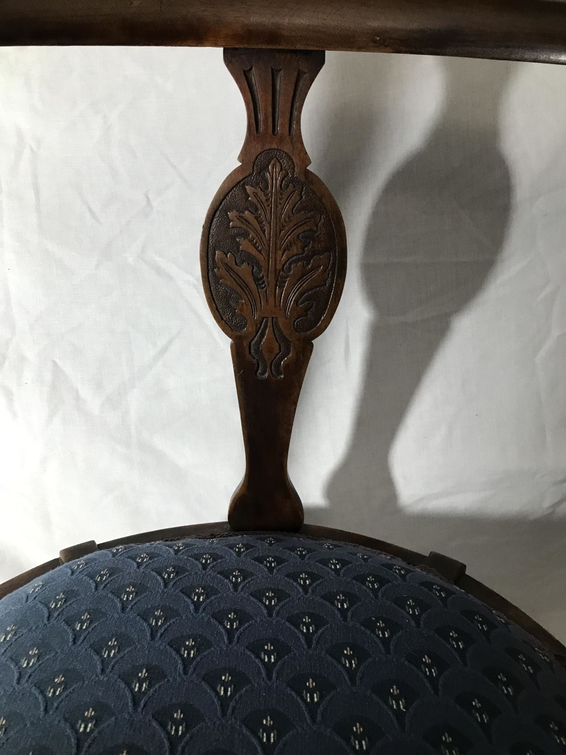 Wooden Etchings in supports in front with vintage blue covered seat, Measures 24 x 29 inches