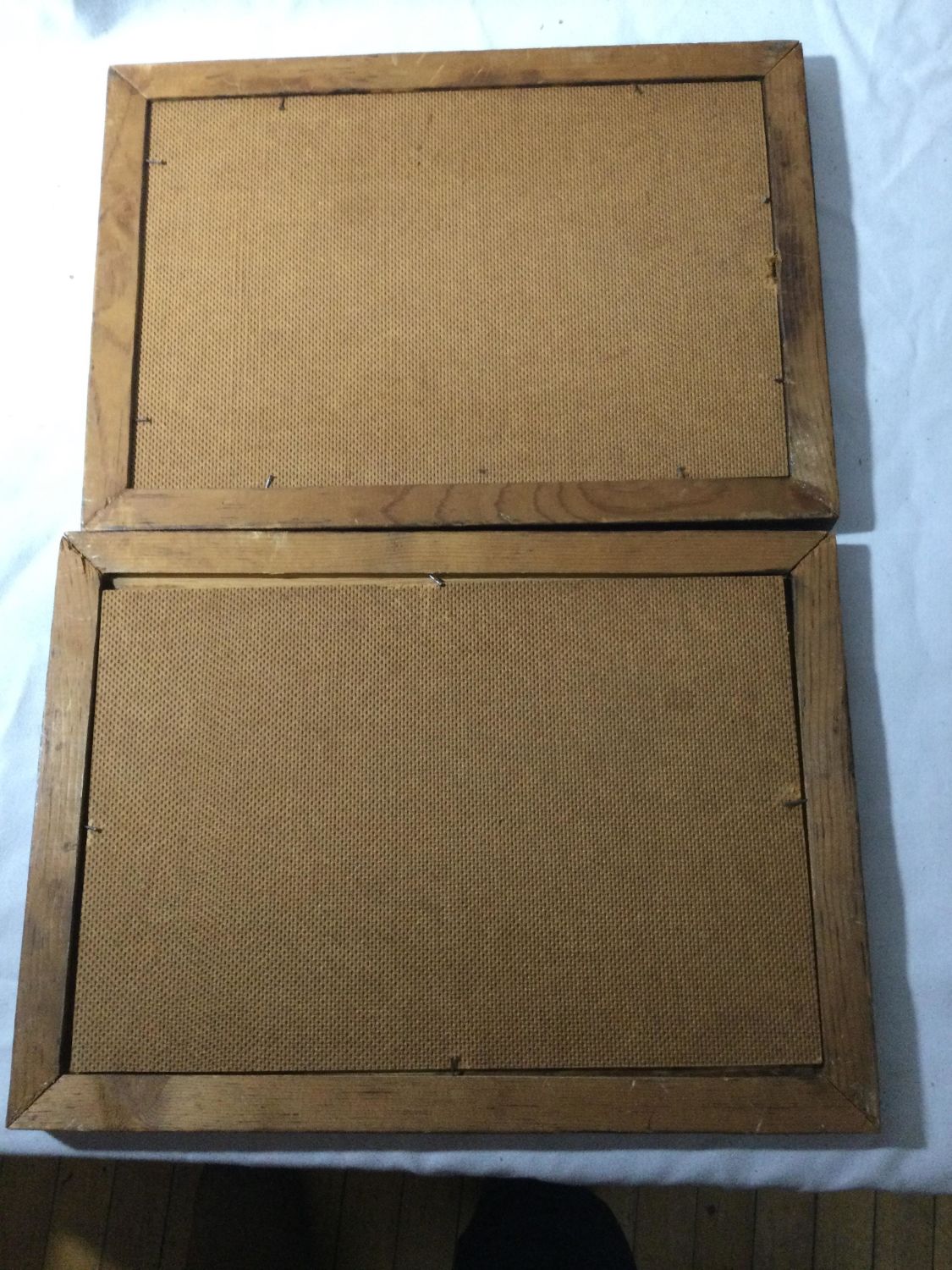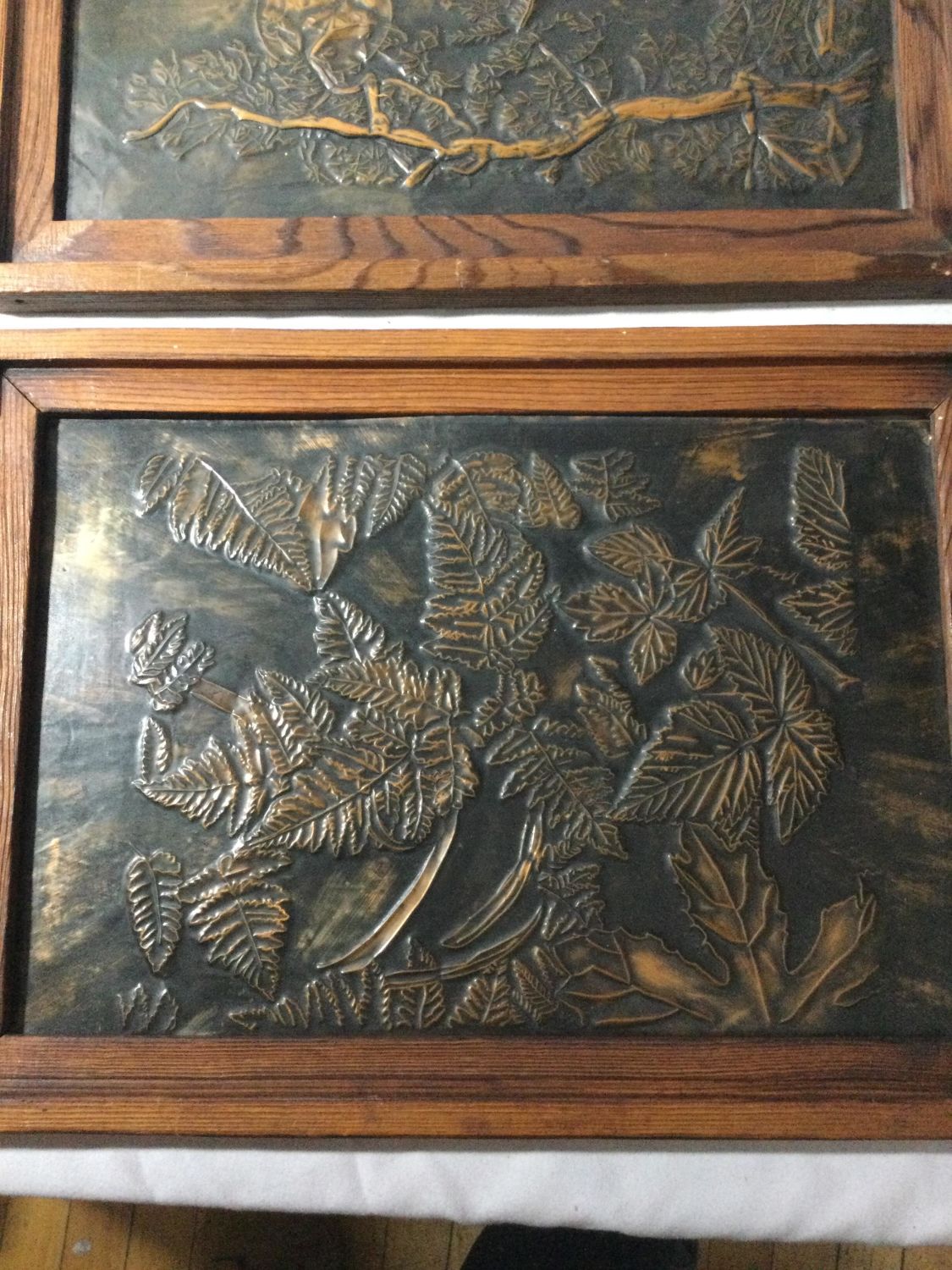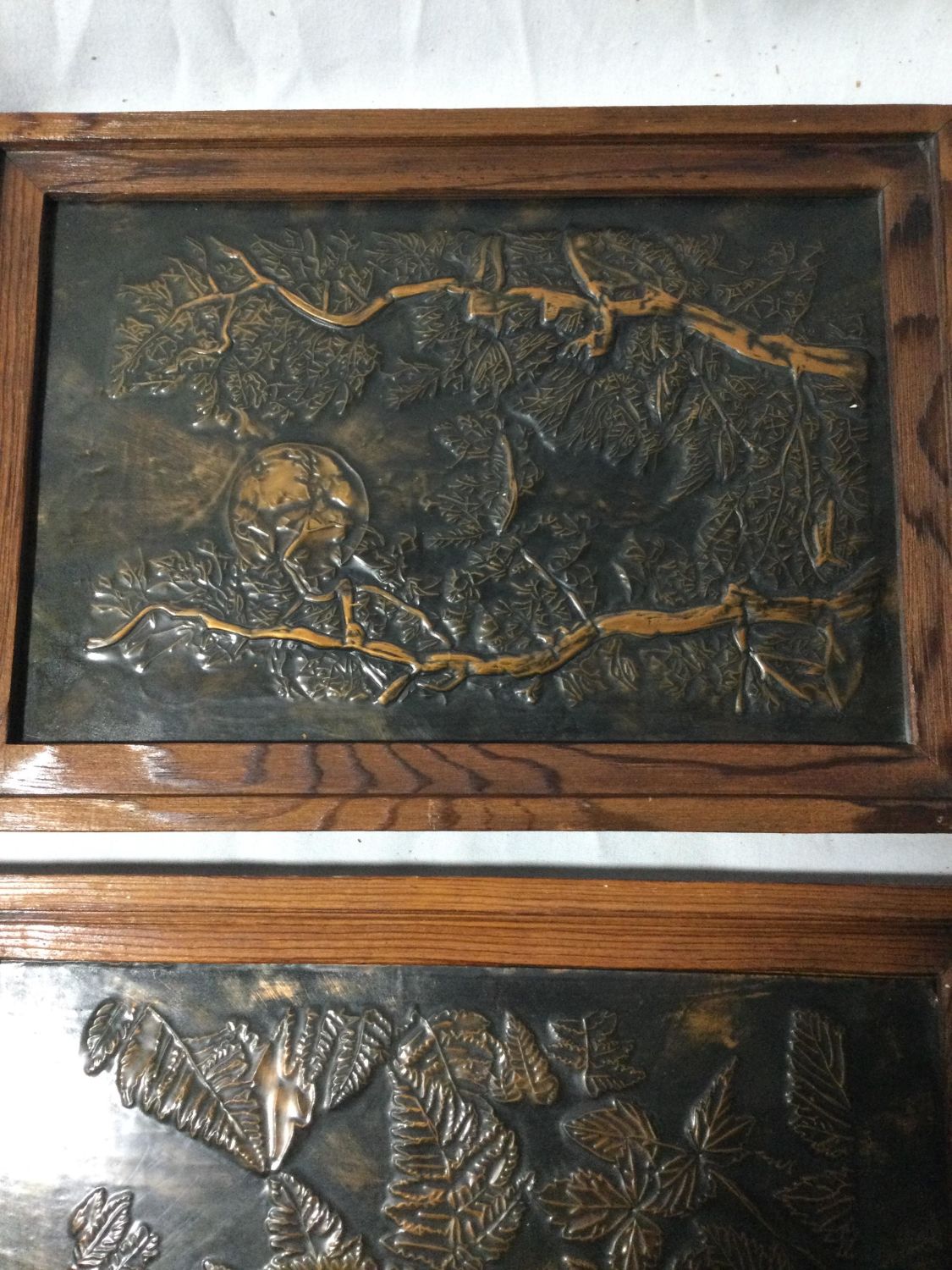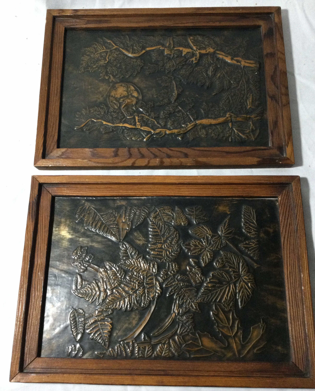 One picture depicts branches with the moon and the other leaves both measure 13 1/4 x 9 1/2,In a wooden frame