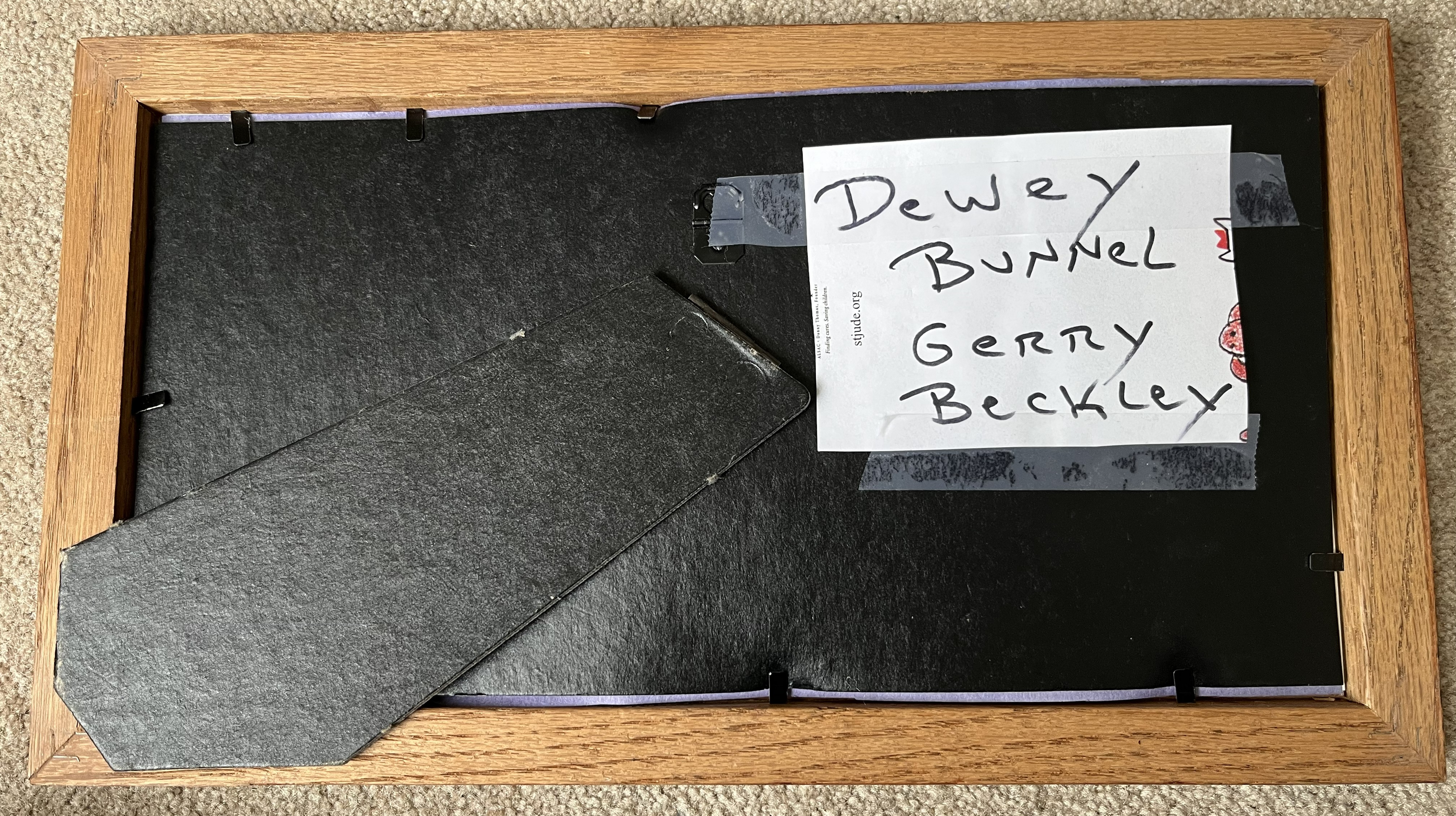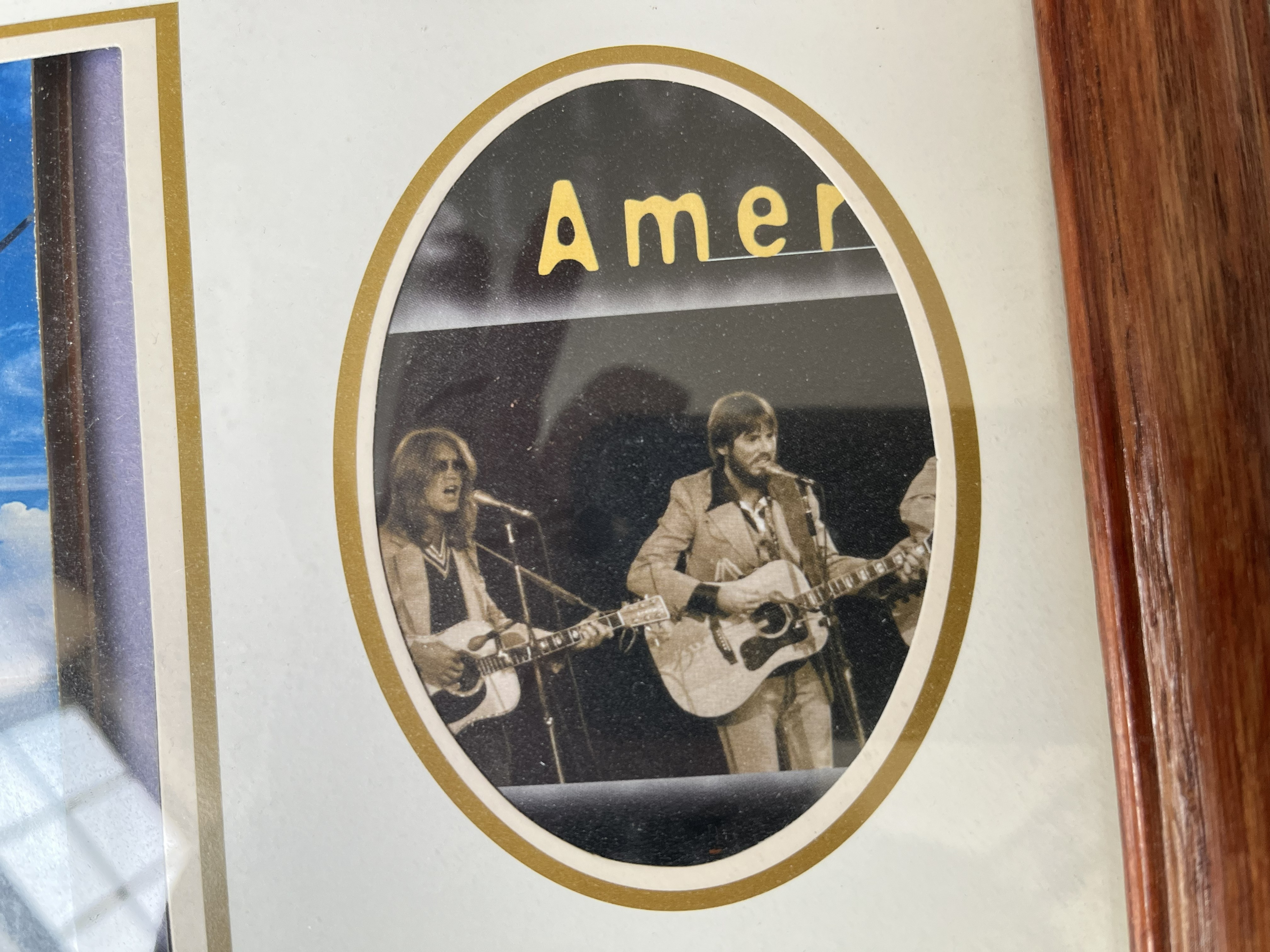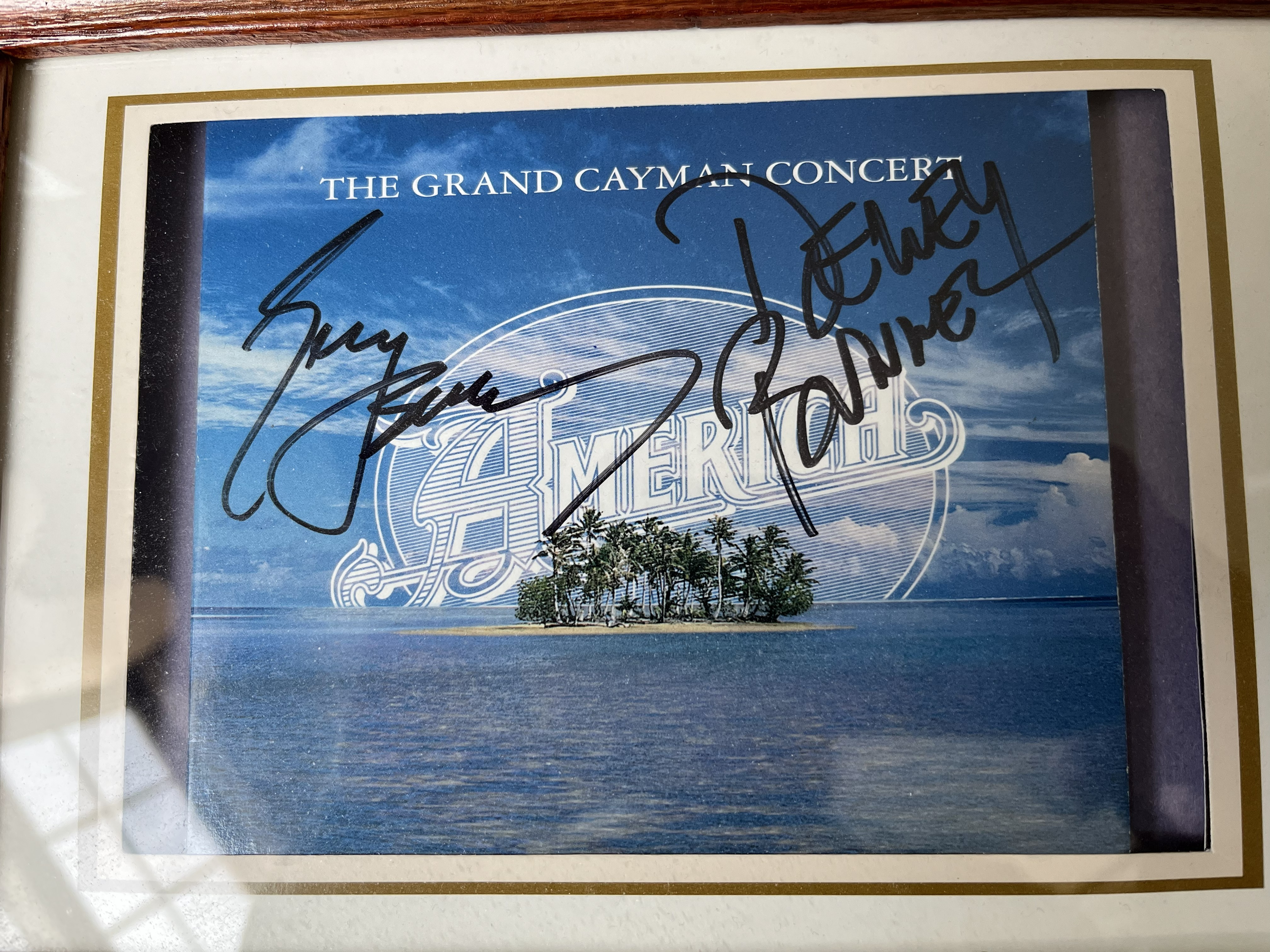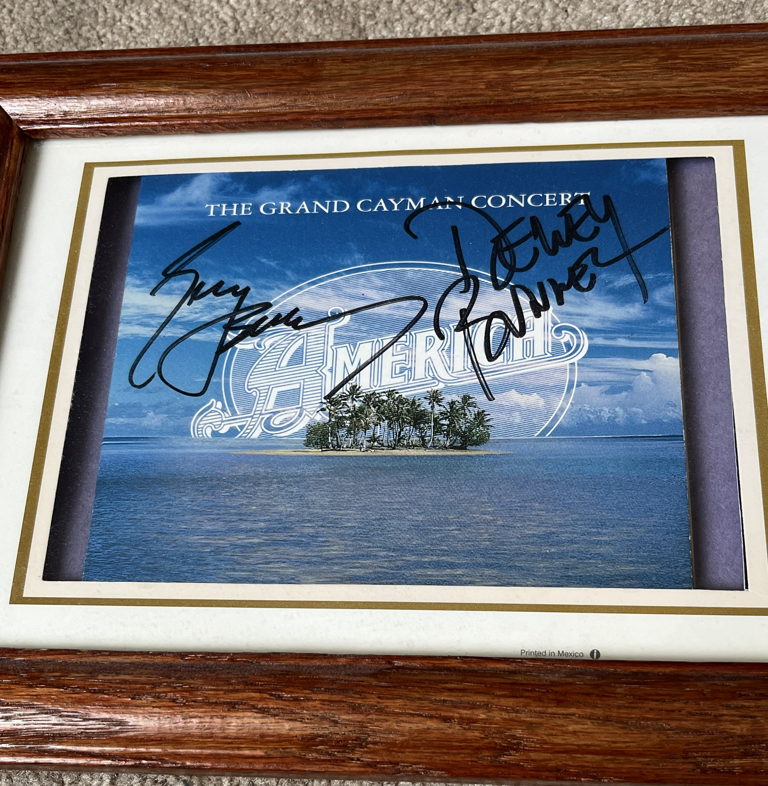 This music memorabilia lot features a framed display dedicated to the legendary folk-rock band America. The centerpiece is a CD insert for the album The Grand Cayman Concert, signed in bold black marker by founding members Dewey Bunnell and Gerry Beckley. To the right of the insert is an oval-cut black and white photograph of the duo performing live with their signature acoustic guitars. The signatures are unverified by third-party authentication services and are sold as-is; however, a handwritten note on the reverse provides identification of the signers.