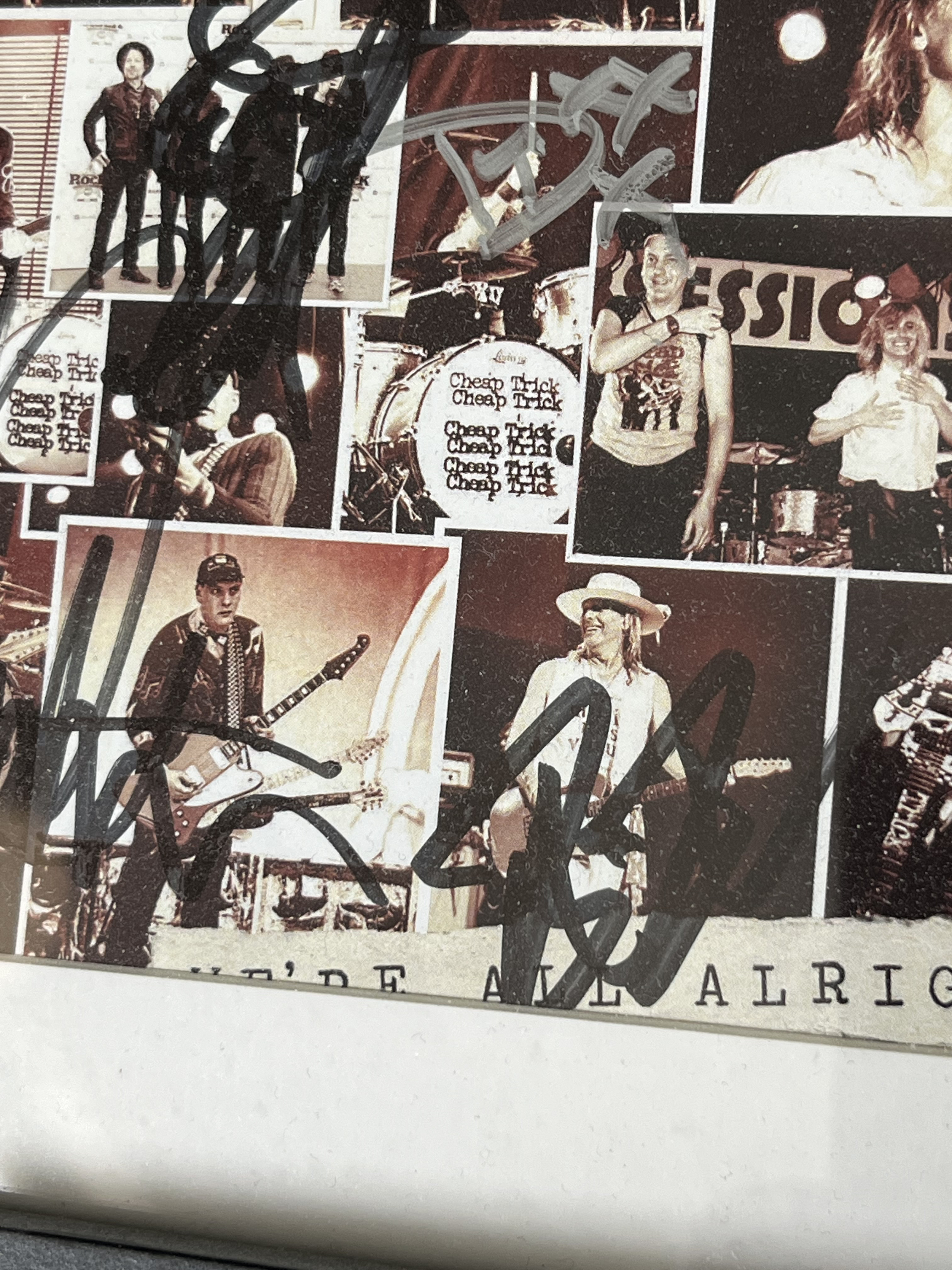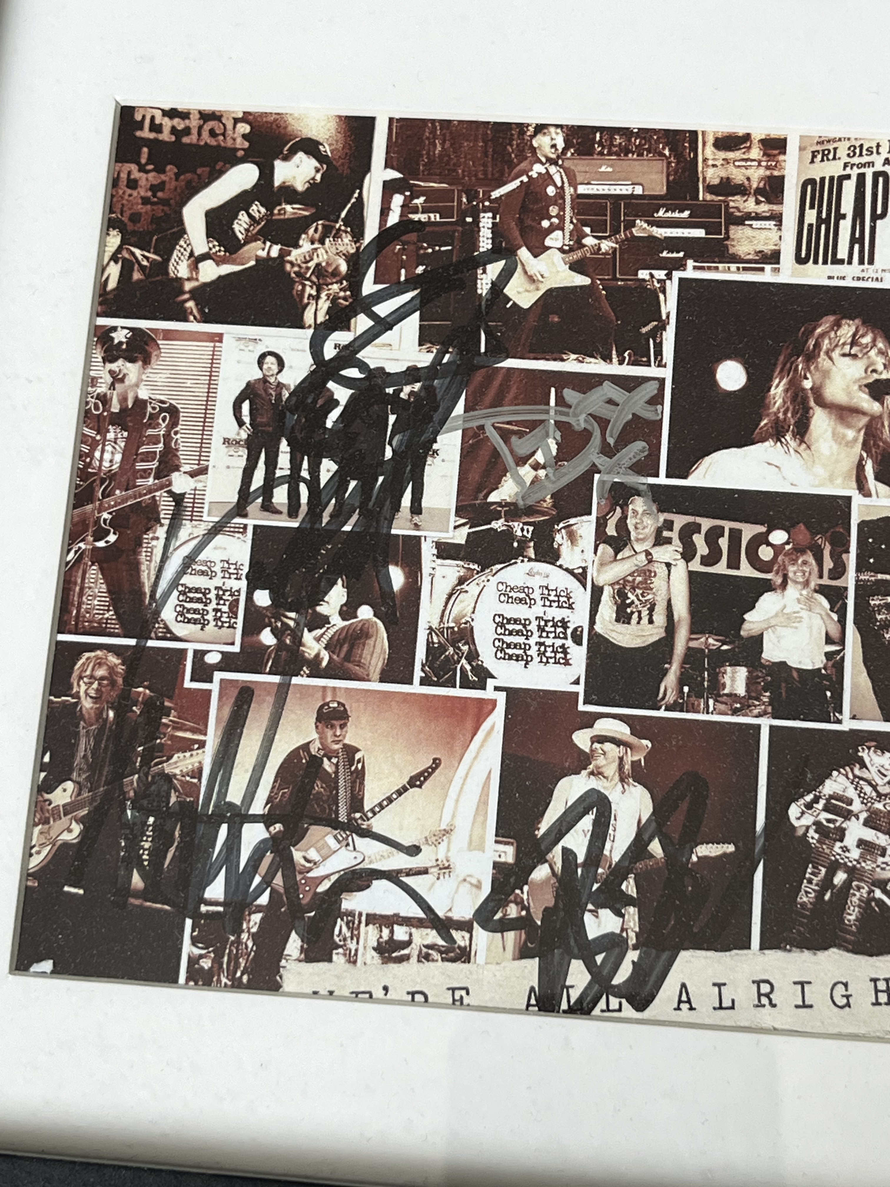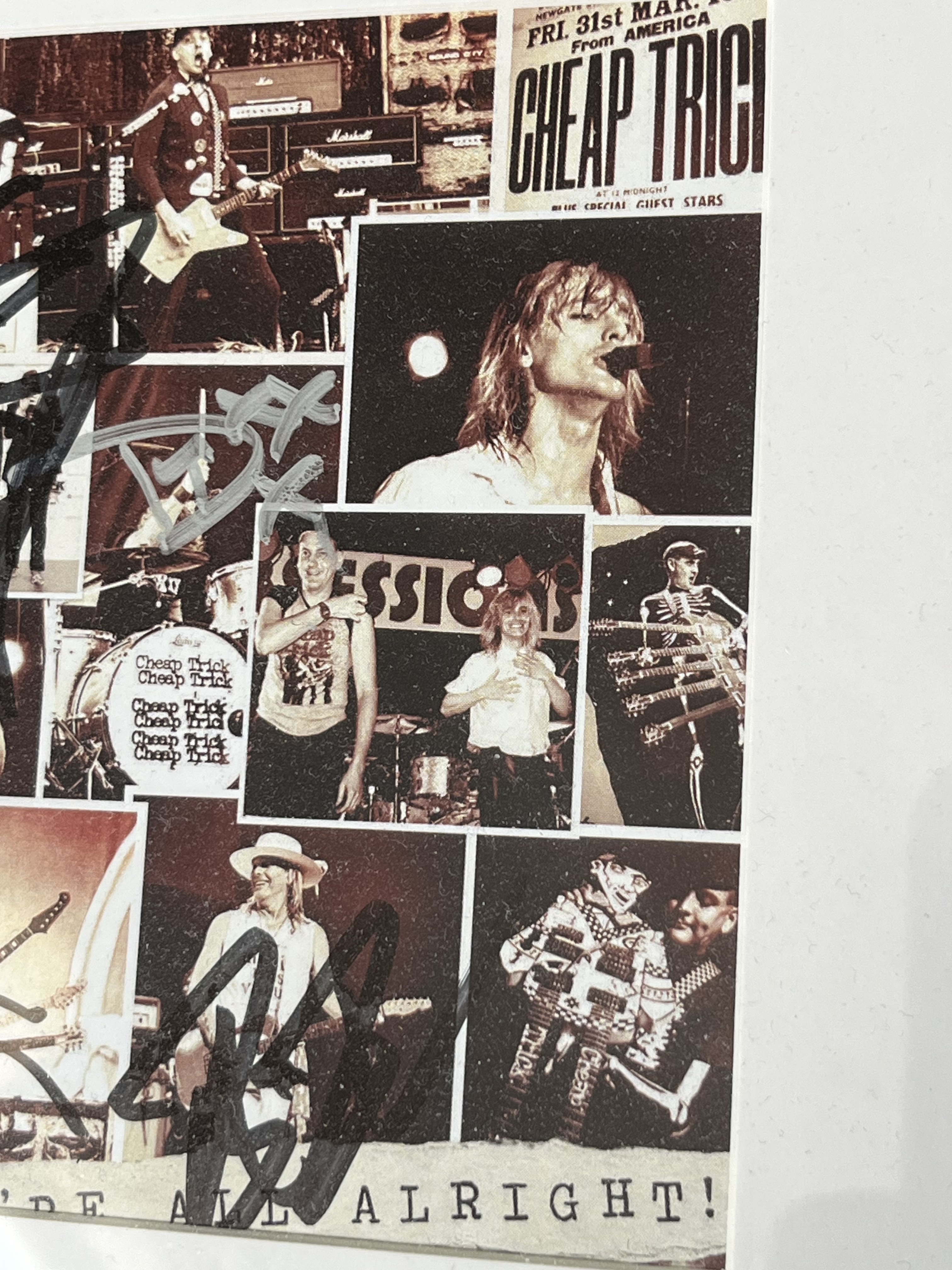 This professionally presented memorabilia display features the deluxe edition CD and accompanying booklet from Cheap Trick’s 2017 studio album, We’re All Alright! Released by Big Machine Records, this album represents the 18th studio effort from the Rock and Roll Hall of Fame inductees. The booklet is hand-signed by four members of the band: Rick Nielsen (black ink), Robin Zander (black ink), Tom Petersson (black ink), and Daxx Nielsen (silver ink). While the item does not include a formal third-party Certificate of Authenticity (COA), it features informal provenance in the form of a handwritten index card taped to the reverse of the frame, which serves as a guide to the placement of each band member’s signature.