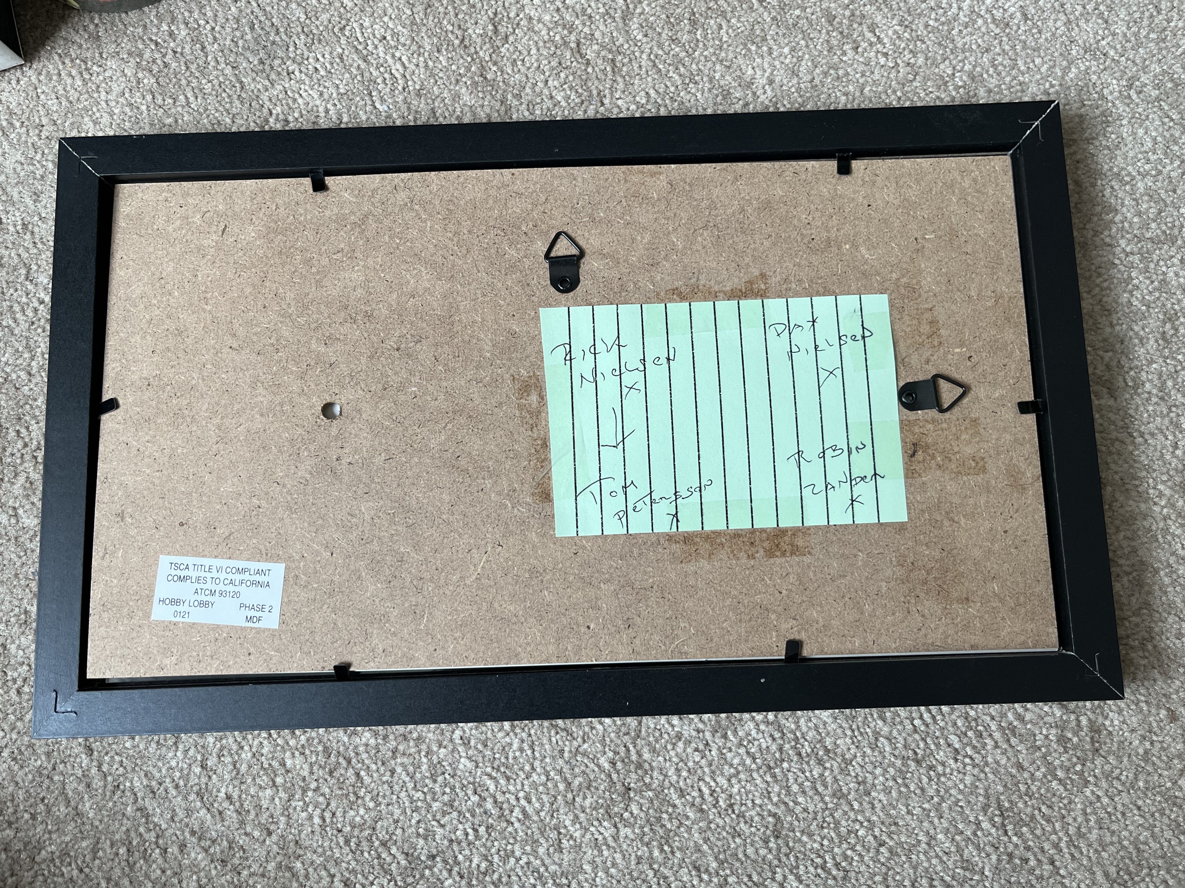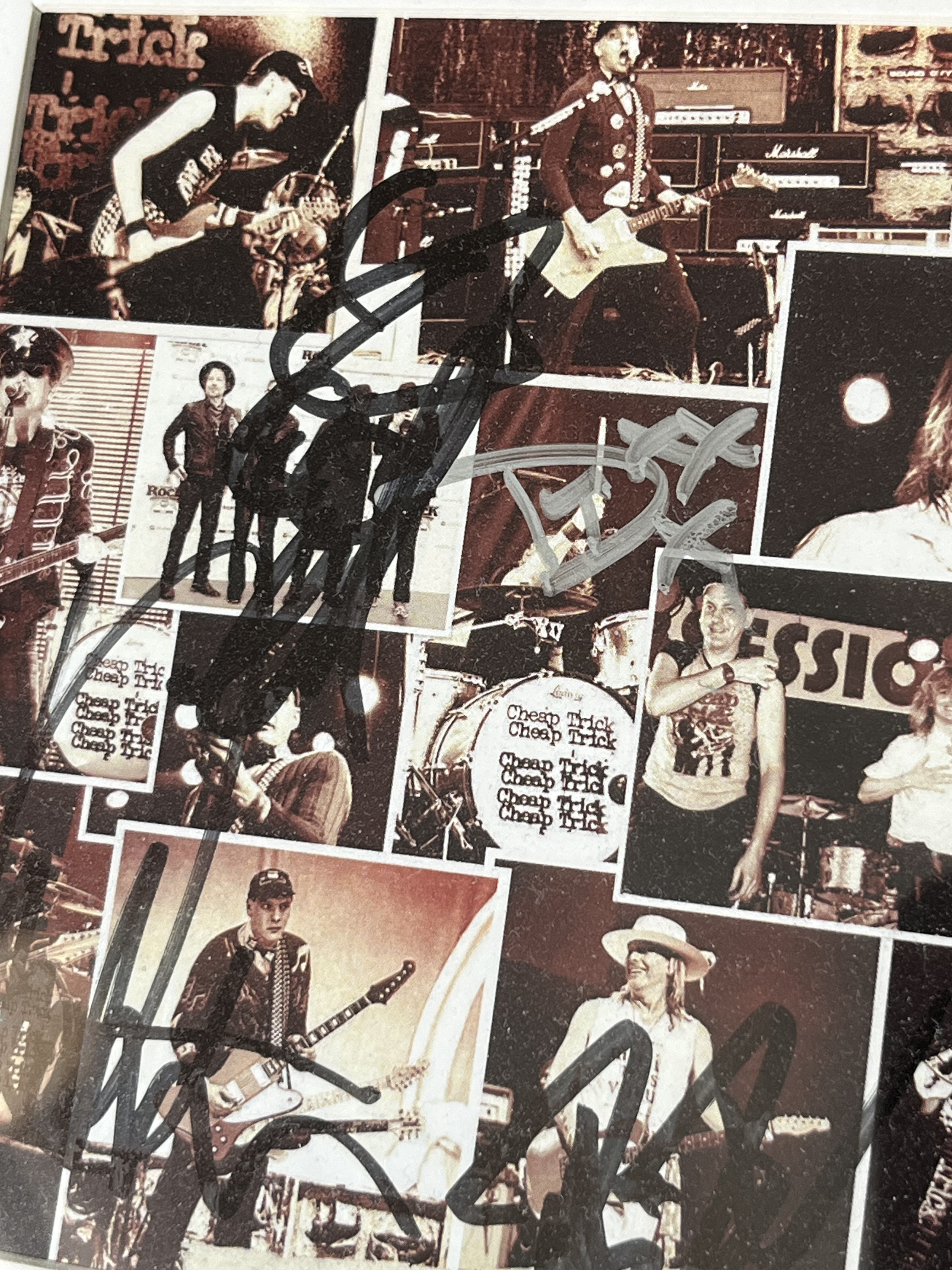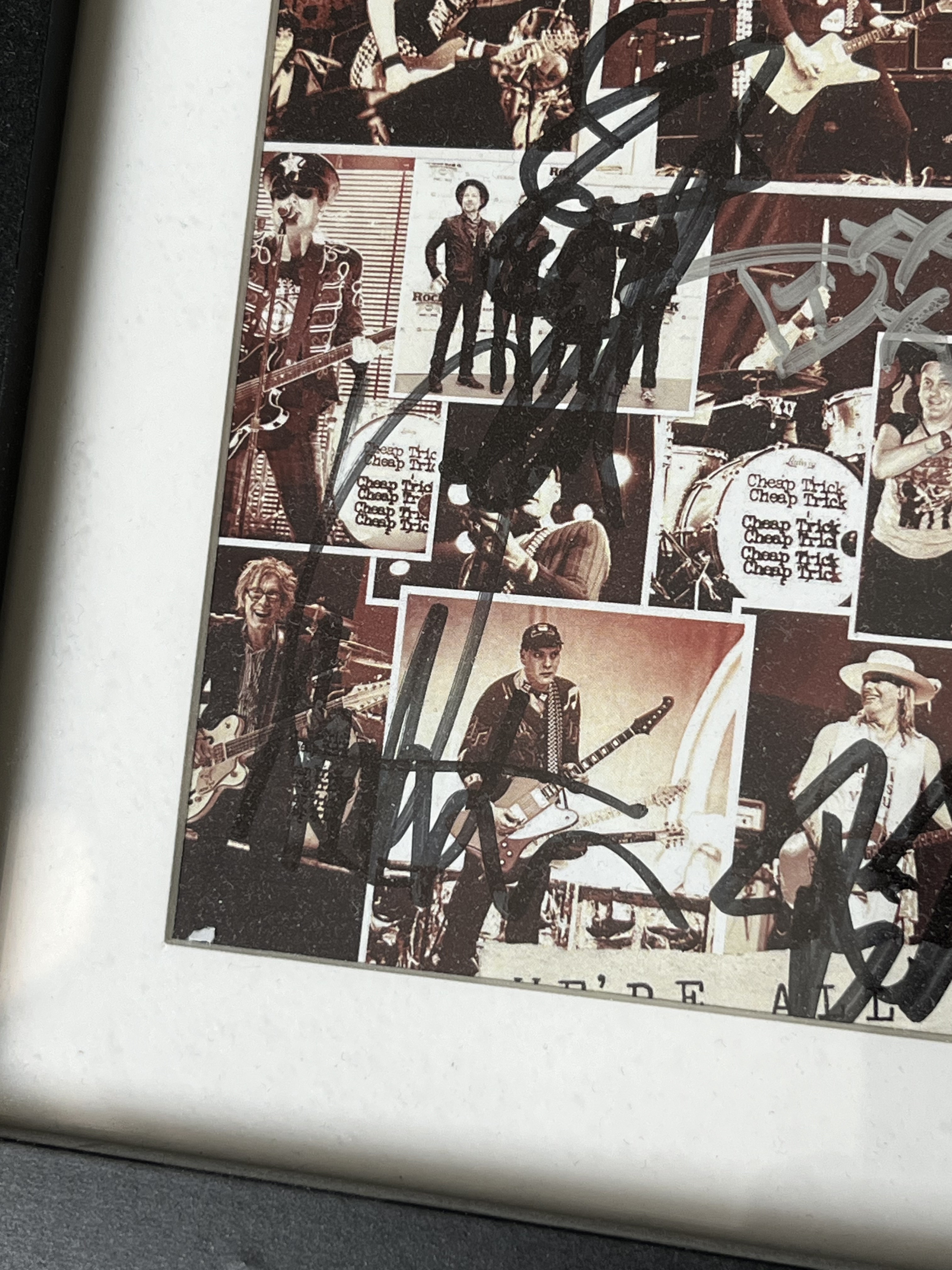 This professionally presented memorabilia display features the deluxe edition CD and accompanying booklet from Cheap Trick’s 2017 studio album, We’re All Alright! Released by Big Machine Records, this album represents the 18th studio effort from the Rock and Roll Hall of Fame inductees. The booklet is hand-signed by four members of the band: Rick Nielsen (black ink), Robin Zander (black ink), Tom Petersson (black ink), and Daxx Nielsen (silver ink). While the item does not include a formal third-party Certificate of Authenticity (COA), it features informal provenance in the form of a handwritten index card taped to the reverse of the frame, which serves as a guide to the placement of each band member’s signature.