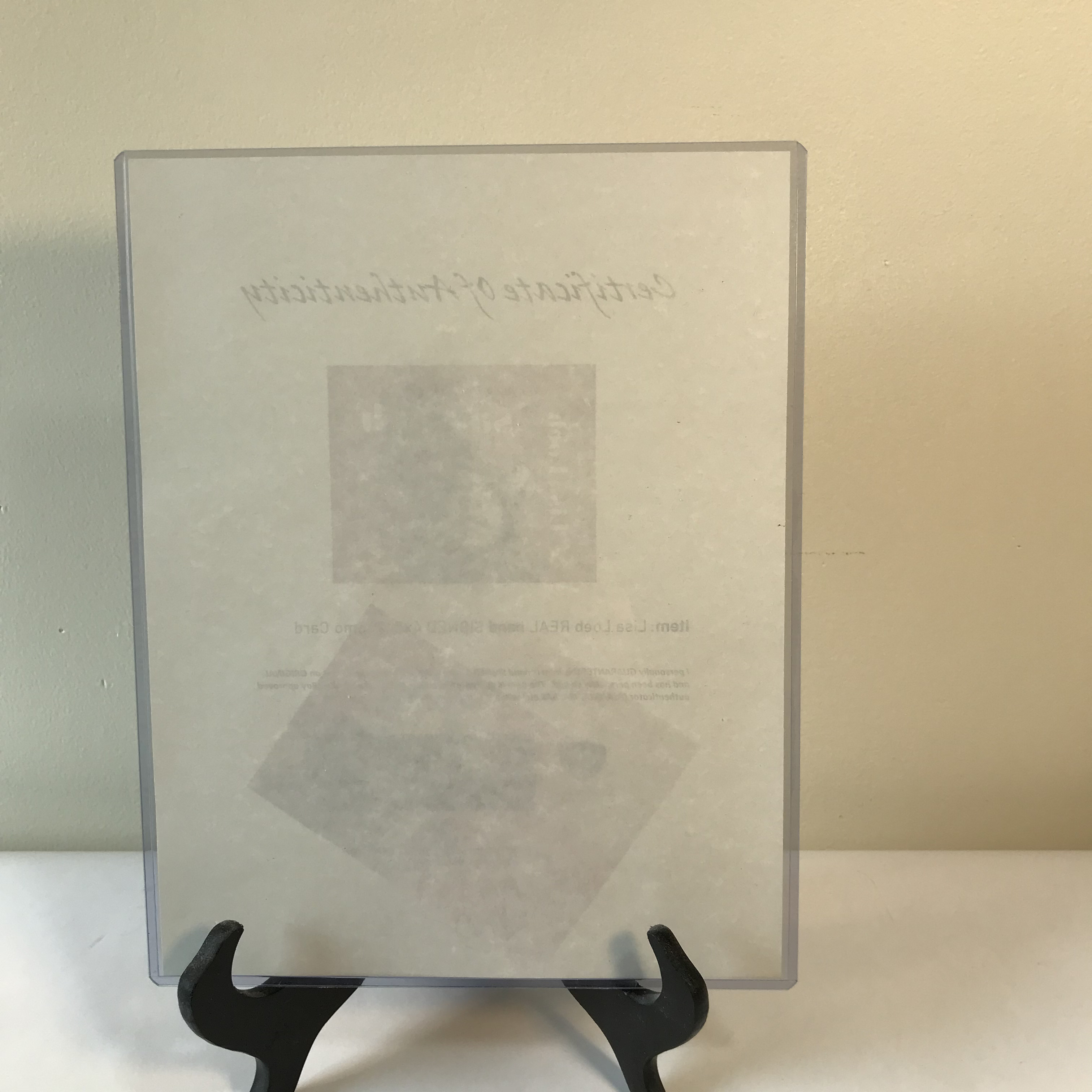 This lot consists of a promotional card for the Lisa Loeb album A Simple Trick to Happiness. The square card features a photographic portrait of Loeb and includes printed text for the album title and artist name. The card is hand-signed on the front in silver-toned ink with a stylized cursive signature. The item is accompanied by a Certificate of Authenticity which identifies the piece as a Lisa Loeb real hand-signed promotional card. Both the card and the certificate are preserved in a clear plastic protective top-loader sleeve. Measures 9 inches by 11 inches. Shipping available