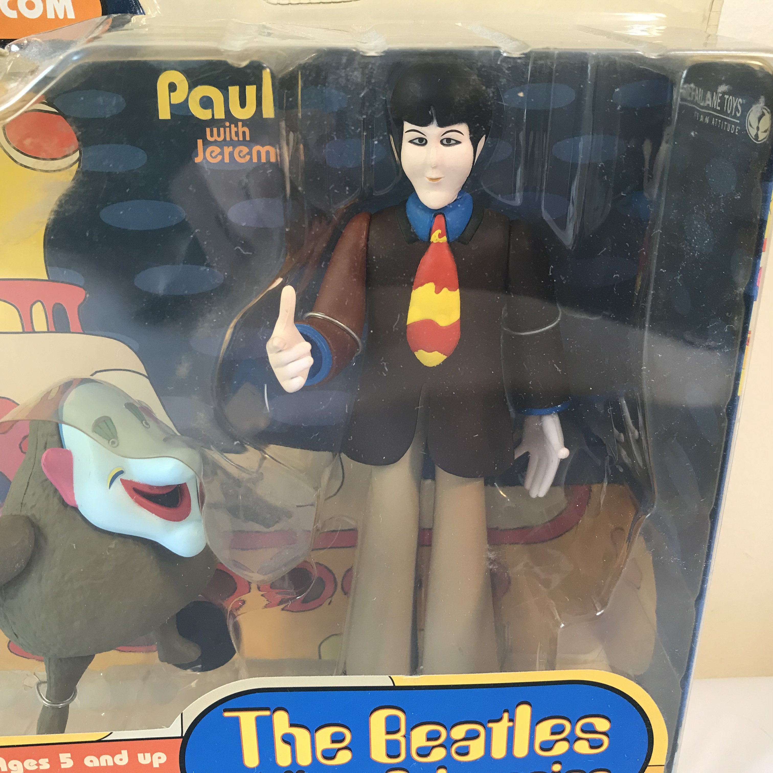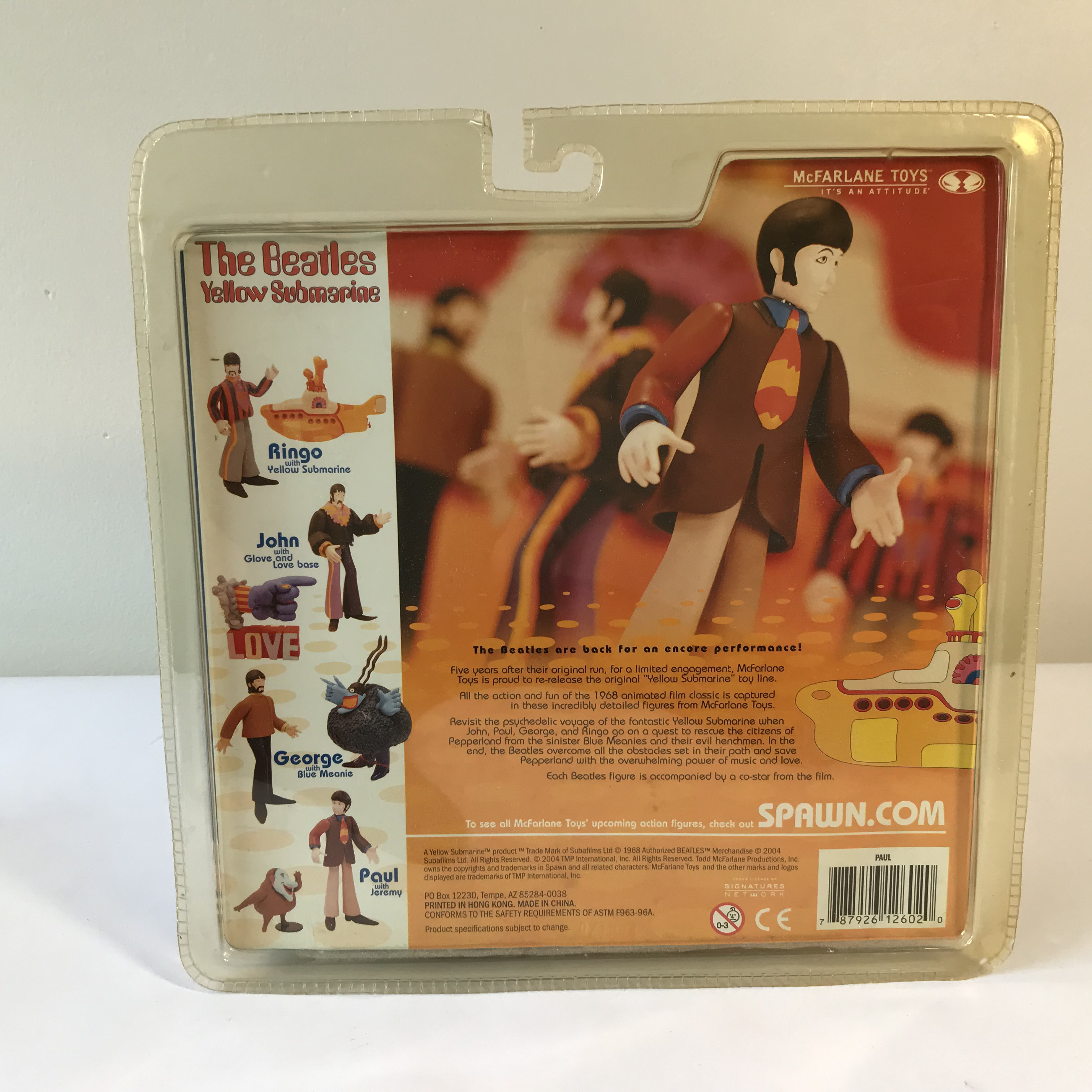 This set of two action figures is manufactured by McFarlane Toys and is based on the 1968 animated film The Beatles Yellow Submarine. The set features the characters Paul McCartney and Jeremy Hillary Boob, Ph.D. The figures are constructed from molded plastic and vinyl. The items are presented in their original factory-sealed blister card packaging. The front of the packaging features the SPAWN.COM logo, while the reverse includes a copyright date of 2004 for Subafilms Ltd. and TMP International, Inc. The card indicates the item was printed in Hong Kong and made in China. This release is part of the Series 1 collection from McFarlane Toys.