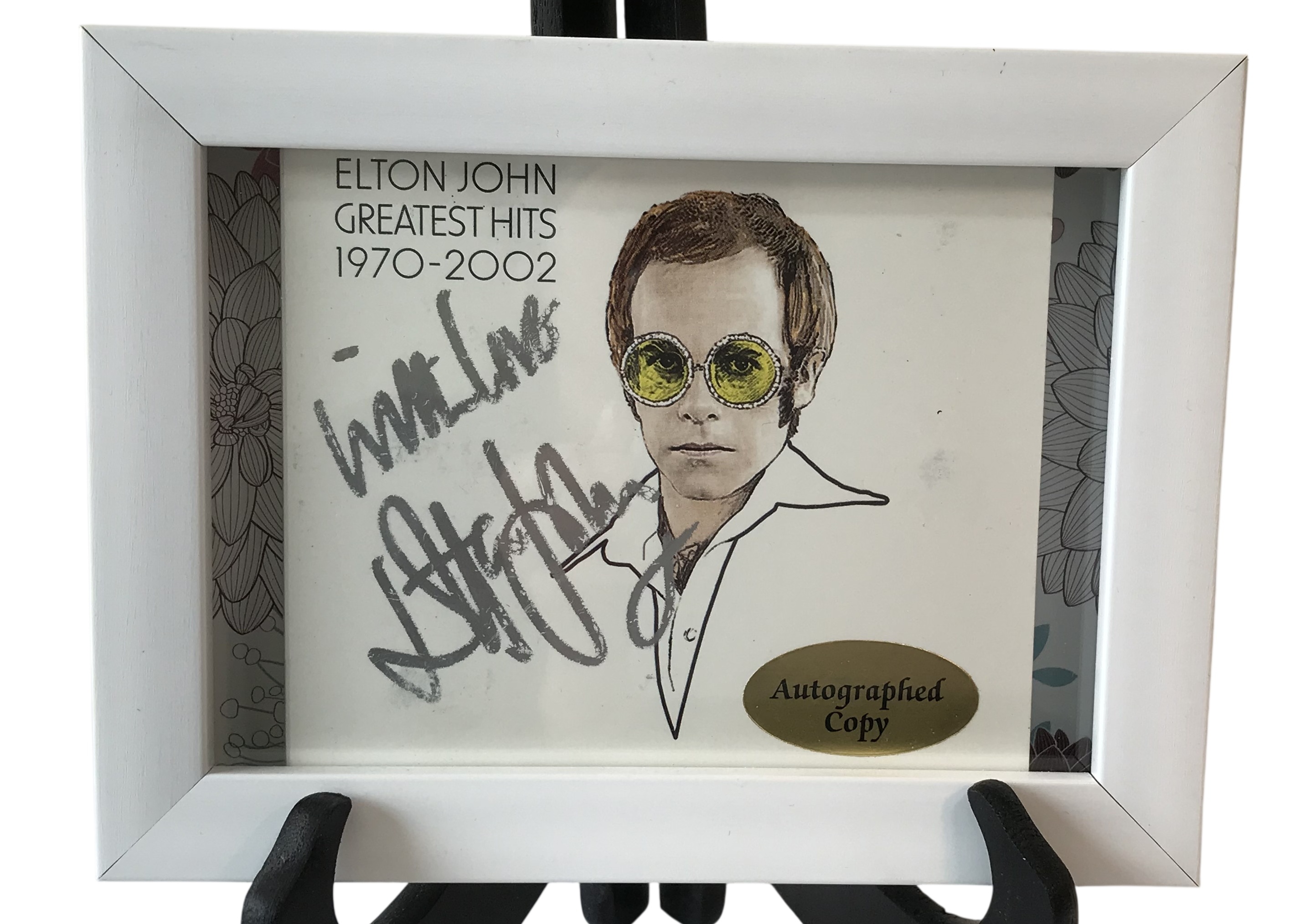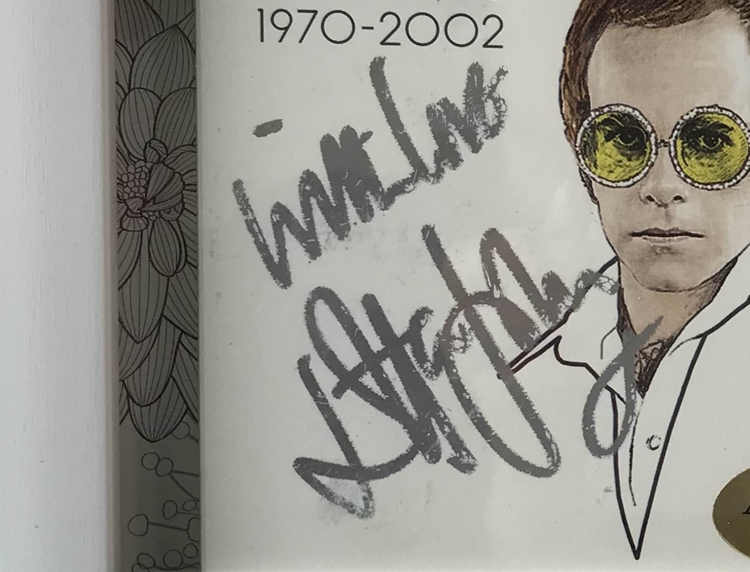 This framed print features artwork associated with the Elton John Greatest Hits 1970-2002 collection, depicting a stylized line drawing of the artist wearing yellow-tinted glasses.