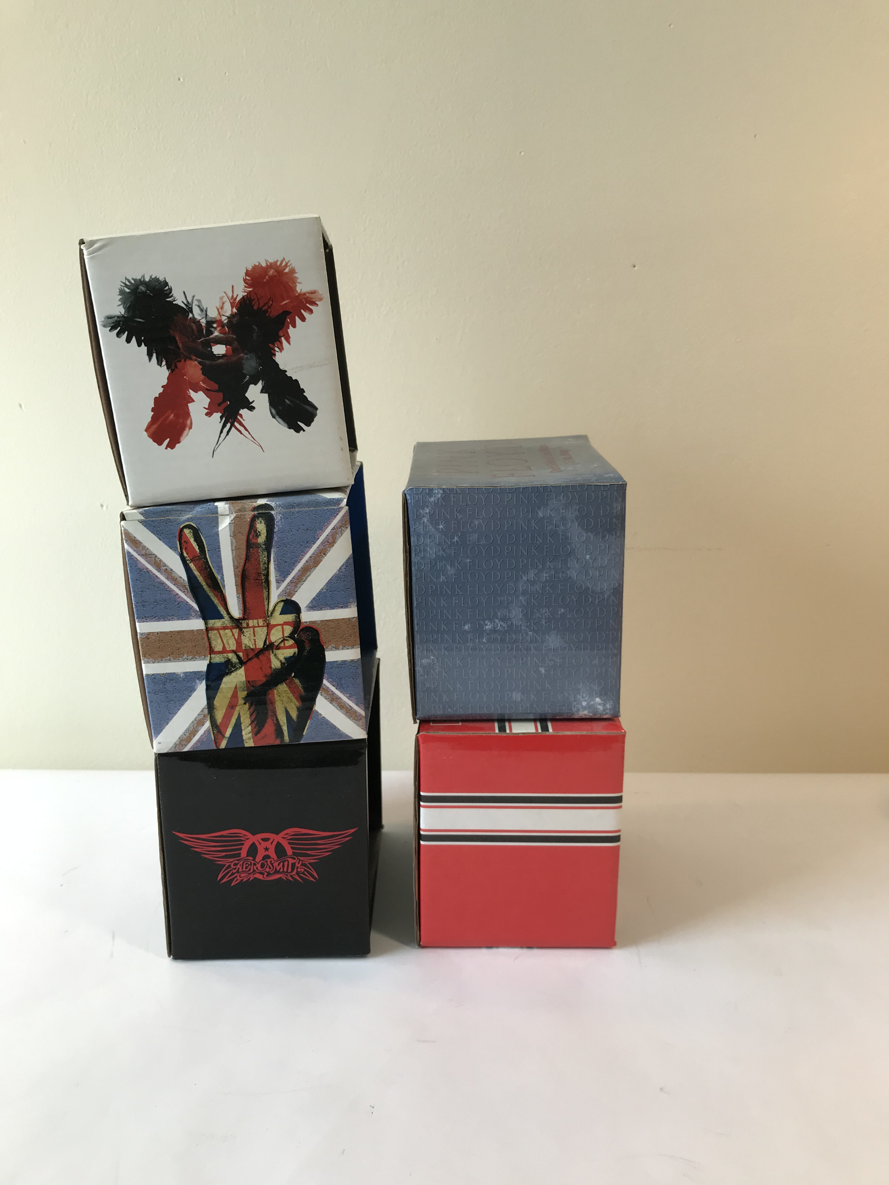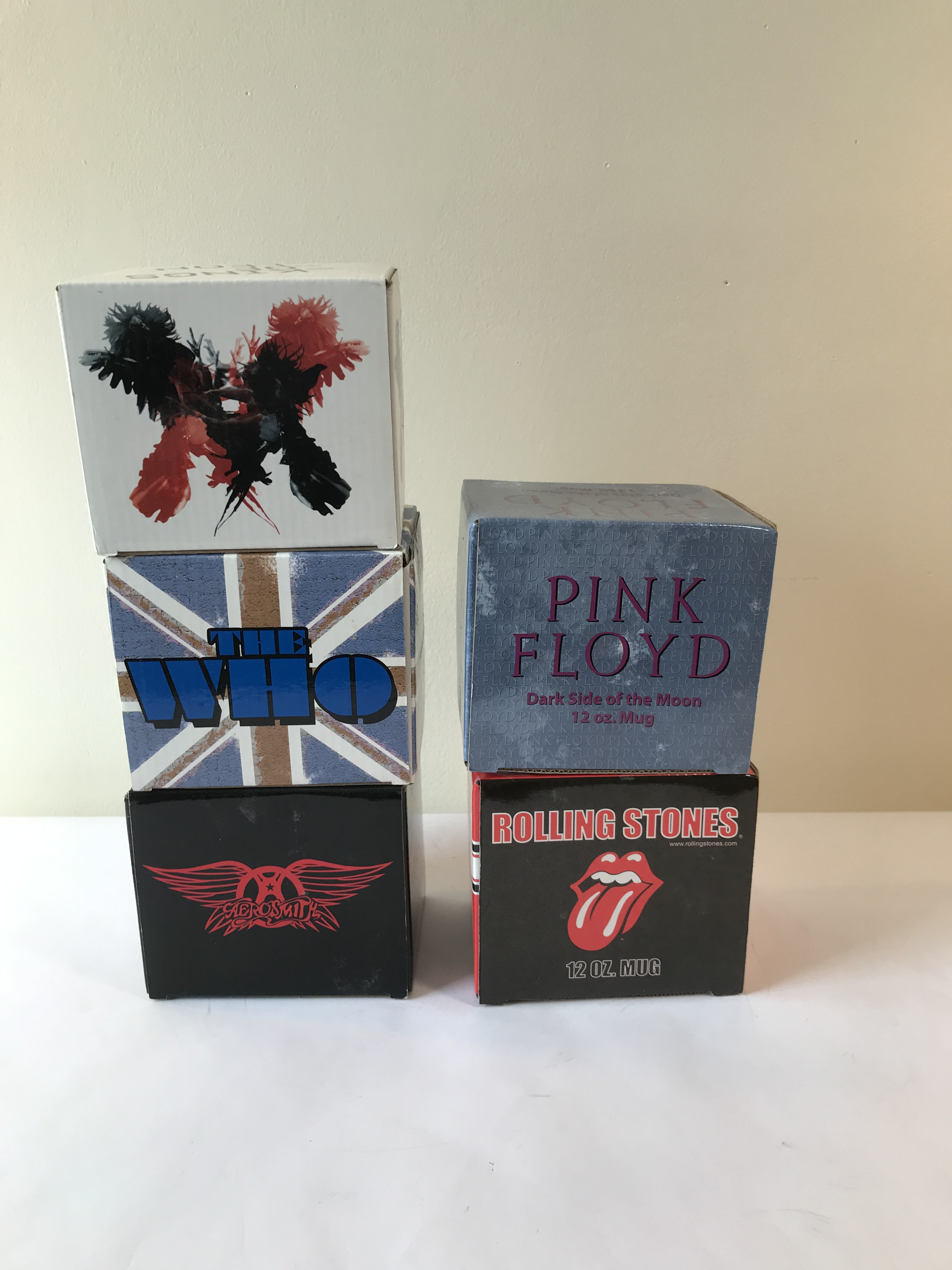 The collection includes a white Kings of Leon mug with a black and red bird graphic, a white The Who mug with a peace sign and Union Jack graphic, a black Pink Floyd mug with the Dark Side of the Moon prism artwork, a black Aerosmith mug with a red winged logo, and a black Rolling Stones mug with the tongue and lips logo.