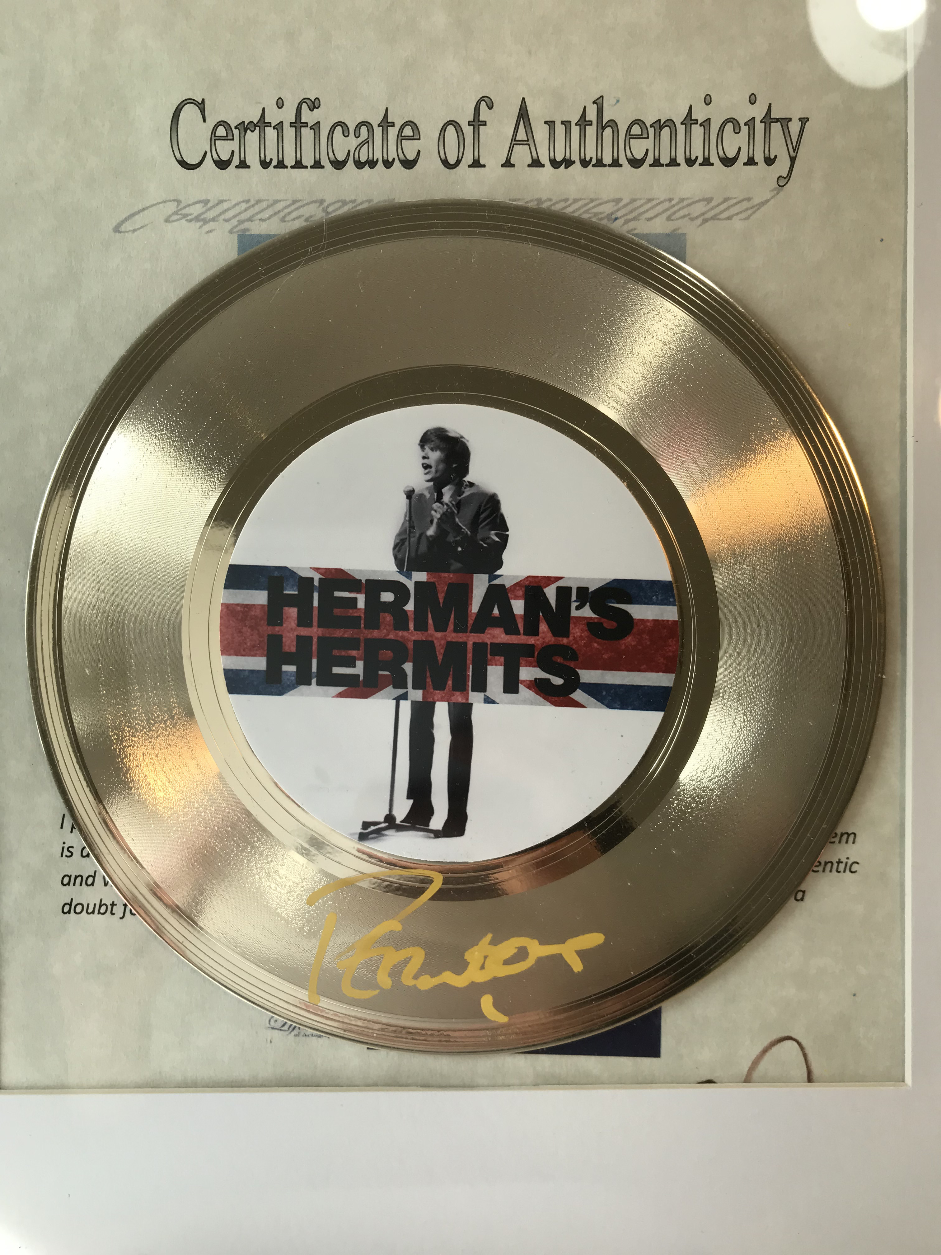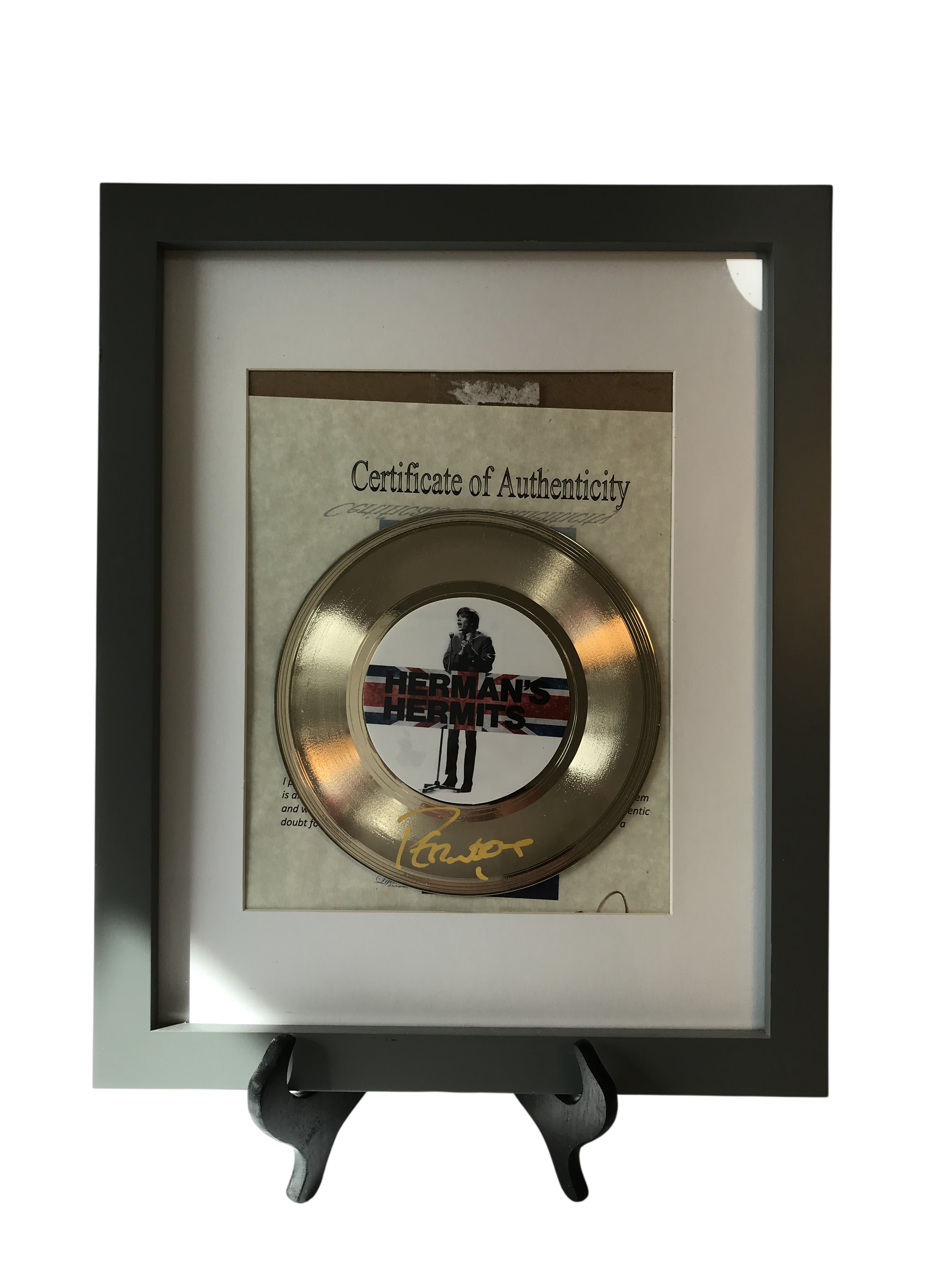 Looks like Peter Noone’s signature, does have Certificate of Authenticity, This framed music memorabilia features a gold-tone record related to the British Invasion band Herman’s Hermits. The display contains a gold-colored disc measuring approximately 7 inches in diameter. The center of the record features a custom label depicting lead singer Peter Noone standing before a microphone, overlaid with a Union Jack graphic and the text HERMAN’S HERMITS. Frame measures 15 1/2 x 12 1/2 inches
