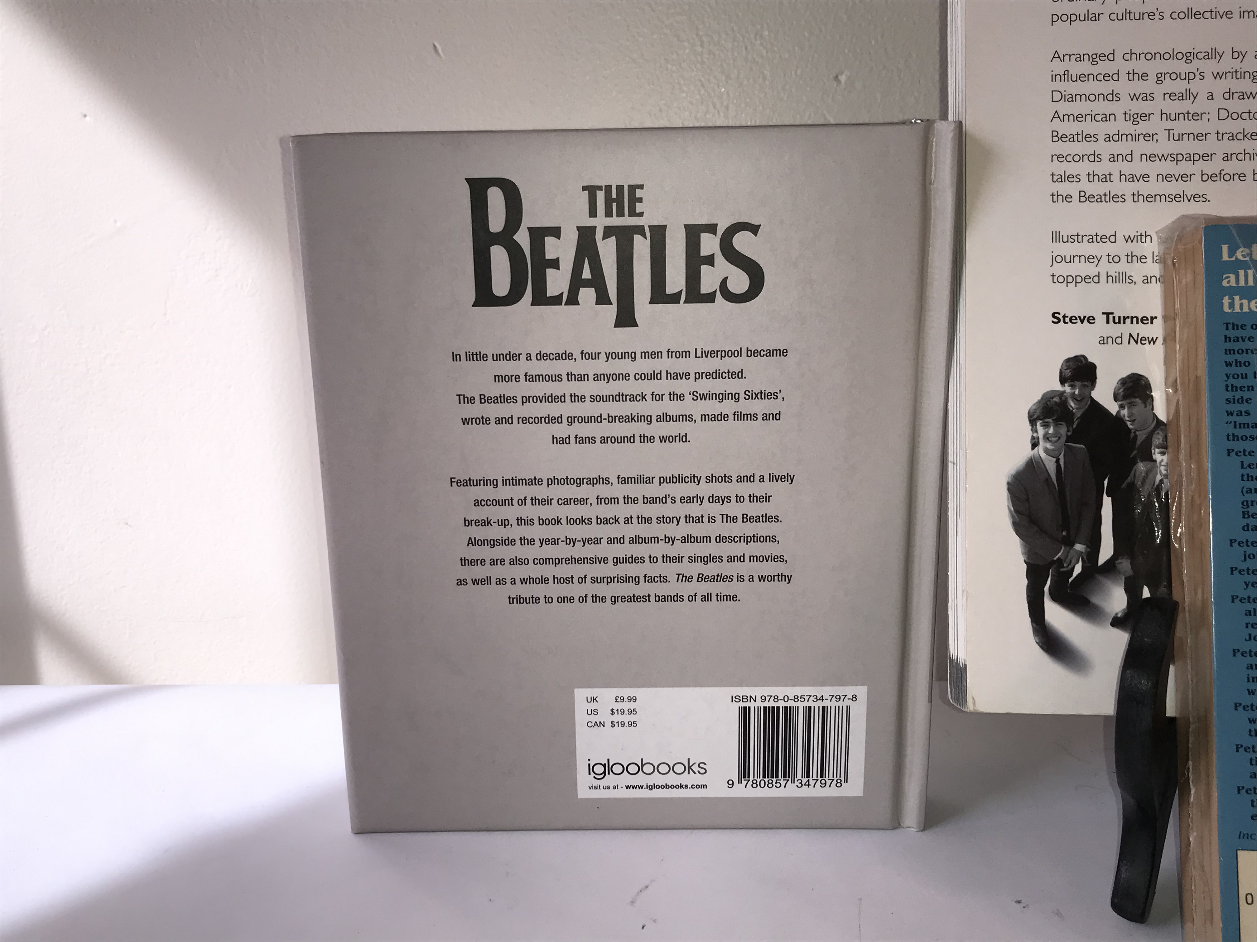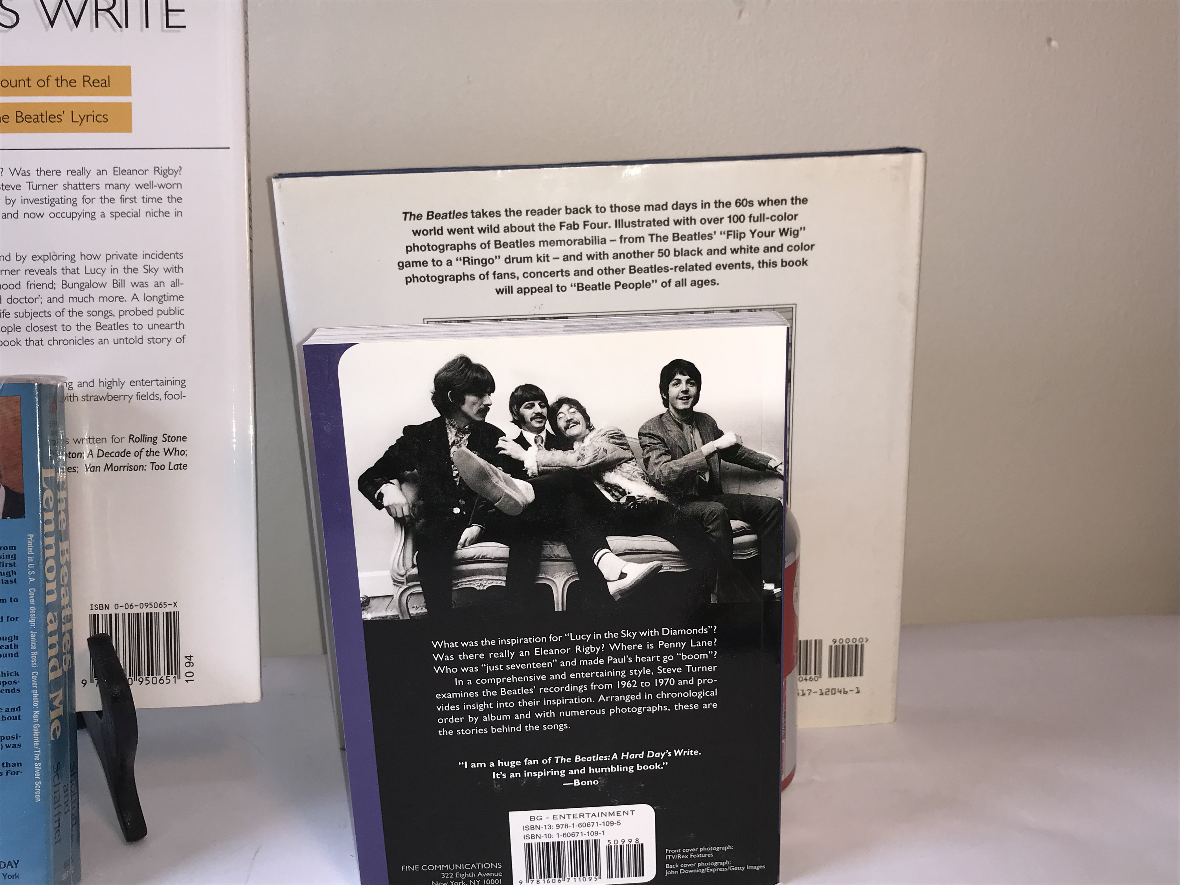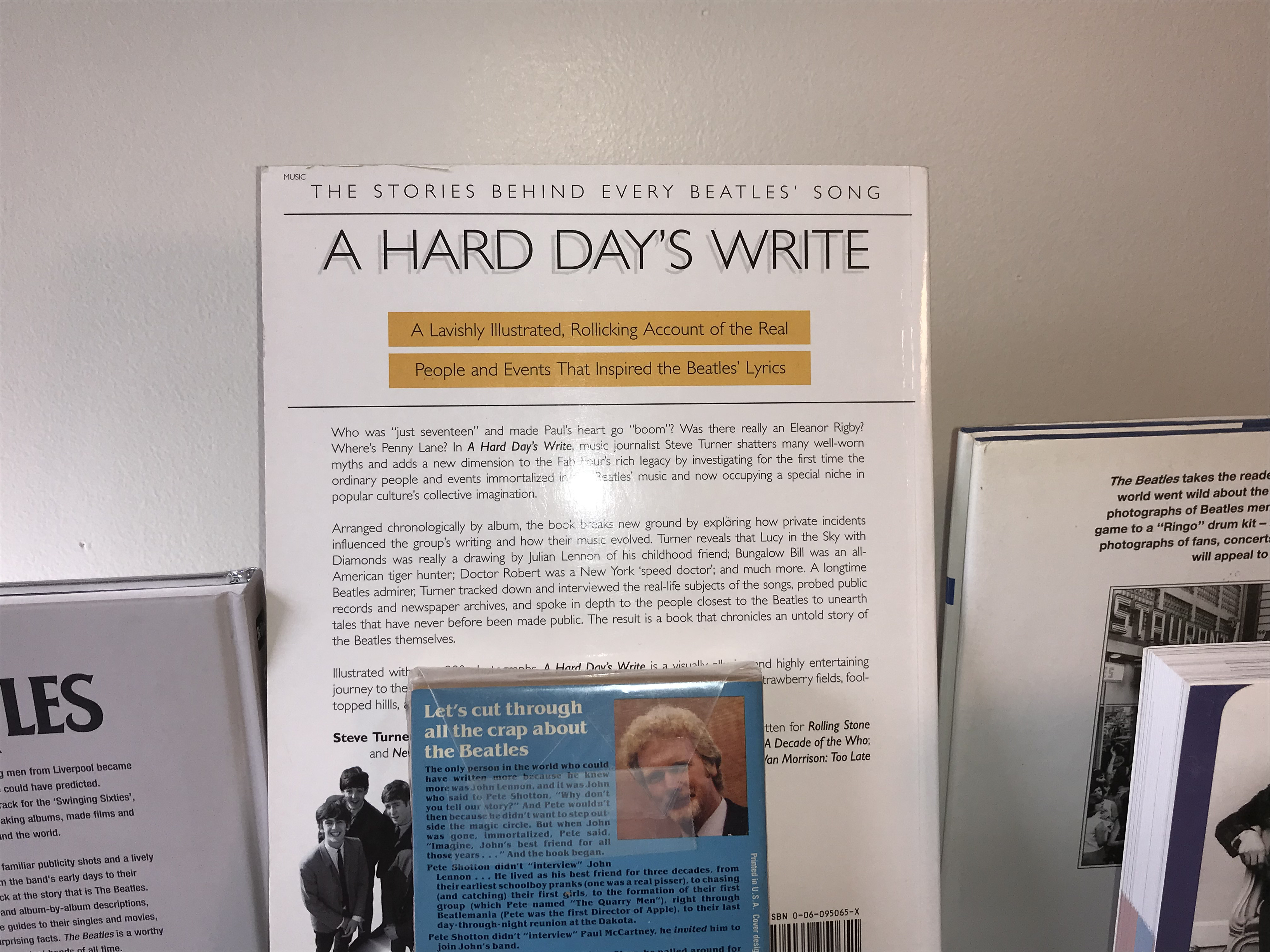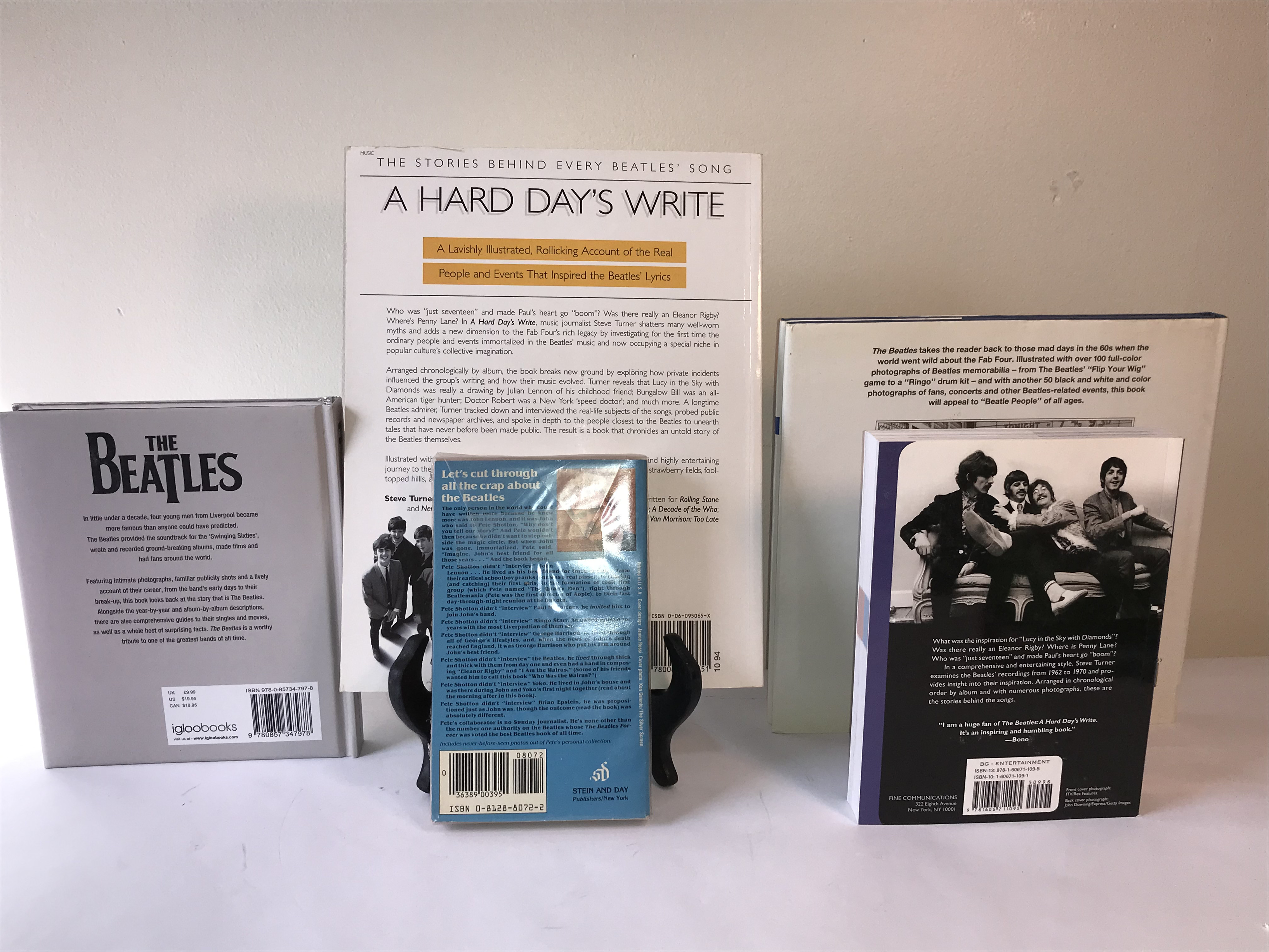 A collection of books and publications concerning the musical group The Beatles. The lot includes two editions of A Hard Day’s Write: The Stories Behind Every Song by Steve Turner, featuring one large-format softcover and one standard softcover edition. Also present is a mass-market paperback titled The Beatles, Lennon and Me (The Magical Memory Tour) by Pete Shotton and Nicholas Schaffner, which is a memoir by an intimate associate of John Lennon. The collection is rounded out by a silver-bound volume titled The Beatles and a large-format pictorial work titled The Beatles Memories. The volumes feature a mix of pictorial boards and printed paper wrappers. The sizes range from approximately octavo to quarto.