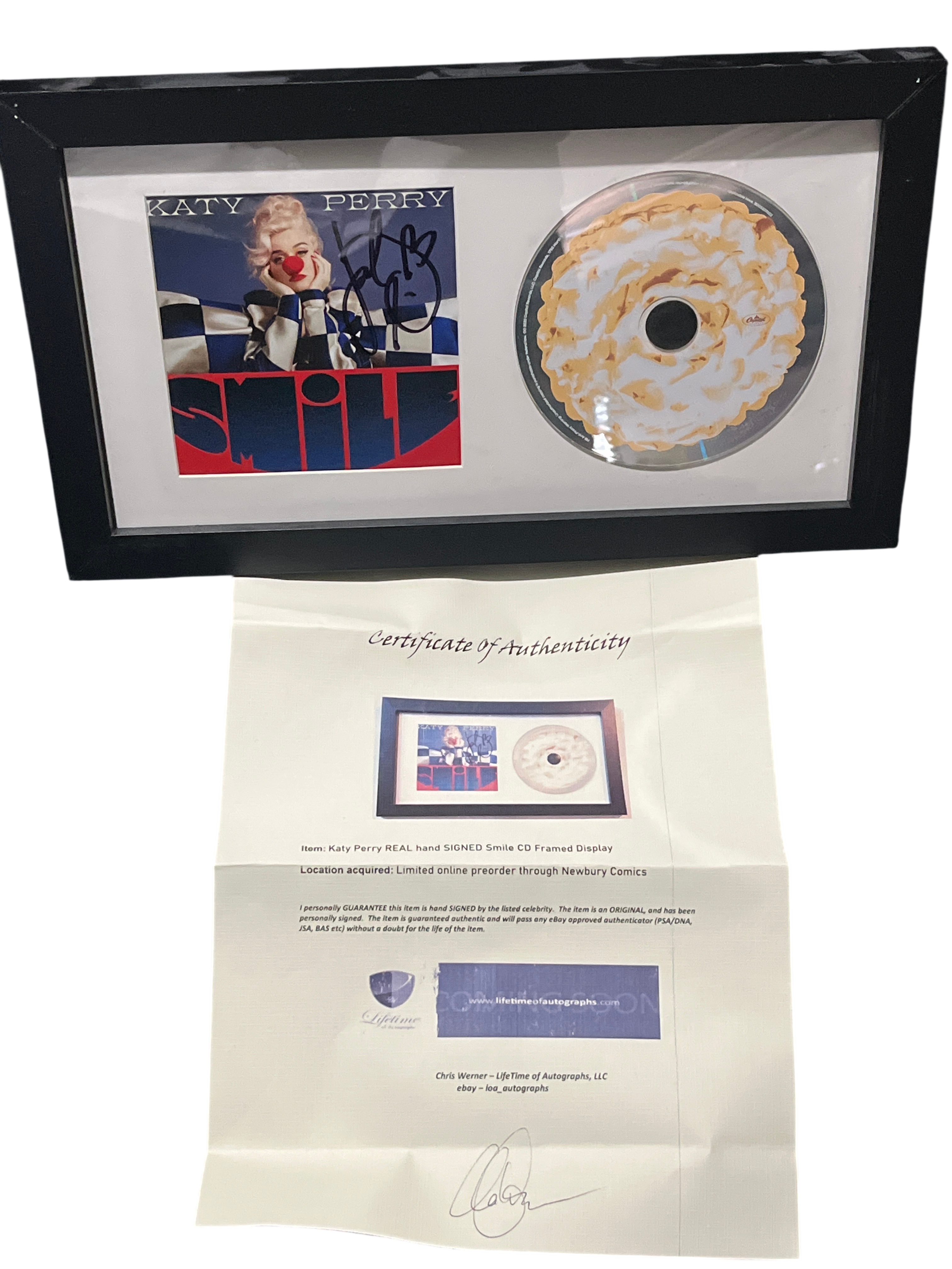 Katy Perry Smile album framed memorabilia display, circa 2020. The set features a hand-signed album art card and a compact disc with a lemon meringue pie graphic, professionally mounted in a white mat and black frame. Accompanied by a Certificate of Authenticity from LifeTime of Autographs, LLC, citing original acquisition from a Newbury Comics limited preorder. The signature is executed in black ink on the art card.