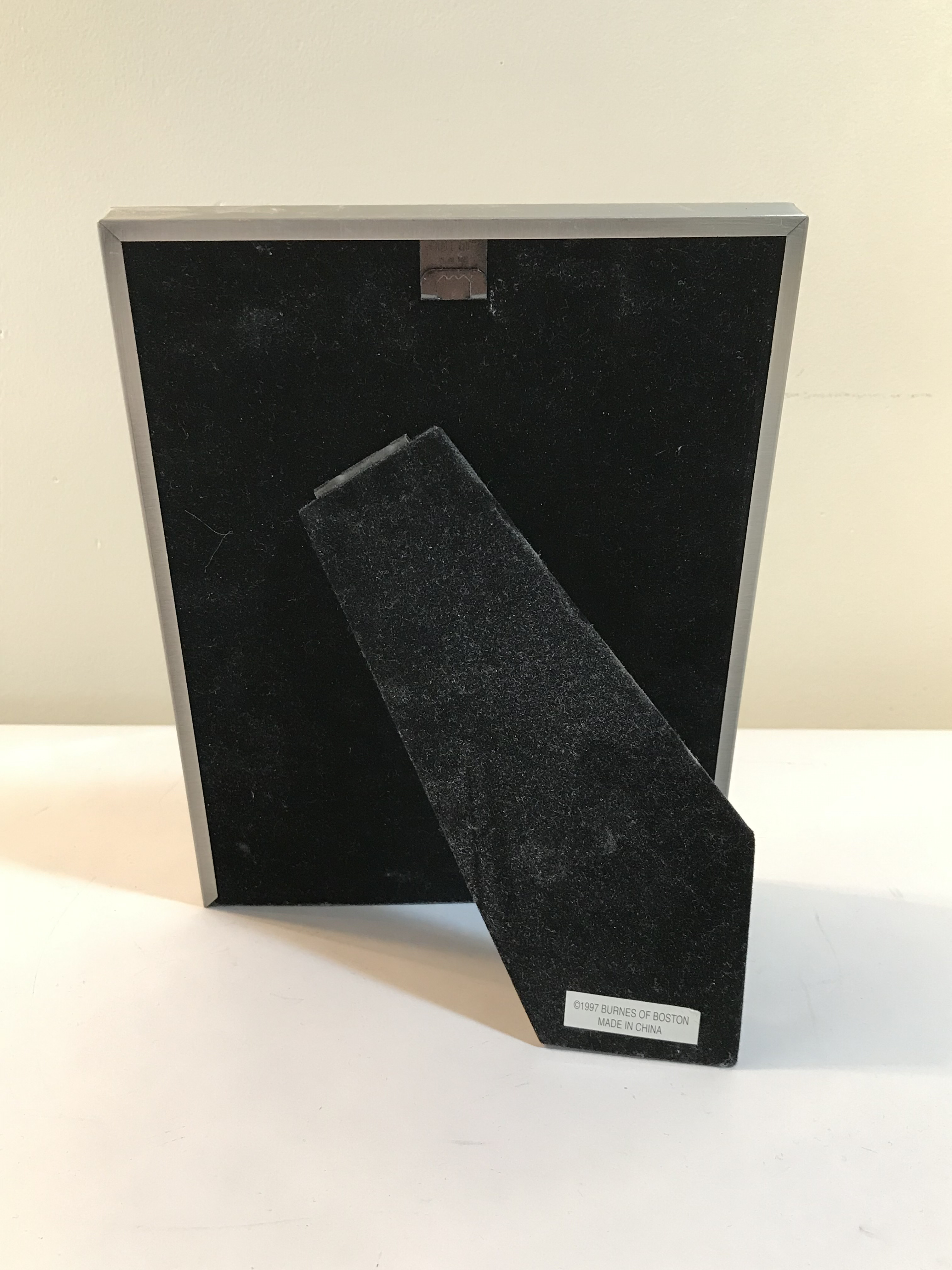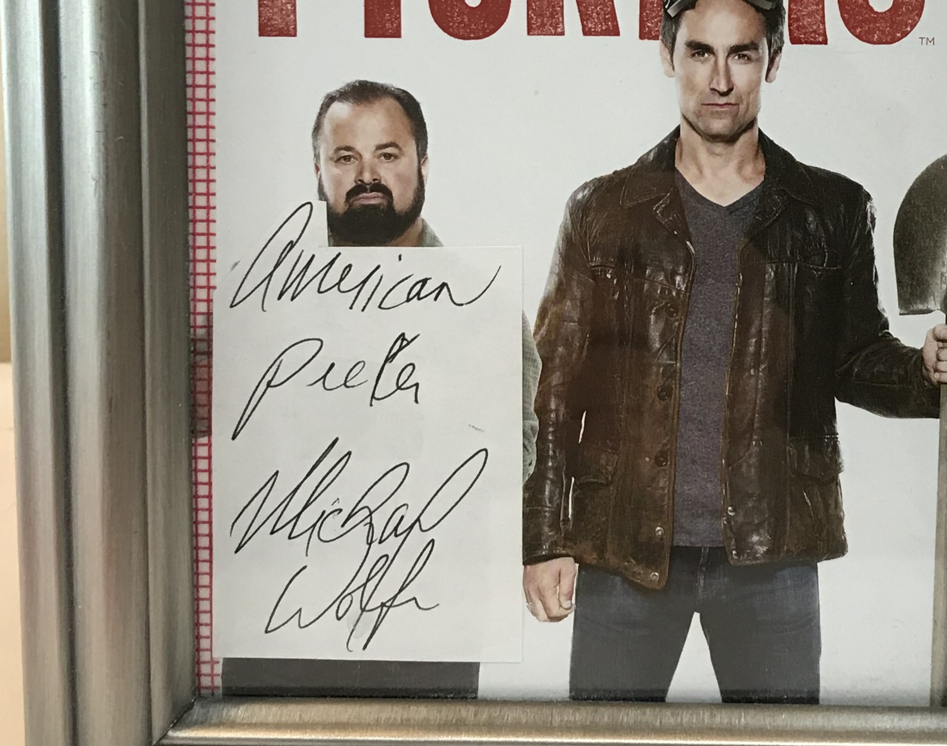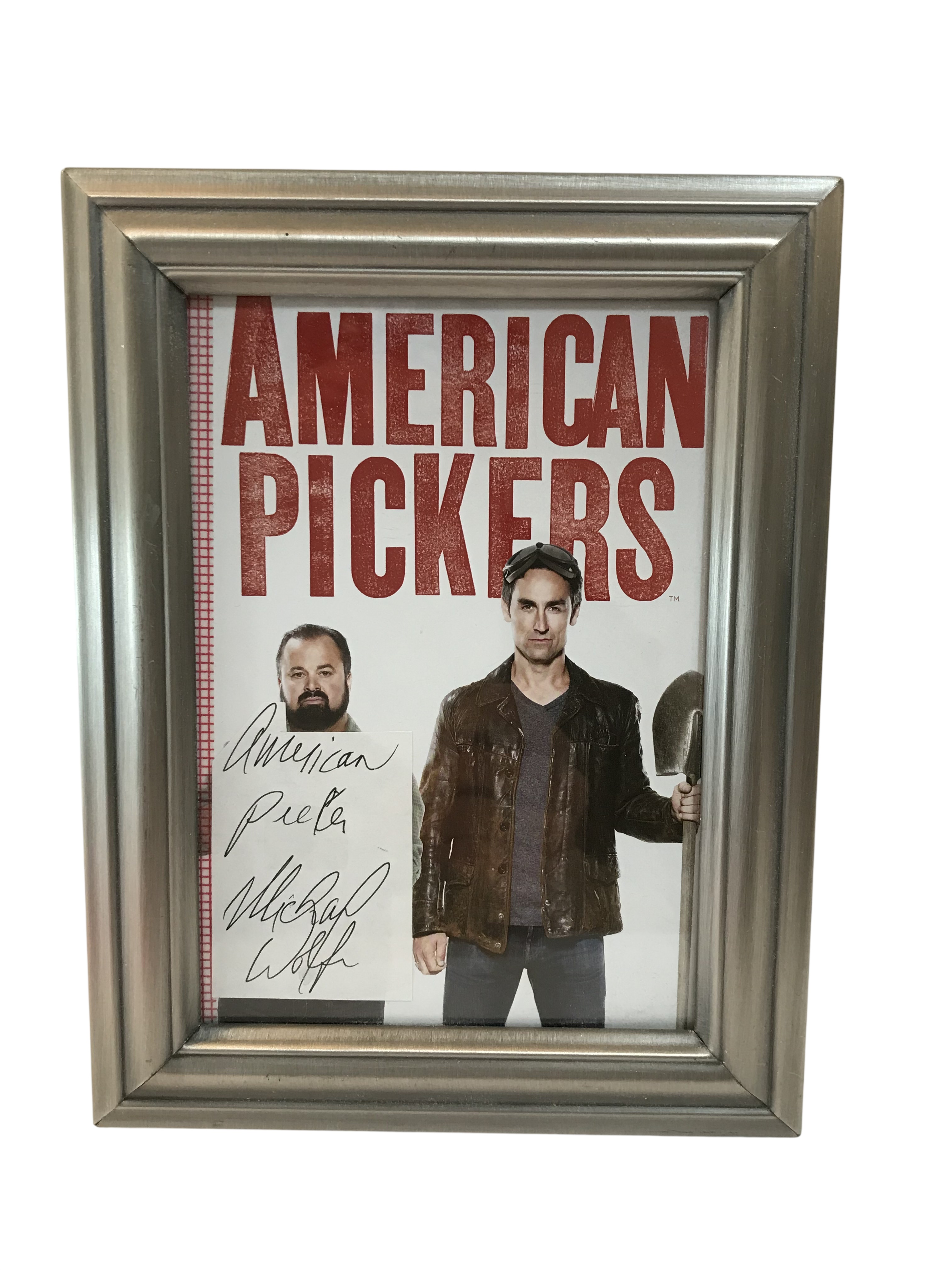 This item consists of a color promotional print for the History Channel reality television series American Pickers. The image depicts the series hosts Frank Fritz and Mike Wolfe bearing a handwritten signature in black ink. The signature reads American Picker Michael Wolfe. The photograph is presented in a silver-toned molded frame featuring a velvet-covered backing and an easel stand.
