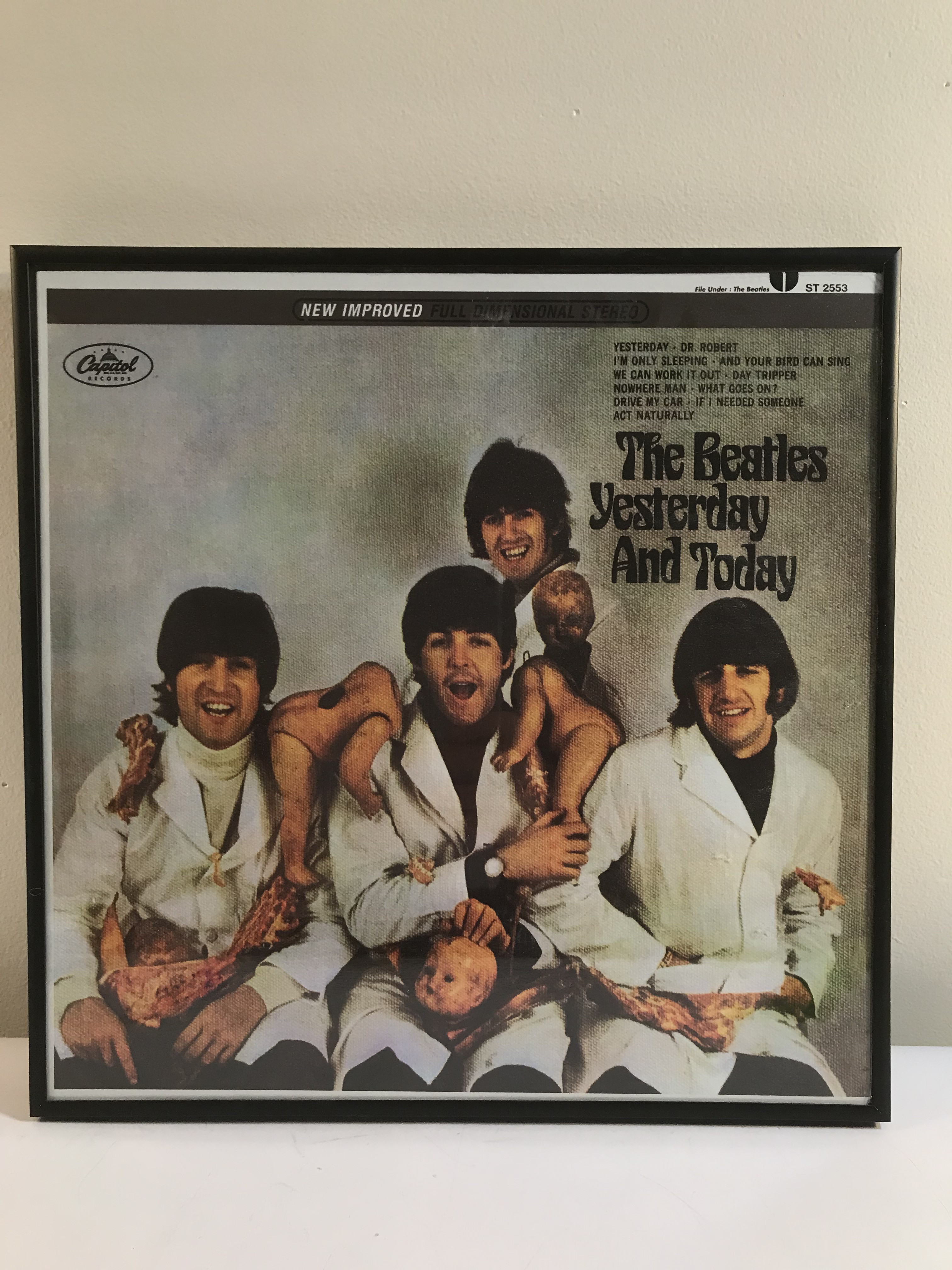 This item is a framed canvas art print manufactured by Harbortown Industries, featuring a reproduction of the original 1966 Butcher Cover photograph for the North American Beatles album Yesterday and Today. Frame measures appr. 13 x 13 inches