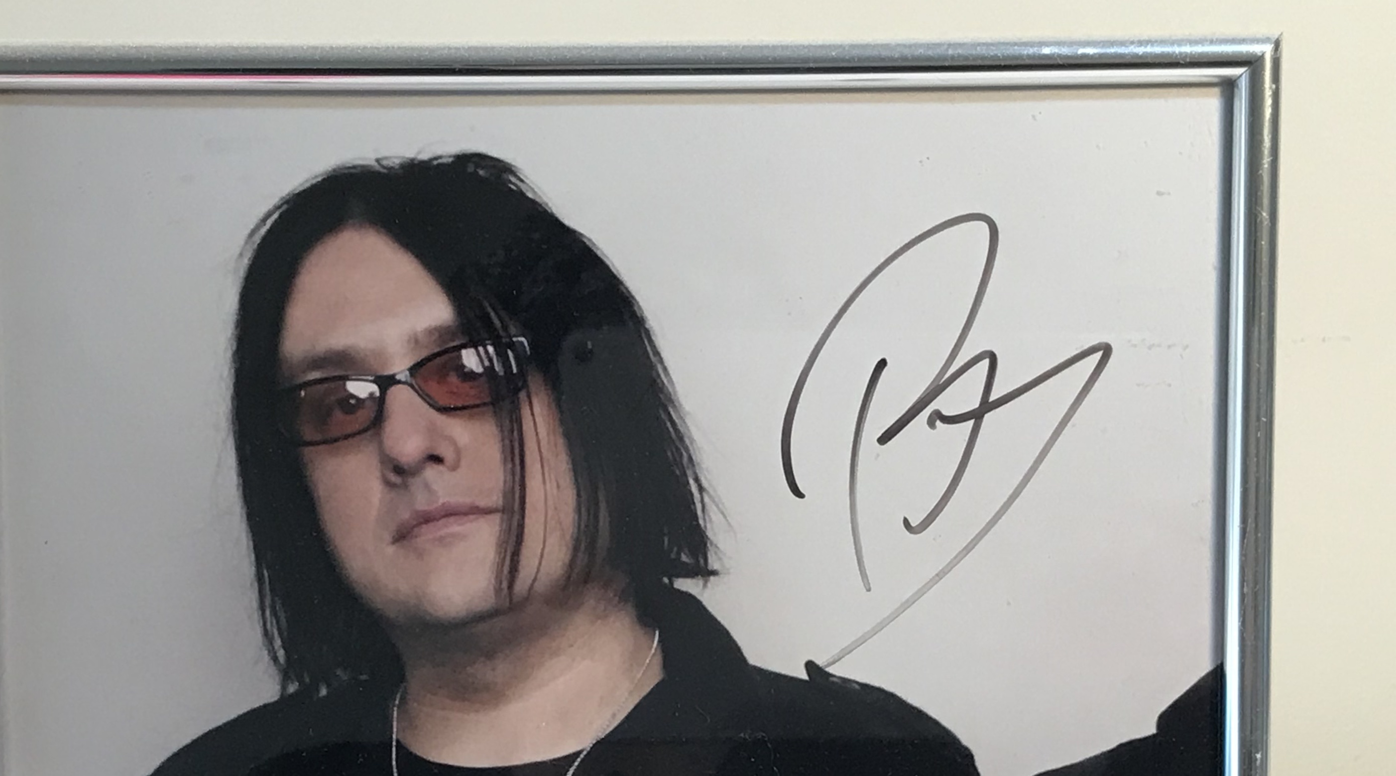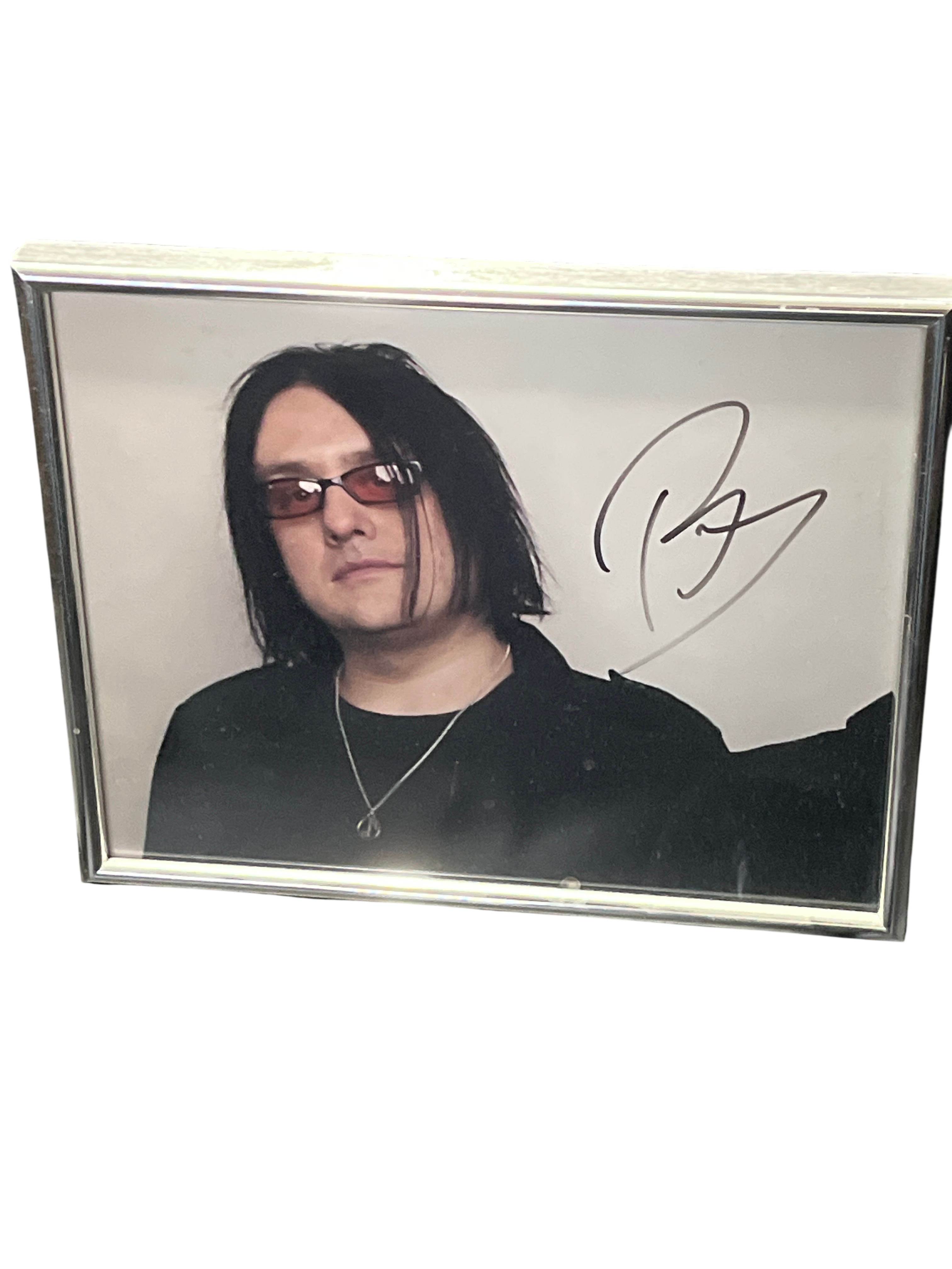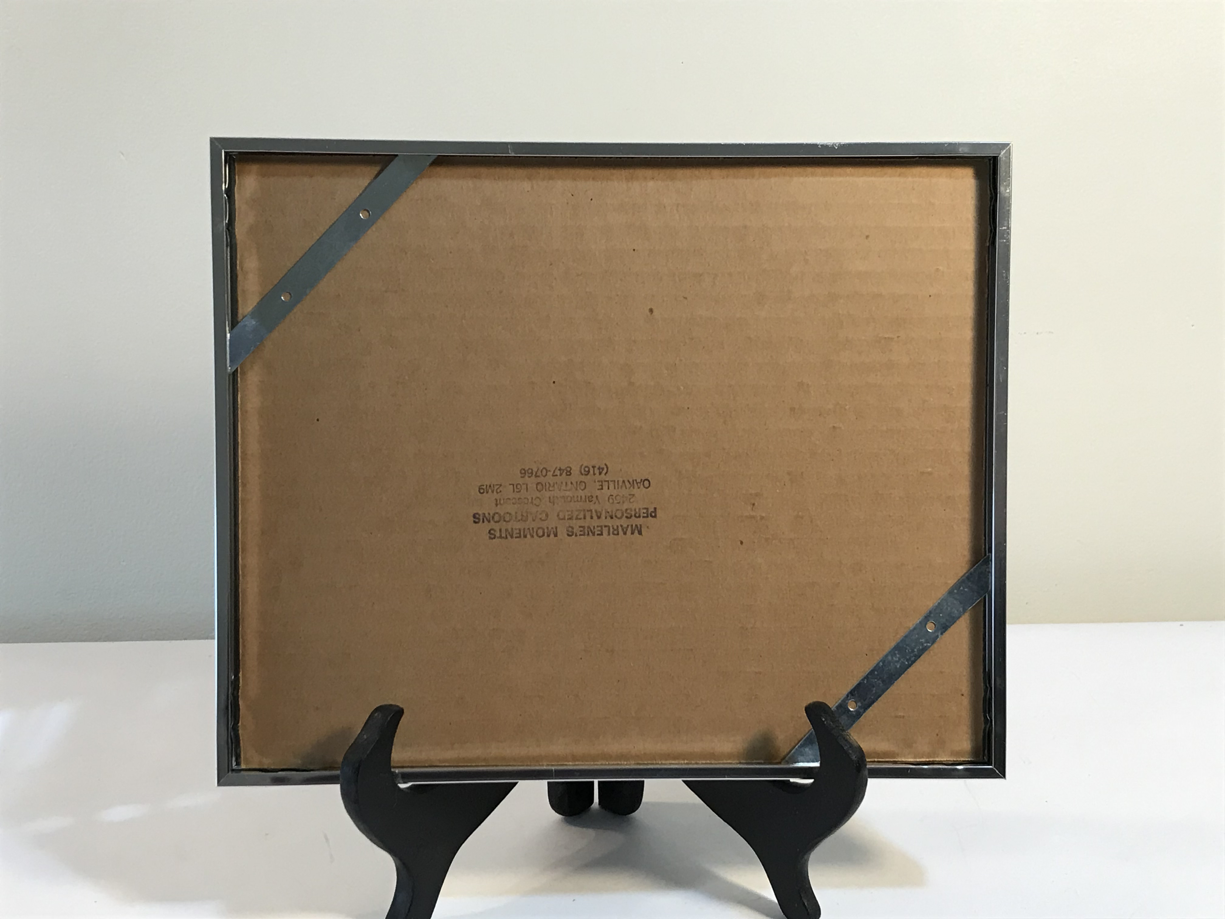 The item is signed in black ink in the upper left quadrant and presented in a slim silver-toned metal frame under glass. Frame measures 10 1/2 by 8 1/2 inches. No authenticity