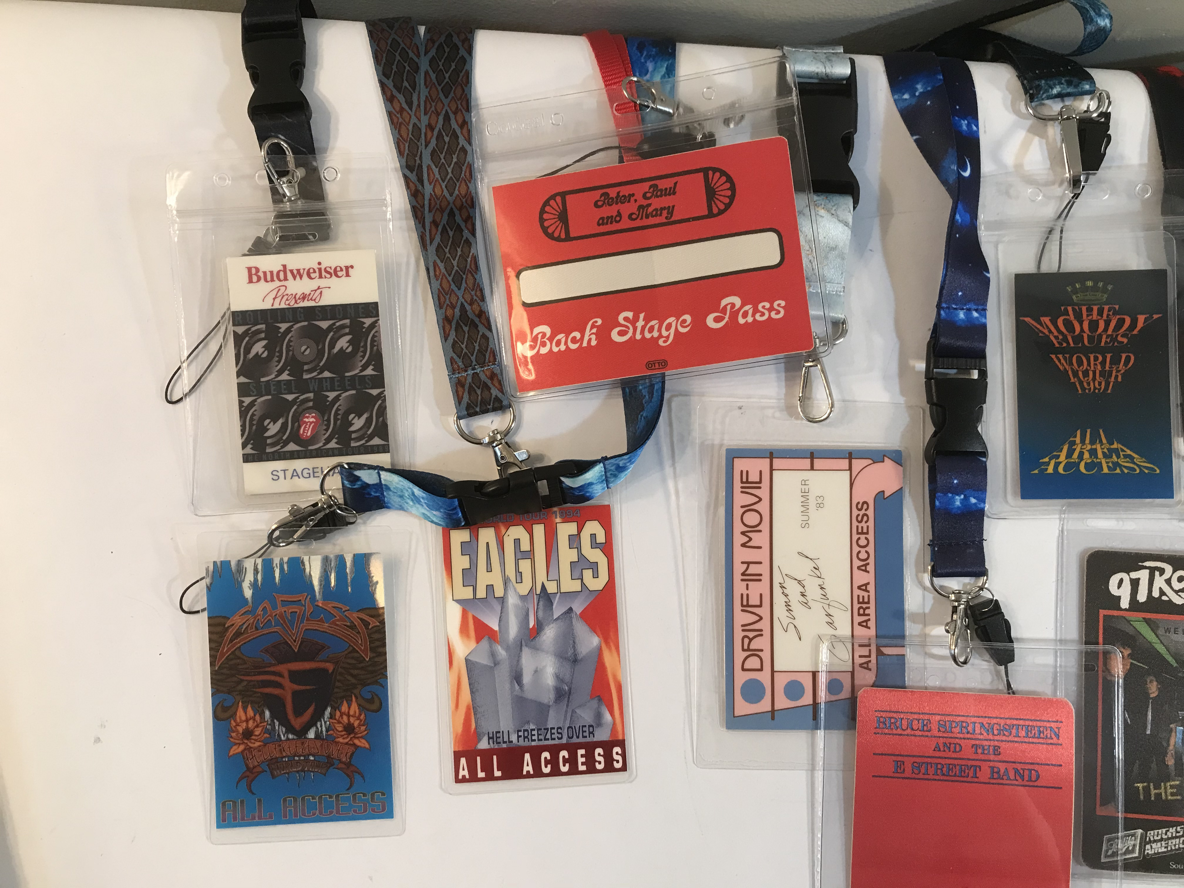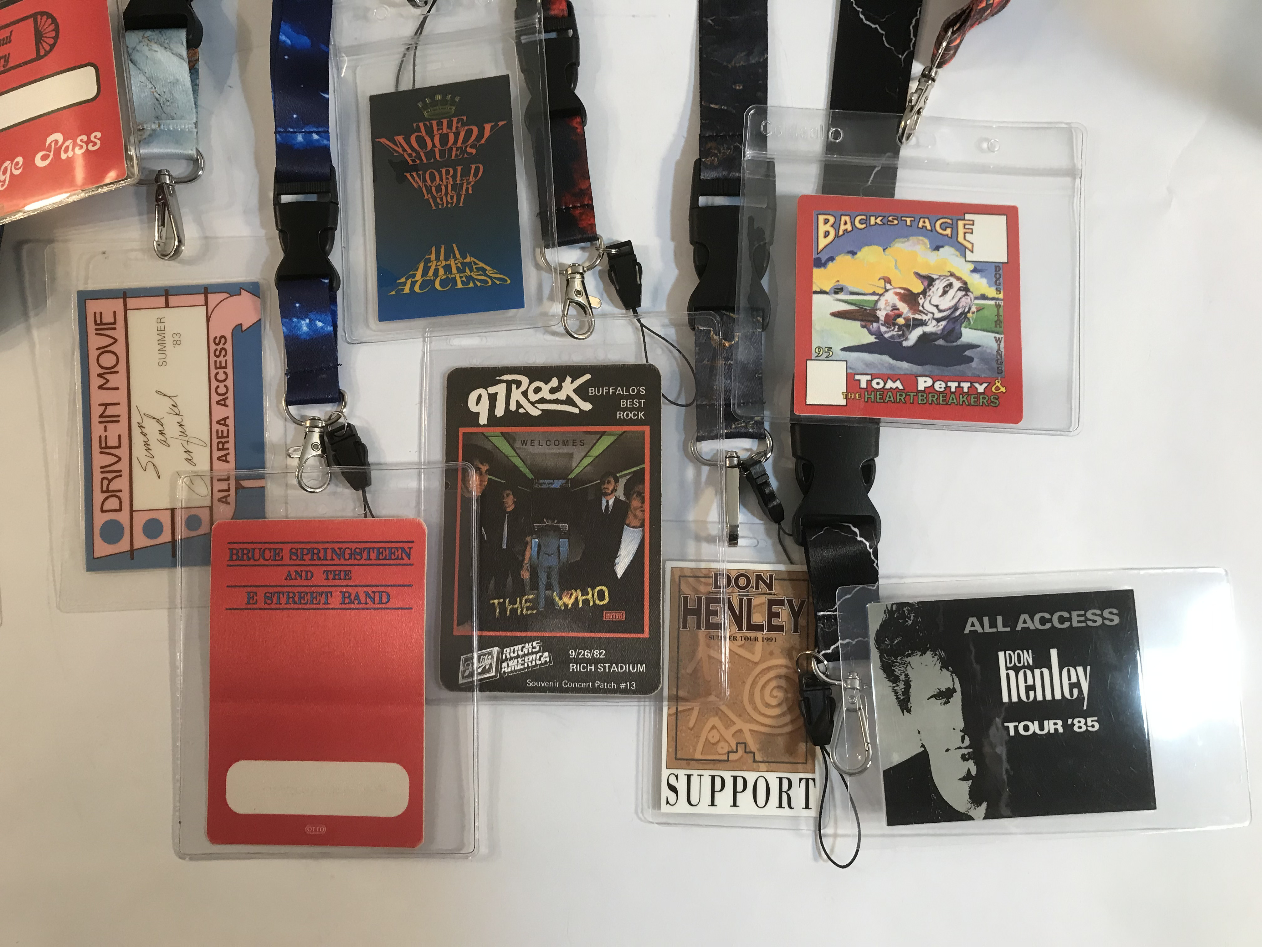 An assortment of concert backstage passes, tour personnel credentials, and a souvenir patch produced by Otto Printing and Entertainment Graphics between 1982 and 1997. The collection includes passes for The Rolling Stones, Eagles, Bruce Springsteen, Tom Petty, Don Henley, and The Who, featuring various All Access, Stagehand, and Support designations. Most items are housed in clear plastic protective sleeves and accompanied by approximately eight patterned fabric lanyards with metal or plastic clips. Several passes bear the printed OTTO manufacturer mark within a horizontal oval.