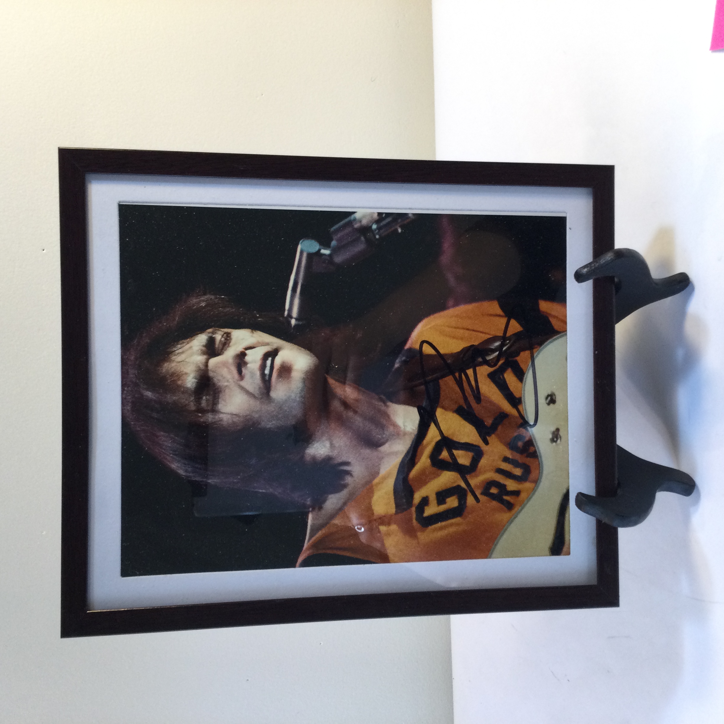A framed color photograph of musician Neil Young depicted during a live performance. The subject is shown from the chest up, singing into a microphone while playing a guitar. He is wearing an orange t-shirt with black lettering that reads GOLD RUSH, a reference to his 1970 album After the Gold Rush. The photograph features a signature in black felt-tip marker across the center-right portion of the image. Frame measures 11 1/2 by 9 1/2 inches No gallery labels, manufacturer marks, or Certificate of Authenticity are present.