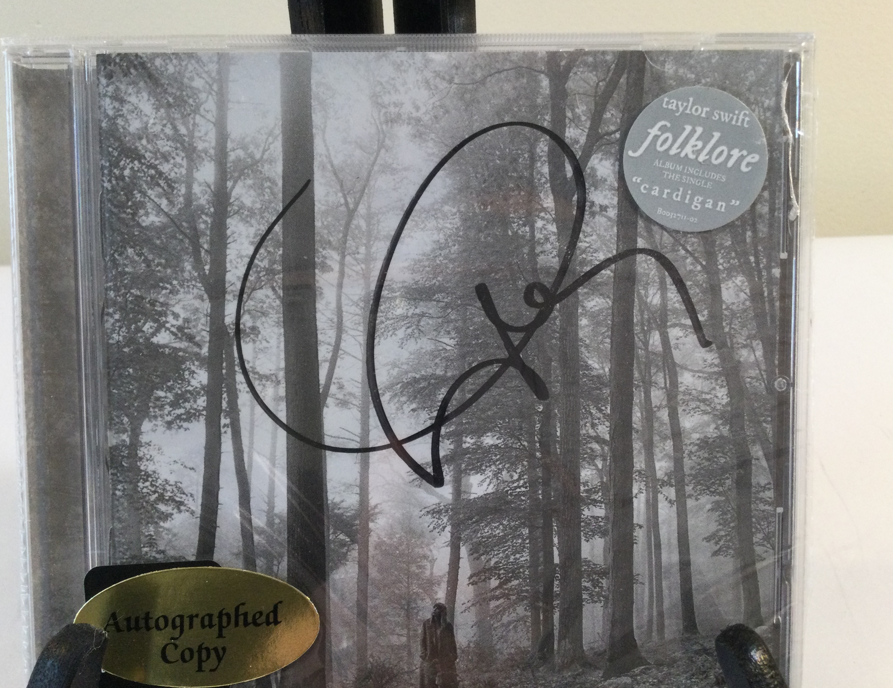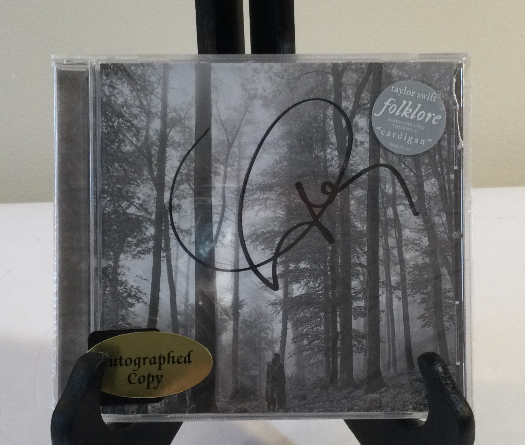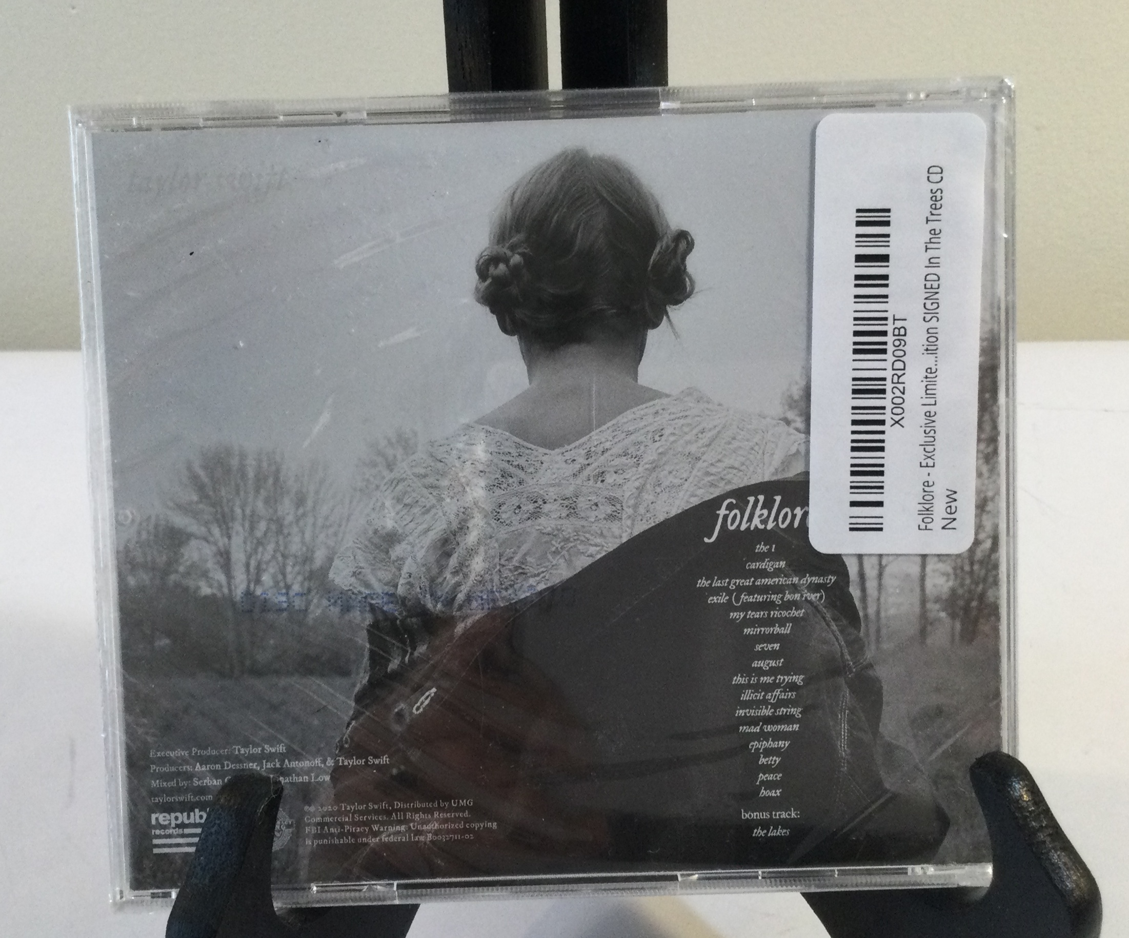 This lot consists of a factory-sealed, autographed compact disc of the 2020 Taylor Swift album folklore. This is the In The Trees edition of the release. The front cover insert features a signature in black ink, consisting of a stylized cursive T and a series of loops. The item is housed in a standard jewel case and remains in its original factory shrink-wrap. Affixed to the front of the shrink-wrap is a circular grey hype sticker with the text taylor swift folklore ALBUM INCLUDES THE SINGLE cardigan B0032711-02 and a gold oval sticker reading Autographed Copy. The back of the case features a white retail barcode sticker identifying the item as a signed limited edition. The reverse insert displays the tracklist, including the bonus track the lakes, and credits for Republic Records.