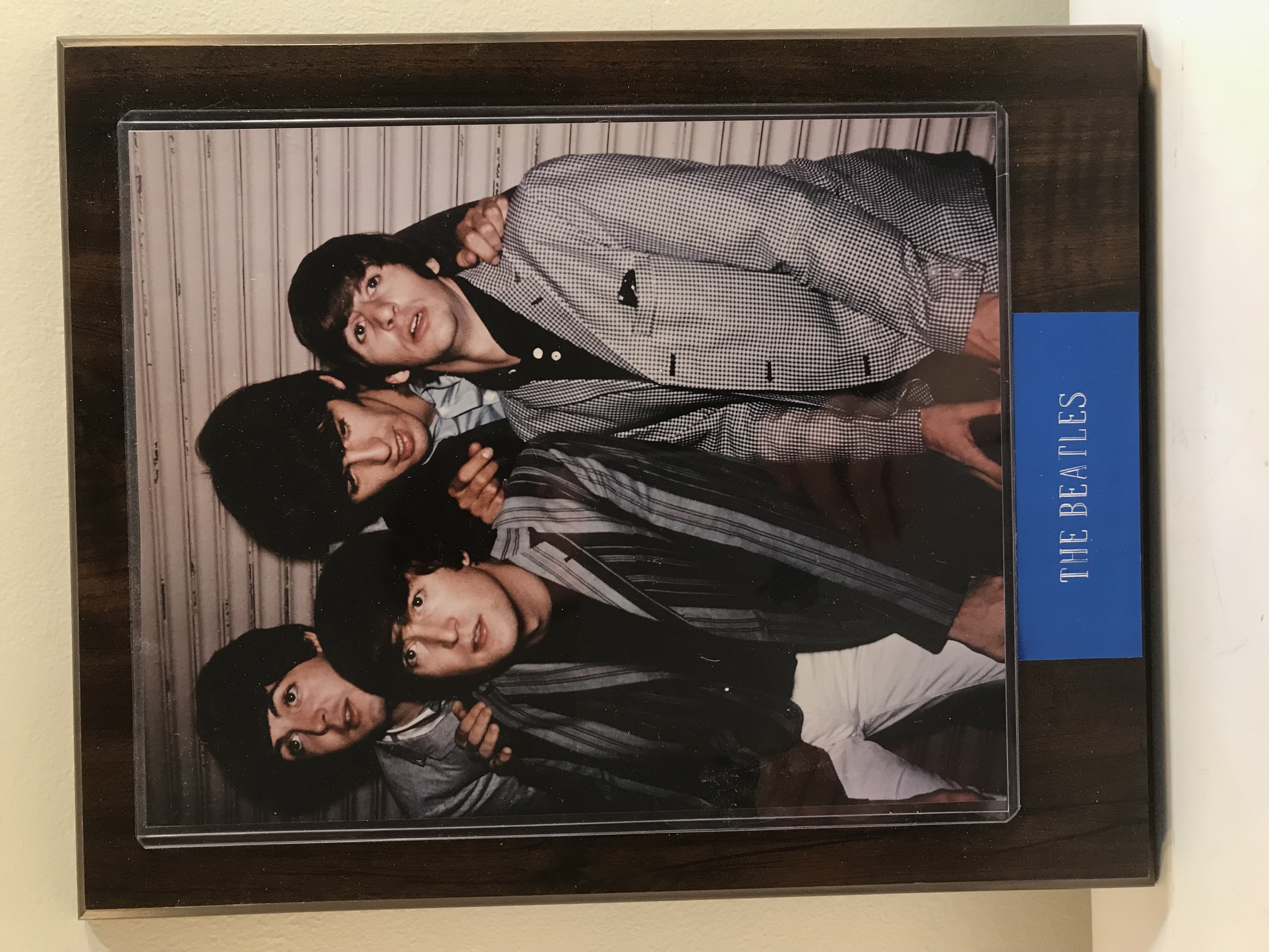 This wall-mounted commemorative plaque features a color photograph of the English rock band The Beatles, depicting John Lennon, Paul McCartney, George Harrison, and Ringo Starr. Plaque measures 13 x 10 inches