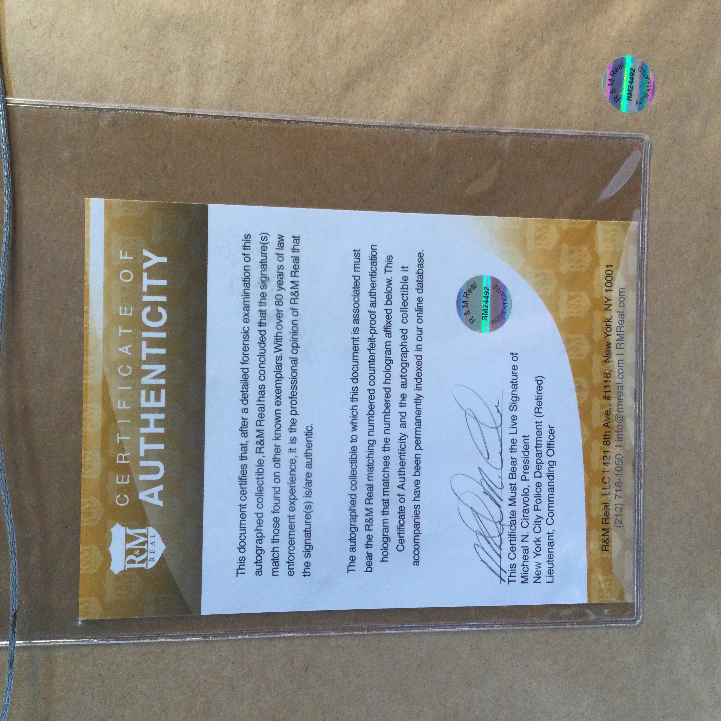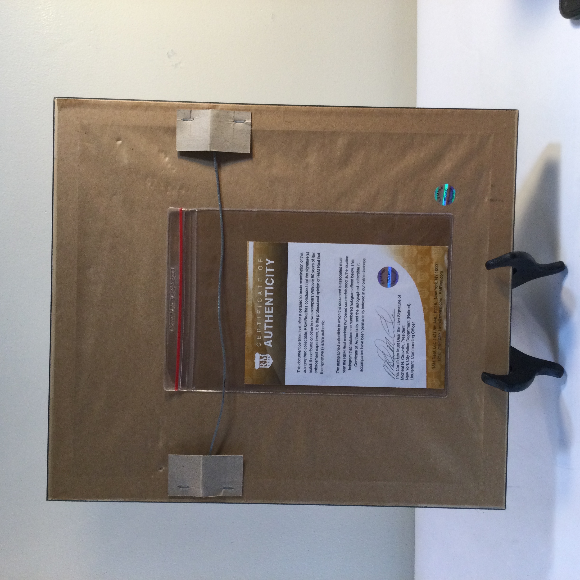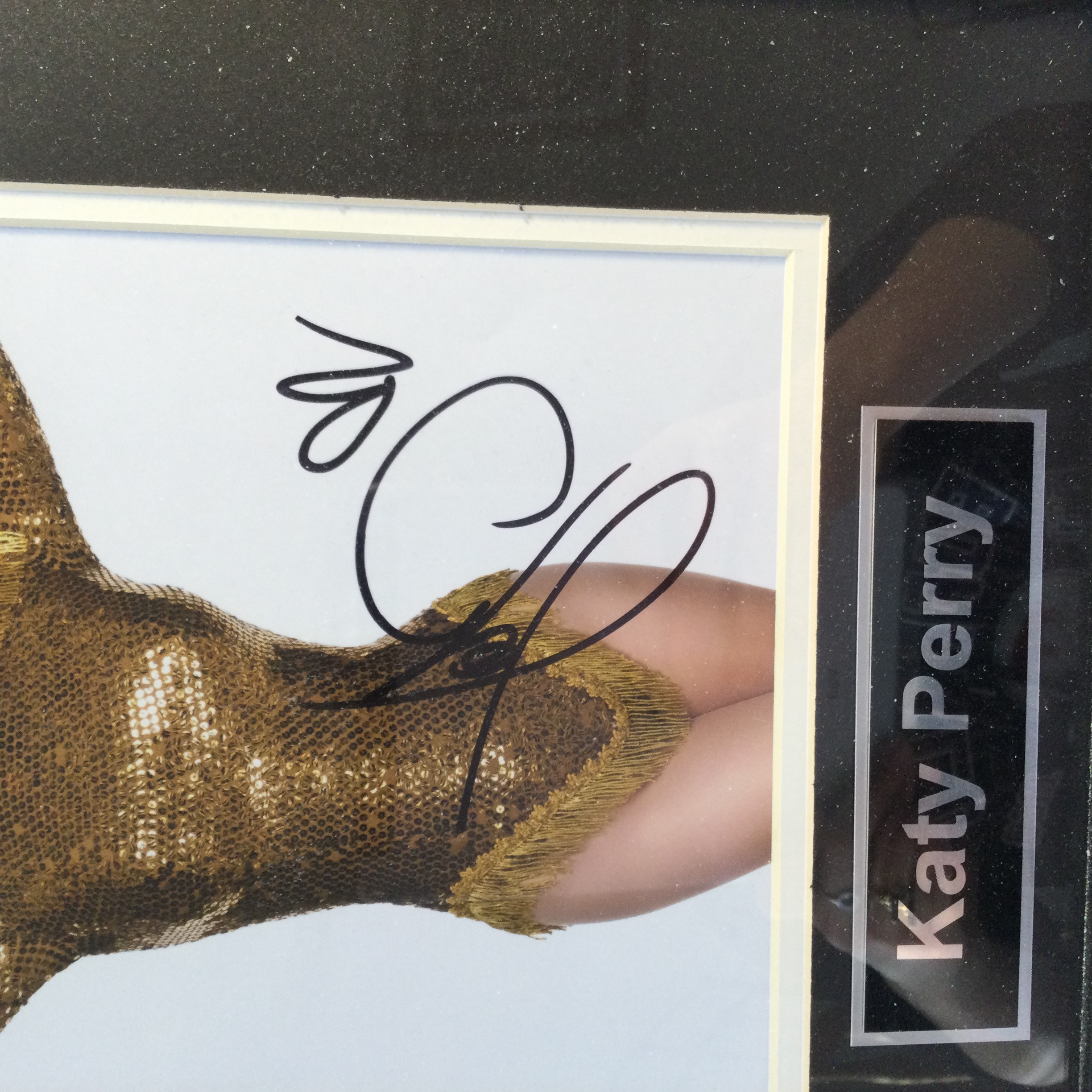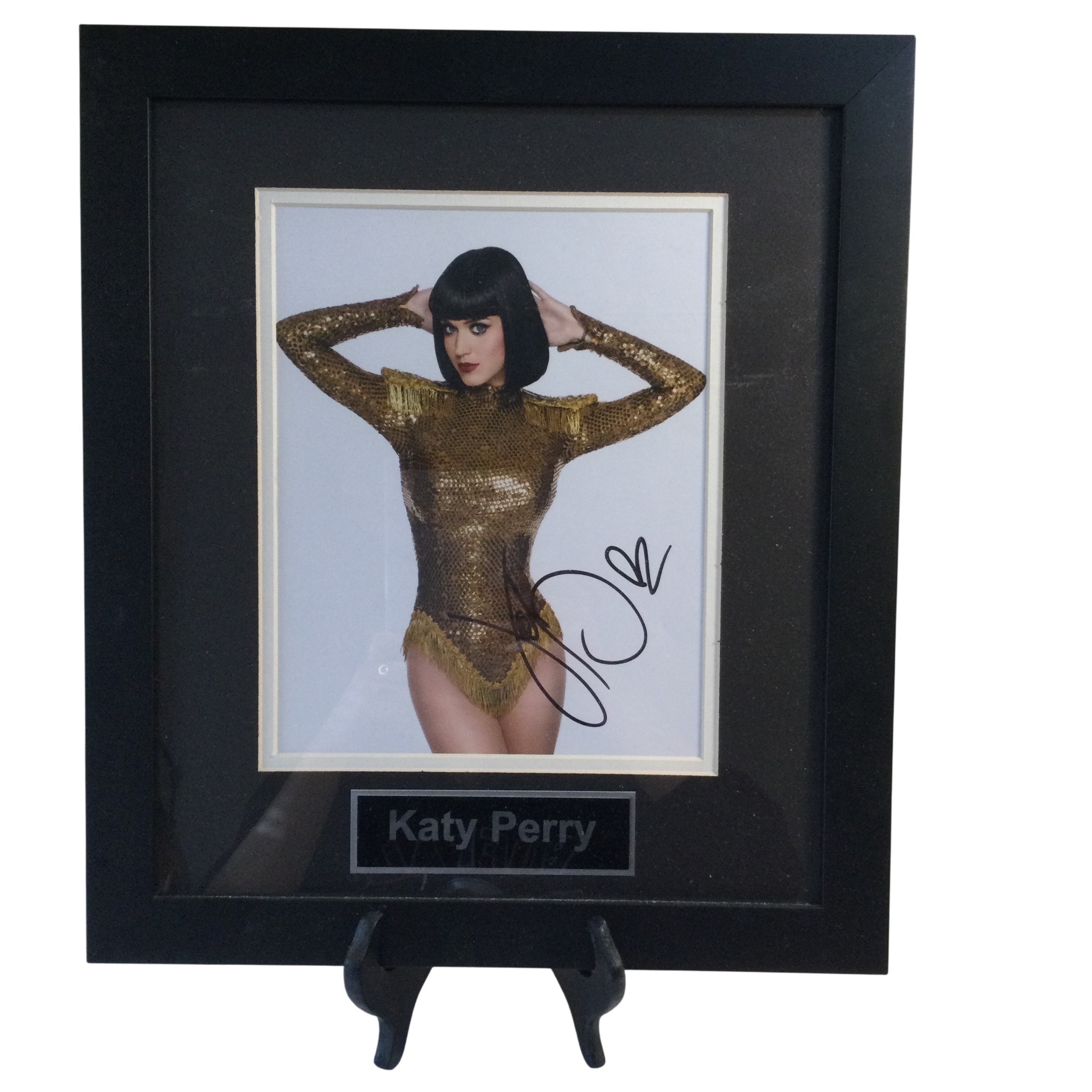 Professionally framed and matted promotional photograph of Katy Perry. The image depicts the artist in a gold-sequined bodysuit with fringe detailing and a black bob-style wig. The photograph is signed in black ink across the center. The item includes a Certificate of Authenticity from R&M Real, LLC. The certificate states that the autograph has undergone forensic examination and matches known exemplars. A matching circular tamper-proof hologram label is present on both the certificate and the reverse of the frame. The frame measures appr. 16 x 14 inches