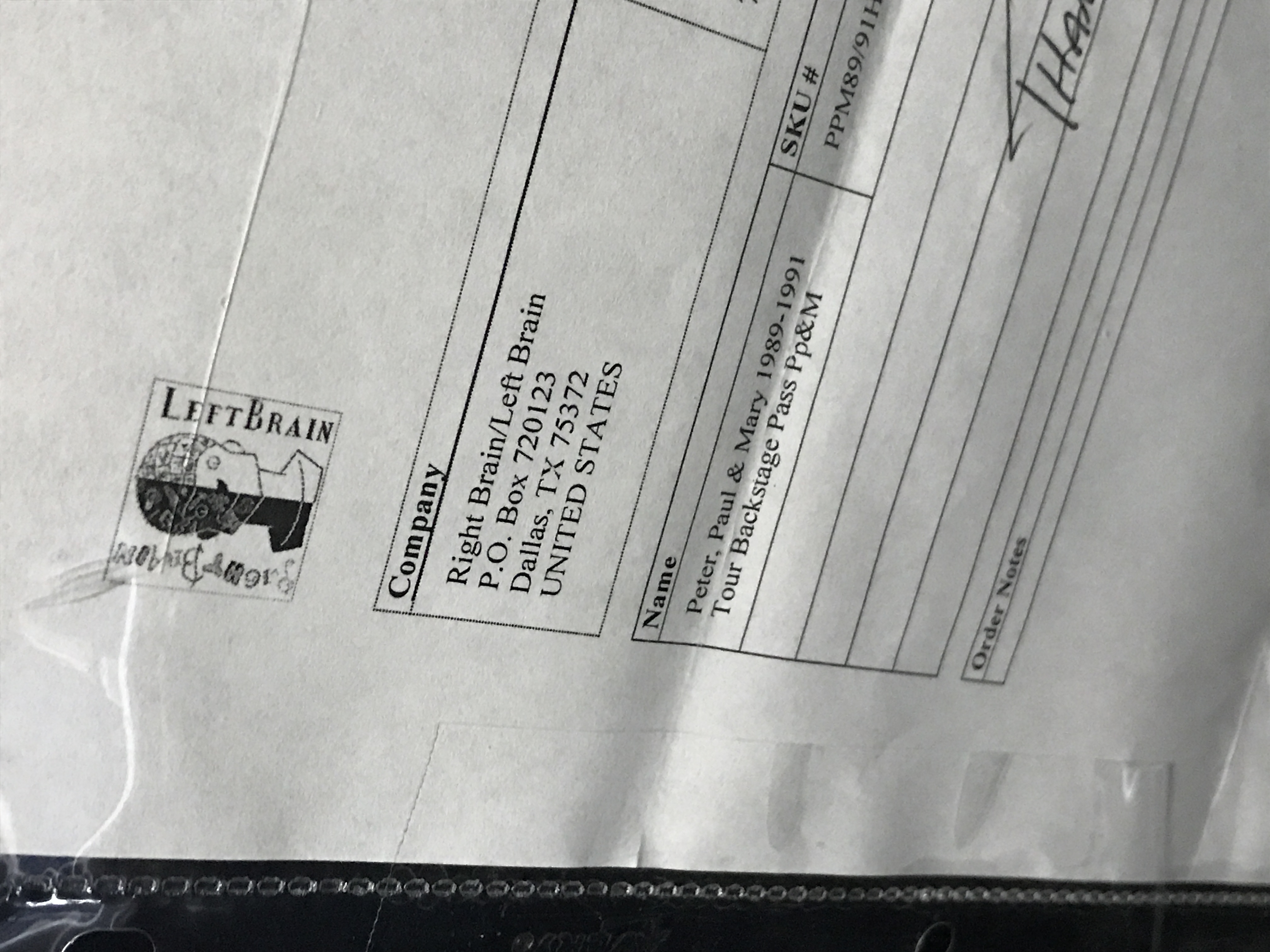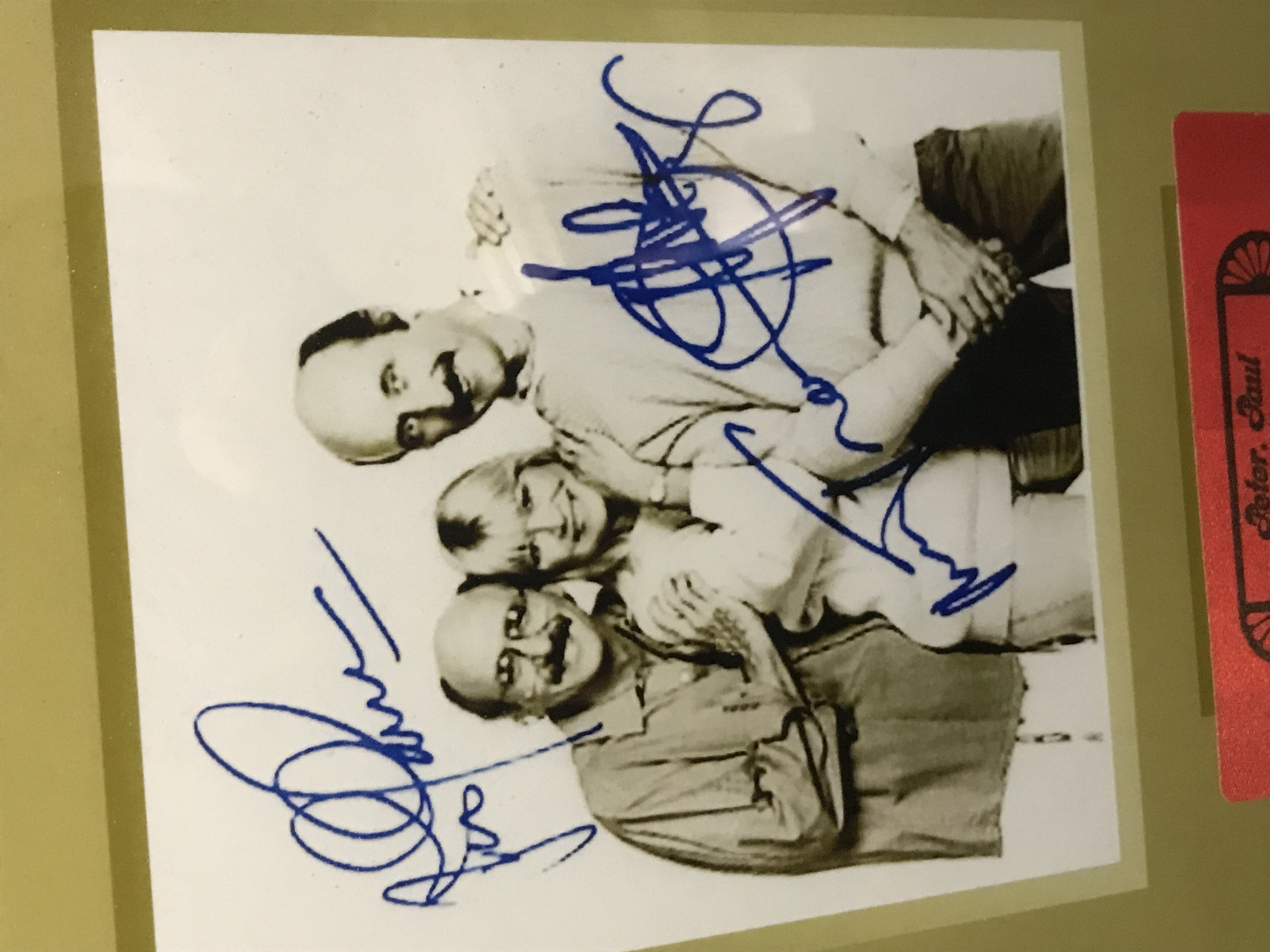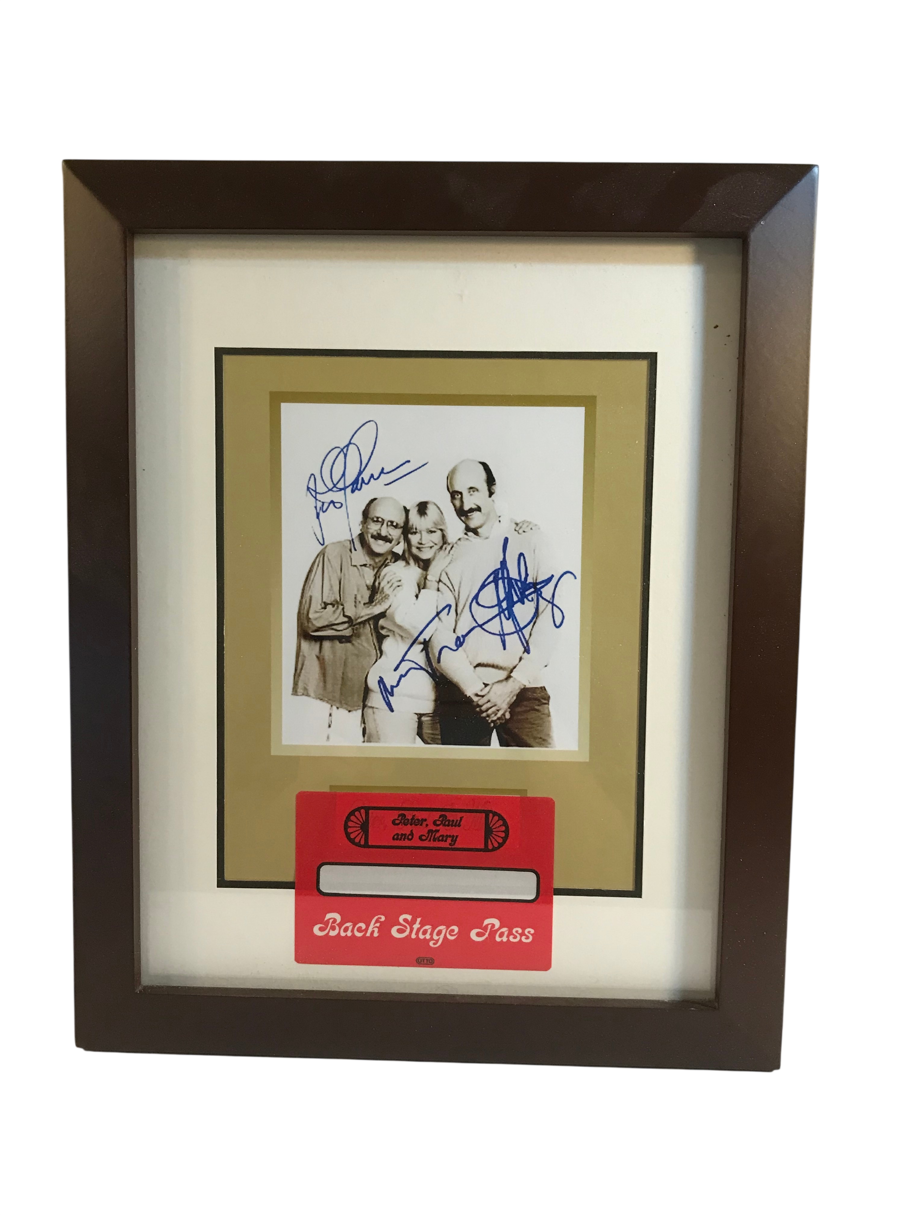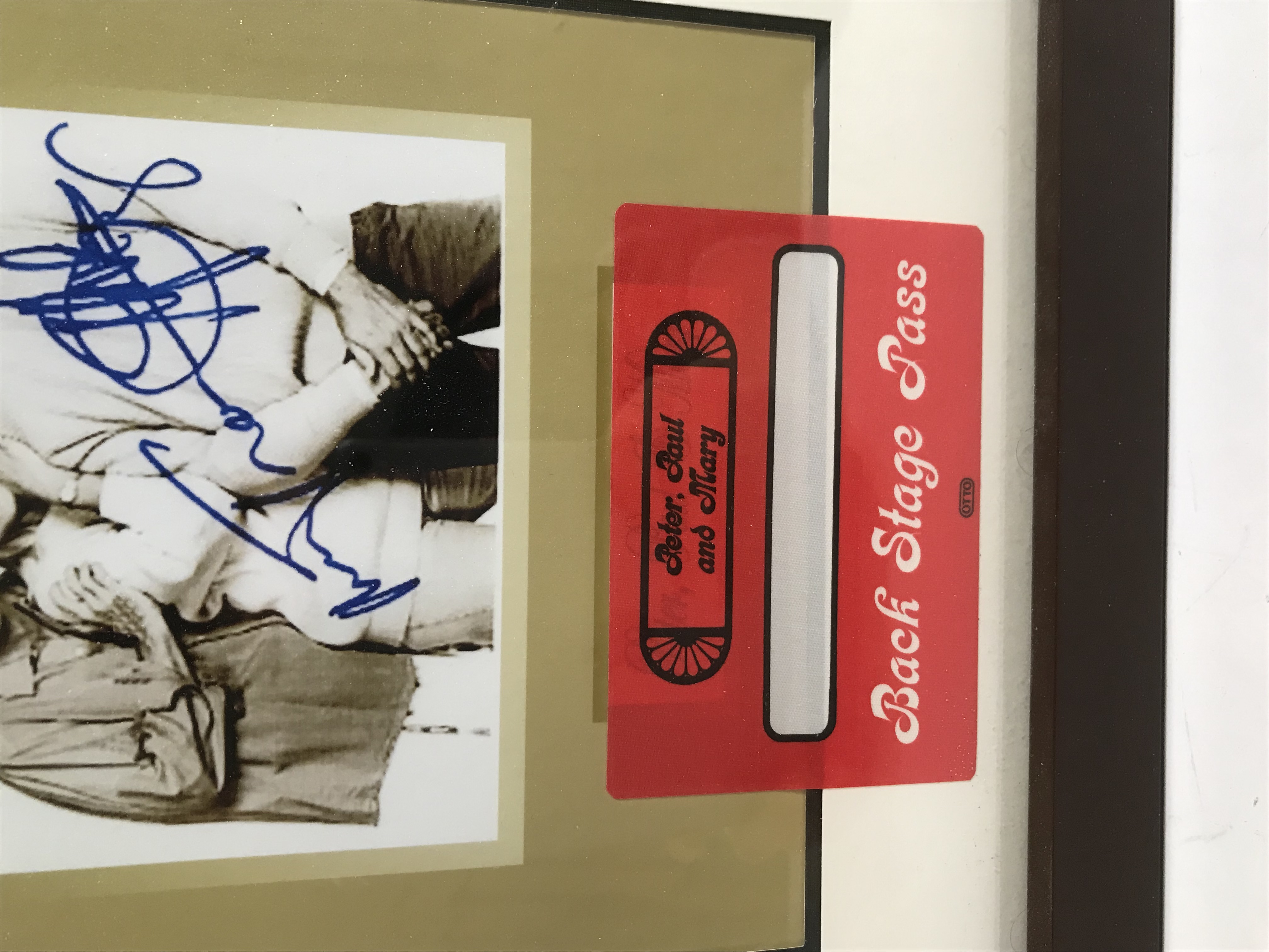 The photograph depicts members Peter Yarrow, Noel Paul Stookey, and Mary Travers and is signed by all three individuals in blue ink. Mounted to the right of the photograph is a red rectangular backstage pass. Framed under Glass. Frame measures 16 x 13 inches. Original invoice on the back states that it was bought from right brain left brain in Dallas Texas.