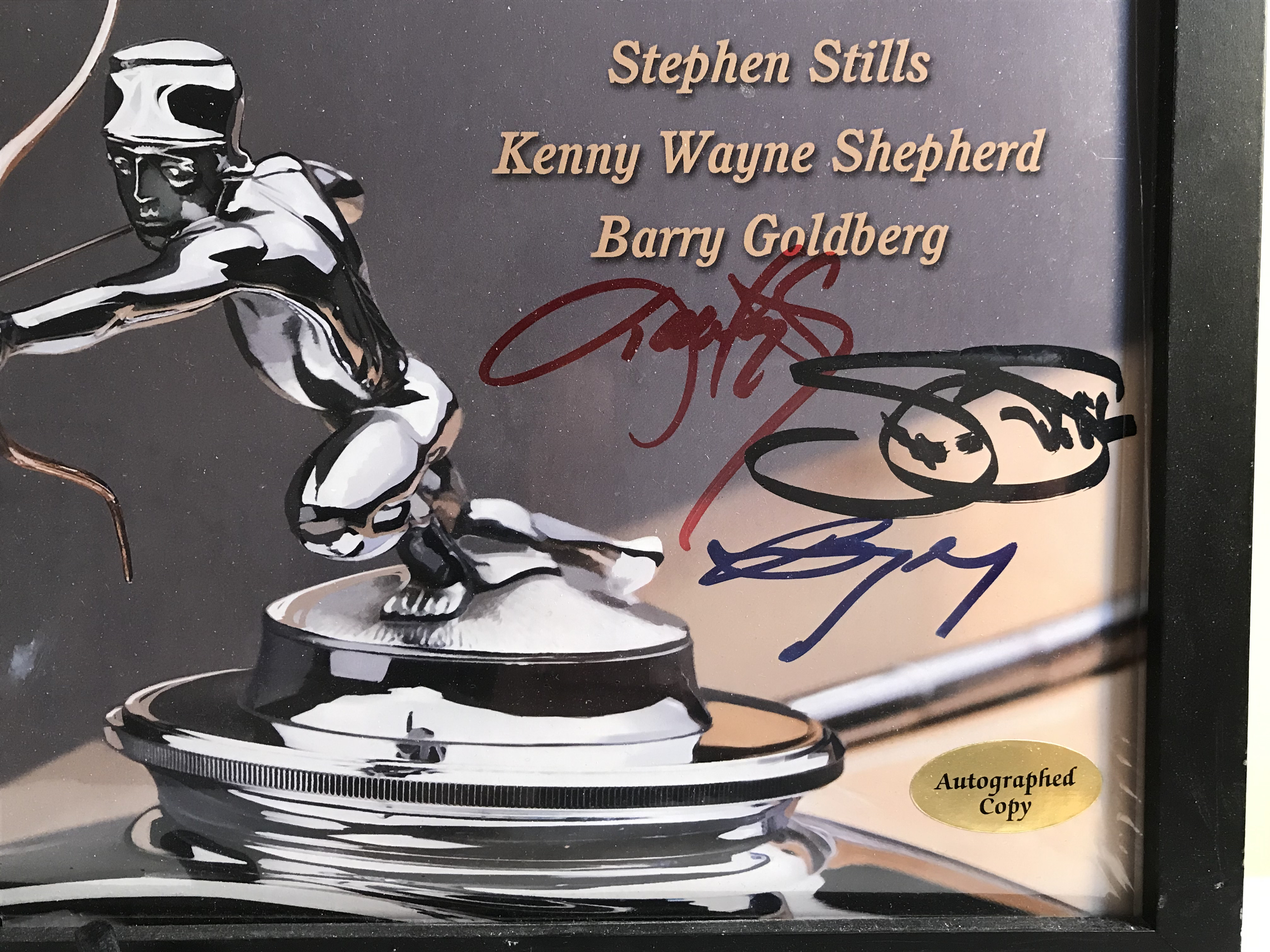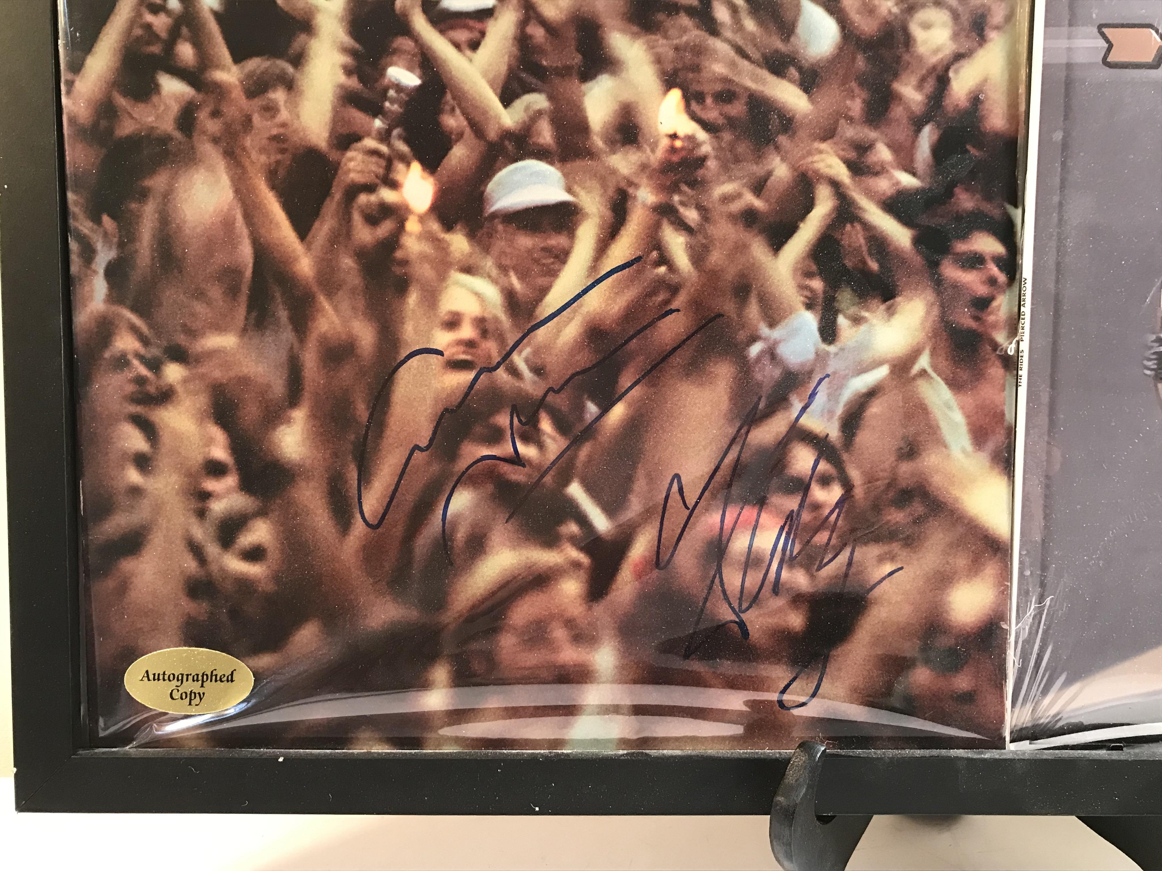 David Crosby, Graham Nash, and The Rides (Stephen Stills, Kenny Wayne Shepherd, and Barry Goldberg) autographed LP covers, circa 1977-2016. The lot includes Crosby-Nash Live signed by Crosby and Nash in blue marker and Pierced Arrow signed by Stills, Shepherd, and Goldberg in red, black, and blue markers. Both record albums feature gold Autographed Copy retail stickers, and the Crosby-Nash album bears a gold promotional demonstration stamp. The items are housed in a horizontal black composite frame with a fiberboard backing and hanging hardware. Frame measures 26 x 14 inches, if requested we can ship without the frame.