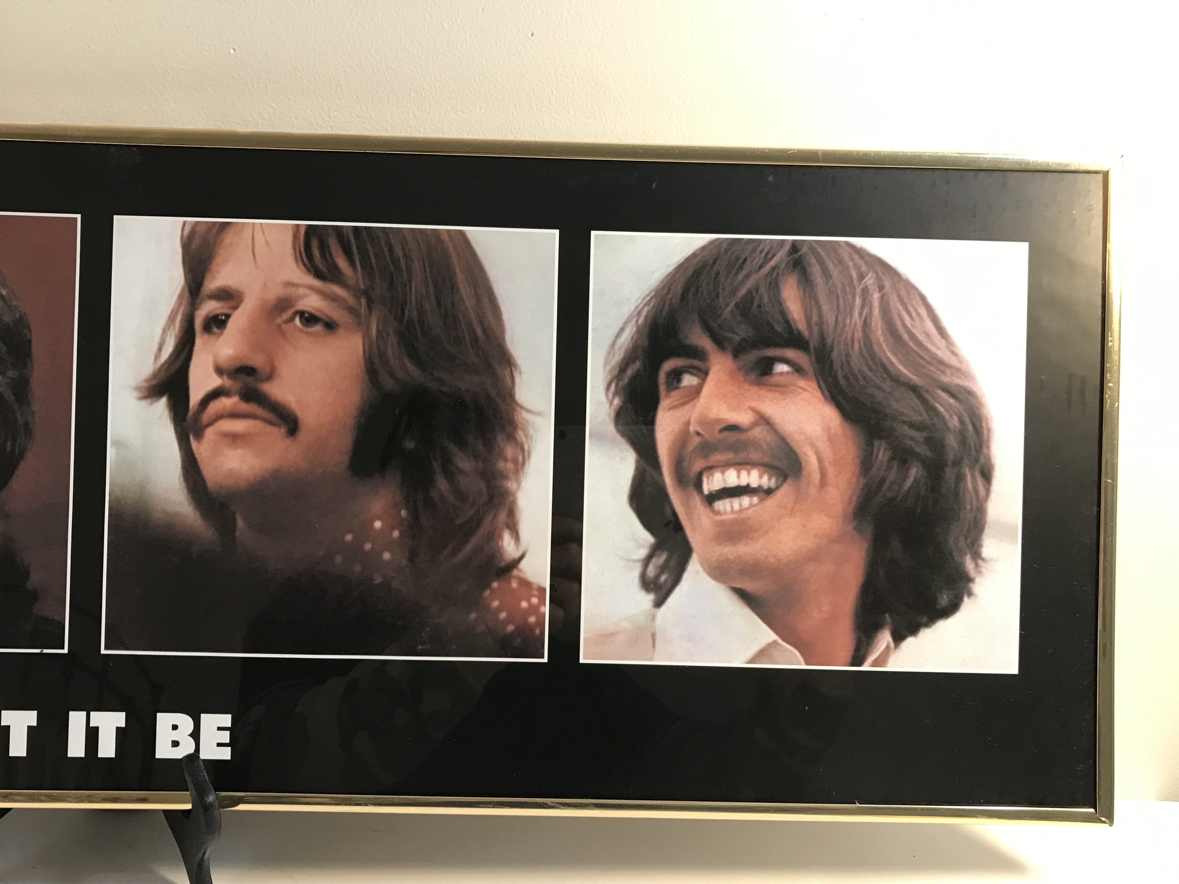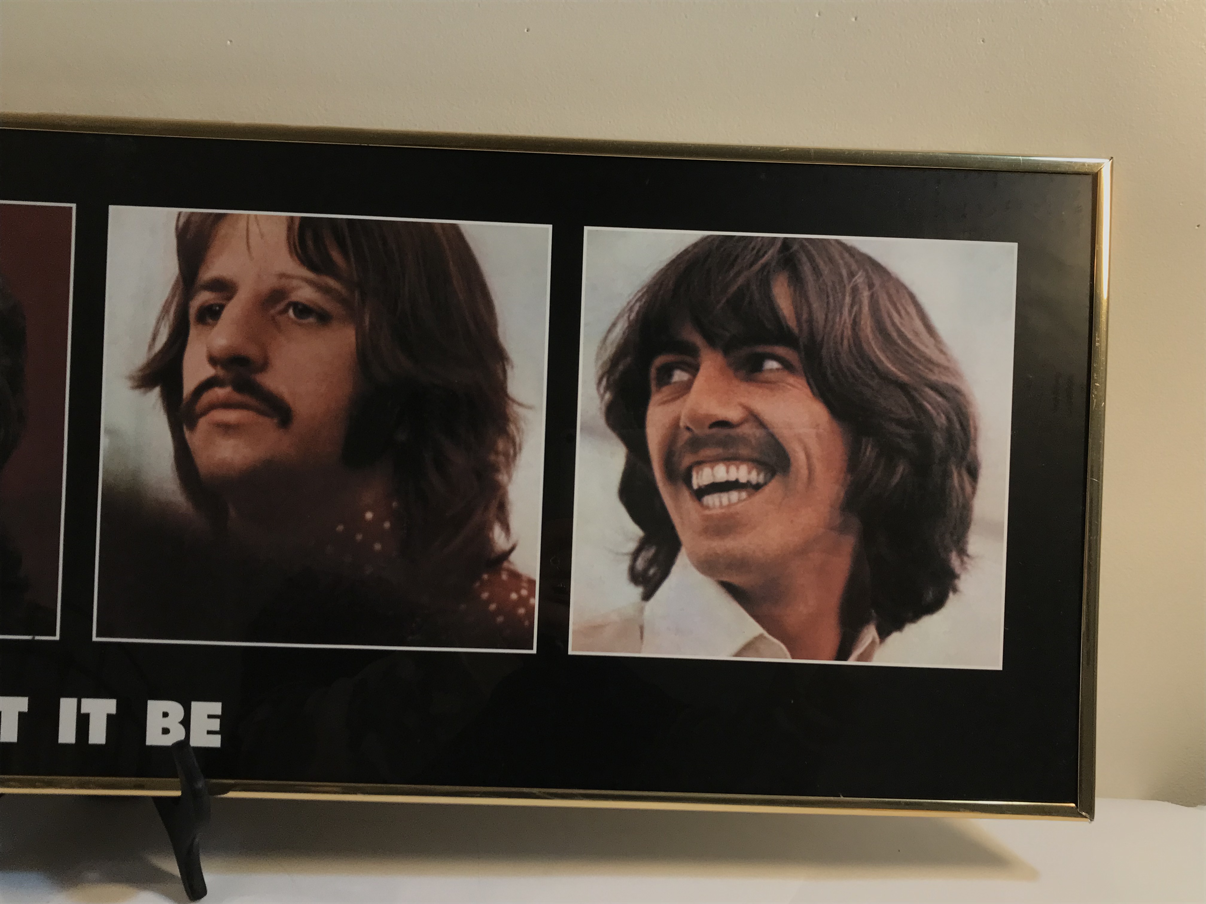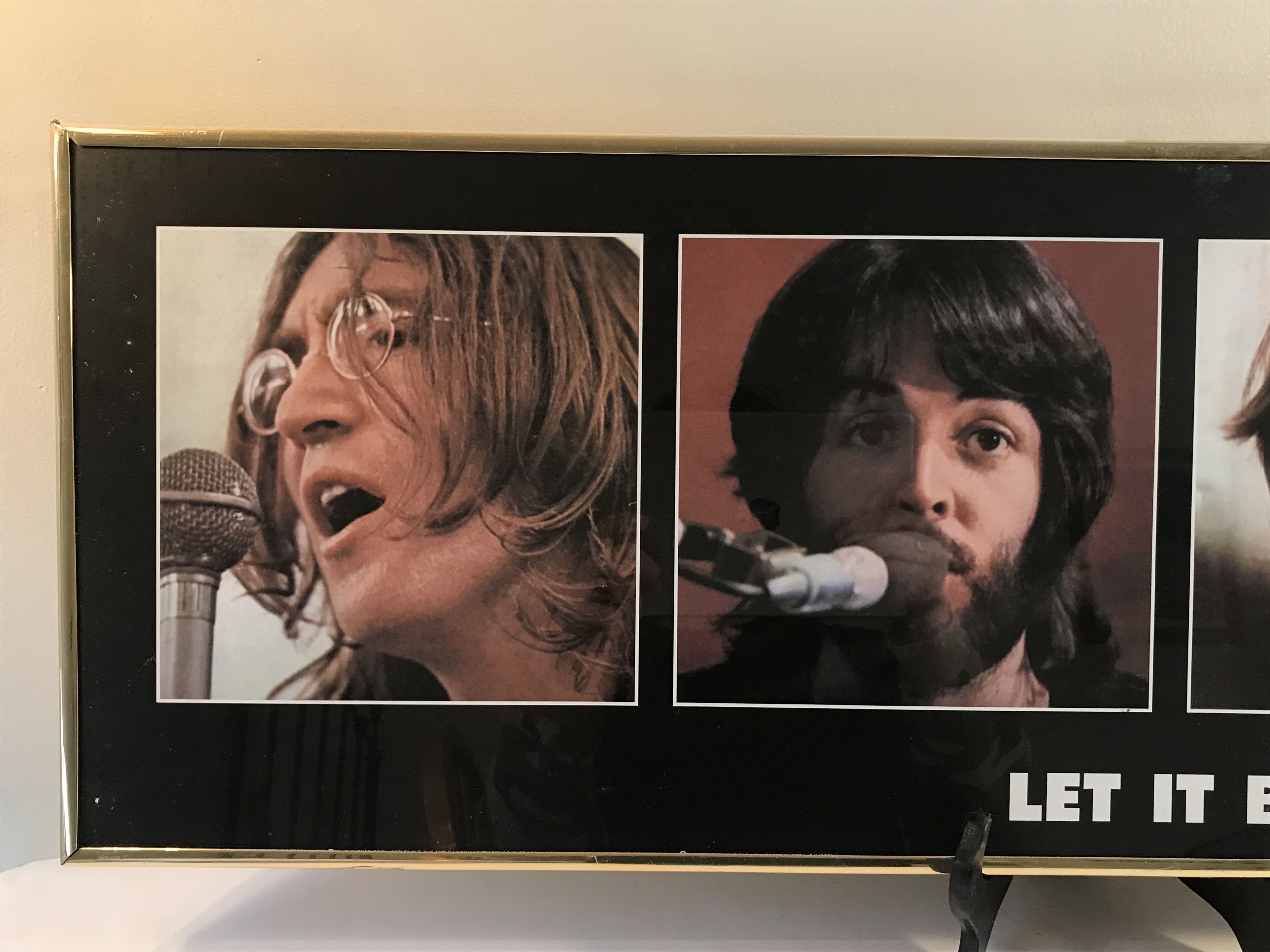 Apple Corps Licensed, This item is a framed panoramic-format lithograph poster featuring the four individual portraits of The Beatles—John Lennon, Paul McCartney, Ringo Starr, and George Harrison—originally used for the 1970 Let It Be album. Frame measures 3 feet by 1 foot