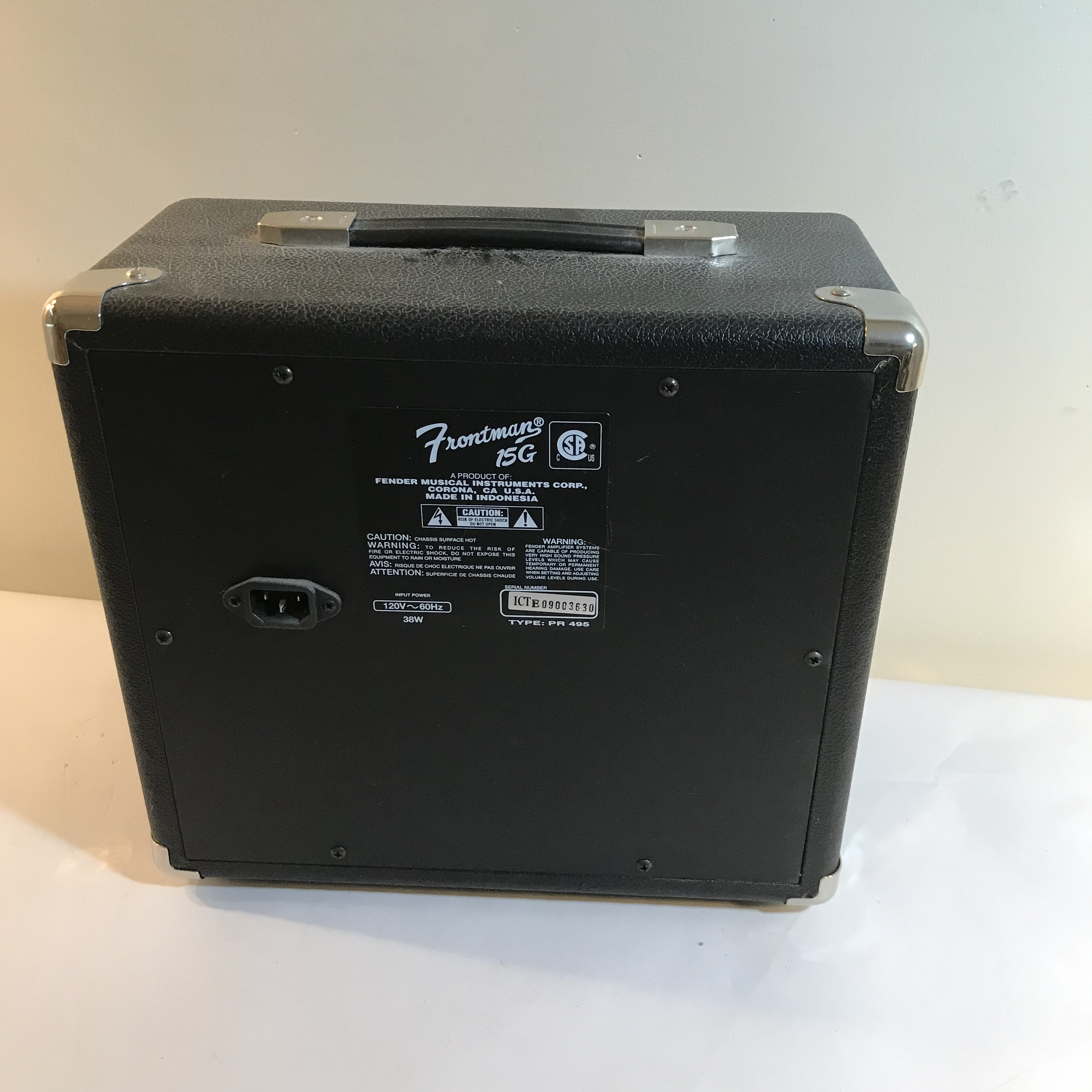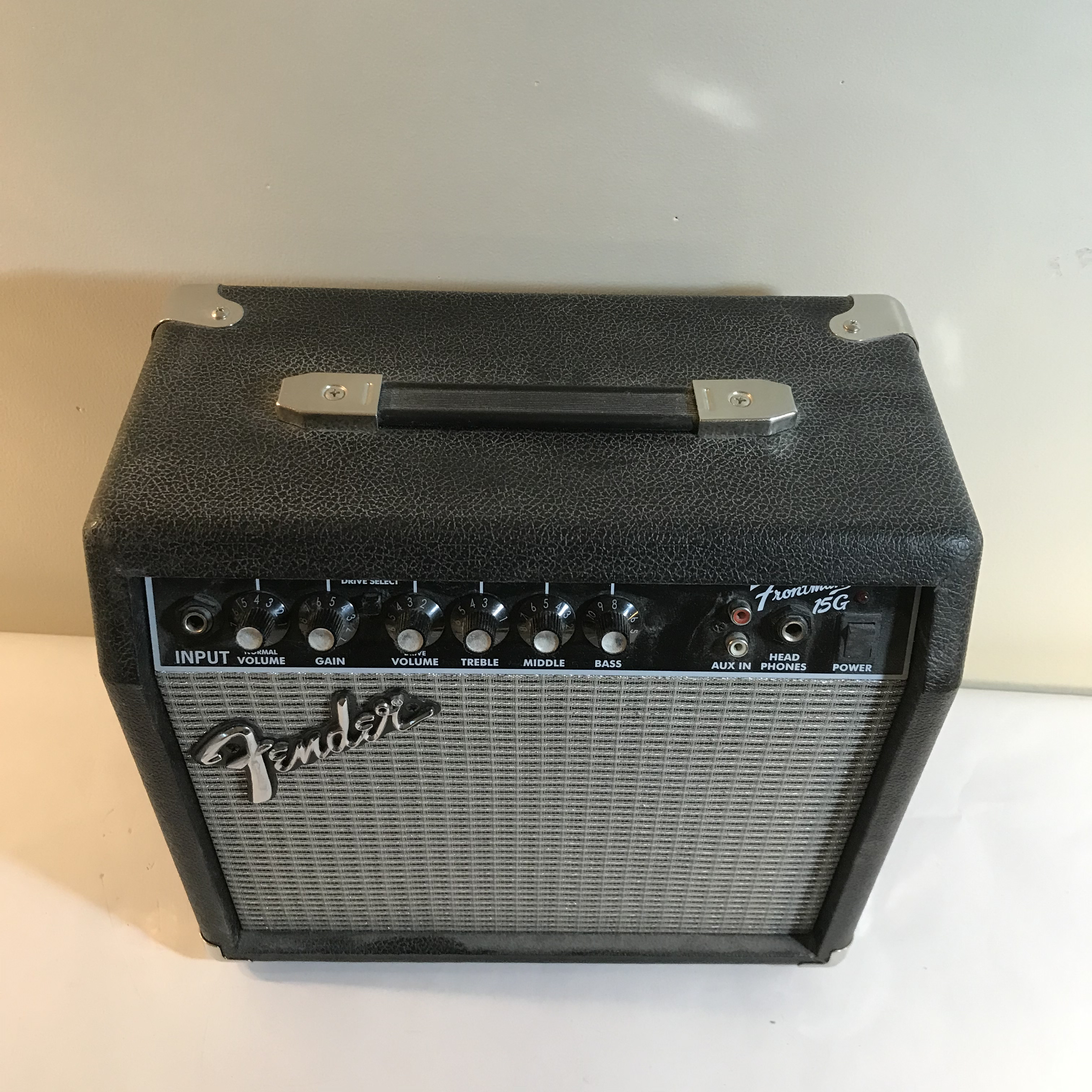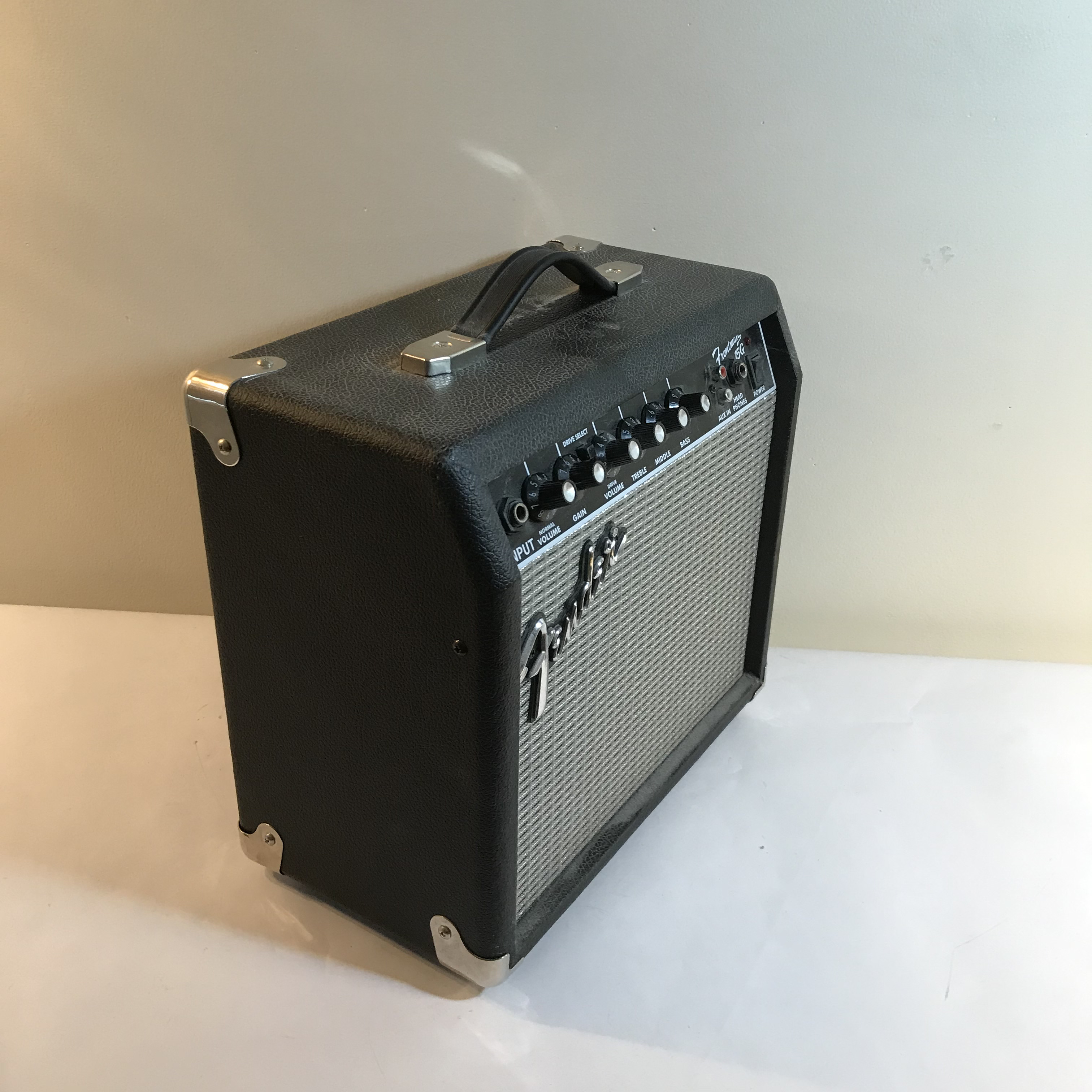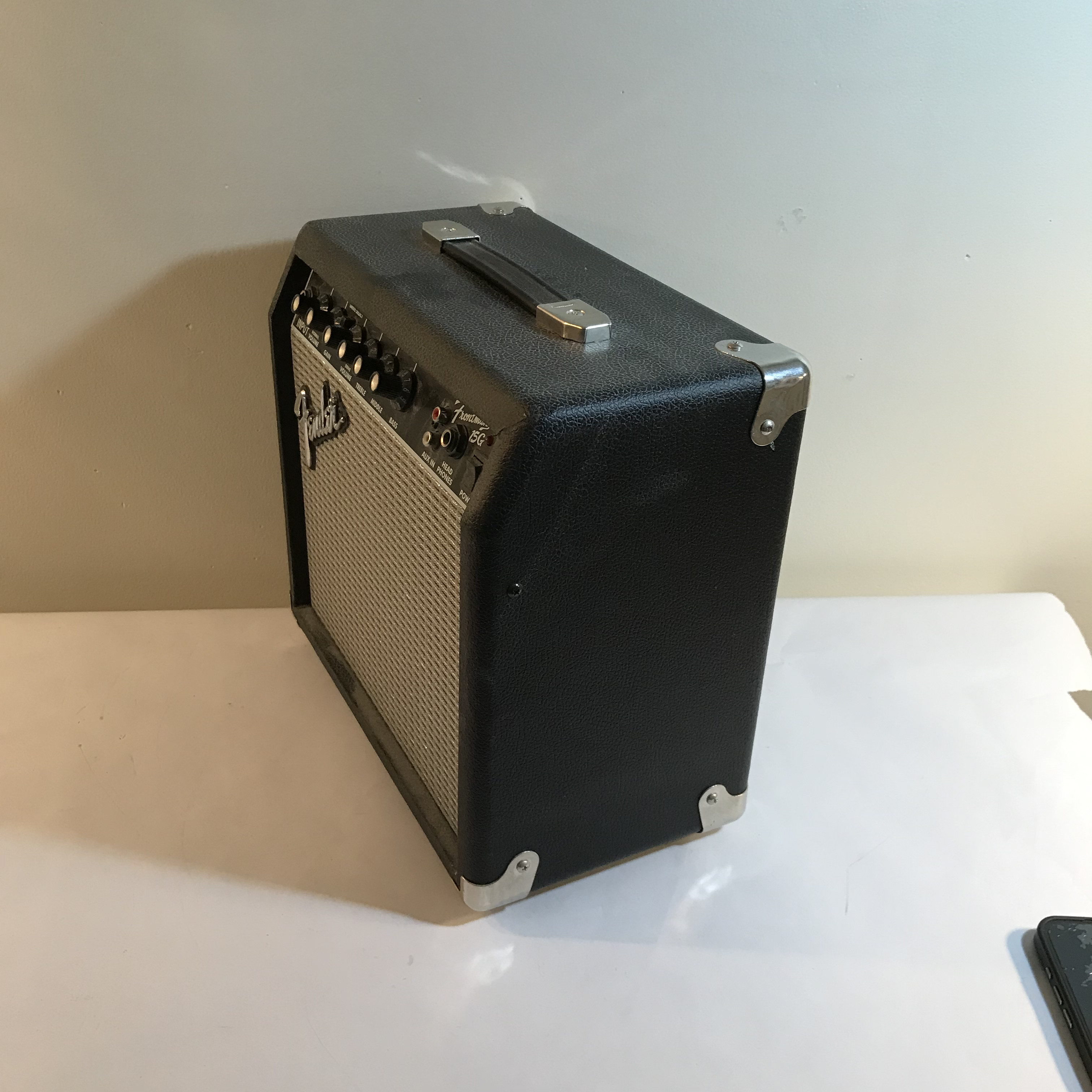 Fender Frontman 15G solid-state electric guitar practice amplifier. The unit is constructed with a wooden cabinet covered in black textured Tolex-style vinyl, featuring a silver-flecked grill cloth and chrome-plated metal corner protectors. Measures appr. 13.25 inches H x 13.25 inches W x 7.25 inches D.