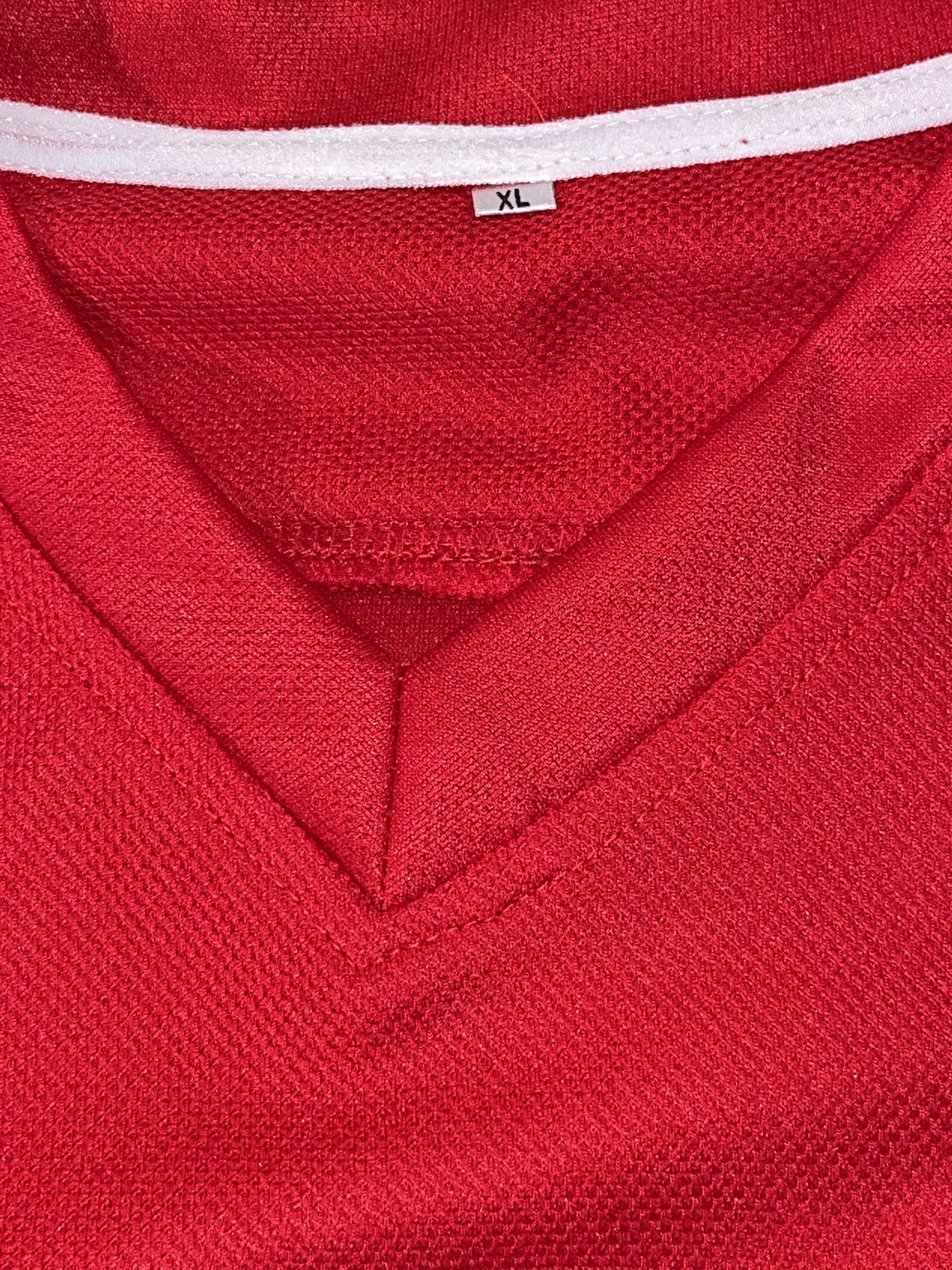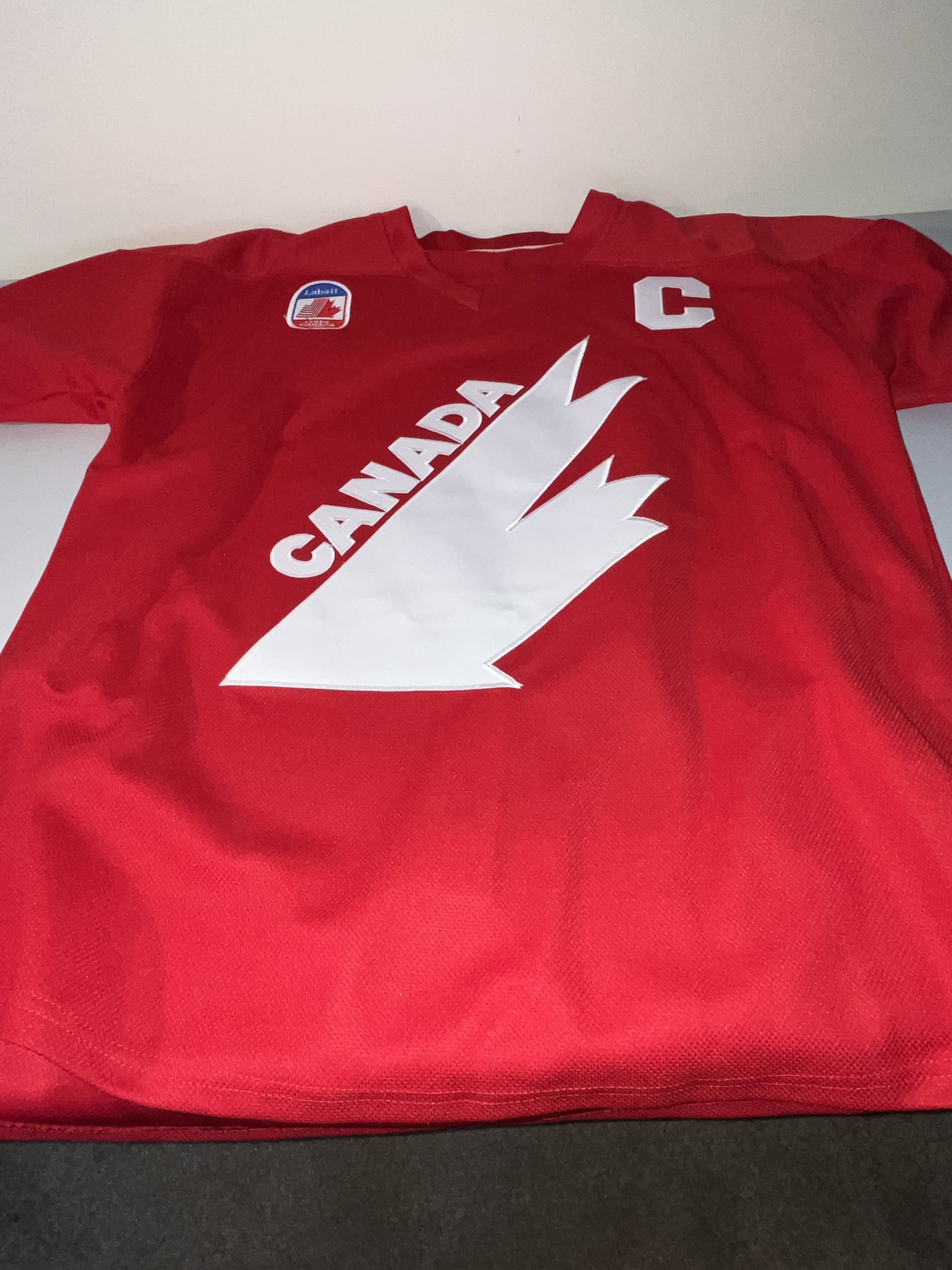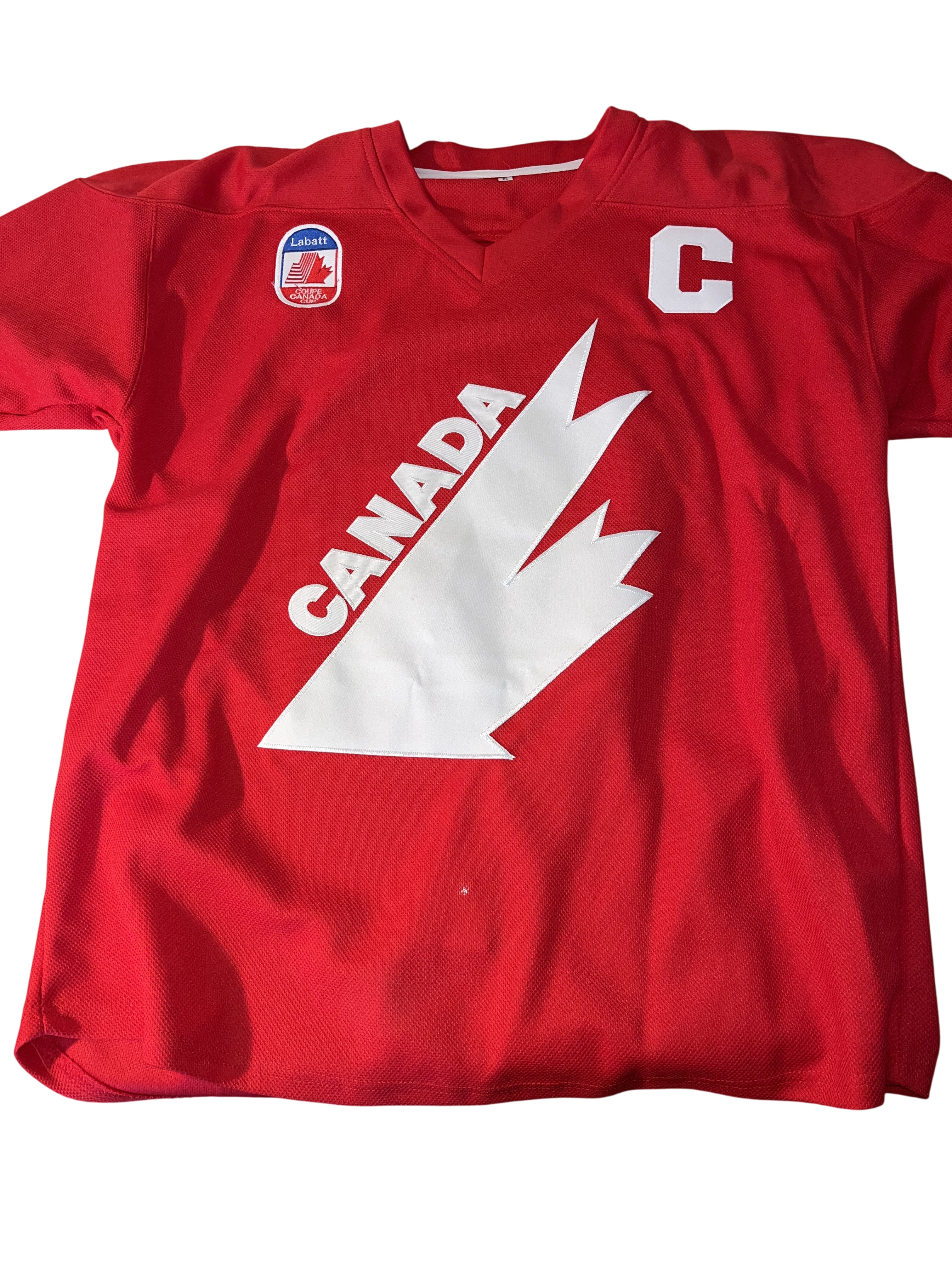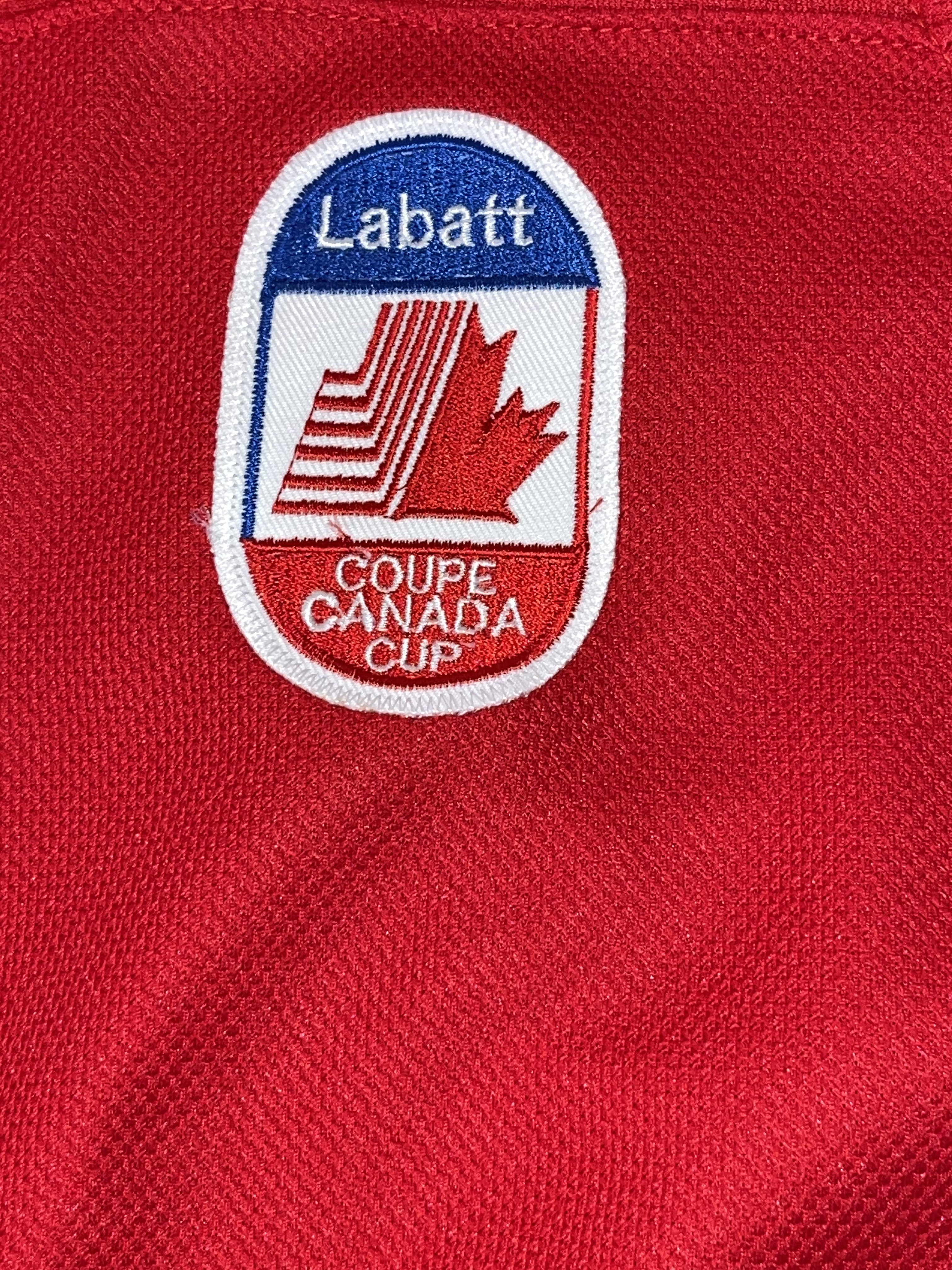 This is a red Team Canada hockey jersey styled after the 1987 Canada Cup tournament. The jersey features the name GRETZKY and the iconic number 99 on the reverse in white tackle twill. The front displays the large white stylized maple leaf CANADA crest, a captain’s C on the upper left chest, and a Labatt Coupe Canada Cup tournament patch on the upper right chest. This garment is unbranded, containing only a size XL tag in the collar, and represents a commemorative fan jersey from one of the most significant tournaments in international hockey history. The 1987 Canada Cup is famously remembered for the legendary performance of Wayne Gretzky and the winning goal assisted by him to Mario Lemieux.