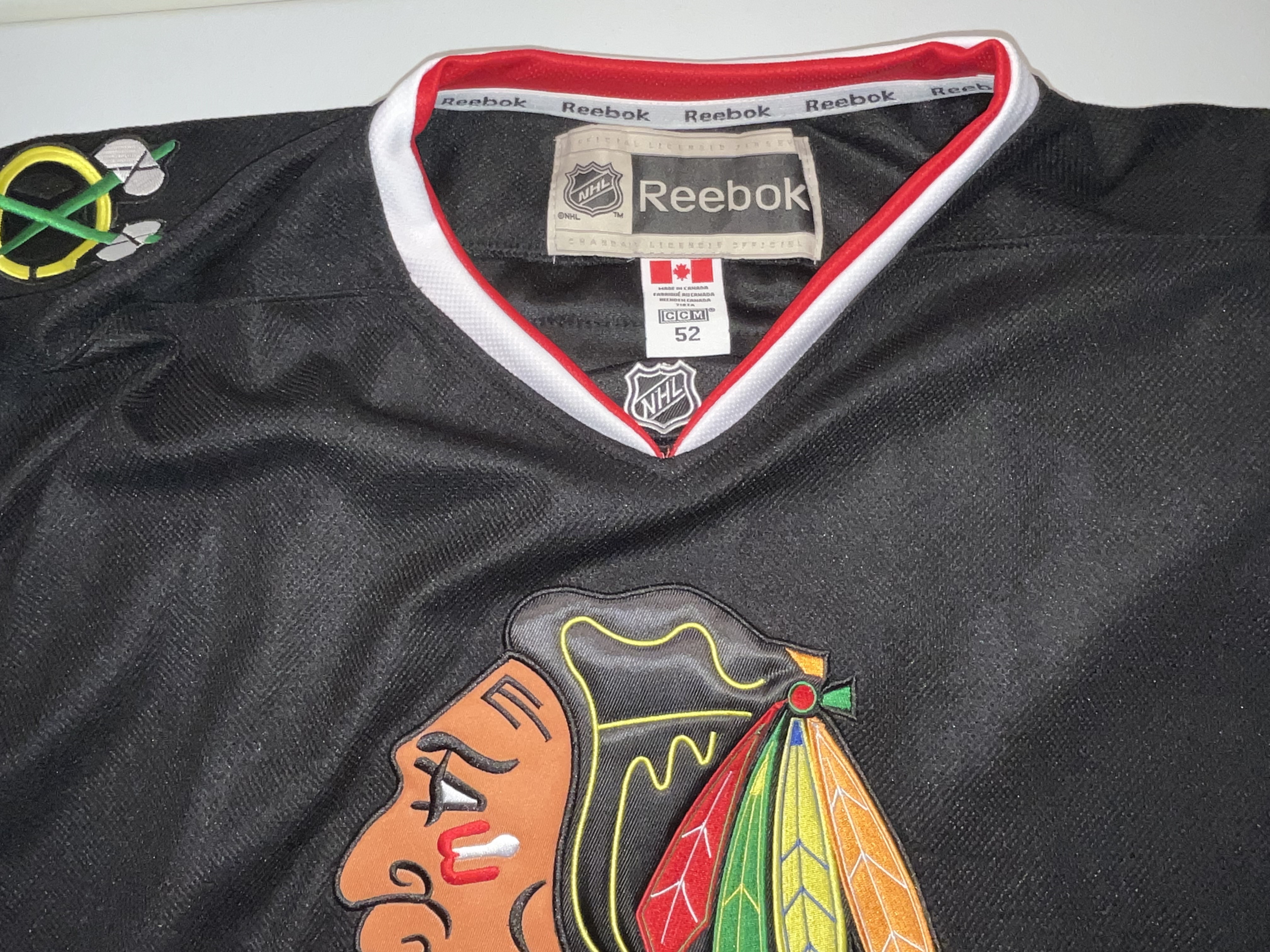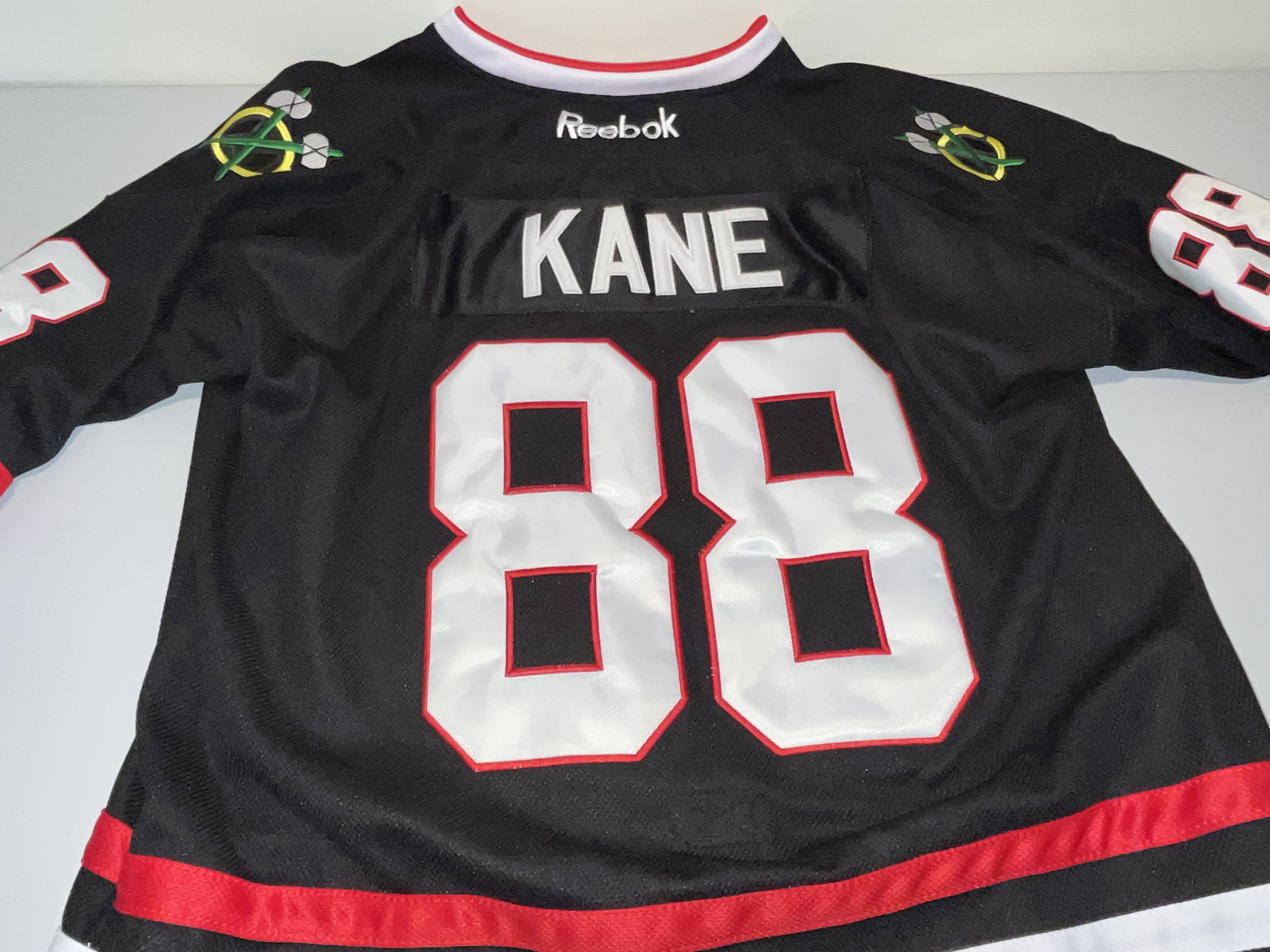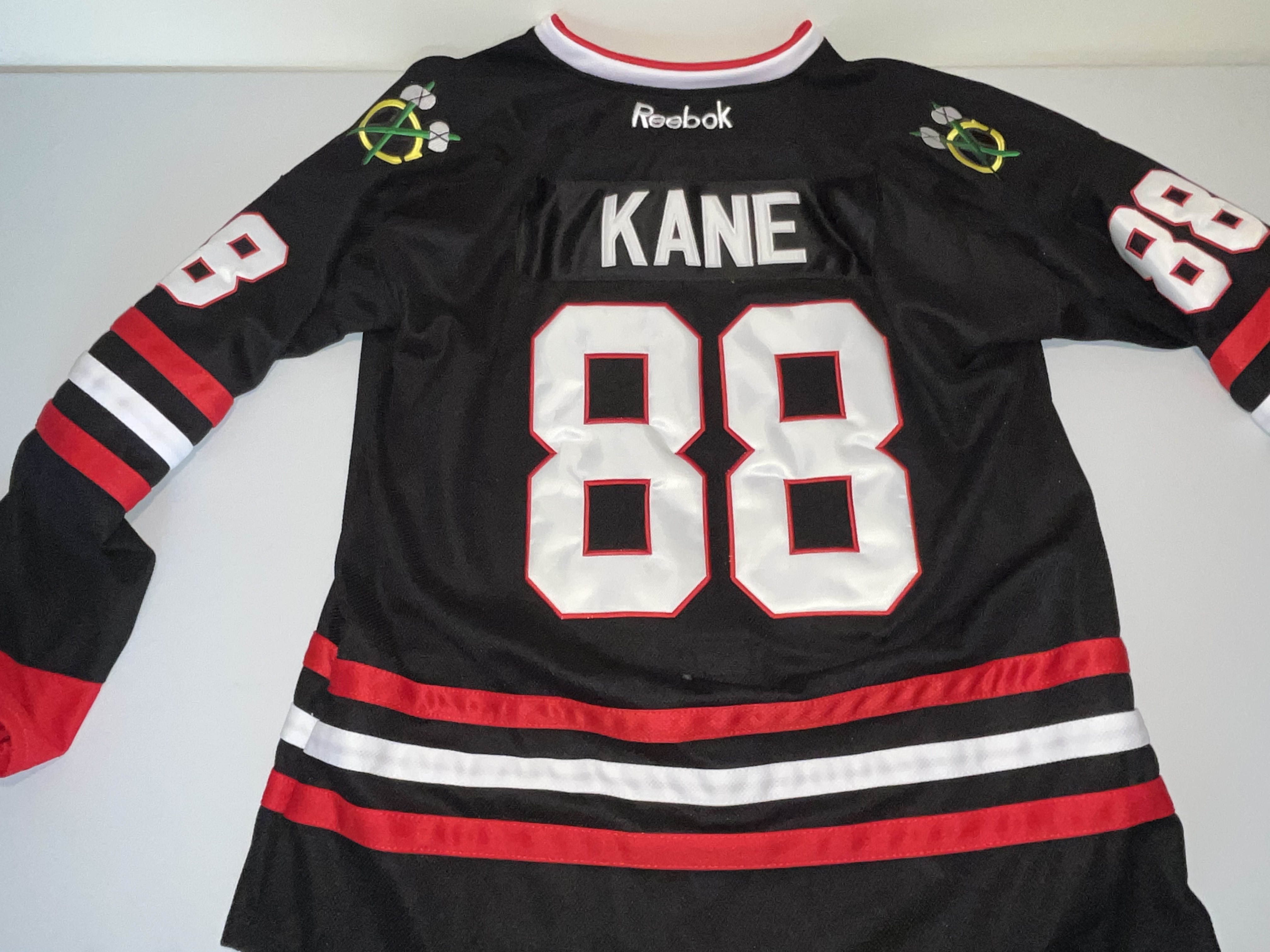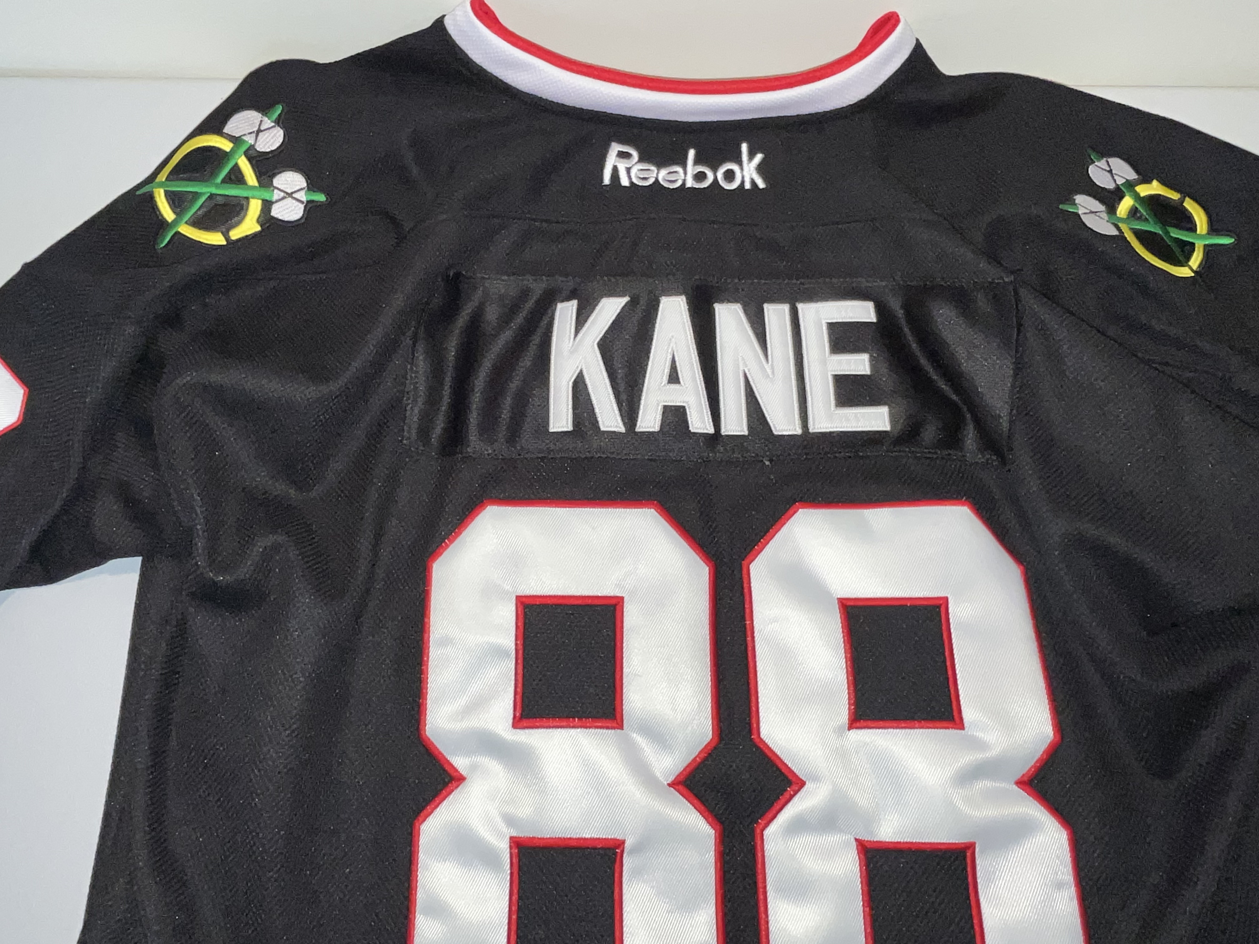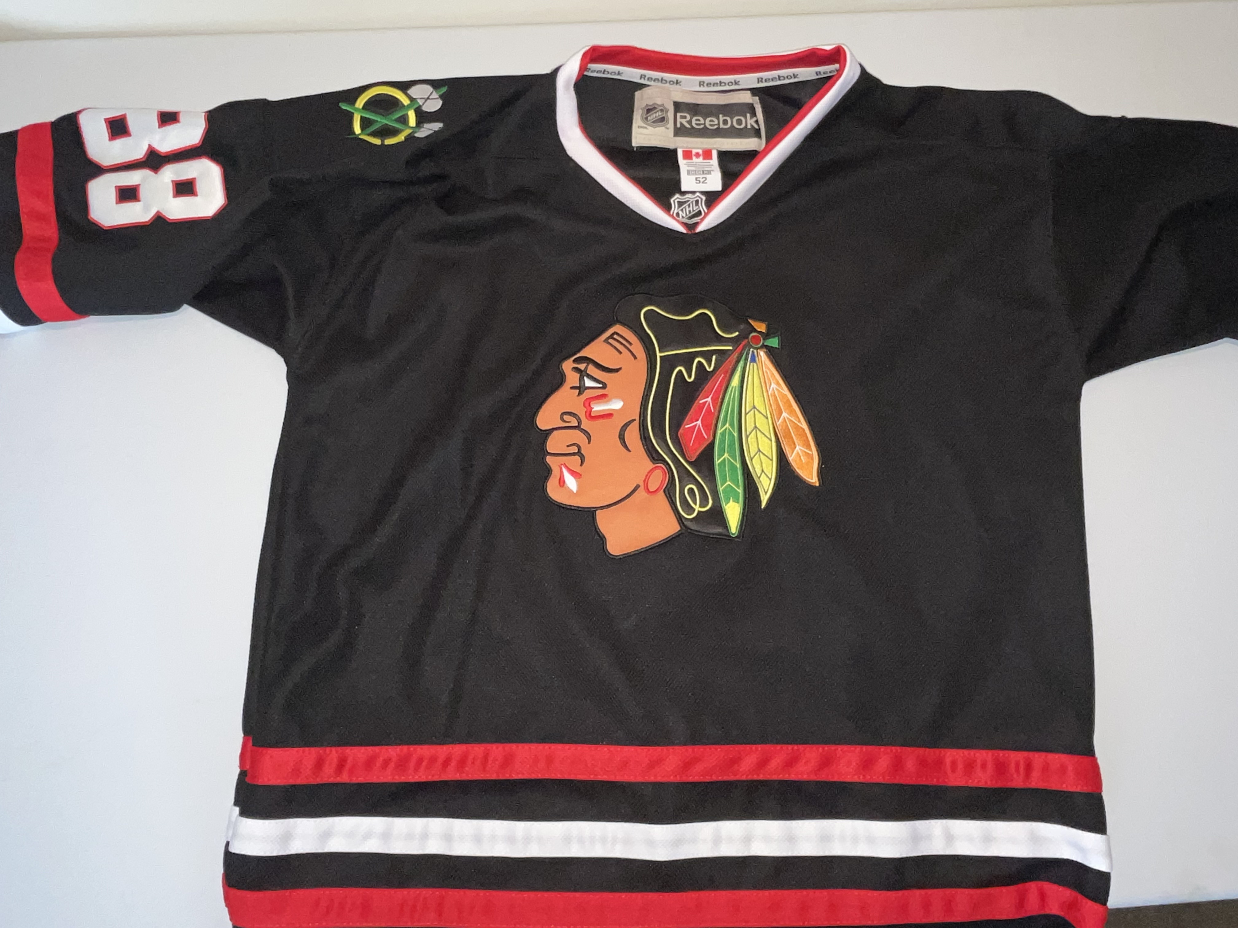 This is an authentic Chicago Blackhawks alternate jersey featuring the name and number of star player Patrick Kane. The jersey is part of the Reebok NHL Center Ice Collection, produced during the era when Reebok was the official on-ice outfitter. The design features a black base with horizontal red and white stripes at the hem and sleeves. The front displays a large, multi-colored embroidered Blackhawks primary “Indian Head” logo patch. The back includes a stitched “KANE” nameplate in white tackle twill and large “88” tackle twill numbers in white with a red embroidered border. Matching “88” numbers are stitched on both sleeves, and “crossed tomahawk” secondary logo patches are embroidered on each shoulder. The interior neck tagging indicates a size 52 and “Made in Canada,” consistent with authentic-grade retail construction. No signatures are present on this item. T