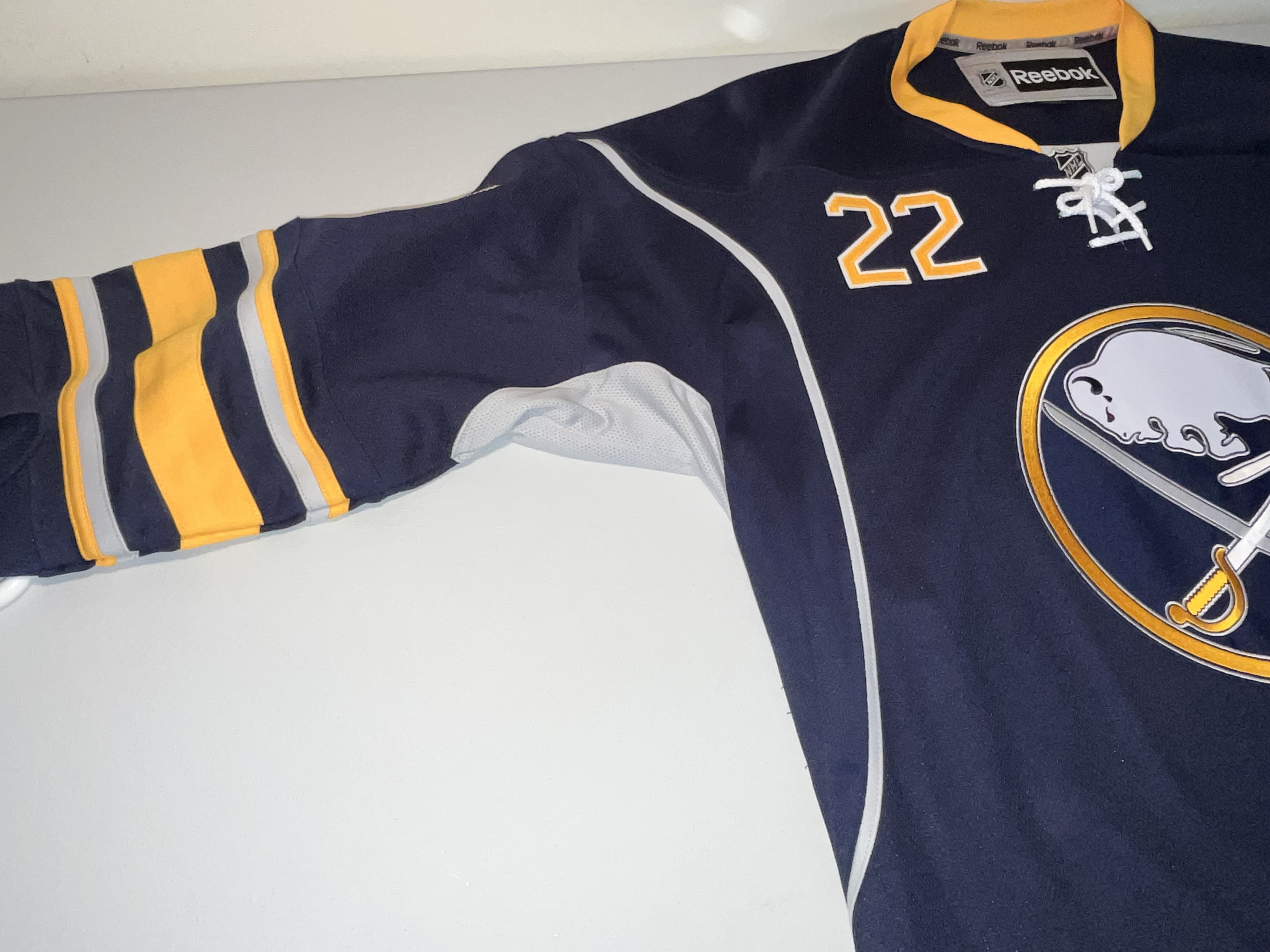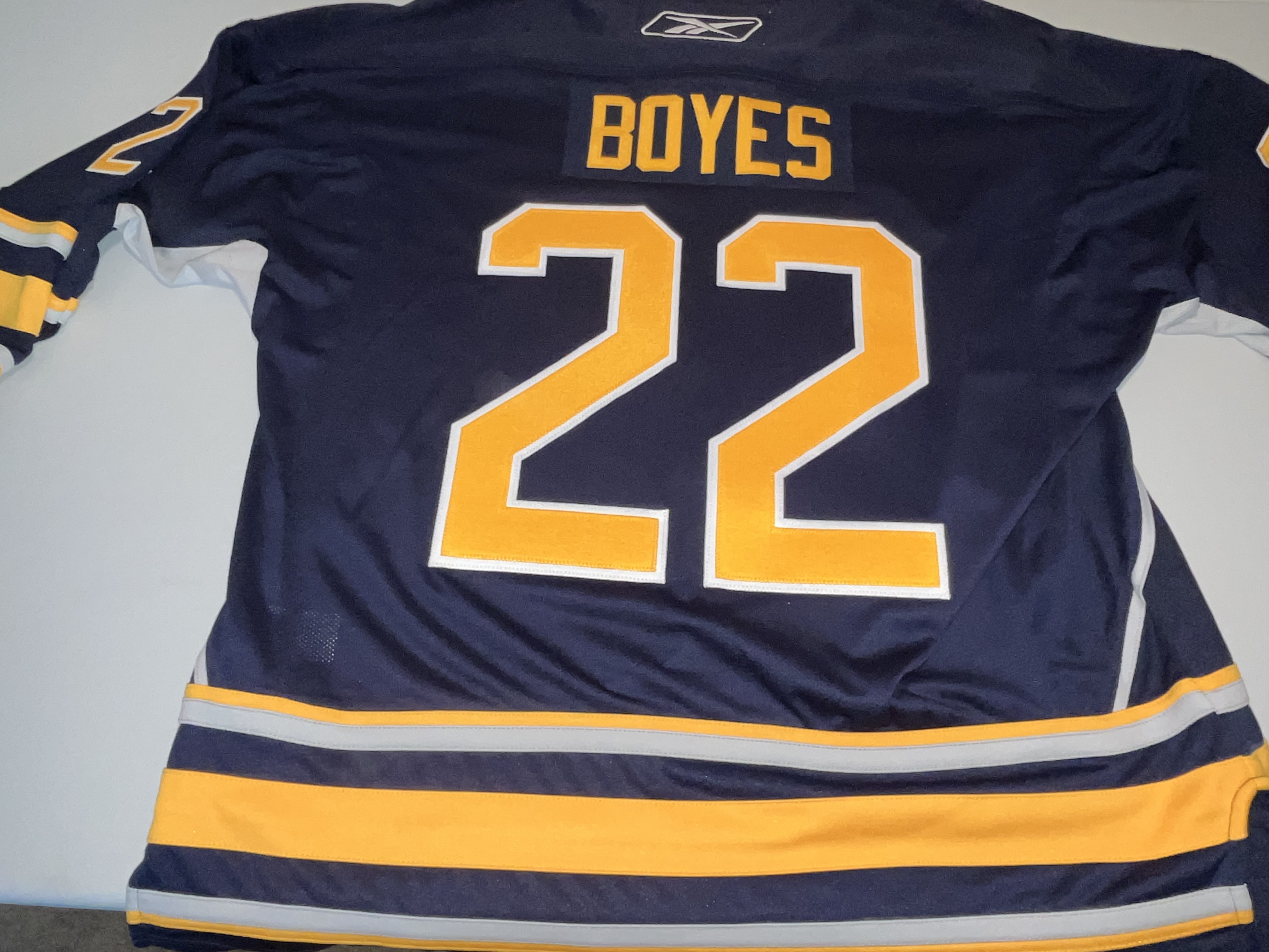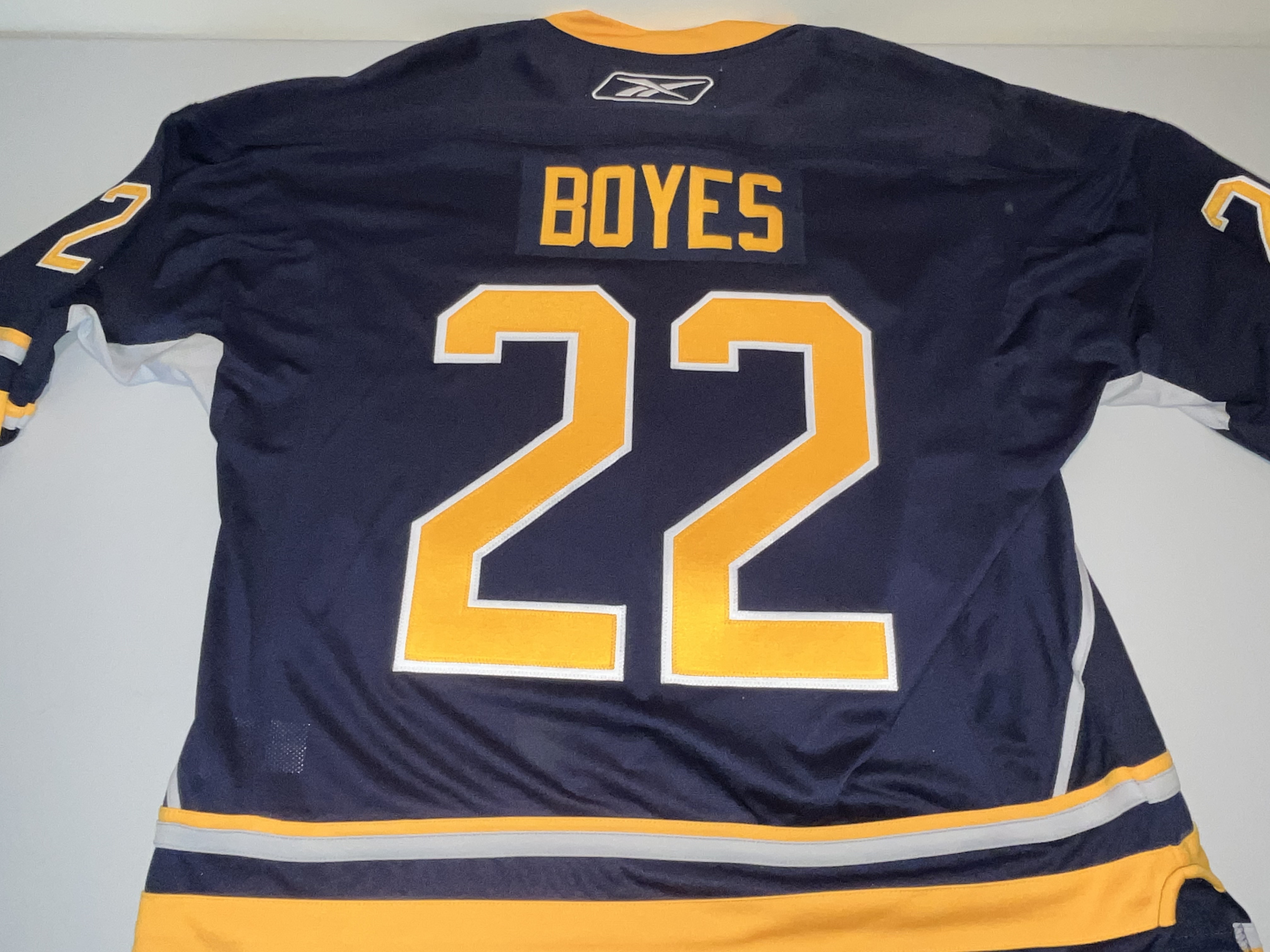 This is an officially licensed Buffalo Sabres home replica jersey manufactured by Reebok, featuring the name and number of forward Brad Boyes. The jersey is designed in the team’s navy blue, gold, and silver color scheme characteristic of the Reebok Premier era, circa 2011-2012. The front of the garment features the primary Buffalo Sabres “crossed swords” logo in tackle twill, with a small number “22” positioned on the upper right chest. The back is adorned with “BOYES” on a navy nameplate and a large player number “22” in two-layer tackle twill. The sleeves include the player number “22” on both shoulders and traditional gold and silver striping.