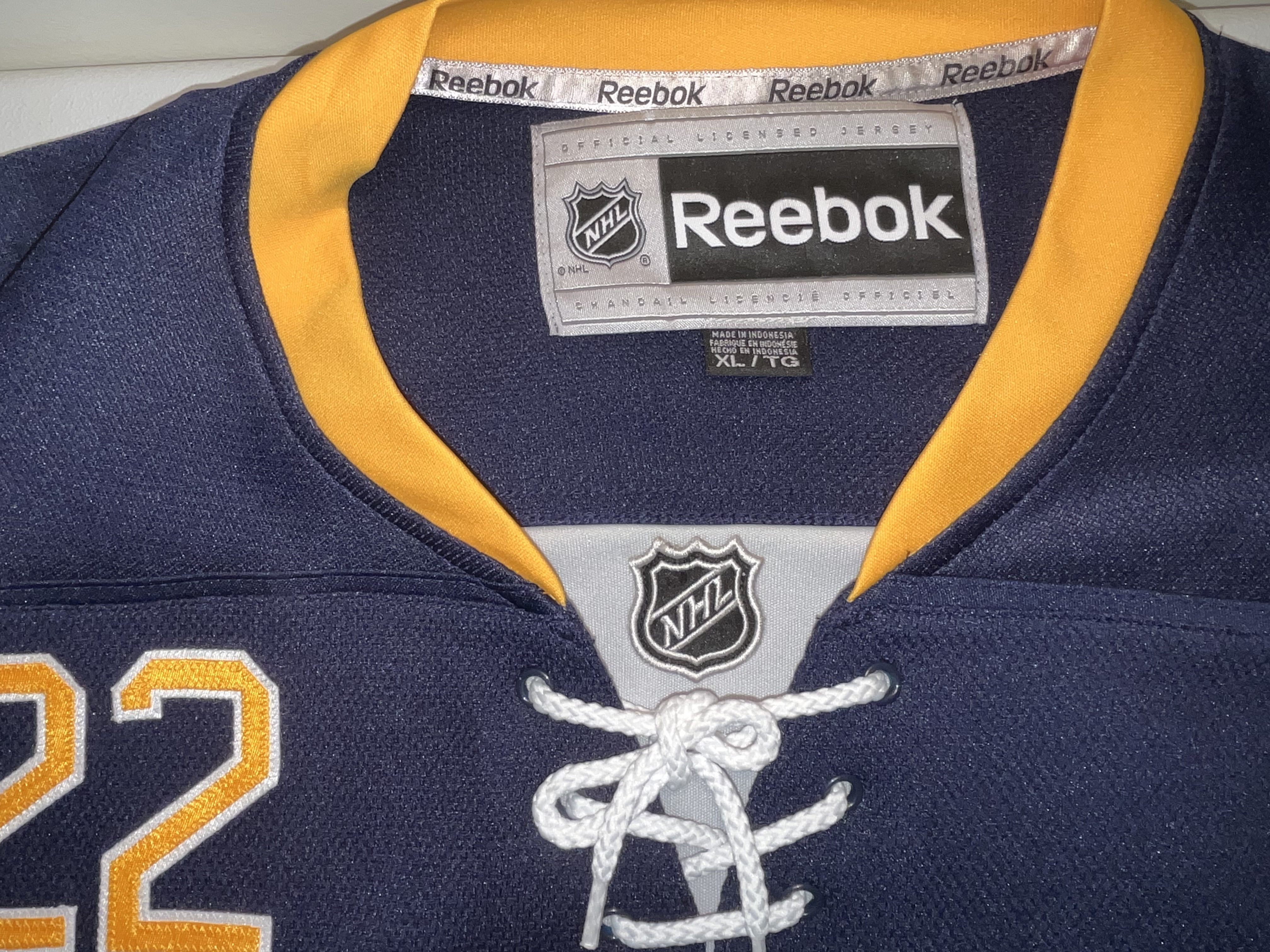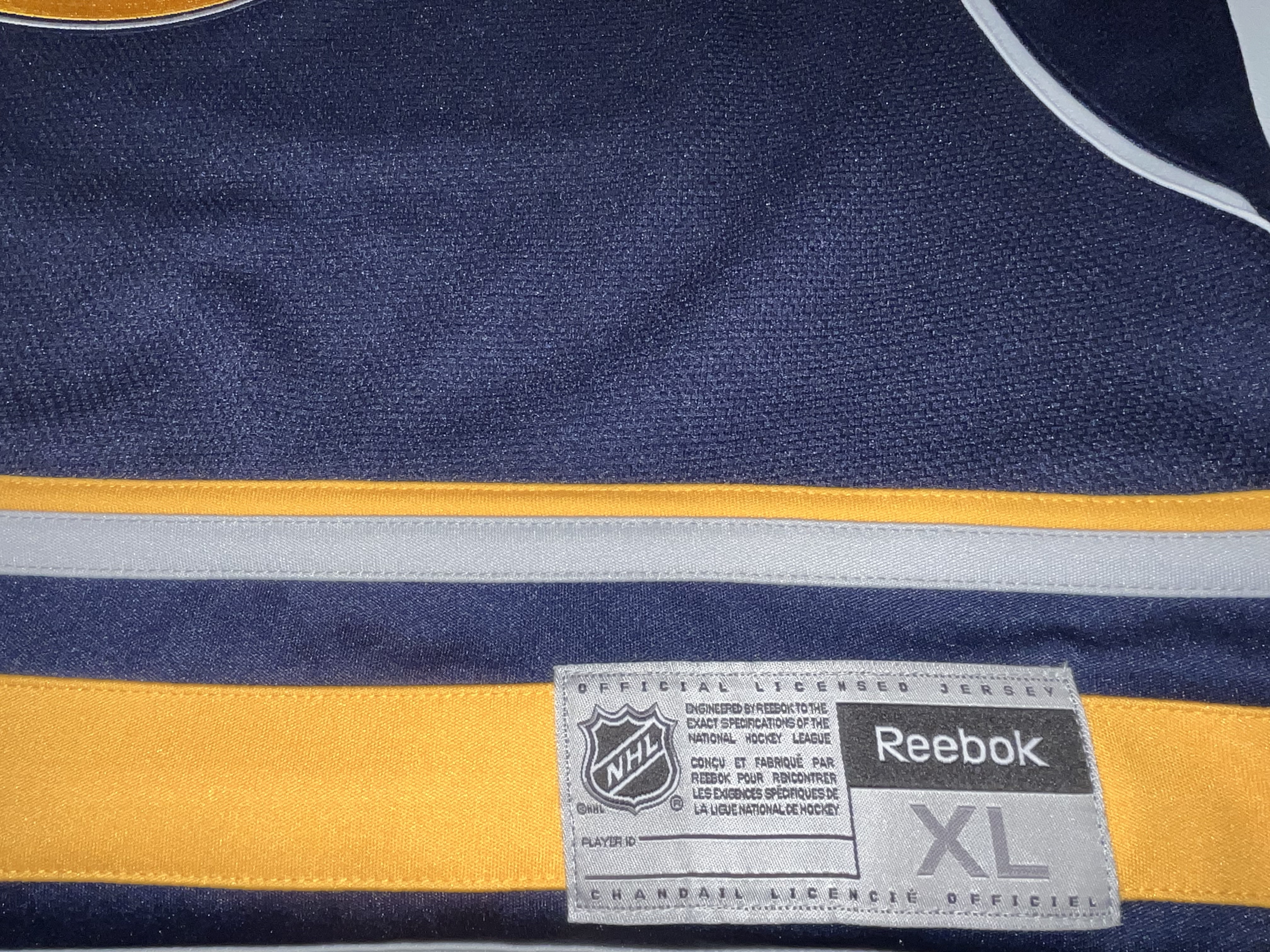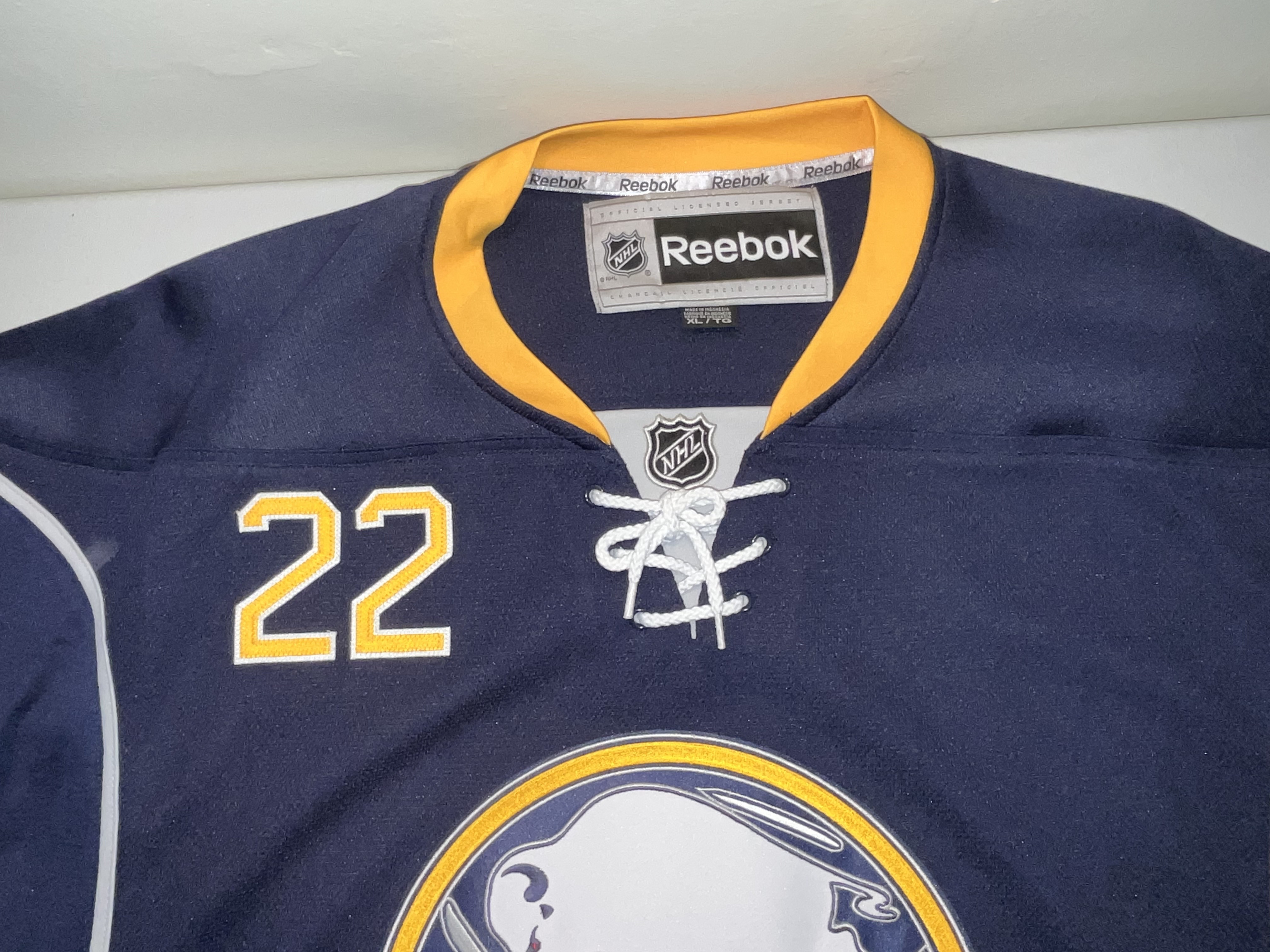 This is an officially licensed Buffalo Sabres home replica jersey manufactured by Reebok, featuring the name and number of forward Brad Boyes. The jersey is designed in the team’s navy blue, gold, and silver color scheme characteristic of the Reebok Premier era, circa 2011-2012. The front of the garment features the primary Buffalo Sabres “crossed swords” logo in tackle twill, with a small number “22” positioned on the upper right chest. The back is adorned with “BOYES” on a navy nameplate and a large player number “22” in two-layer tackle twill. The sleeves include the player number “22” on both shoulders and traditional gold and silver striping.