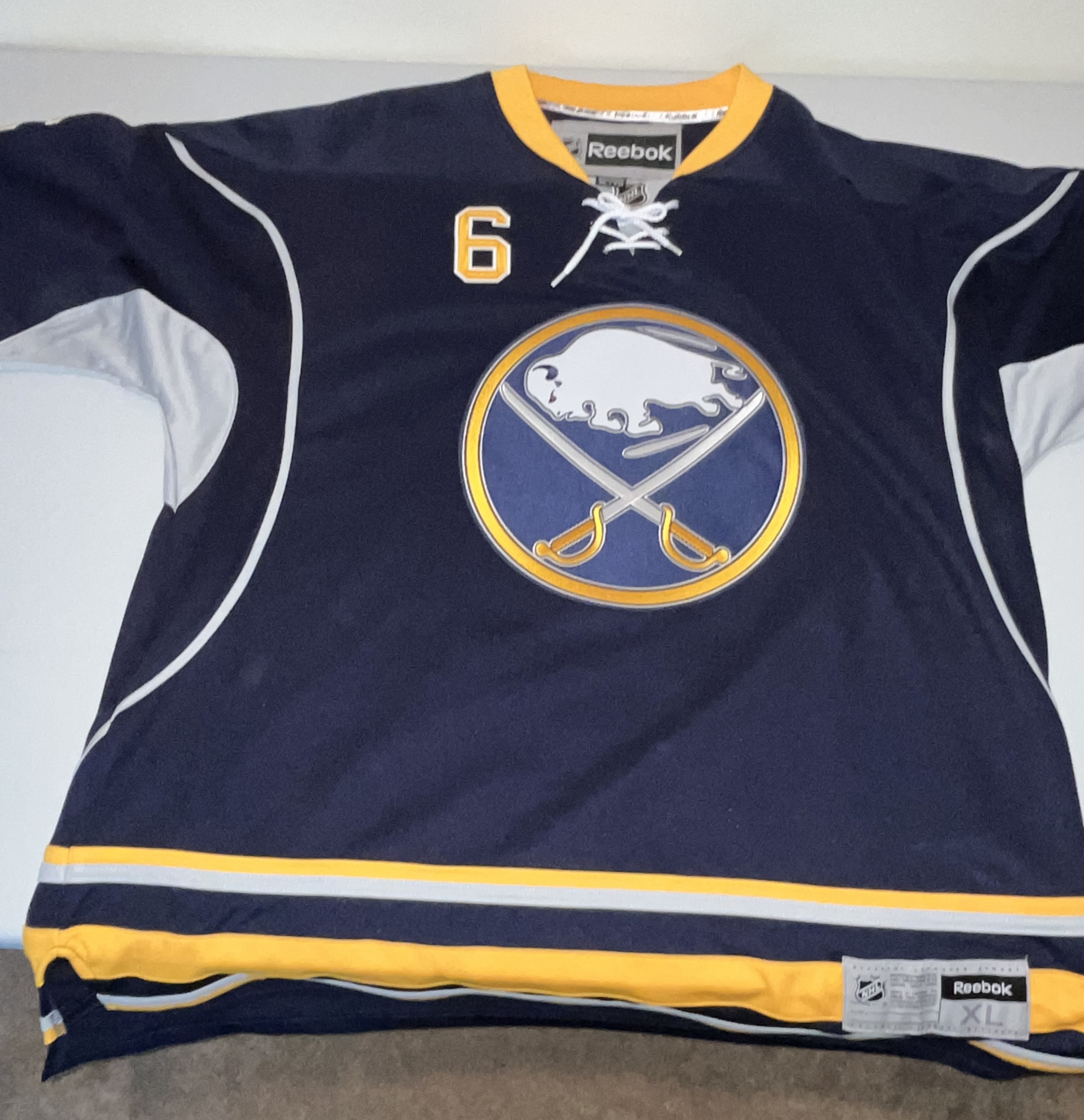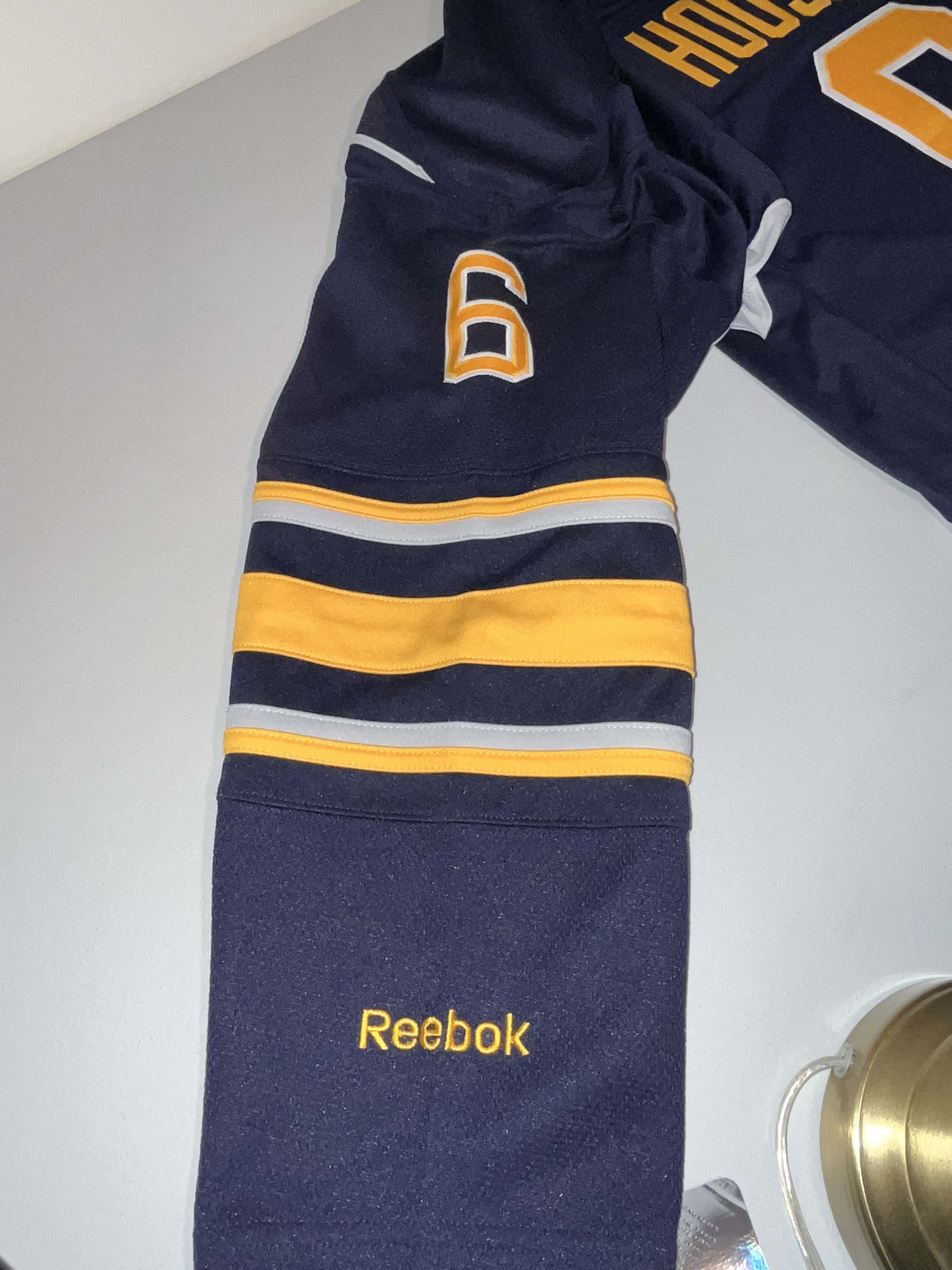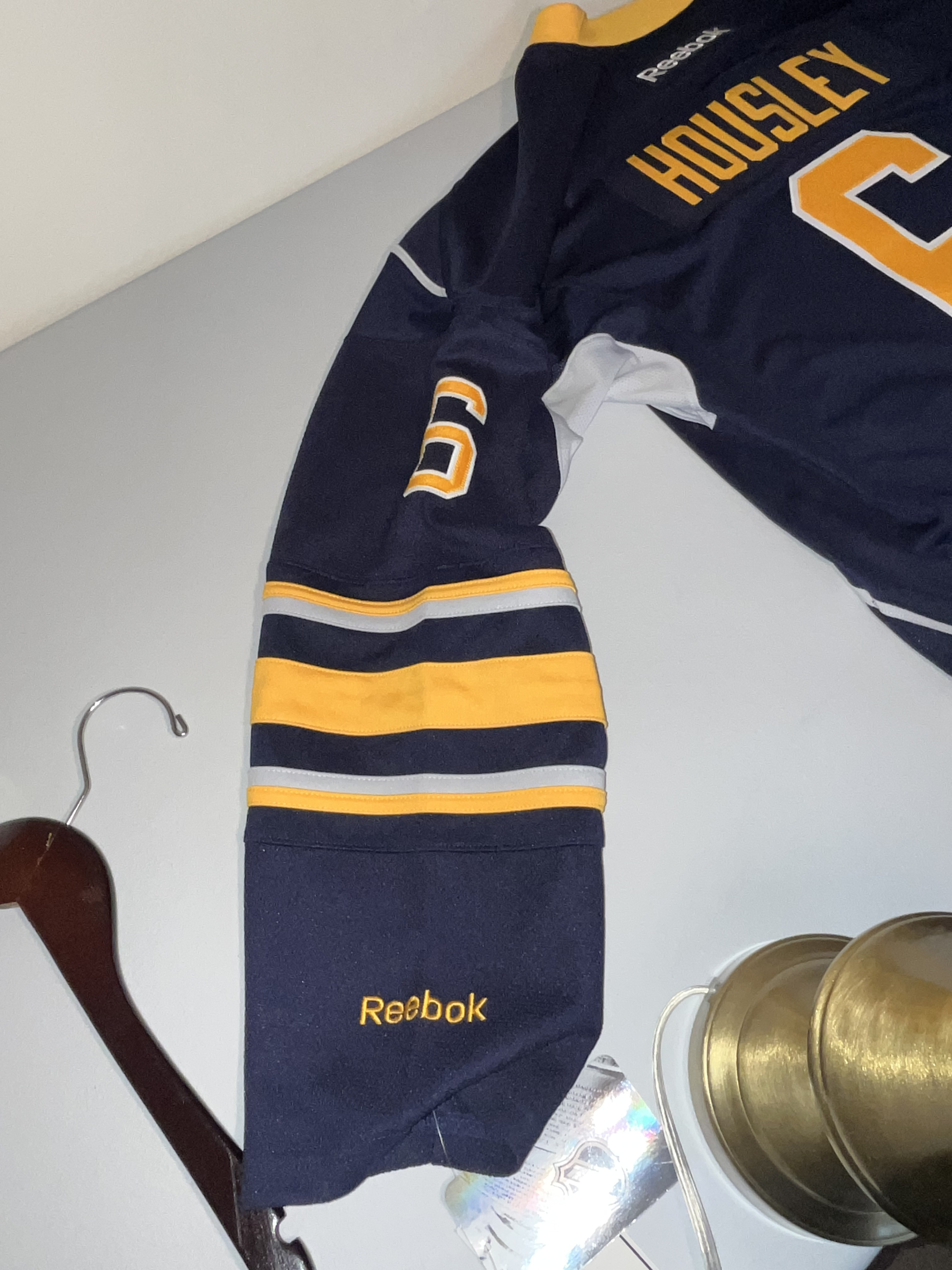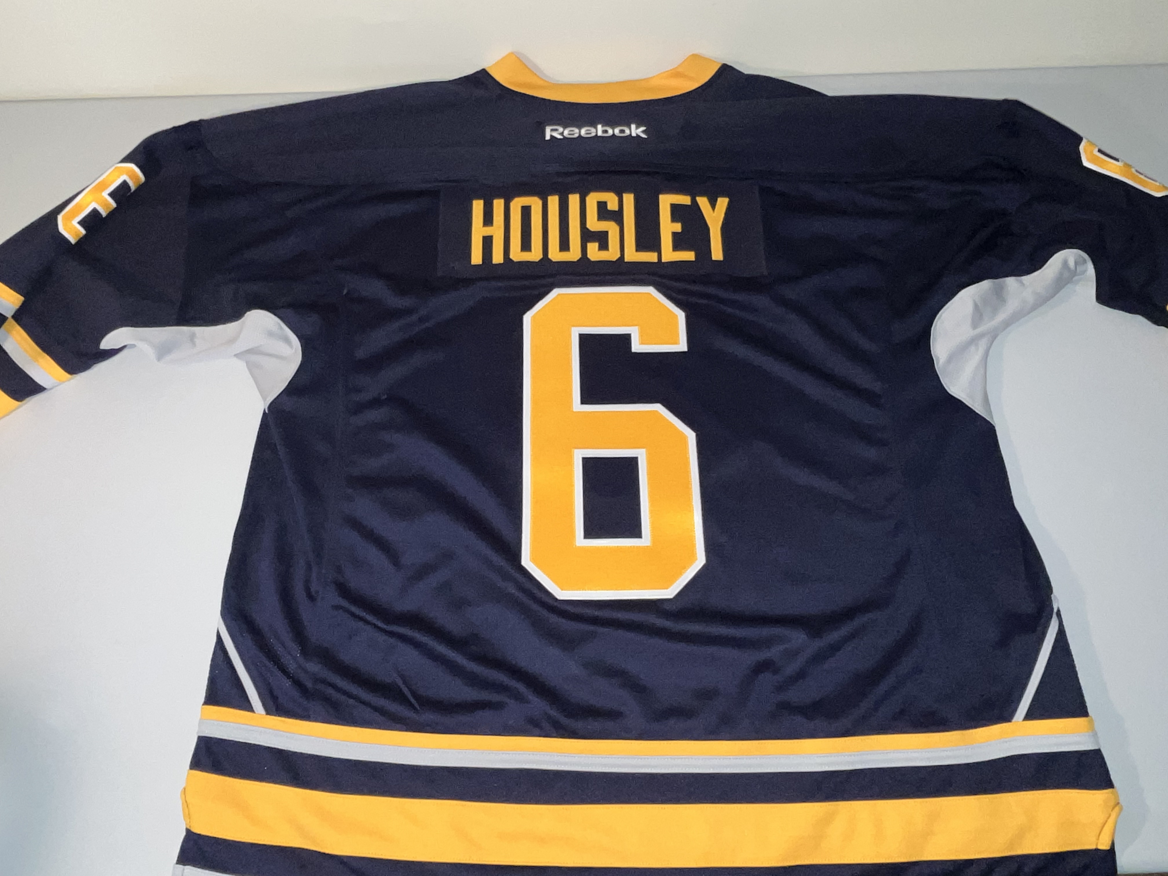 This is an official Reebok Premier licensed jersey for the Buffalo Sabres, featuring the name and number of Hockey Hall of Fame defenseman Phil Housley. Housley is a franchise legend who played for the Sabres from 1982 to 1990. The navy blue jersey is a size XL and represents the home-style design used during the early-to-mid 2010s. The front features the classic circular crest with a charging white bison over crossed sabres, along with a small number 6 on the upper right chest. The back includes a HOUSLEY nameplate in yellow block lettering above a large yellow number 6 with white trim. Design details include a white lace-up neck, silver and white piping accents, and matching numbers on both sleeves. This item is a high-quality retail reproduction and is not designated as game-worn.