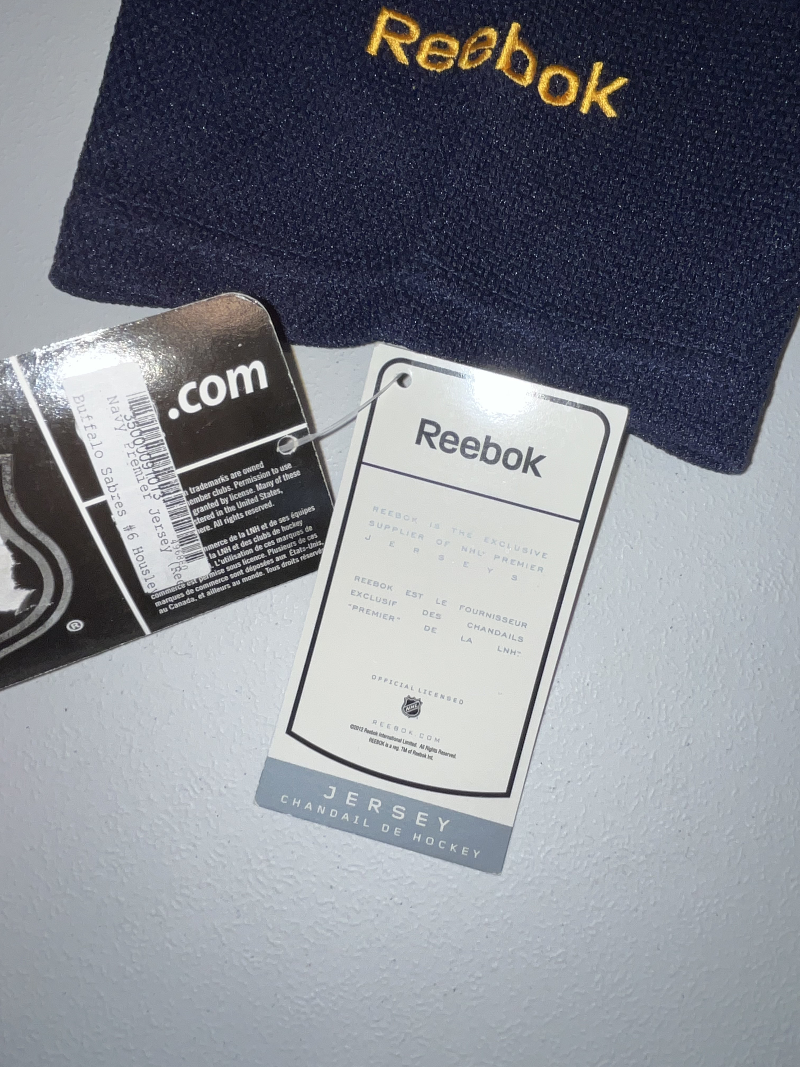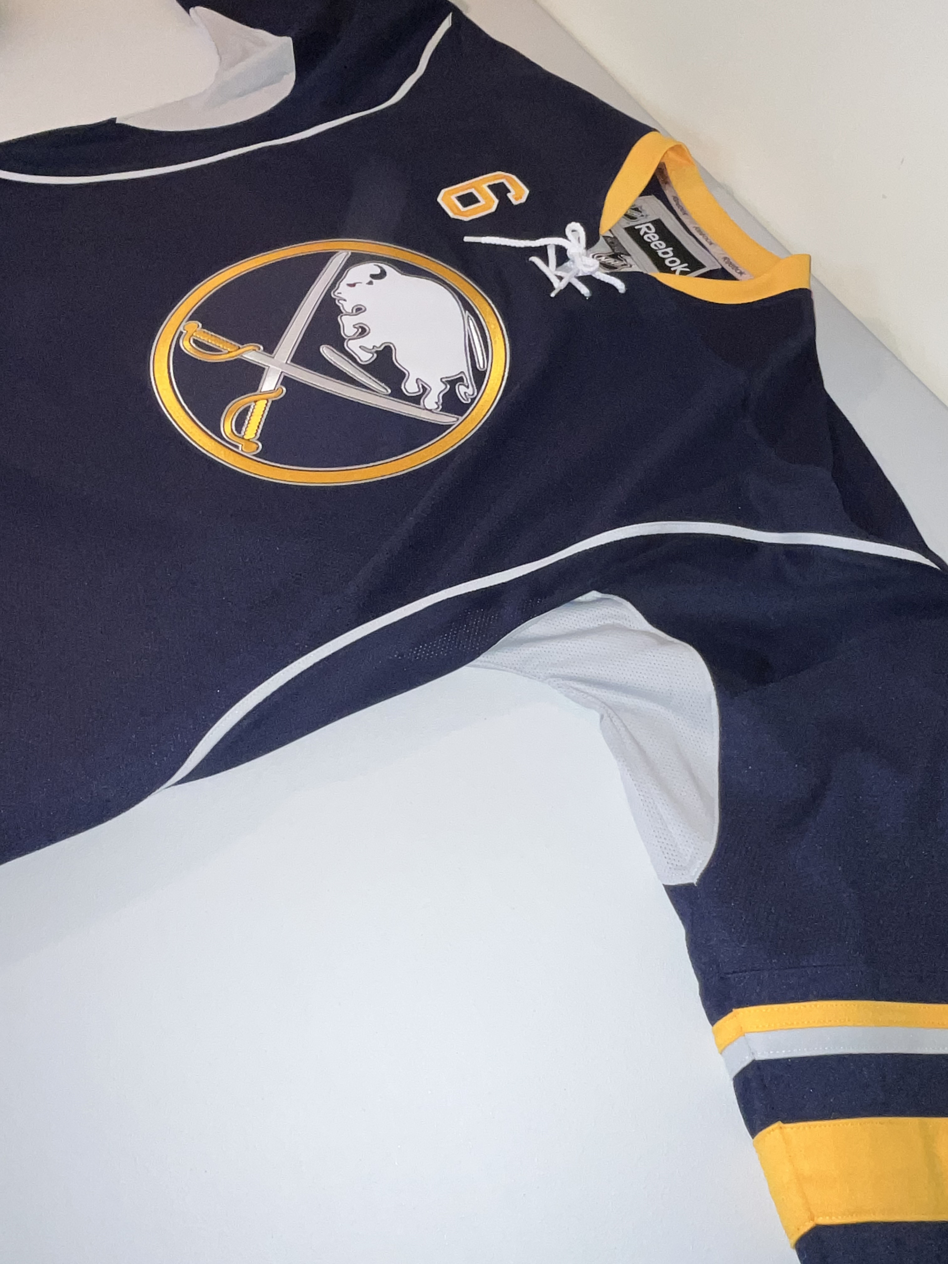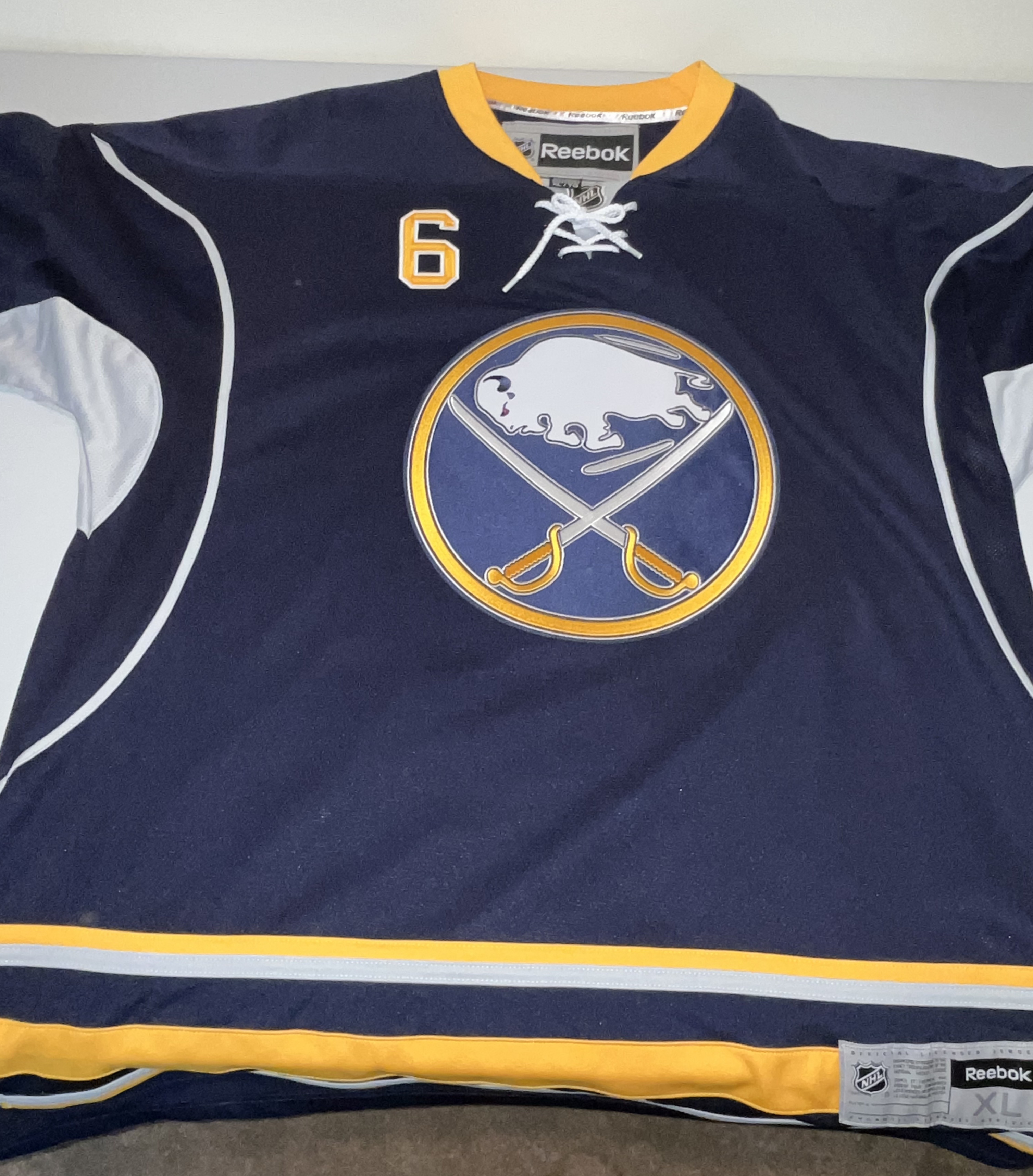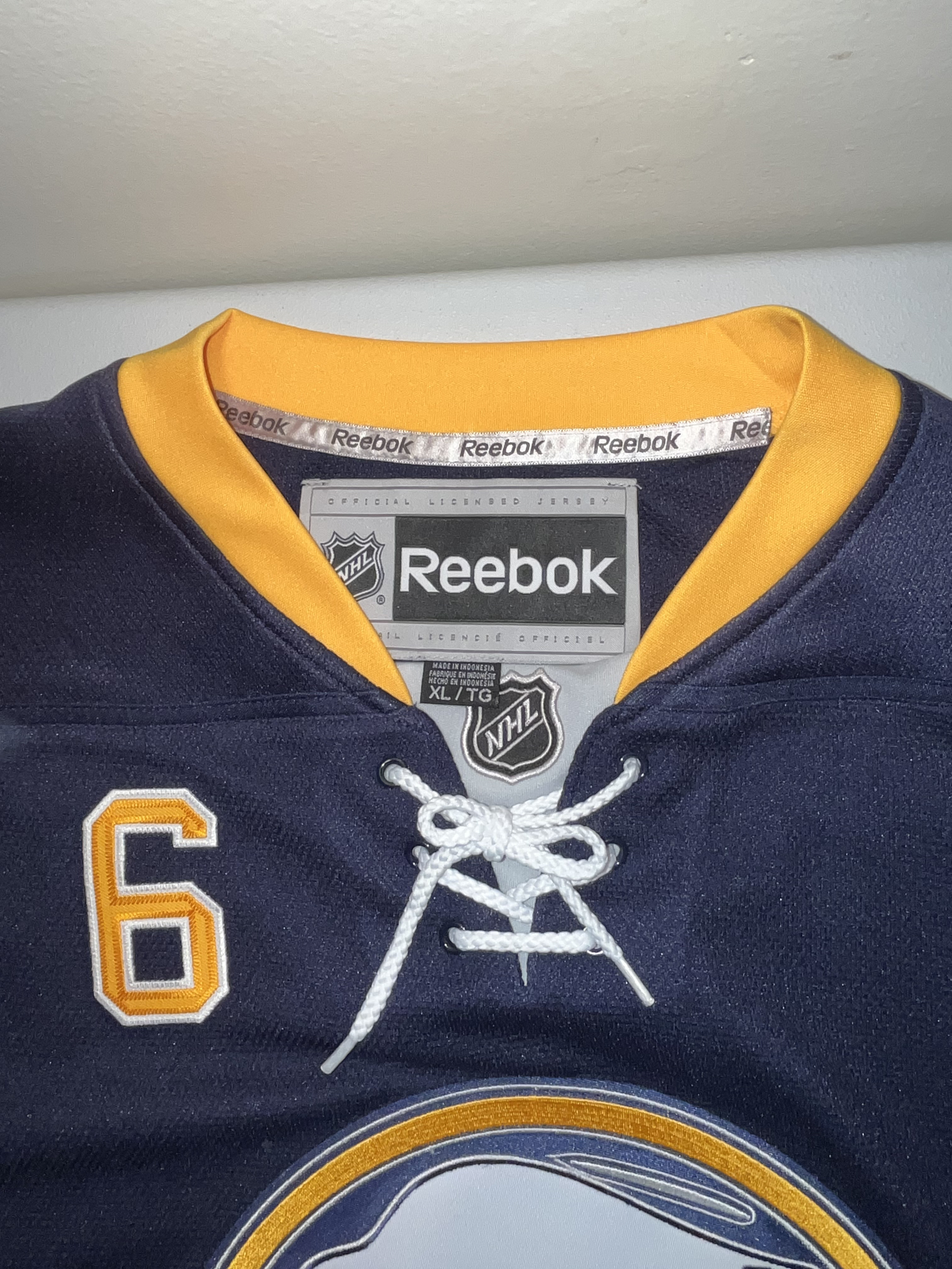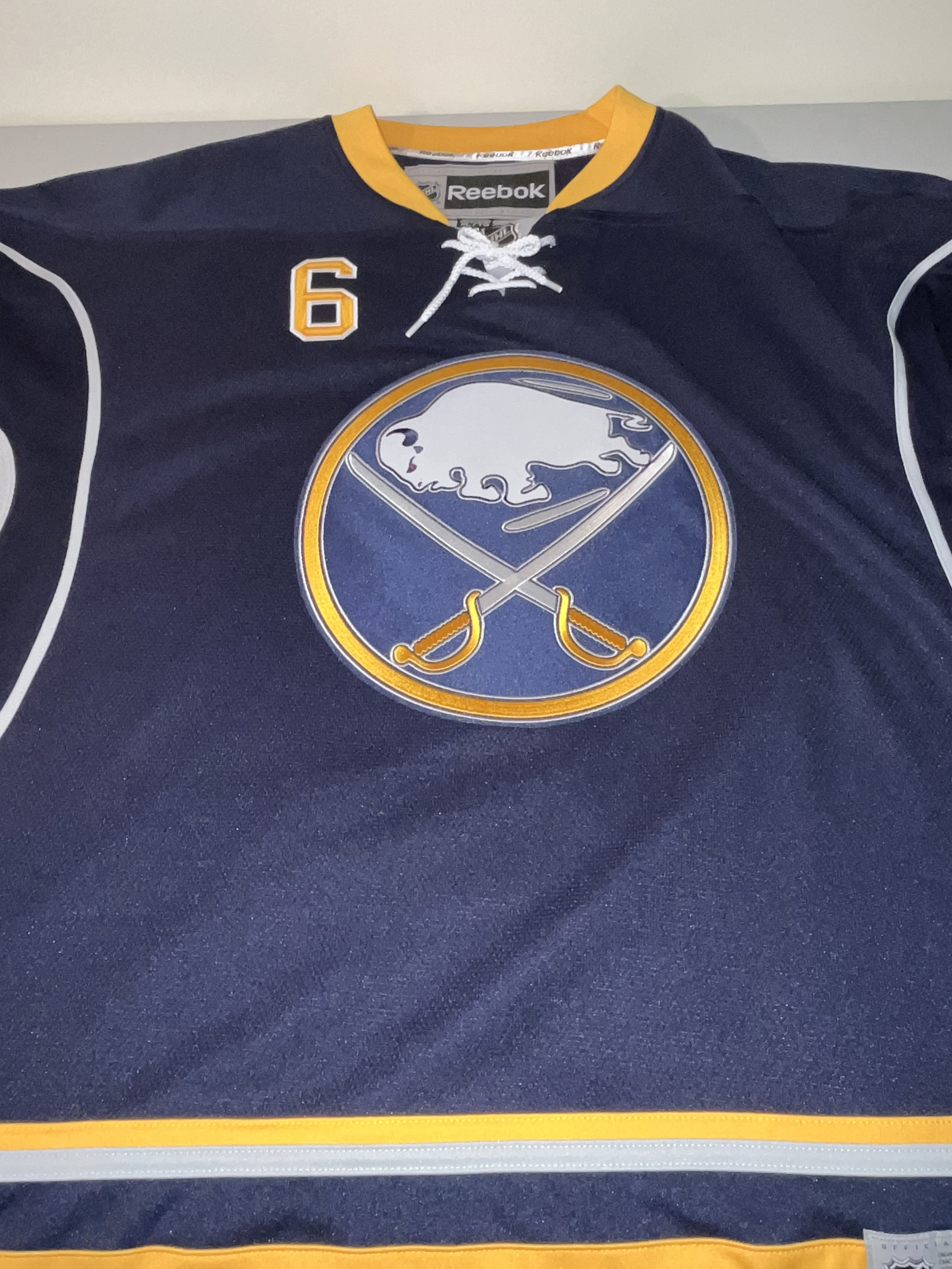 This is an official Reebok Premier licensed jersey for the Buffalo Sabres, featuring the name and number of Hockey Hall of Fame defenseman Phil Housley. Housley is a franchise legend who played for the Sabres from 1982 to 1990. The navy blue jersey is a size XL and represents the home-style design used during the early-to-mid 2010s. The front features the classic circular crest with a charging white bison over crossed sabres, along with a small number 6 on the upper right chest. The back includes a HOUSLEY nameplate in yellow block lettering above a large yellow number 6 with white trim. Design details include a white lace-up neck, silver and white piping accents, and matching numbers on both sleeves. This item is a high-quality retail reproduction and is not designated as game-worn.