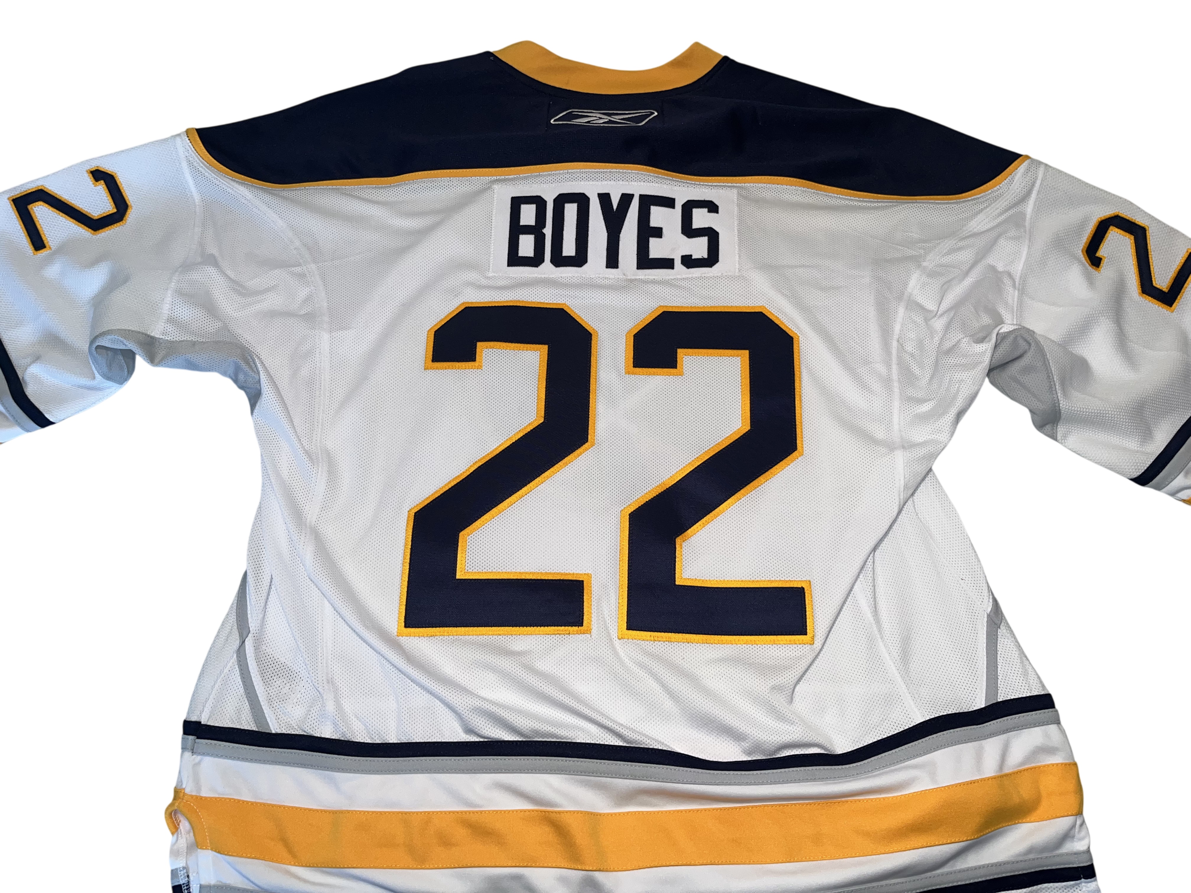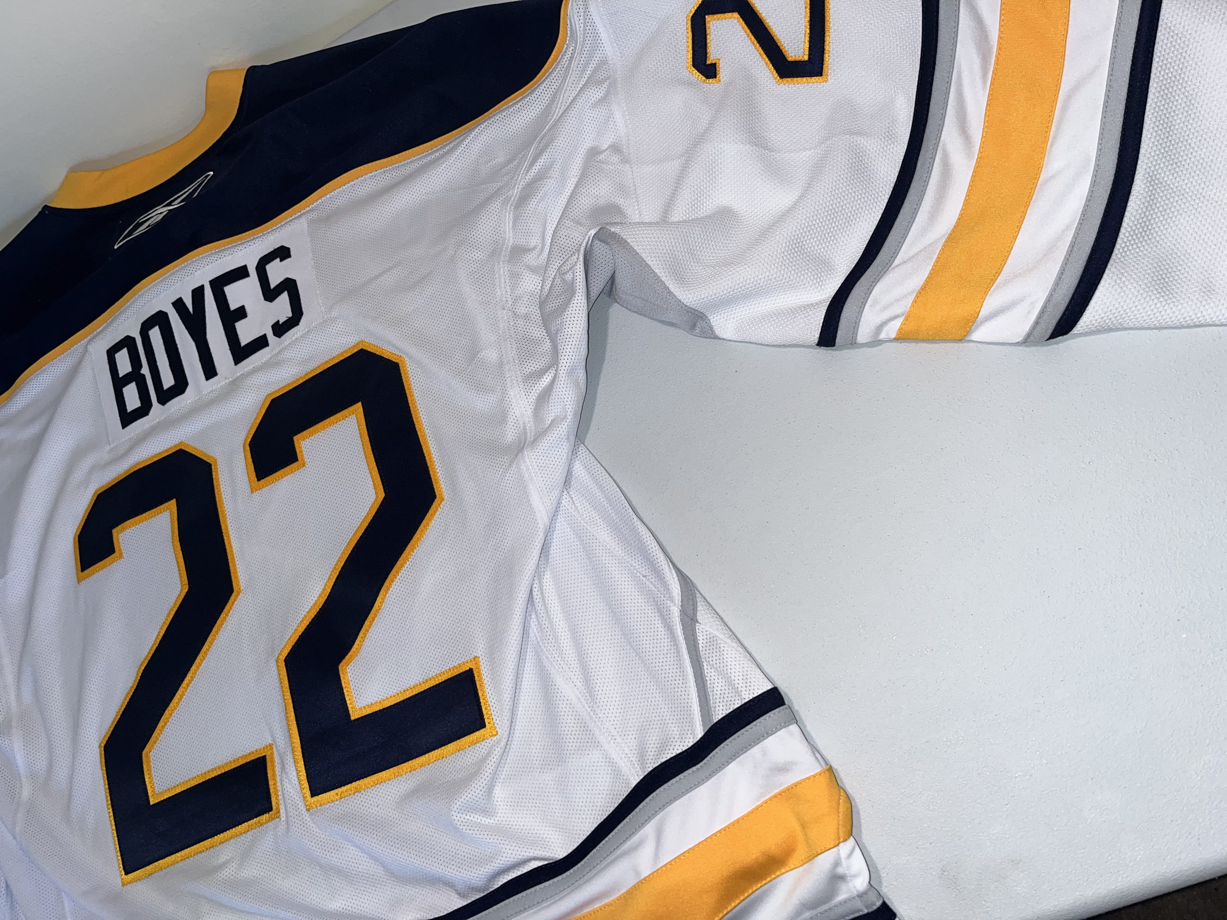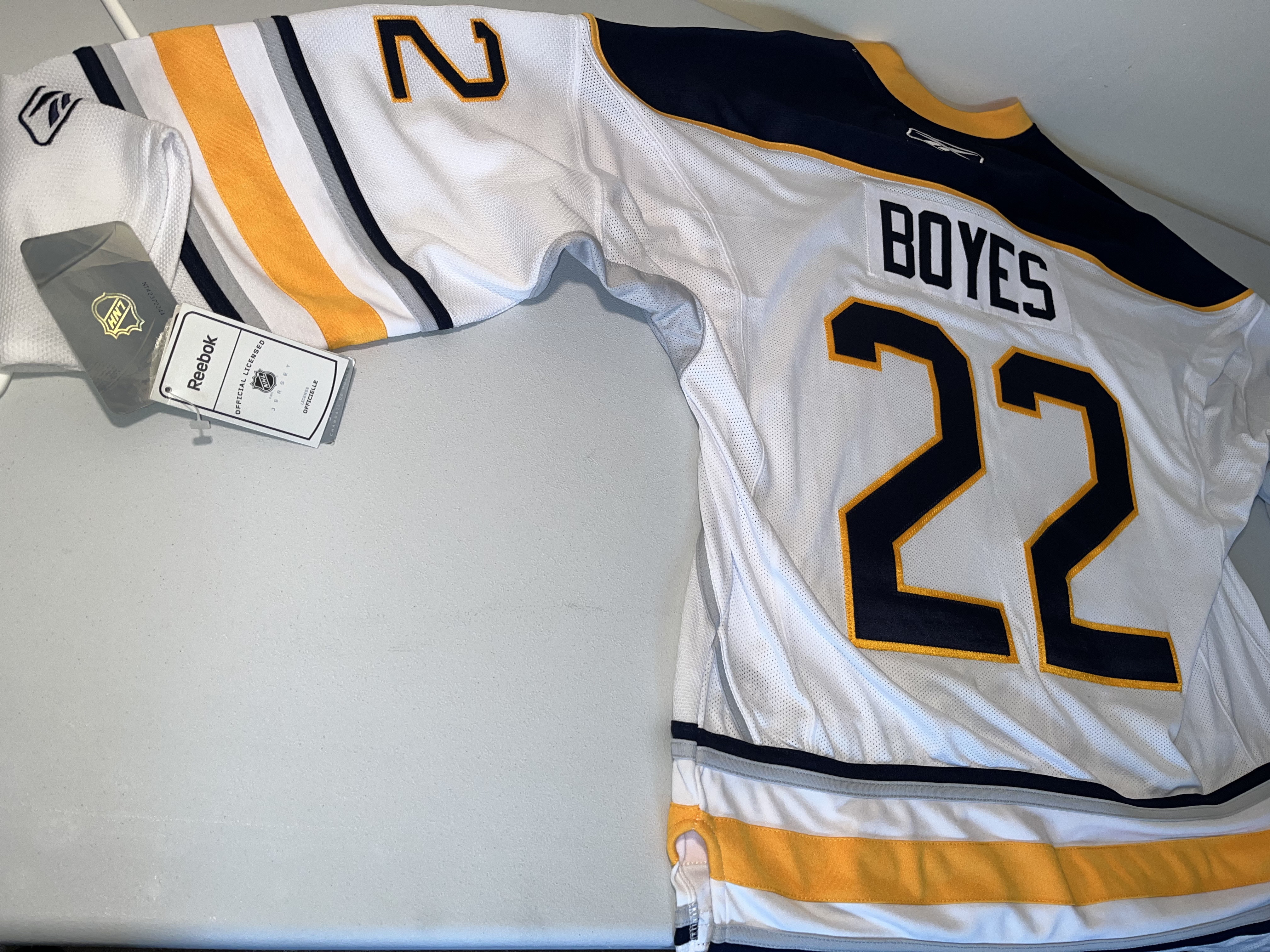 This is an officially licensed Reebok Premier away jersey for the Buffalo Sabres, featuring the name and number of forward Brad Boyes. The jersey is a white road style featuring the Sabres circular crest with a charging buffalo and crossed swords on the chest. It features the official NHL jock tag on the lower front left and the Reebok vector logo on the back neck.