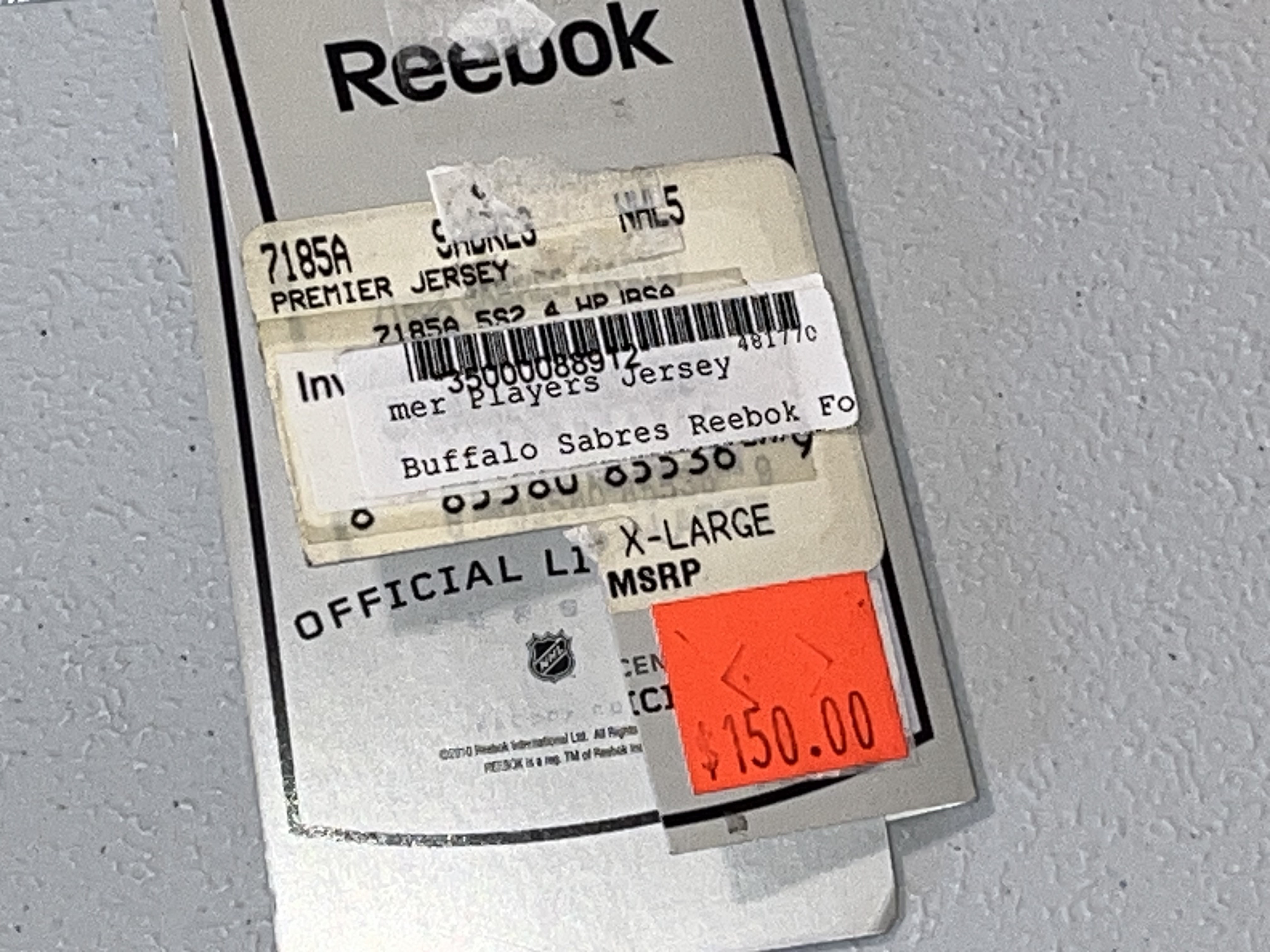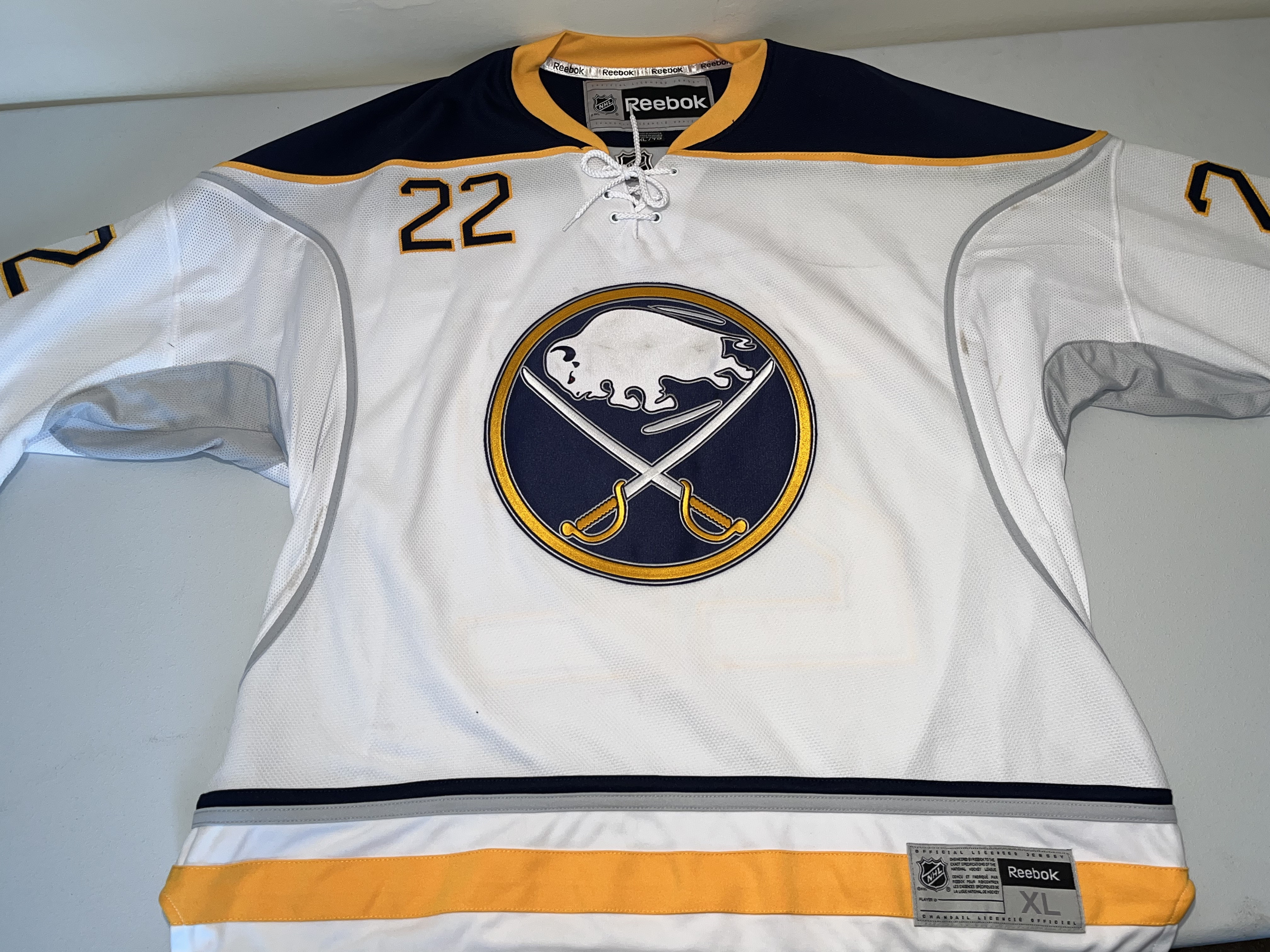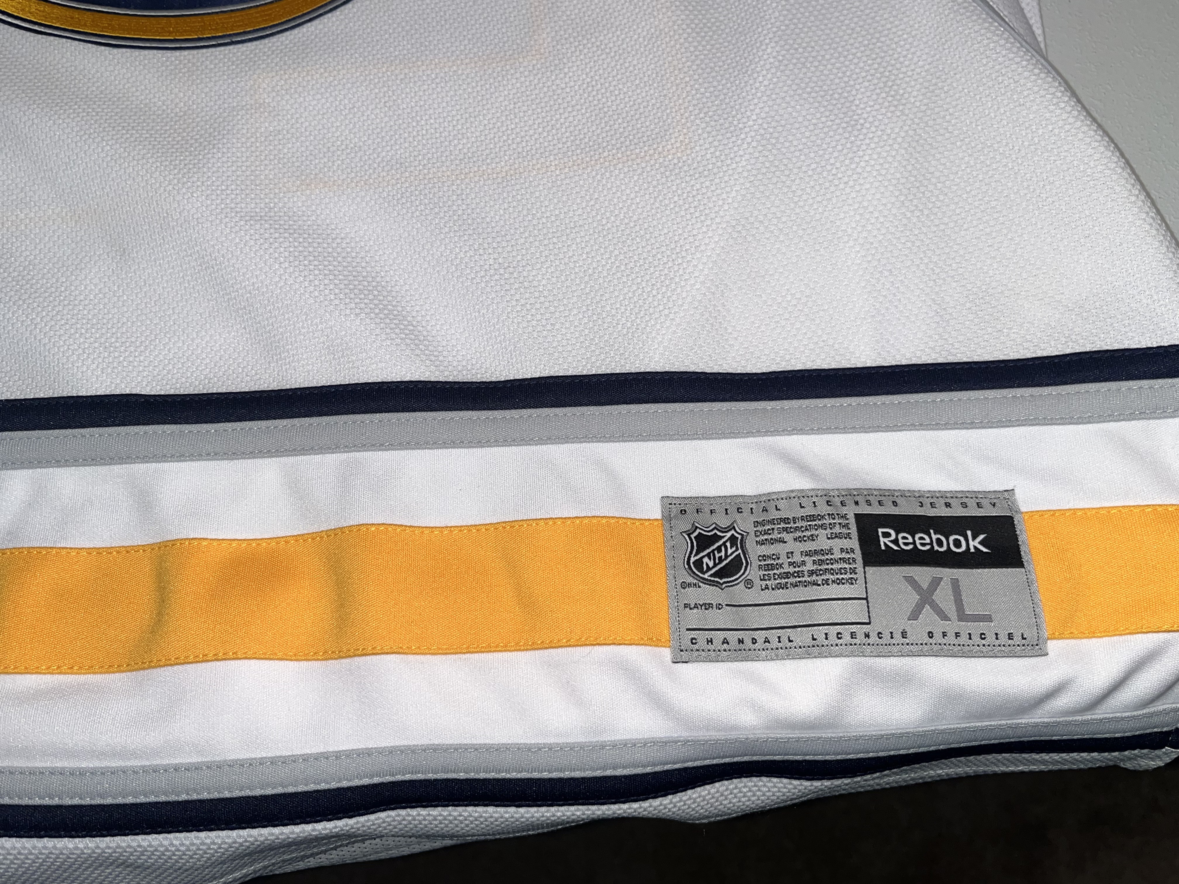 This is an officially licensed Reebok Premier away jersey for the Buffalo Sabres, featuring the name and number of forward Brad Boyes. The jersey is a white road style featuring the Sabres circular crest with a charging buffalo and crossed swords on the chest. It features the official NHL jock tag on the lower front left and the Reebok vector logo on the back neck.