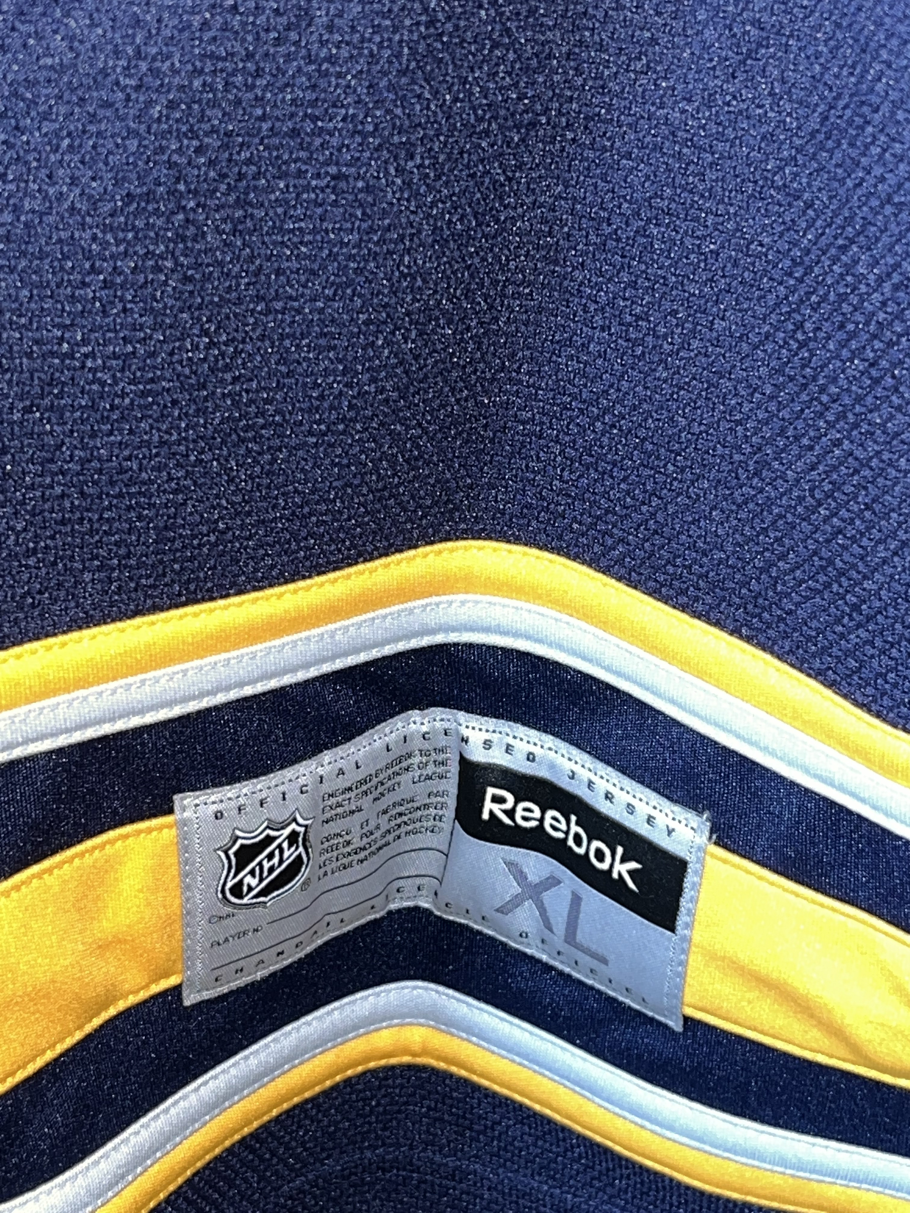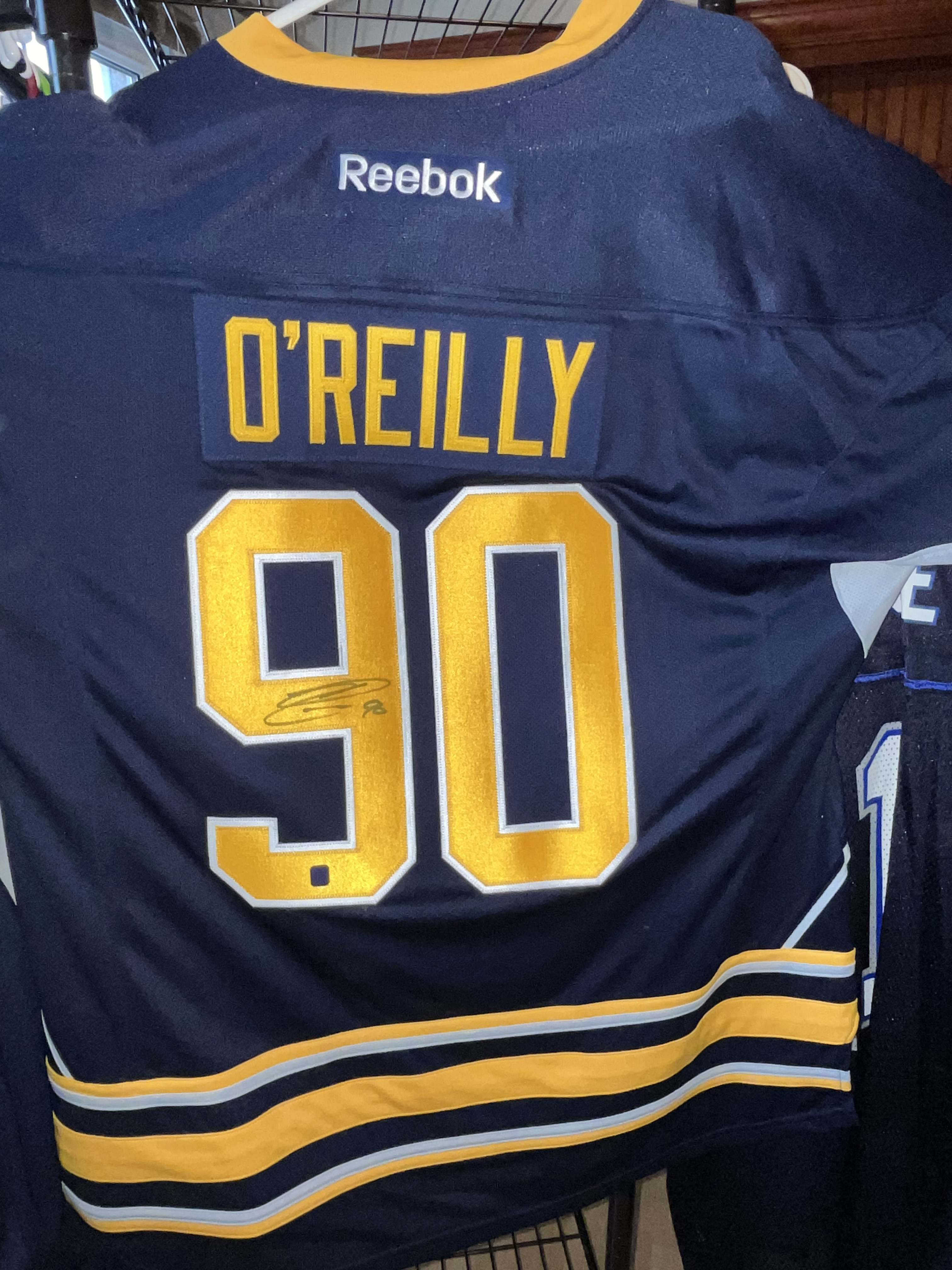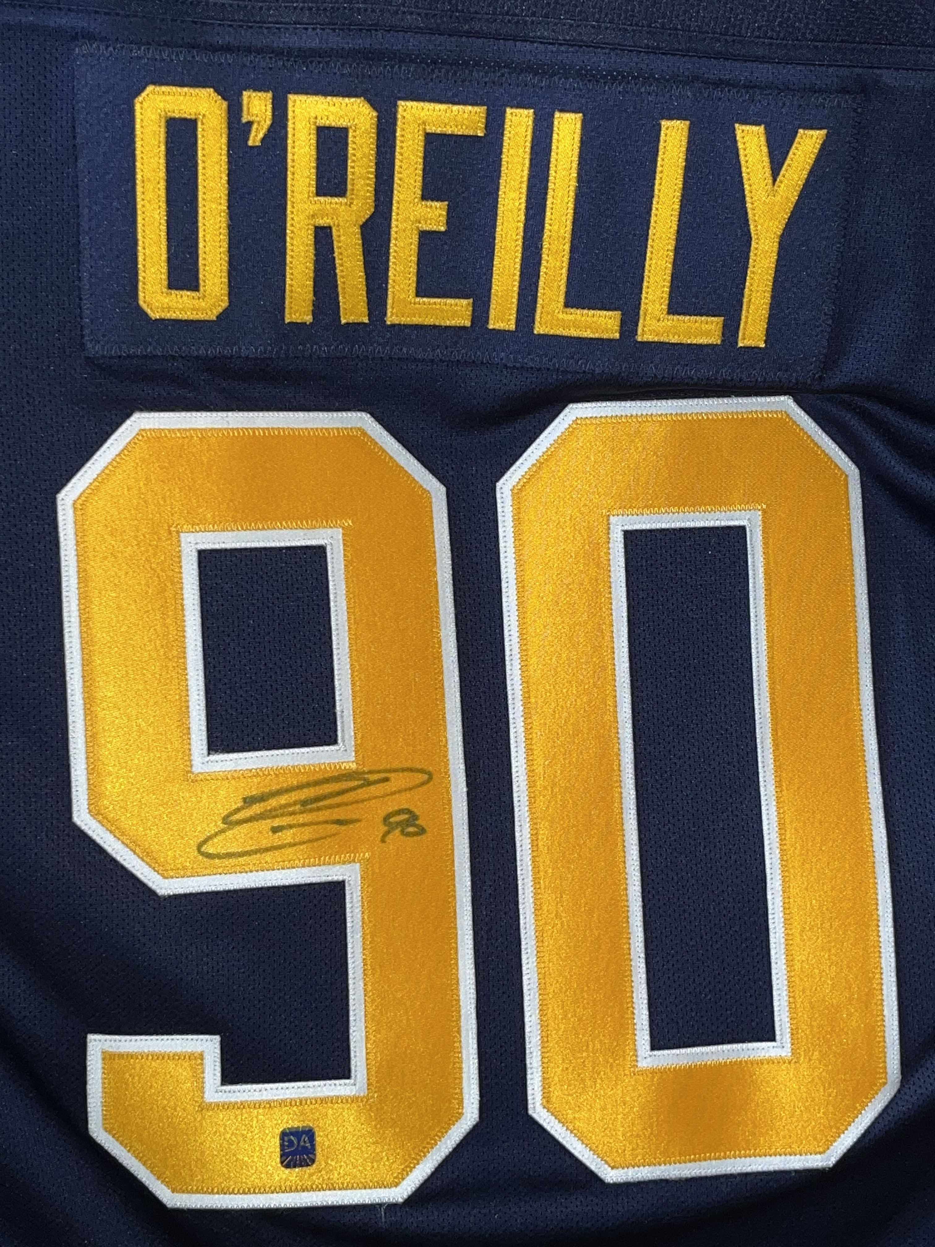 This Reebok Premier Replica Buffalo Sabres home jersey. The jersey is signed by Ryan O’Reilly in black permanent marker on the back number 9, accompanied by a 90 inscription. Authentication is provided by a Dave and Adam’s Card World hologram sticker (DA) affixed to the lower portion of the number 9.