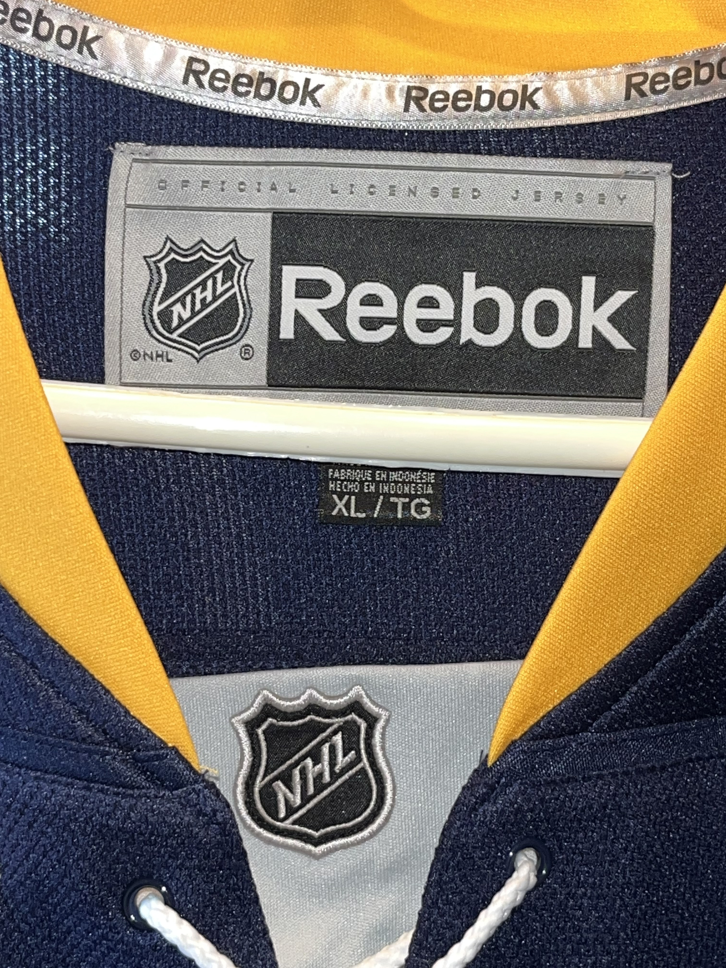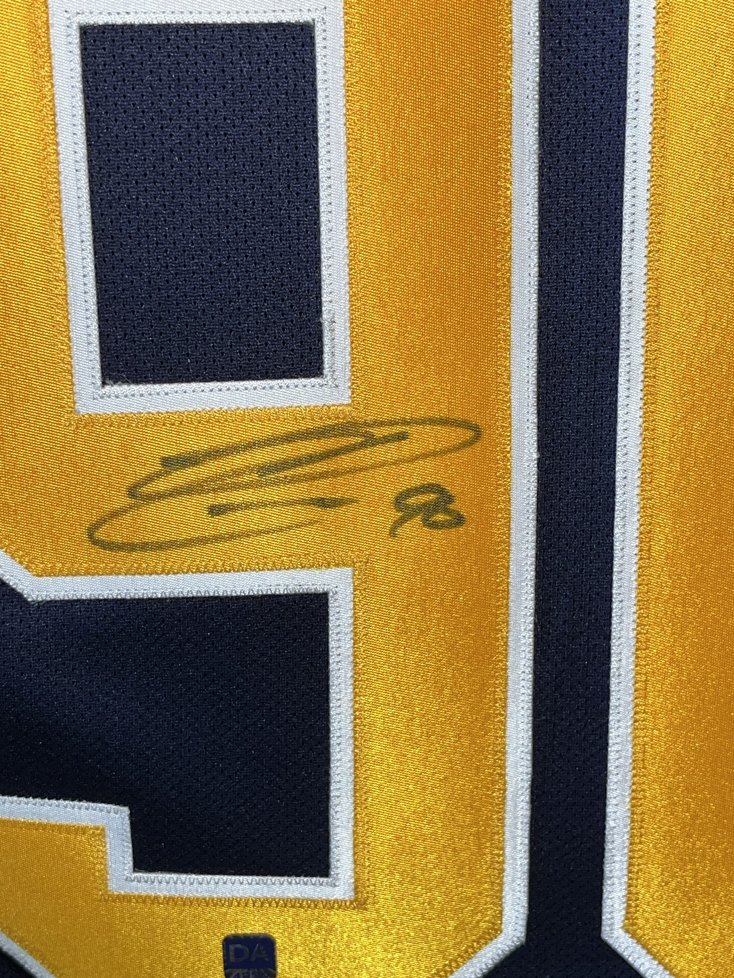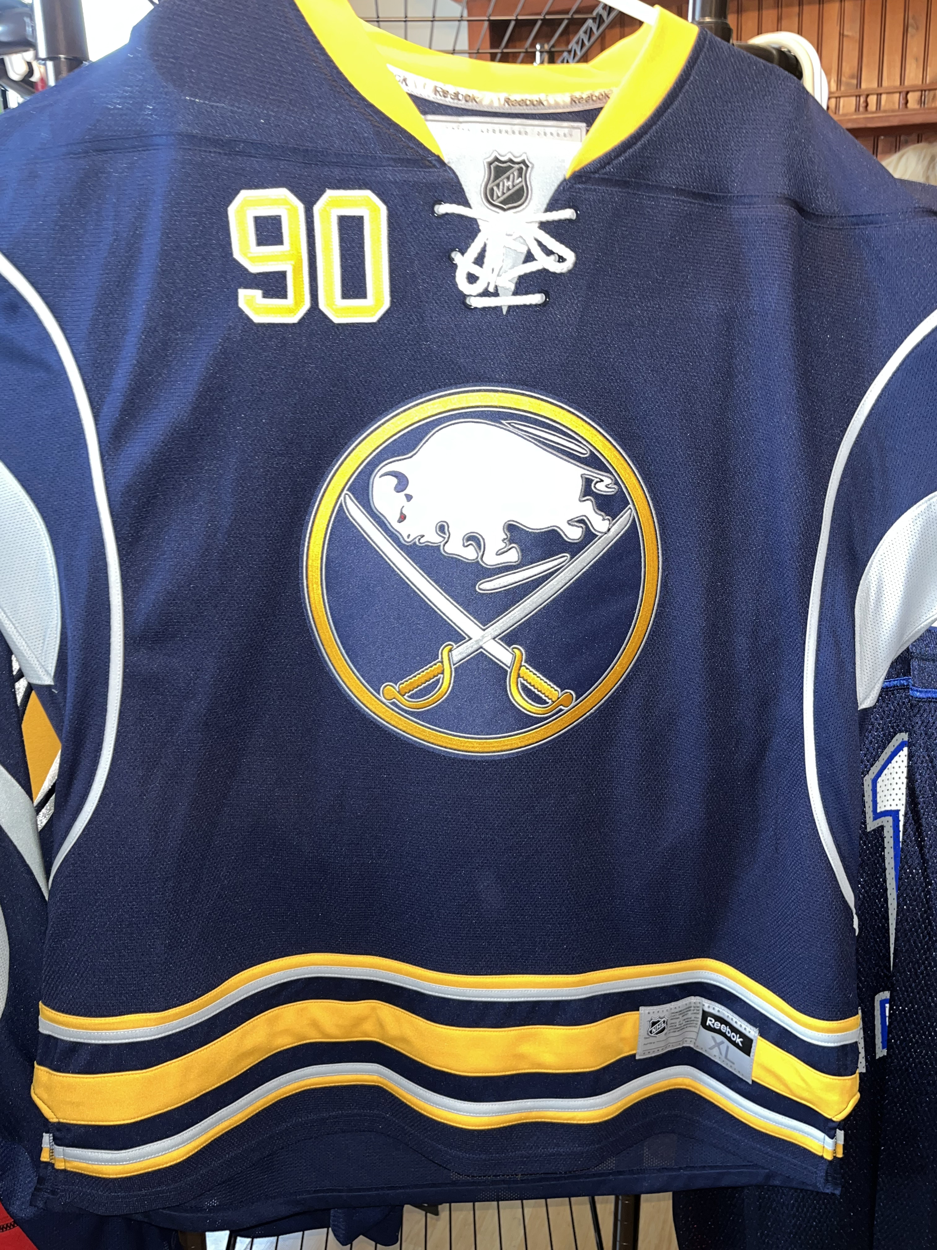 This Reebok Premier Replica Buffalo Sabres home jersey. The jersey is signed by Ryan O’Reilly in black permanent marker on the back number 9, accompanied by a 90 inscription. Authentication is provided by a Dave and Adam’s Card World hologram sticker (DA) affixed to the lower portion of the number 9.