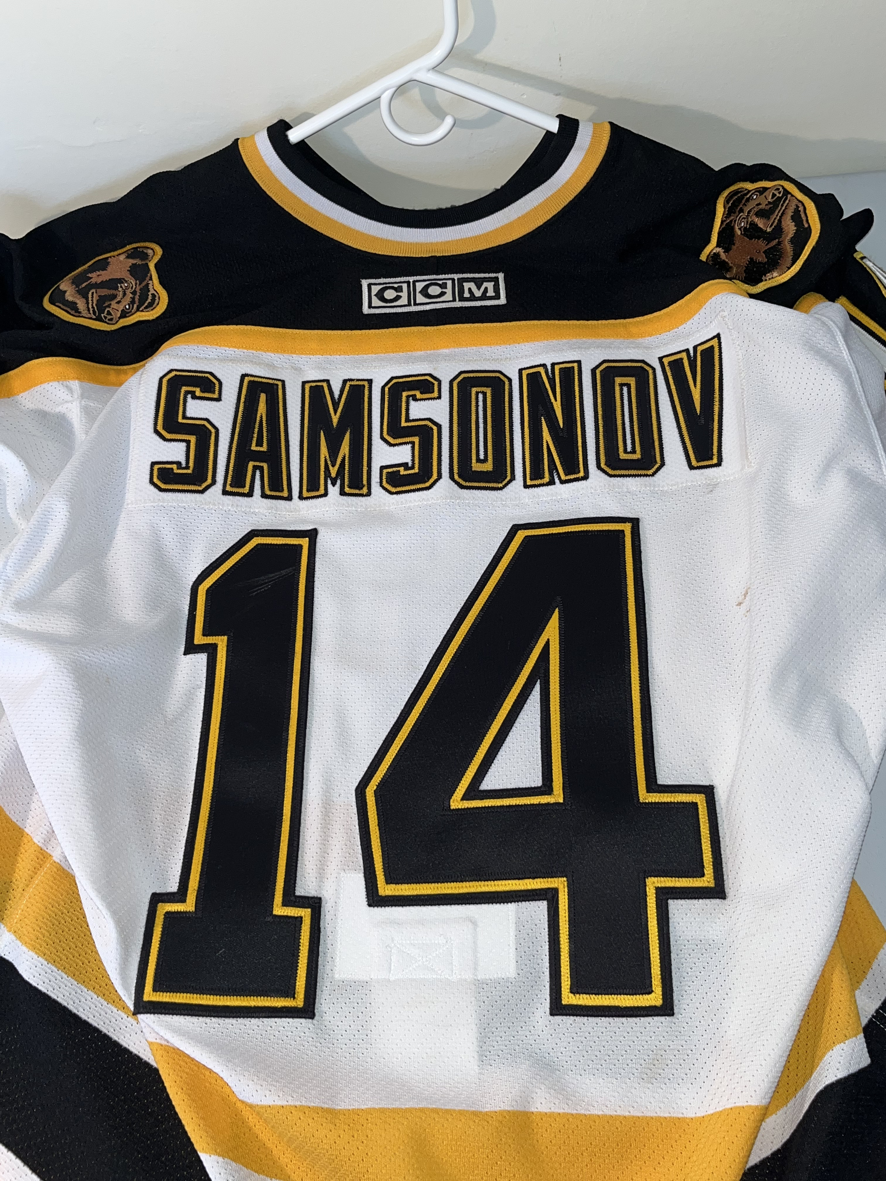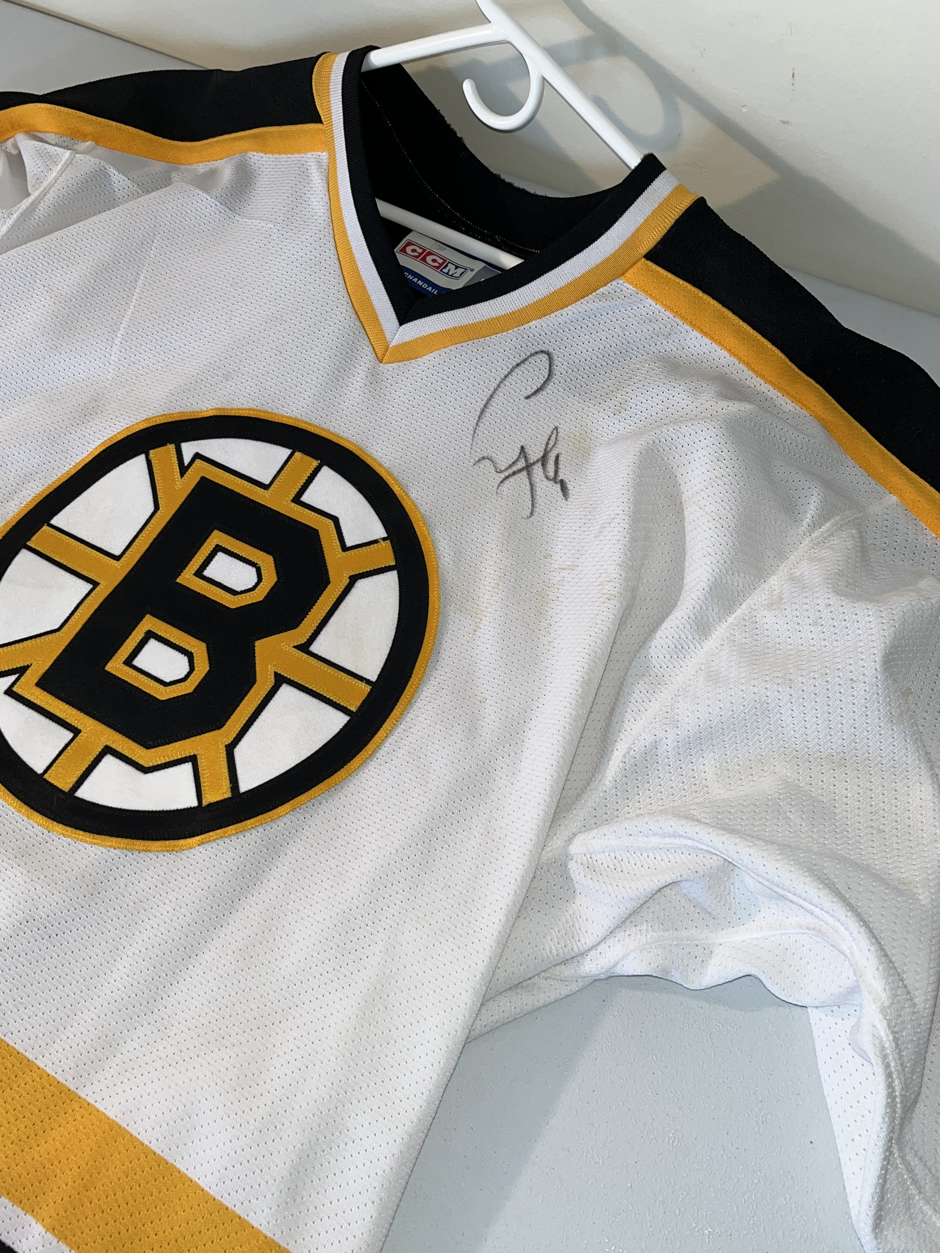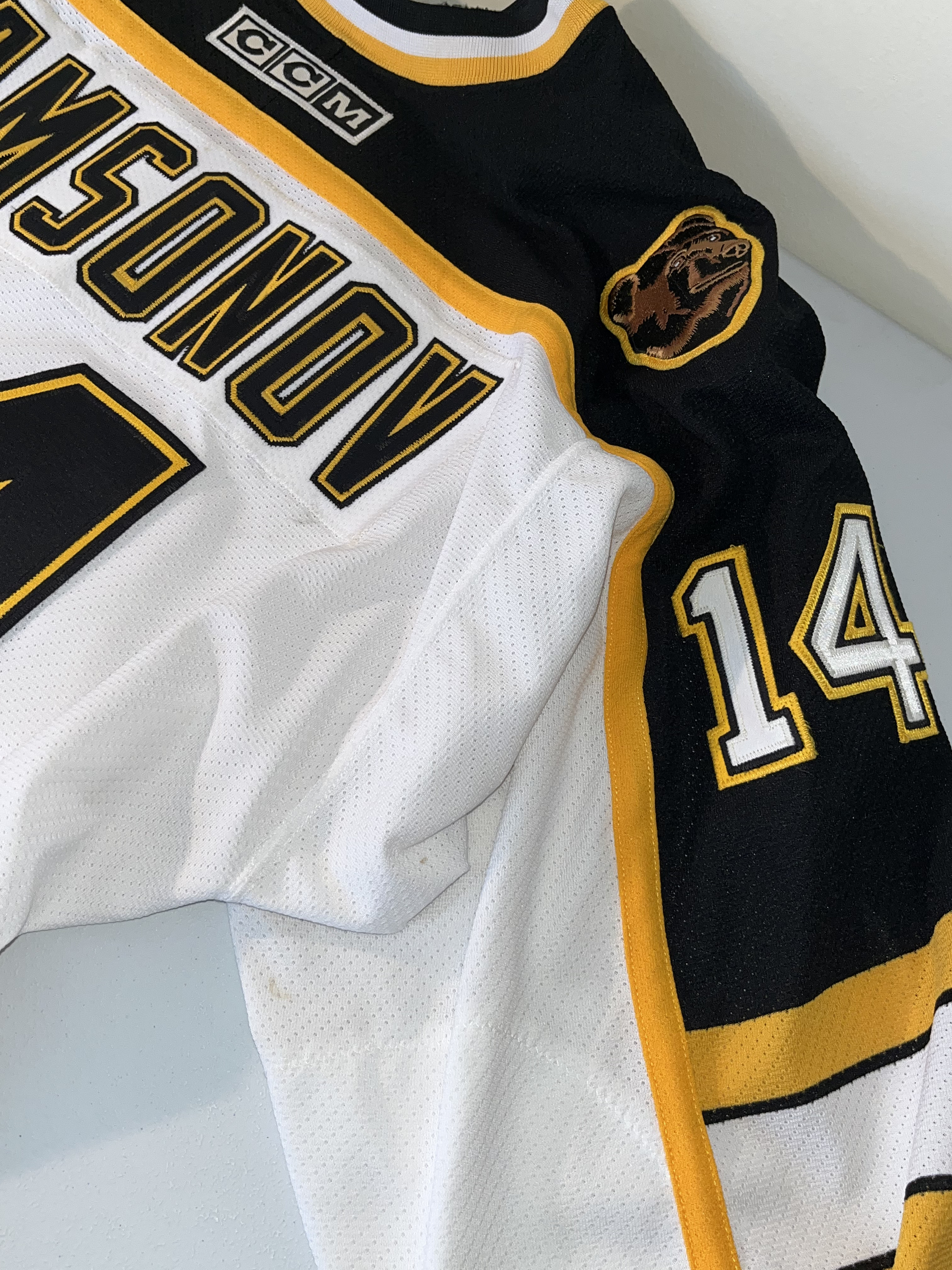 This is an authentic CCM On-Ice Game Jersey for Sergei Samsonov, who wore number 14 for the Boston Bruins. The white home-style jersey is a size 48 and features the team’s primary spoked B logo on the chest, with secondary bear logos on each shoulder. This autograph is unverified and does not include a certificate of authenticity. Samsonov was a significant player for the franchise, winning the Calder Memorial Trophy in 1998. This jersey represents the professional-grade construction used during his tenure with the team.