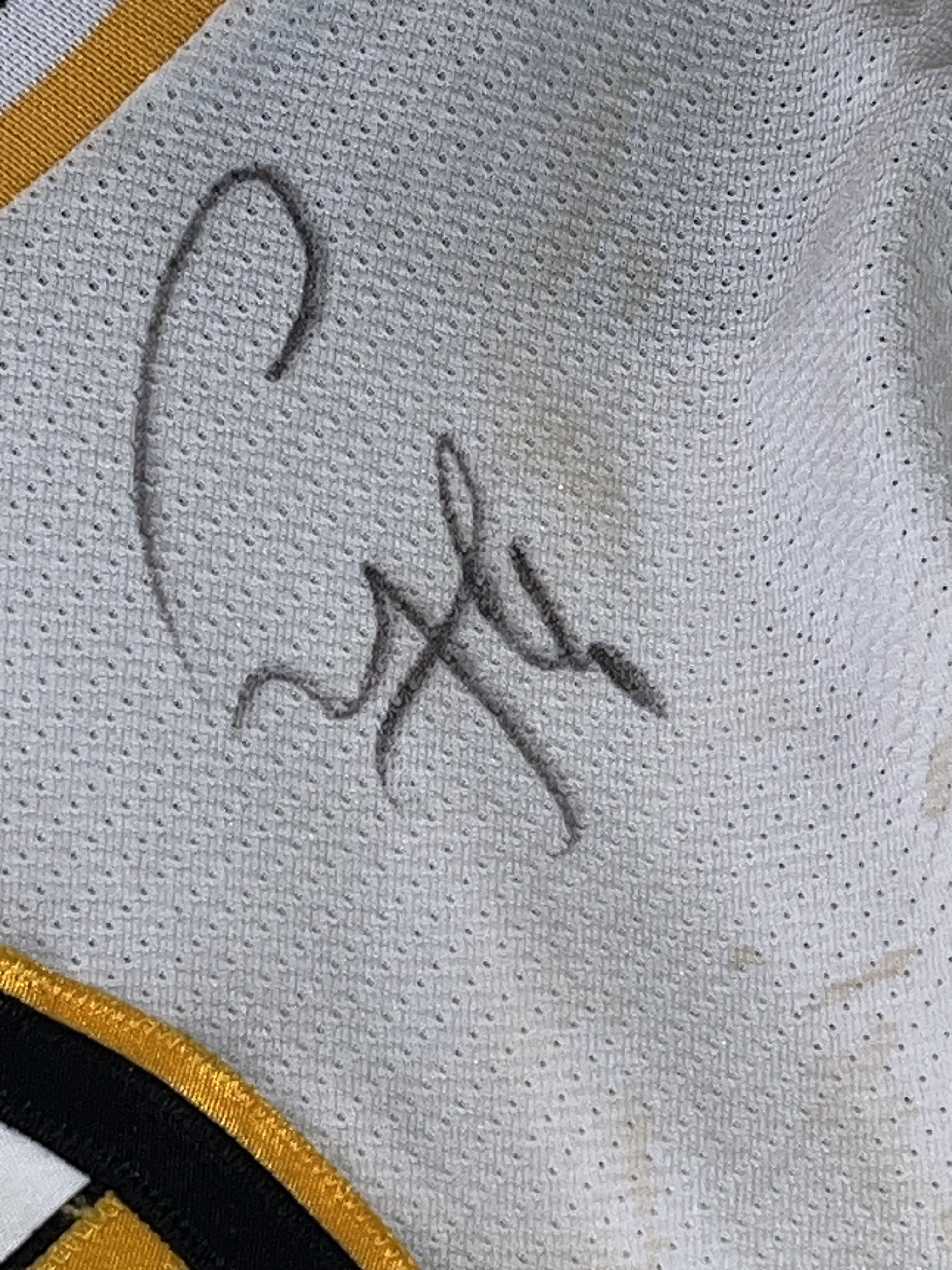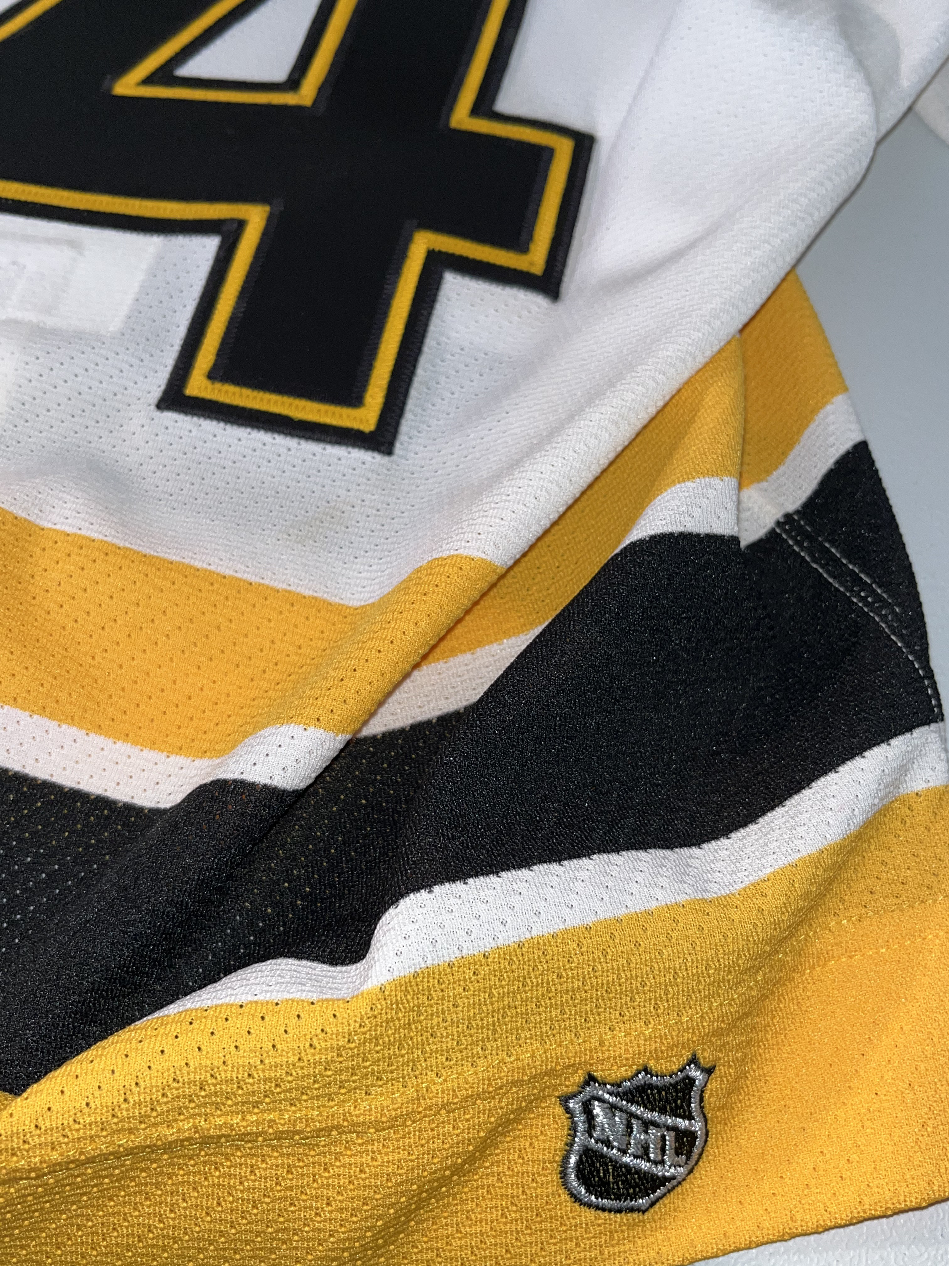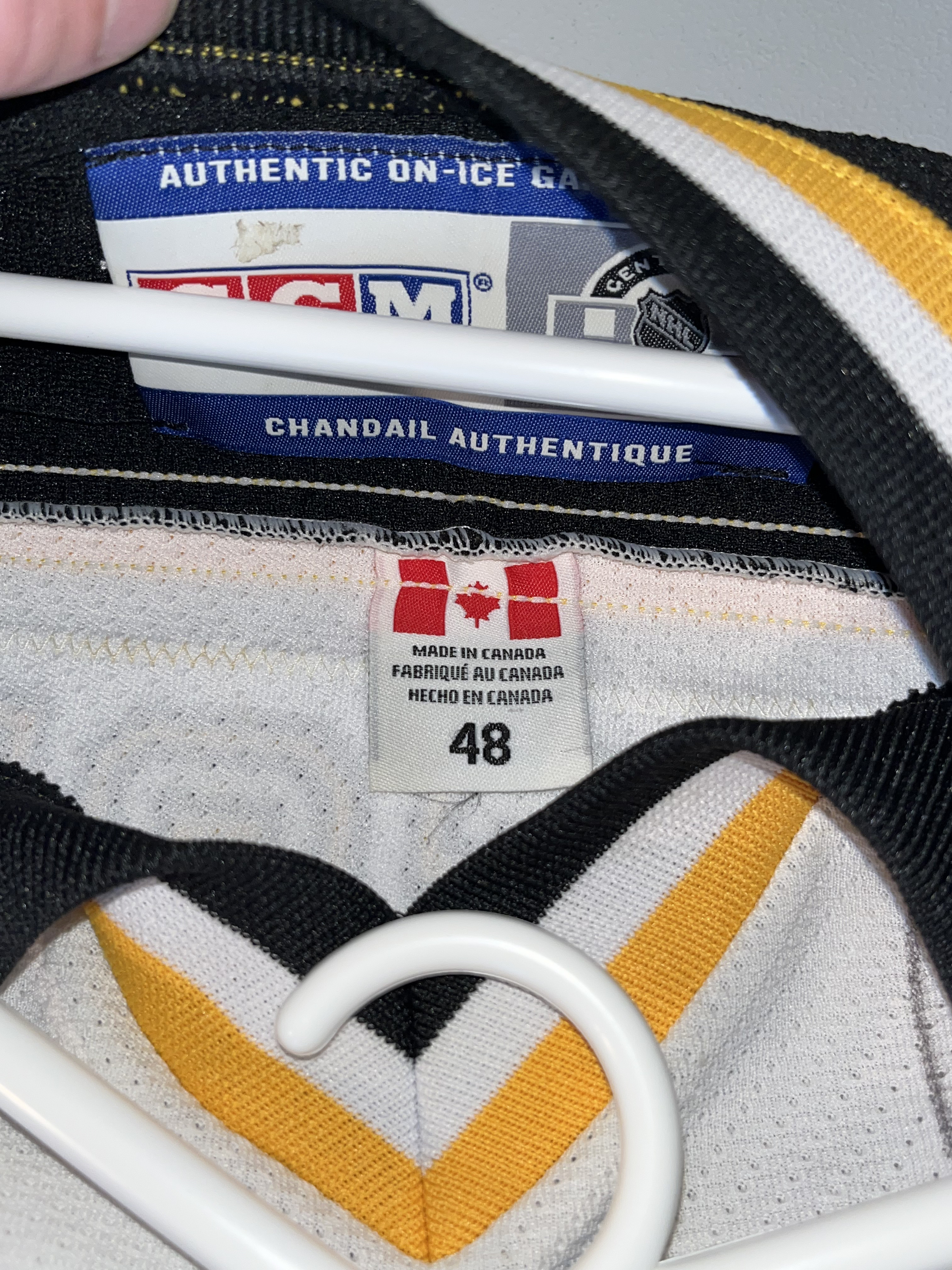 This is an authentic CCM On-Ice Game Jersey for Sergei Samsonov, who wore number 14 for the Boston Bruins. The white home-style jersey is a size 48 and features the team’s primary spoked B logo on the chest, with secondary bear logos on each shoulder. This autograph is unverified and does not include a certificate of authenticity. Samsonov was a significant player for the franchise, winning the Calder Memorial Trophy in 1998. This jersey represents the professional-grade construction used during his tenure with the team.