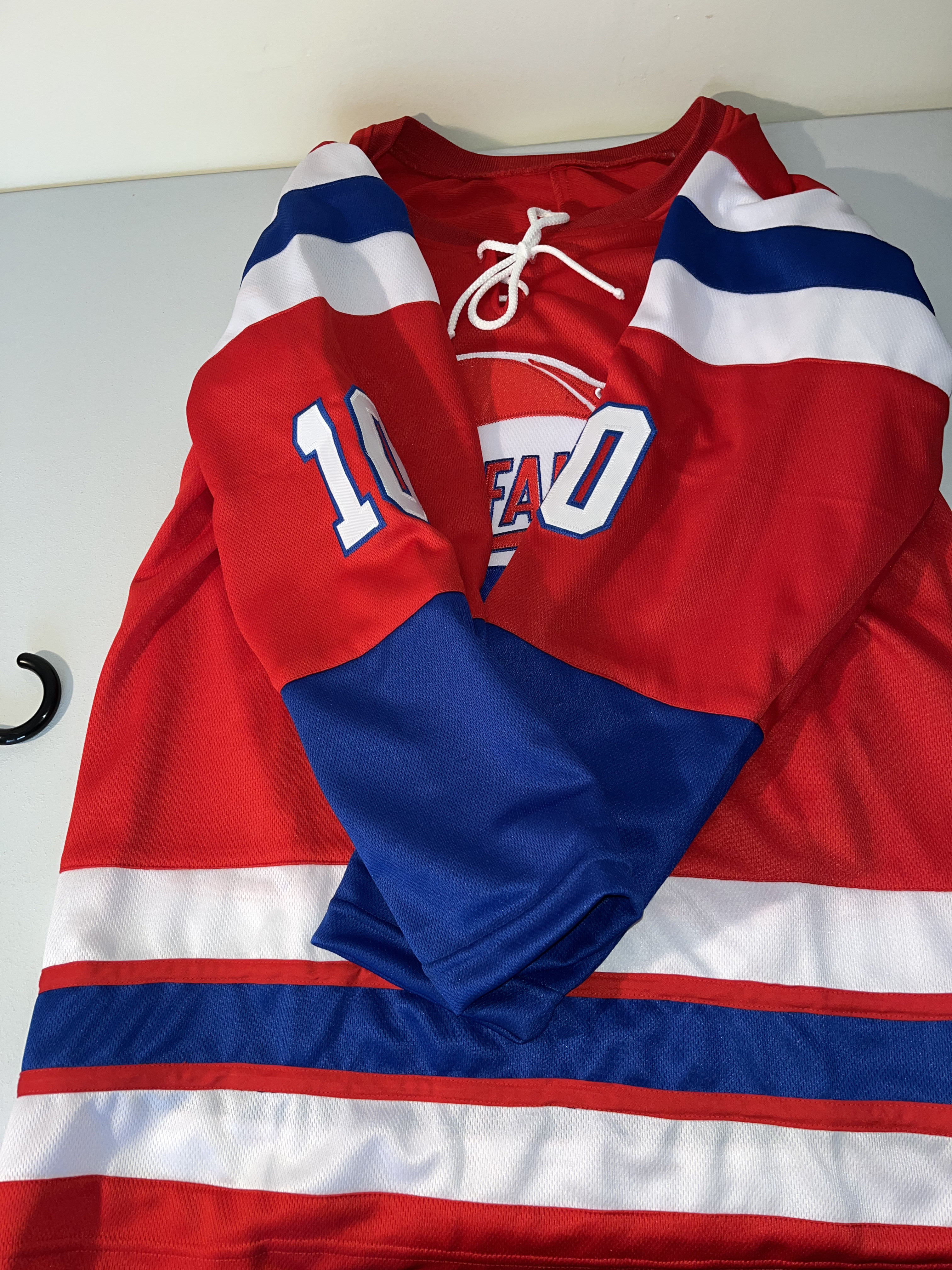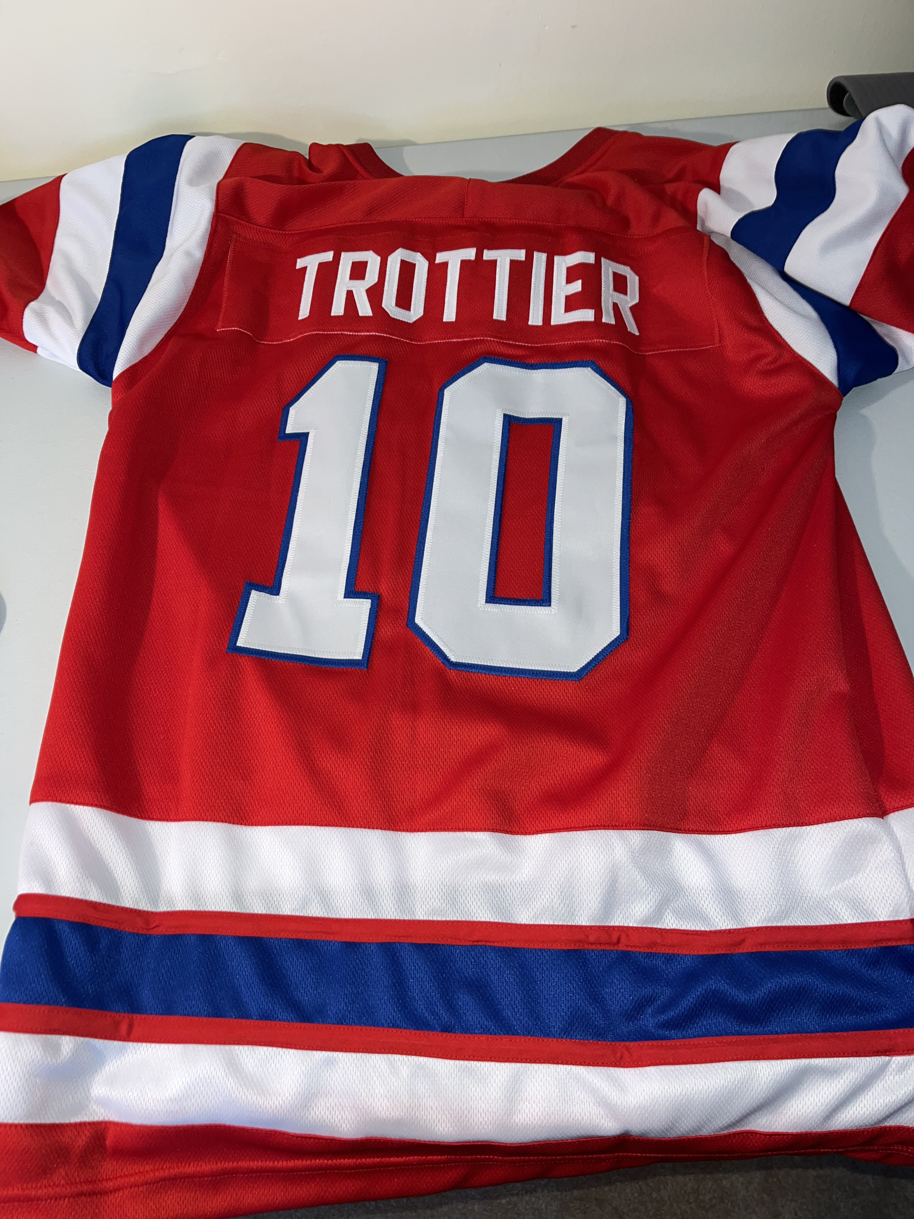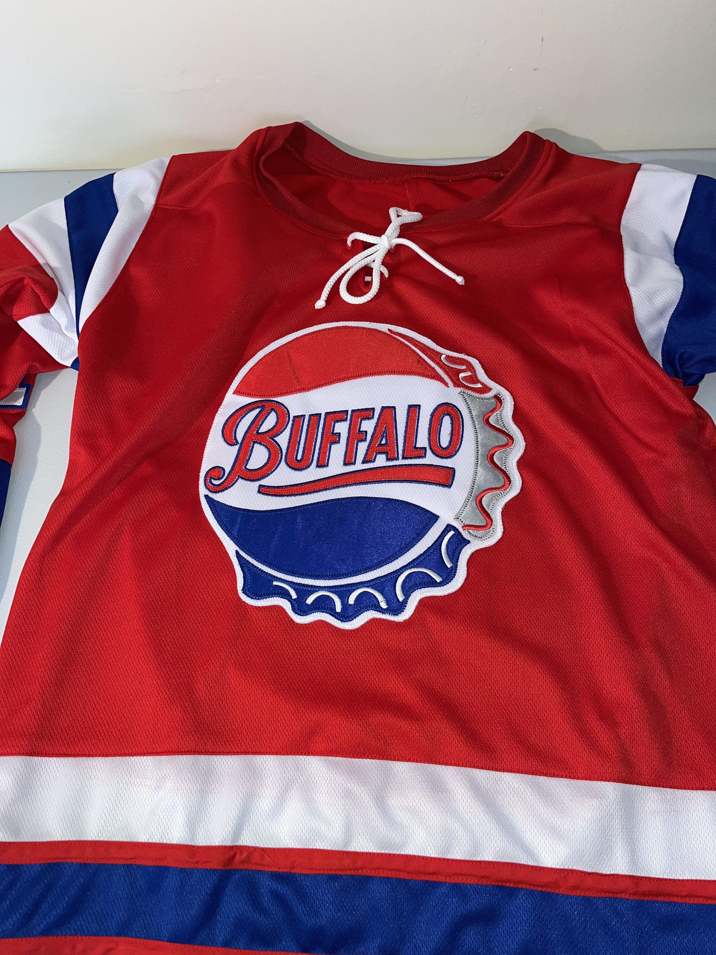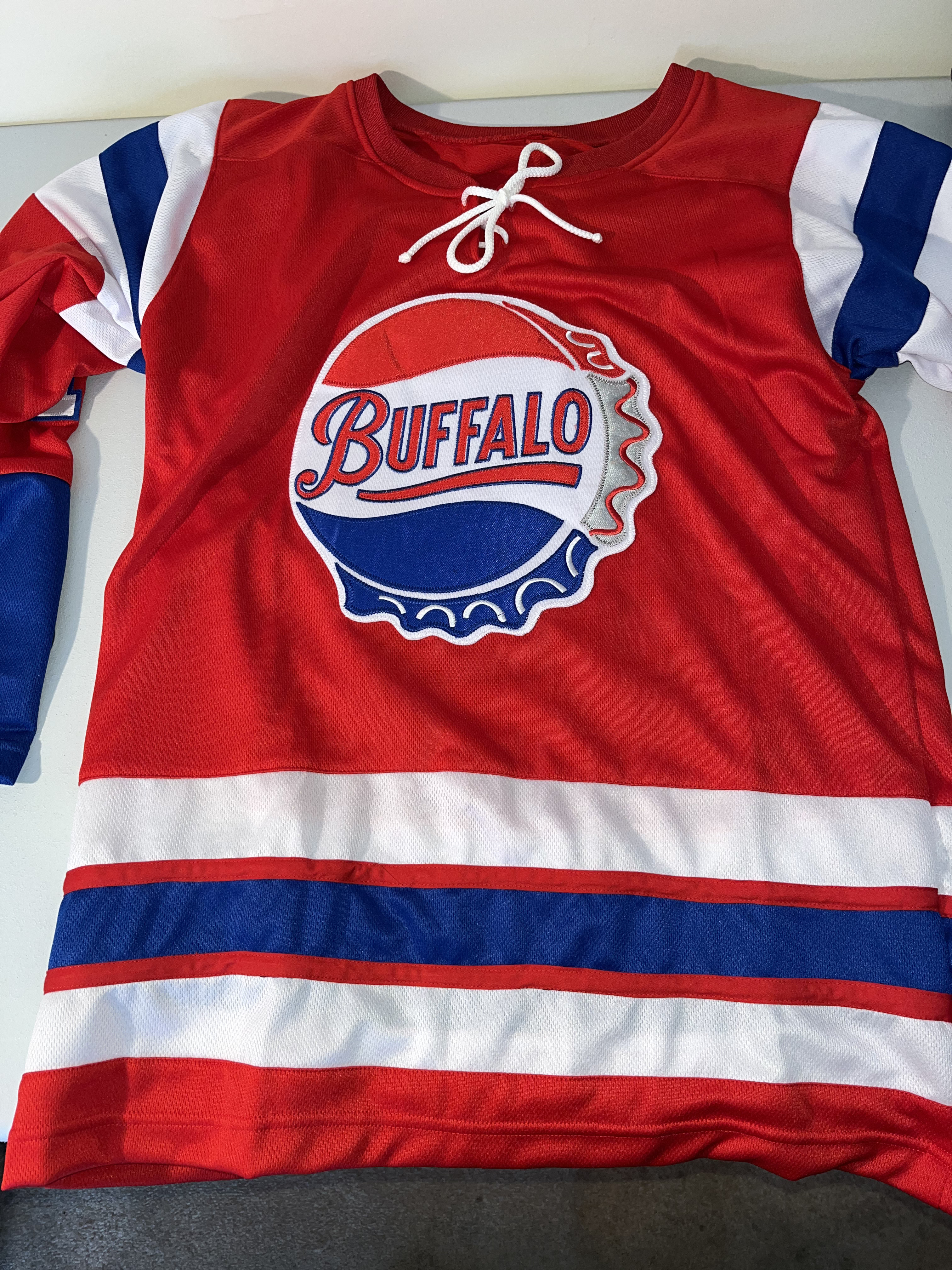 This is a vintage-style tribute jersey representing the Buffalo Bisons of the American Hockey League (AHL). The jersey features the iconic bottle cap logo, often referred to as the Pepsi logo, which was famously worn by the team during the late 1960s. This item is a high-quality modern reproduction designed to capture the aesthetic of the original 1967-1970 era uniforms. No size but appears to be adult Large
