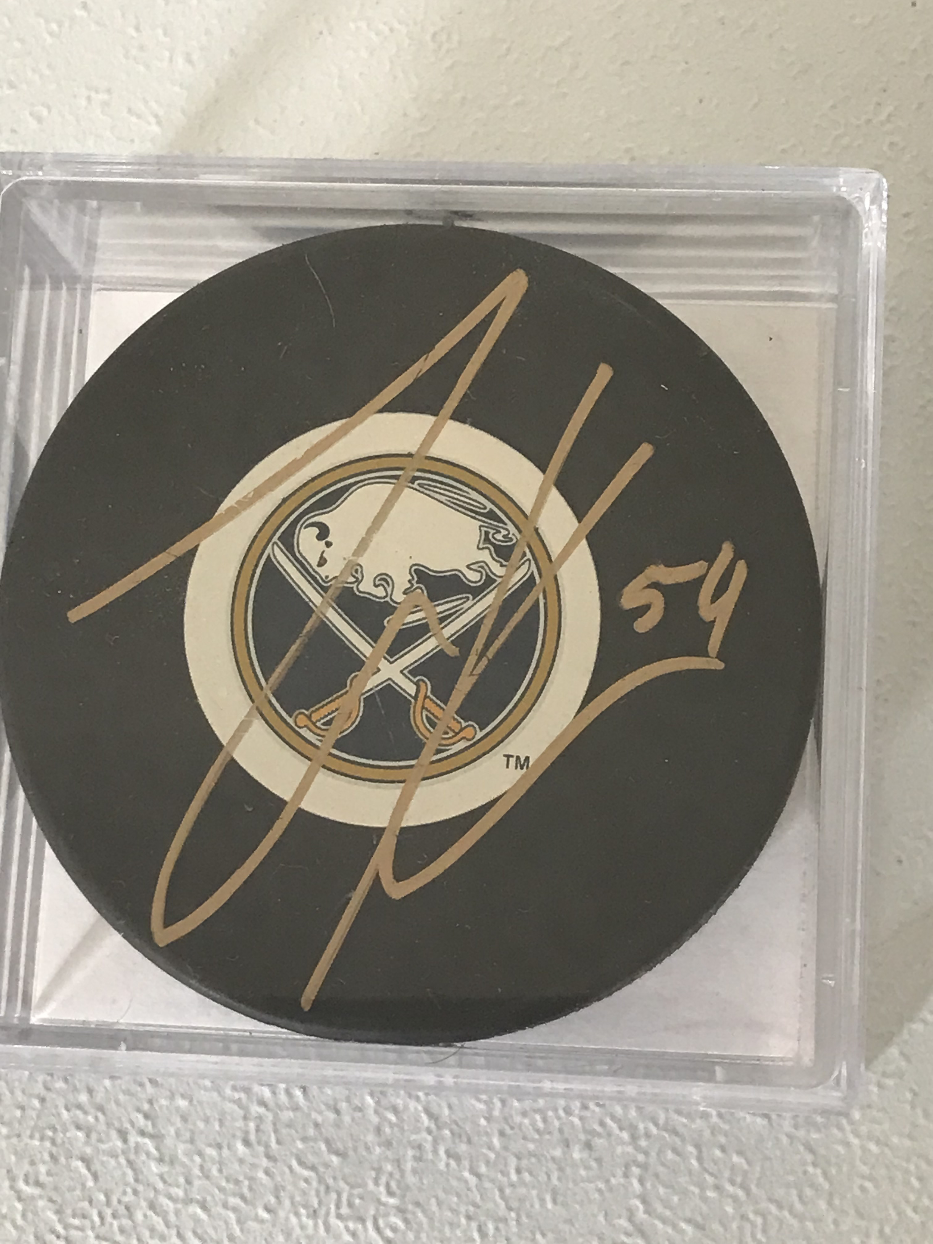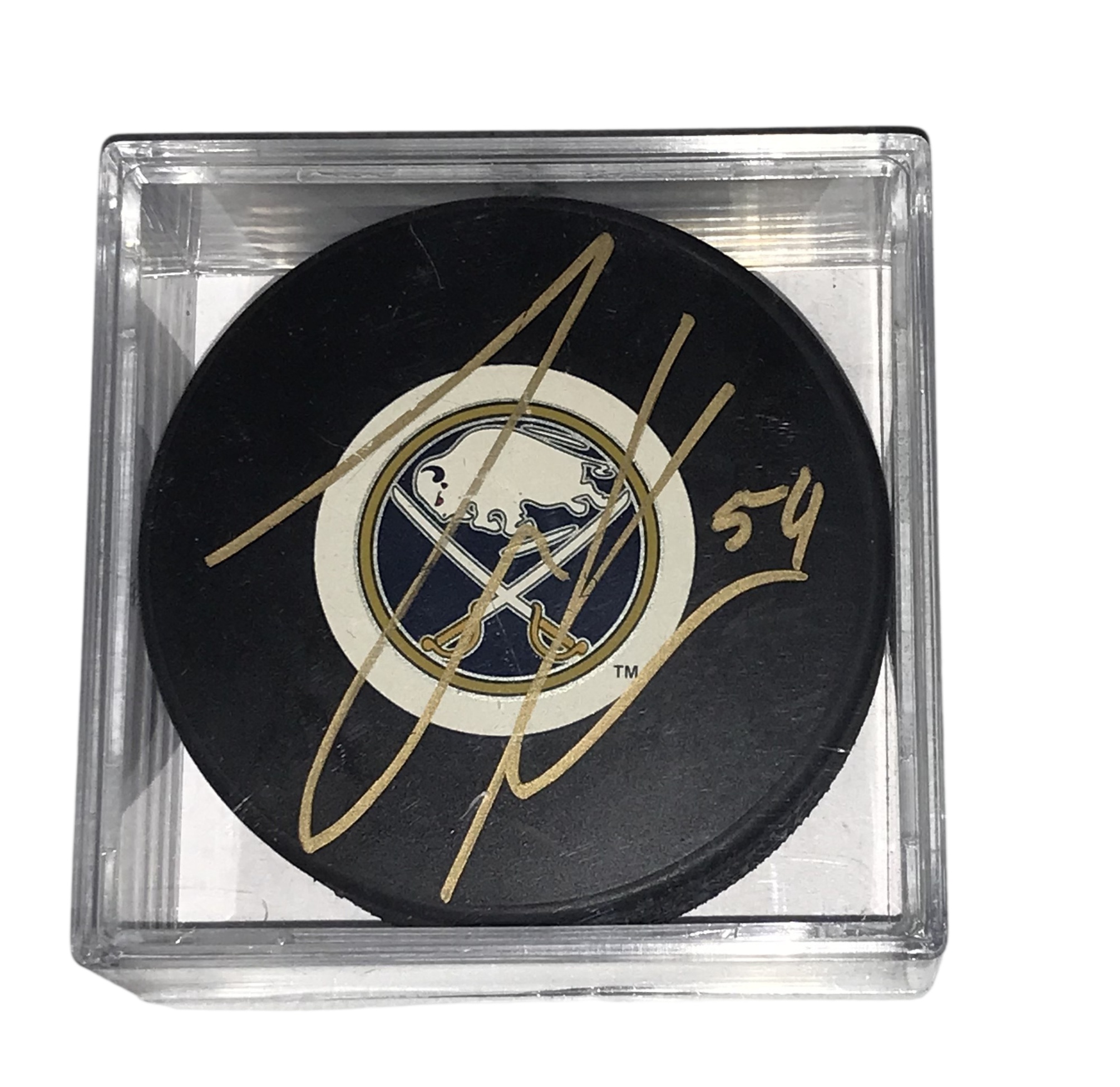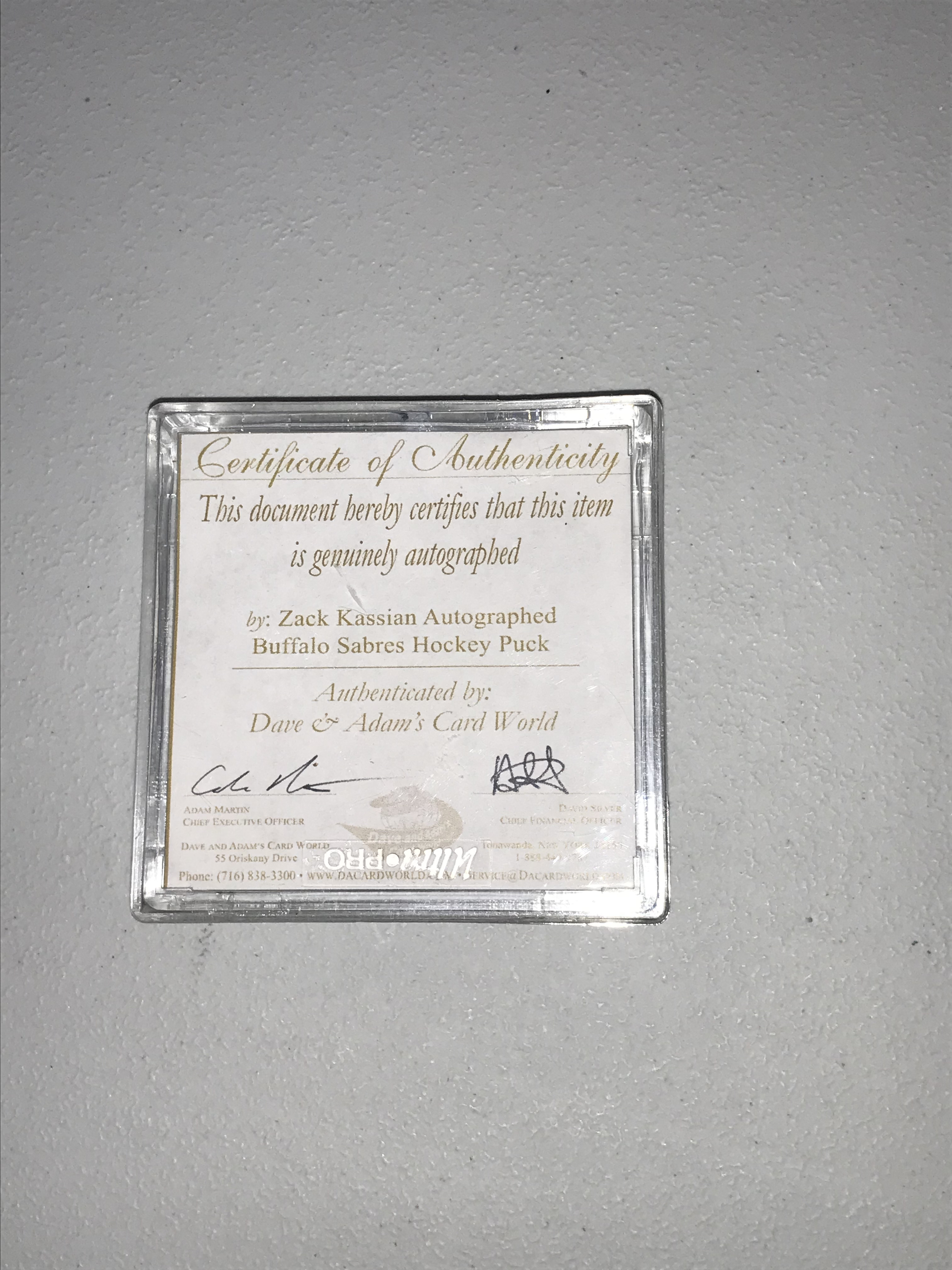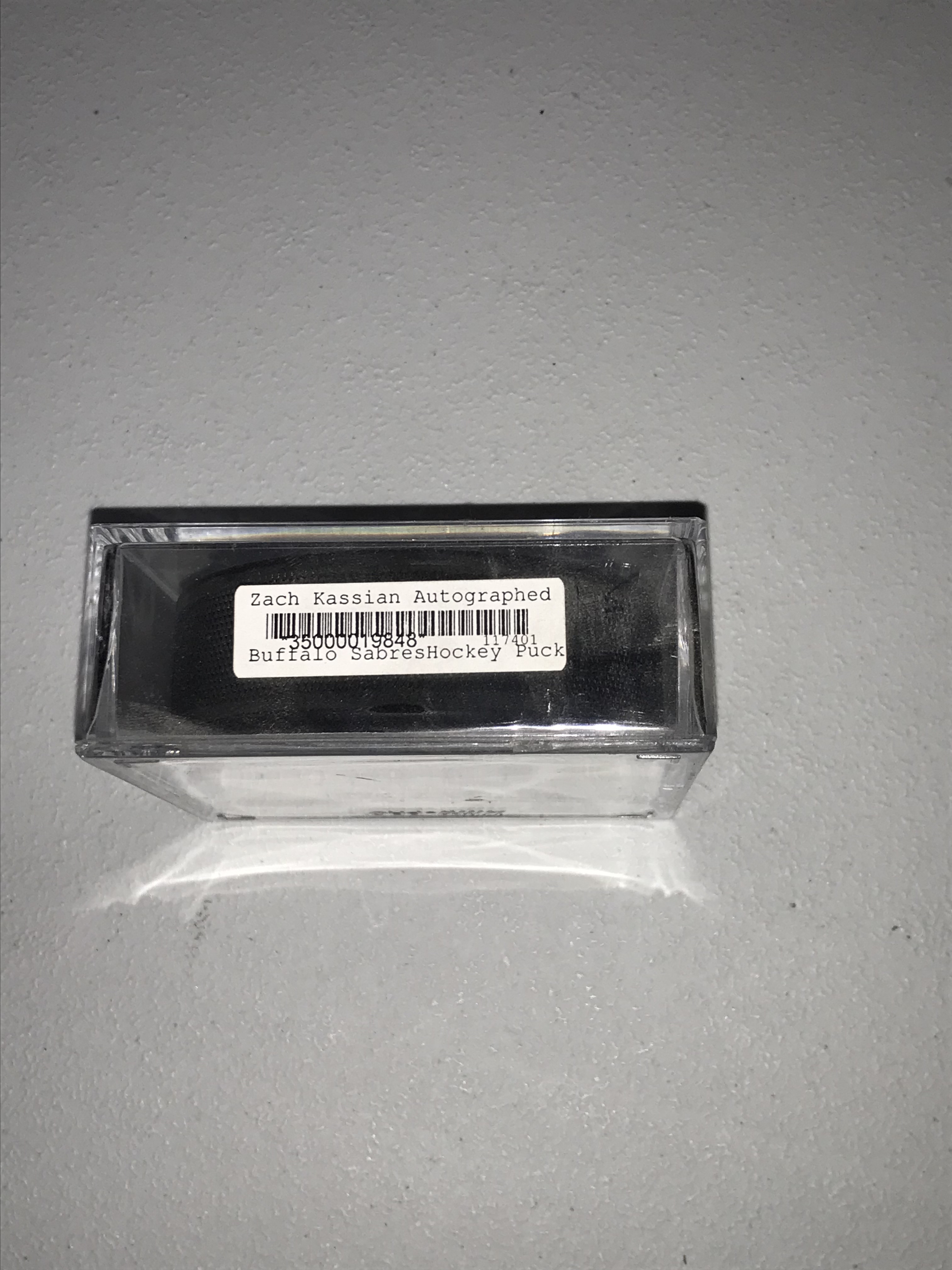 Zack Kassian autographed Buffalo Sabres hockey puck, circa 2011-2012. The black regulation-style puck features the Buffalo Sabres logo on the front face and a signature in gold-tone metallic ink with the player’s jersey number 54. This item is housed in a clear square acrylic display case and is accompanied by a Certificate of Authenticity from Dave and Adam’s Card World.