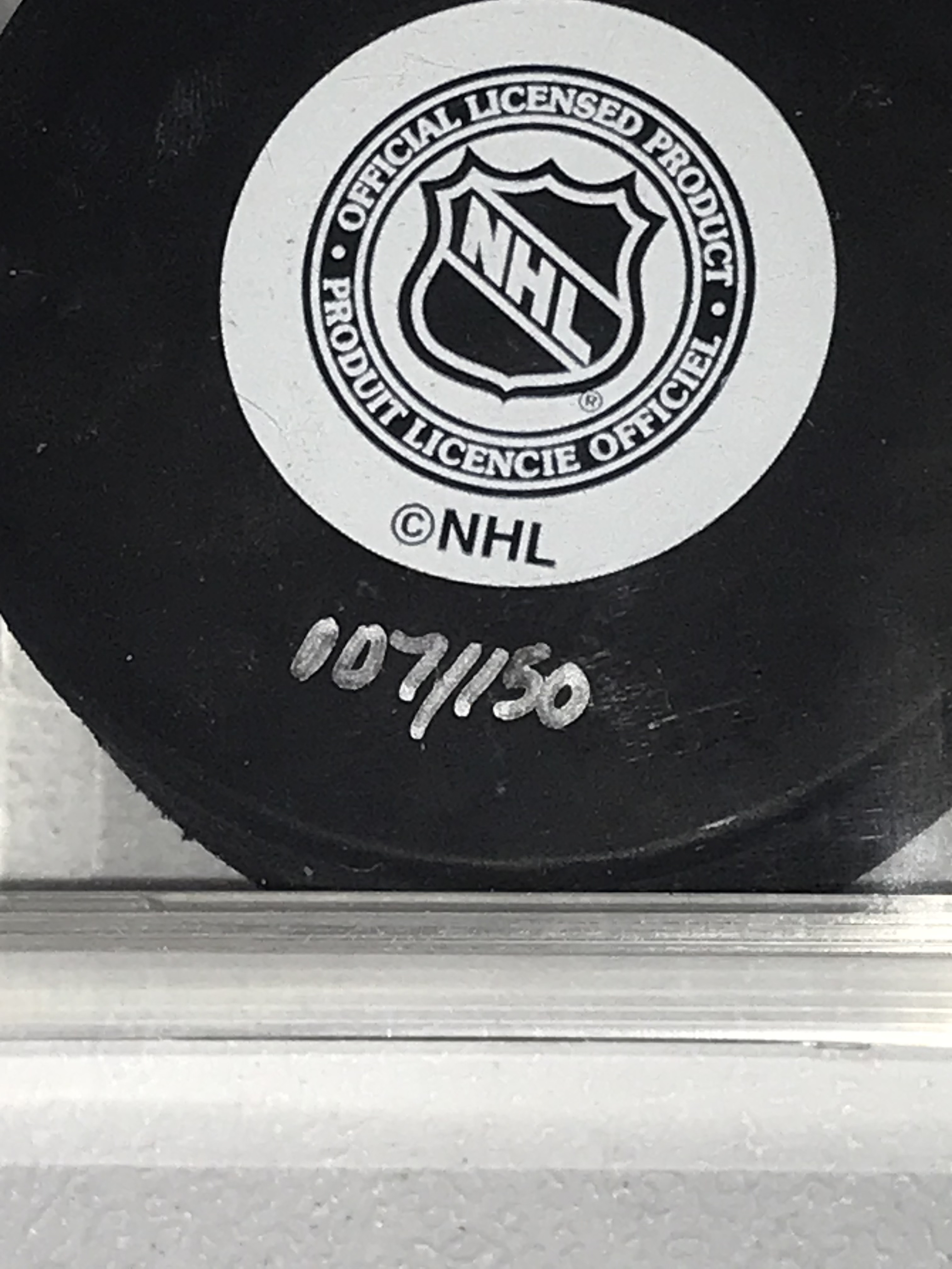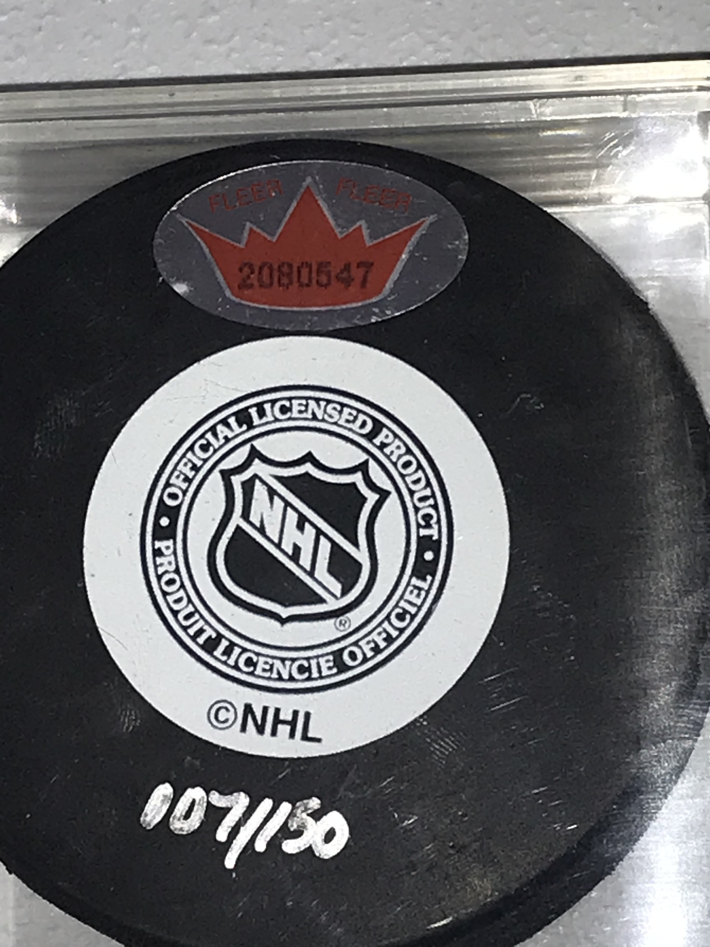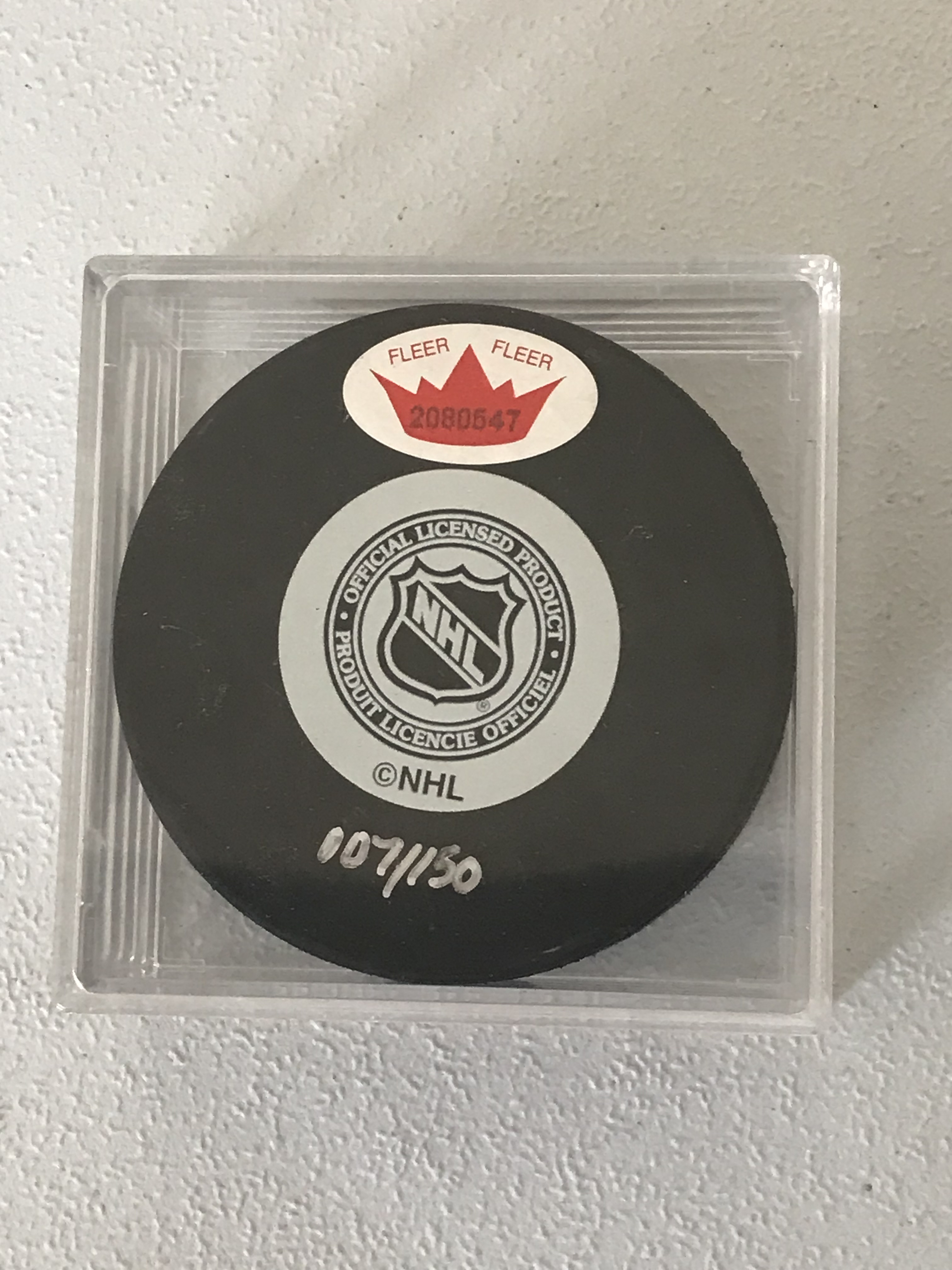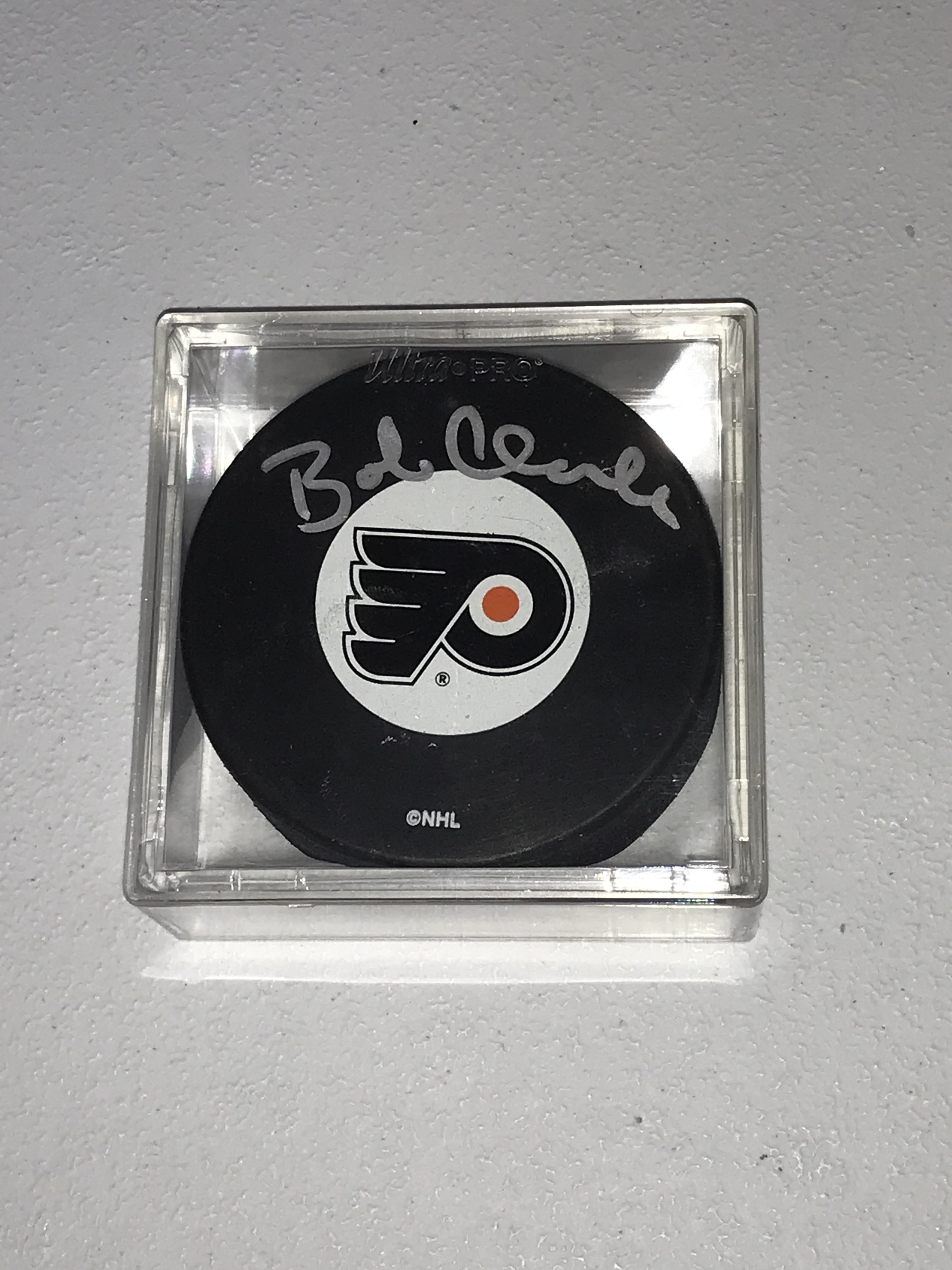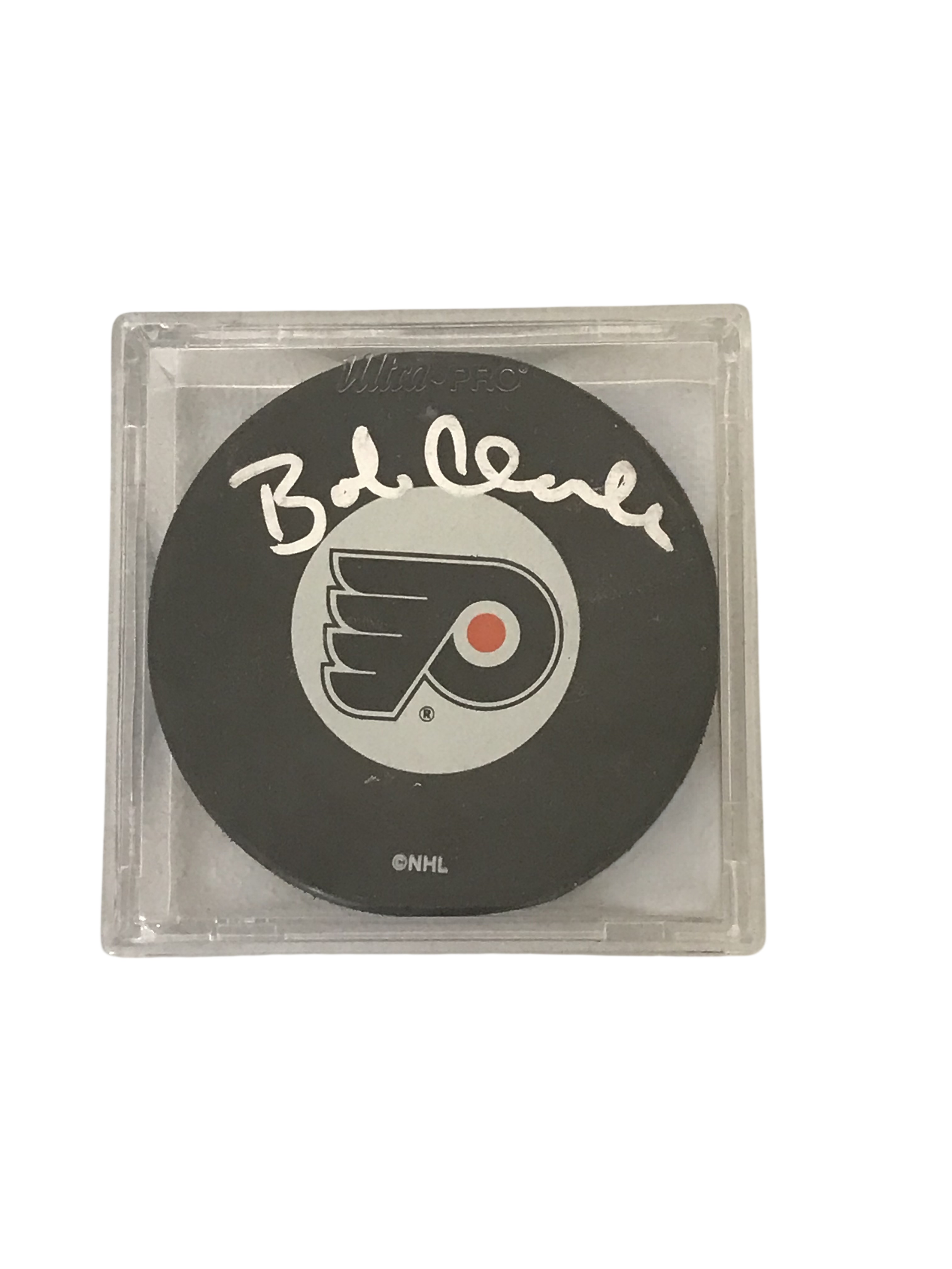 Officially licensed NHL Philadelphia Flyers hockey puck signed by Bob Clarke in silver paint pen on the face. The reverse features an NHL Official Licensed Product logo and is hand-numbered in silver as limited edition 107 of 150. Authentication is provided by a Fleer hologram sticker with serial number 2080547 on the reverse. The item is housed in a clear Ultra-PRO square plastic display case.