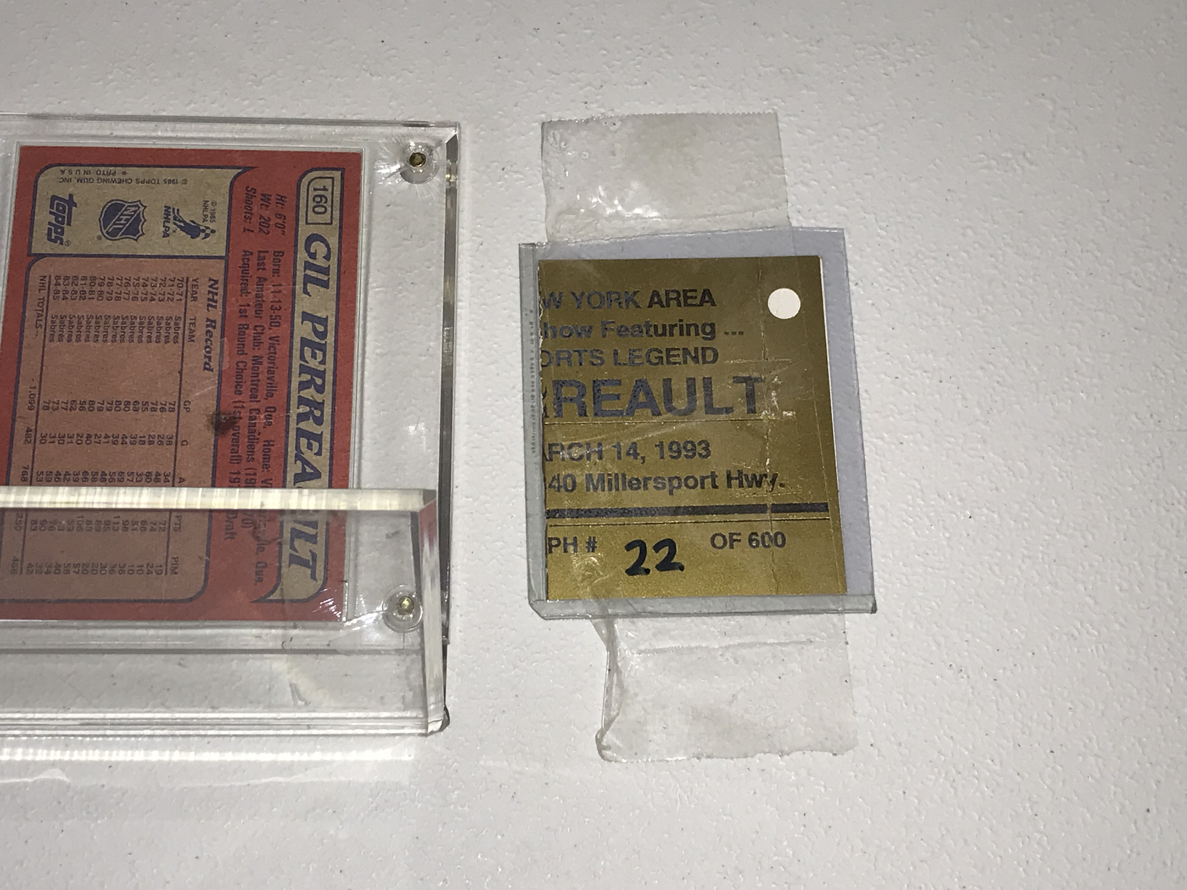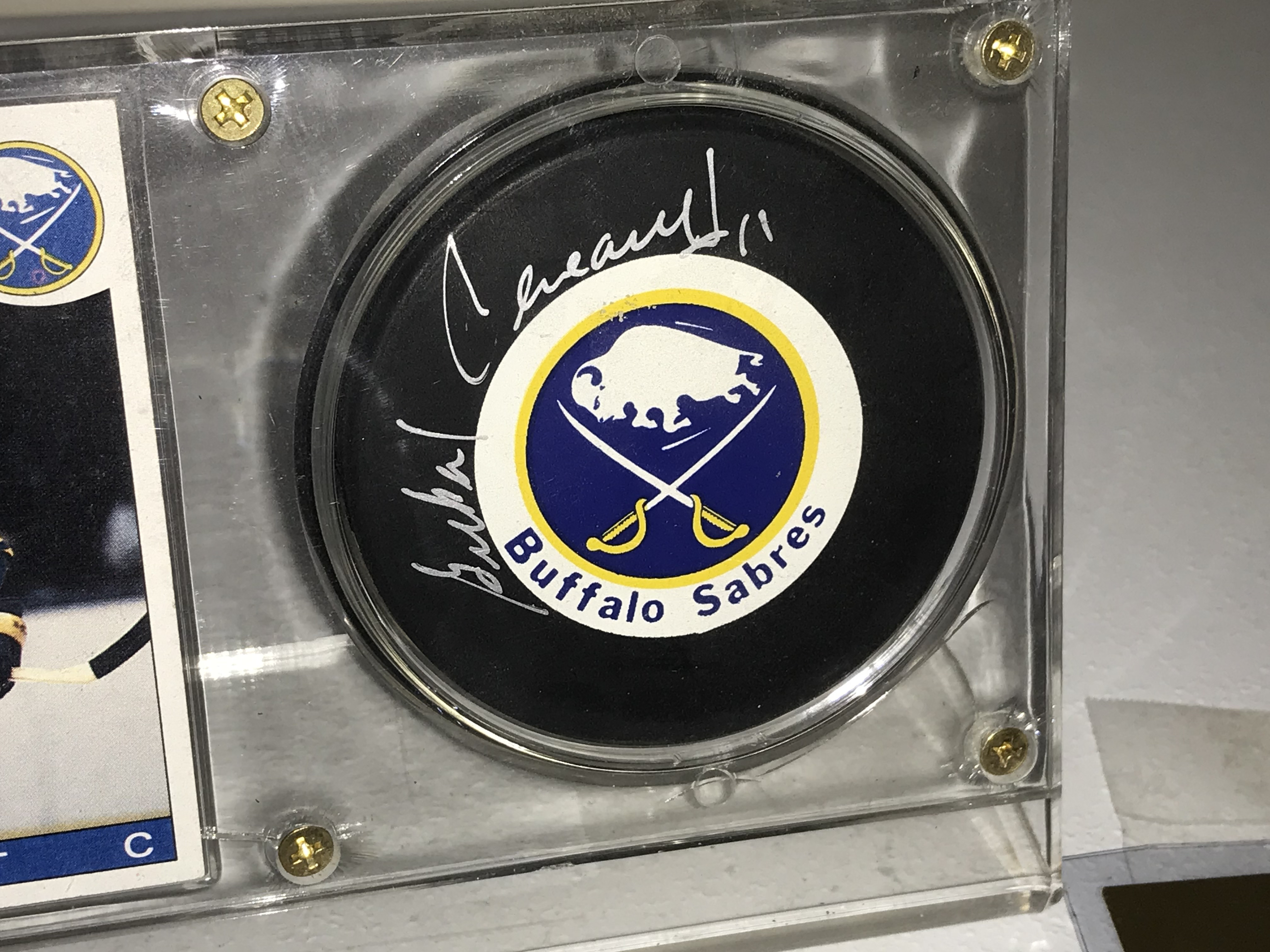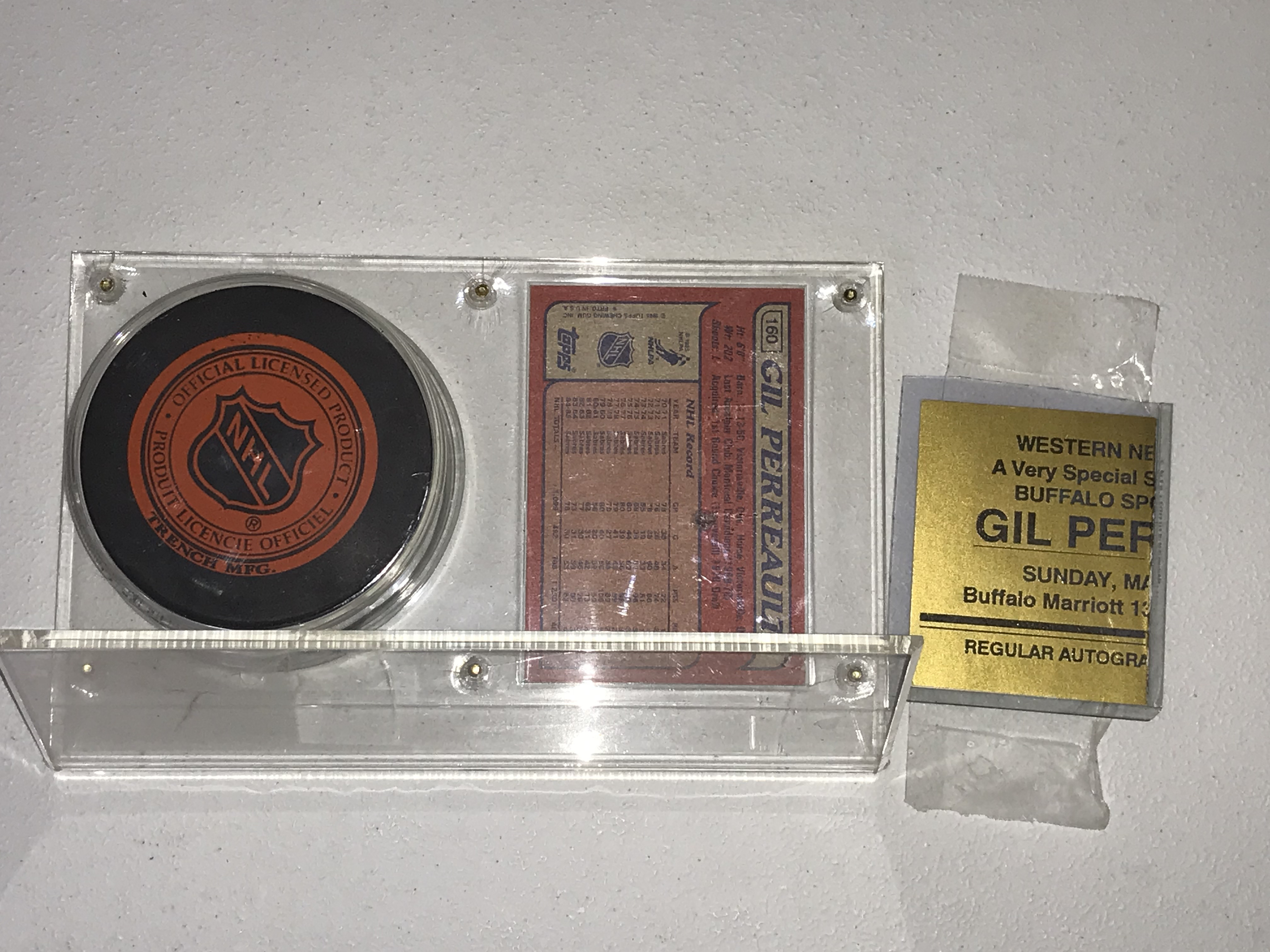 This Buffalo Sabres memorabilia display features a hockey puck hand-signed by Hall of Famer Gil Perreault in silver-toned ink including his jersey number 11. The puck is an official licensed product manufactured by Trench Mfg. and is paired with a 1985-86 Topps hockey card number 160. The collection is housed in a clear acrylic screw-down case and includes a gold-colored signing event certificate from March 14, 1993, at the Buffalo Marriott, numbered 22 of 600.