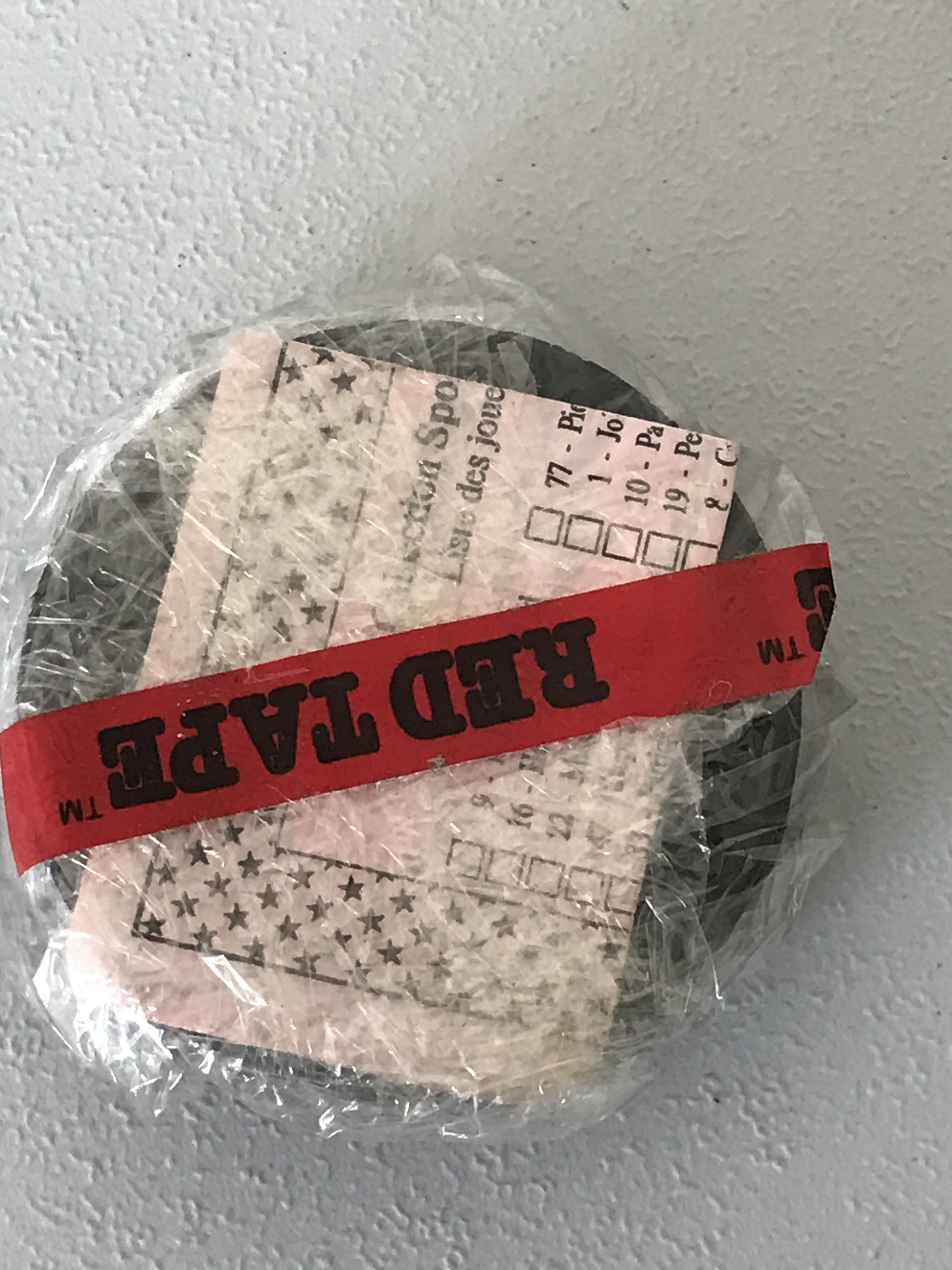 Souvenir portrait hockey puck featuring Buffalo Sabres Hall of Famer Gilbert Perreault, circa 1970s-1980s. The face displays a color portrait with printed text and a signature in blue ink. The reverse includes an original bilingual paper checklist for a collectible series and a red adhesive strip marked RED TAPE. No third-party certificate of authenticity or formal authentication is present.