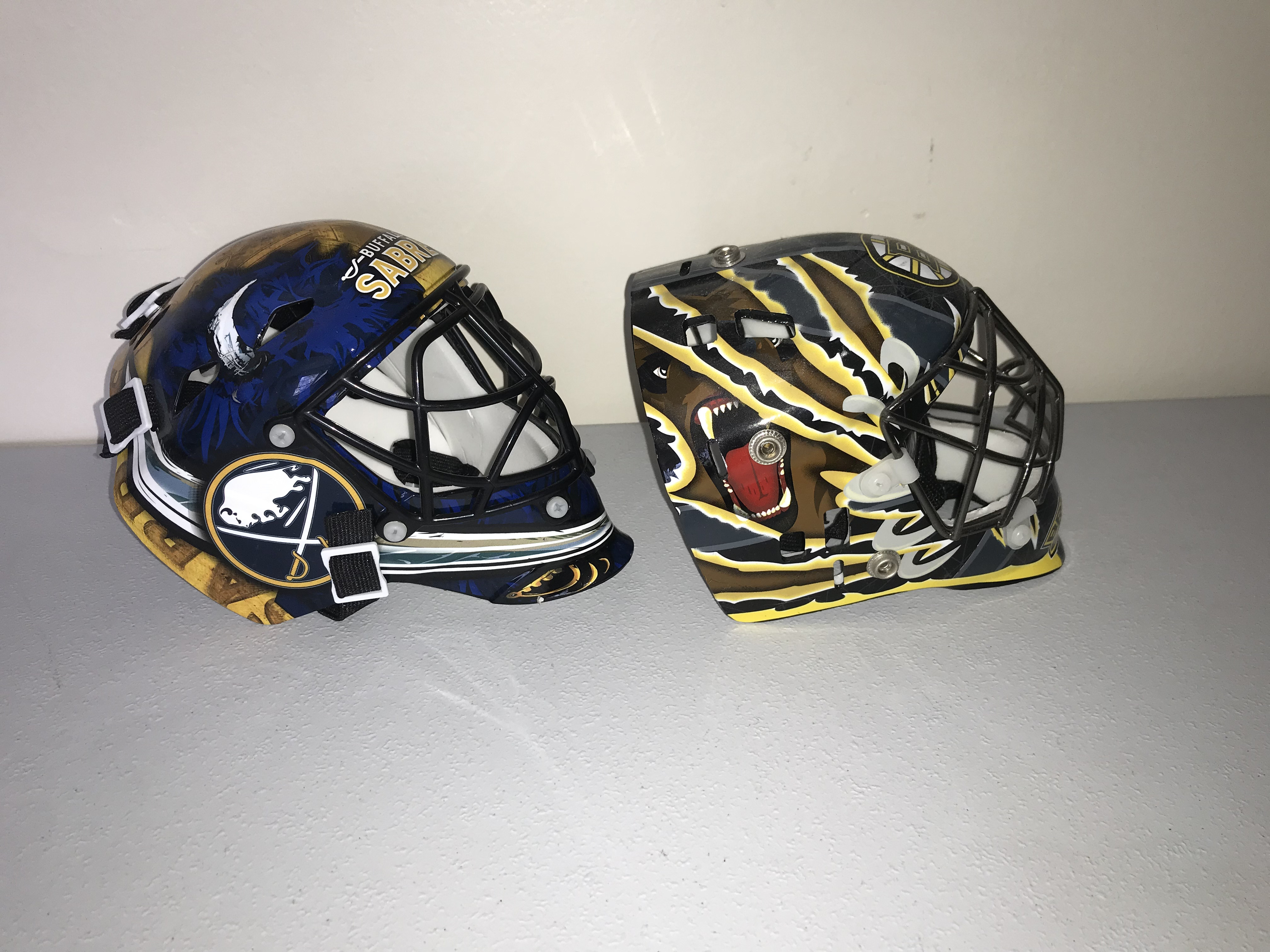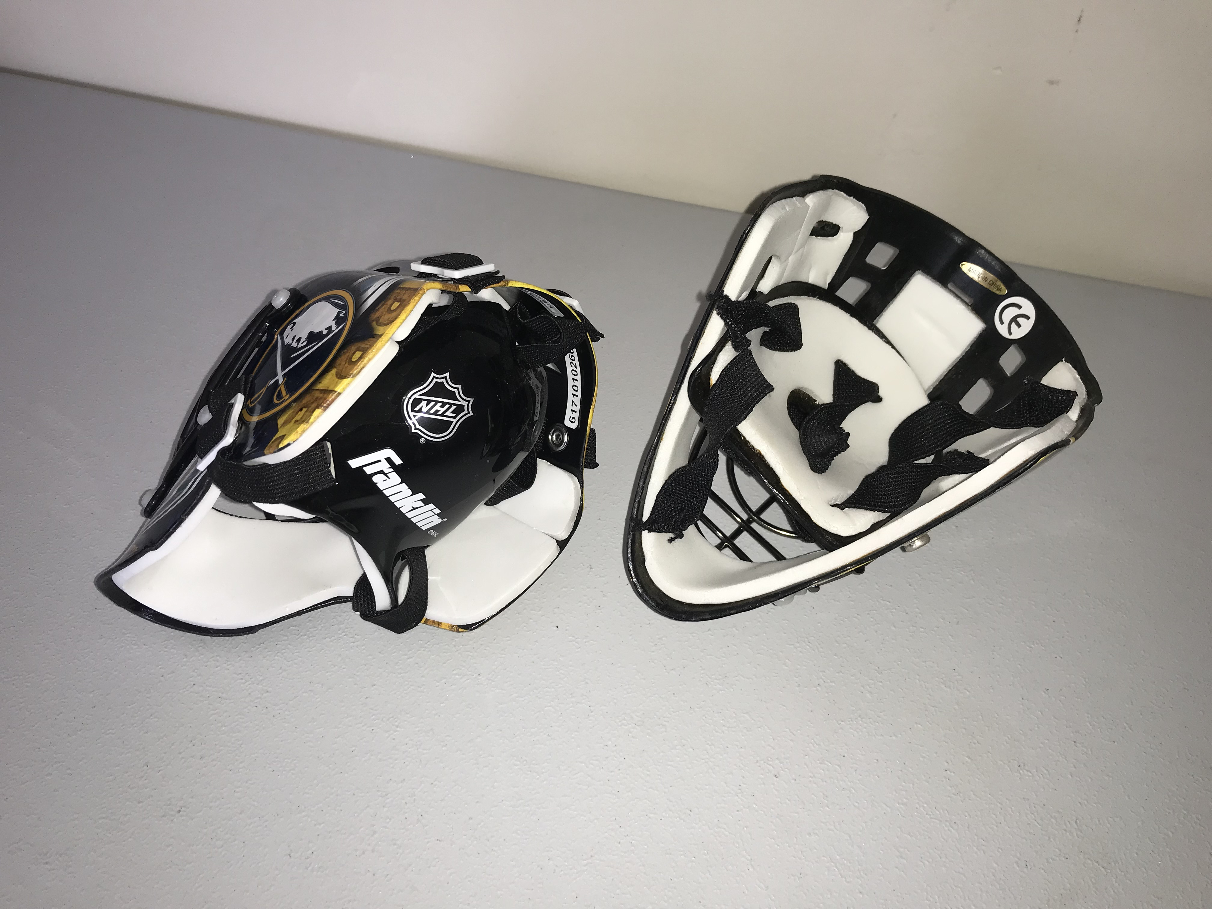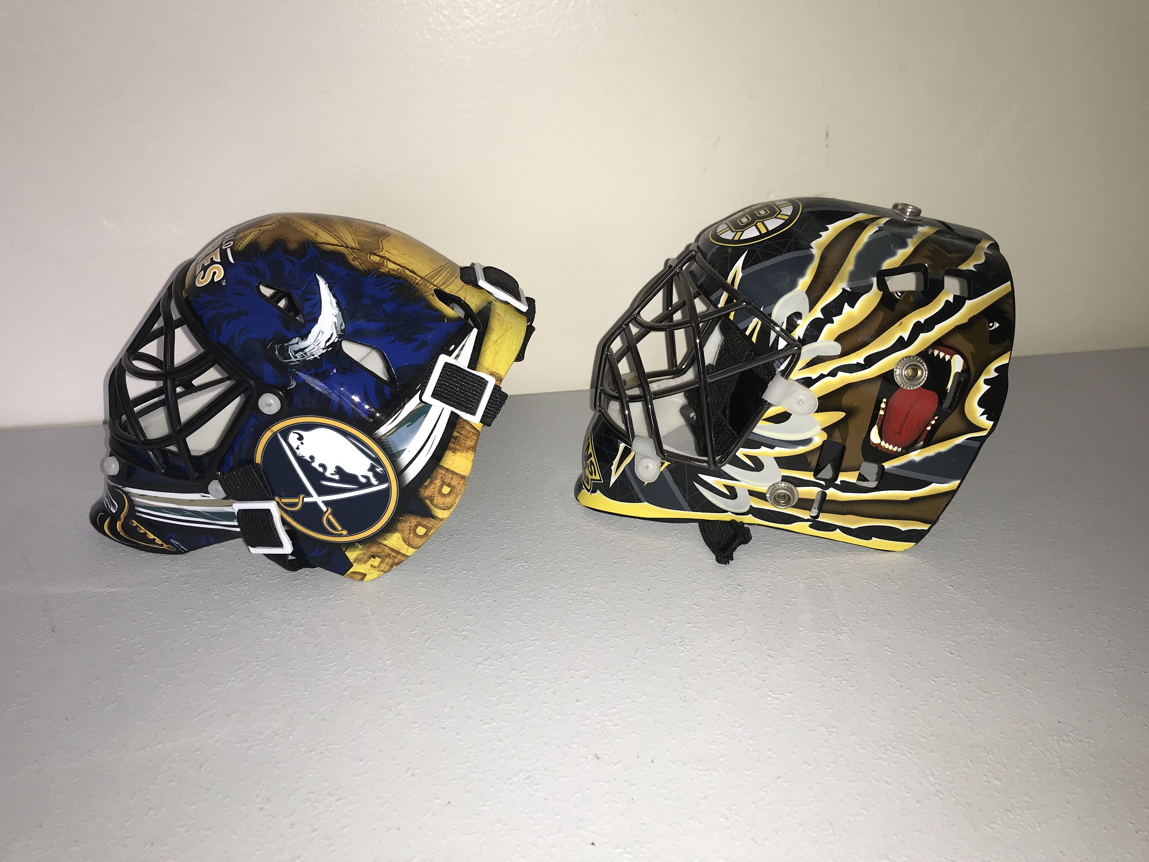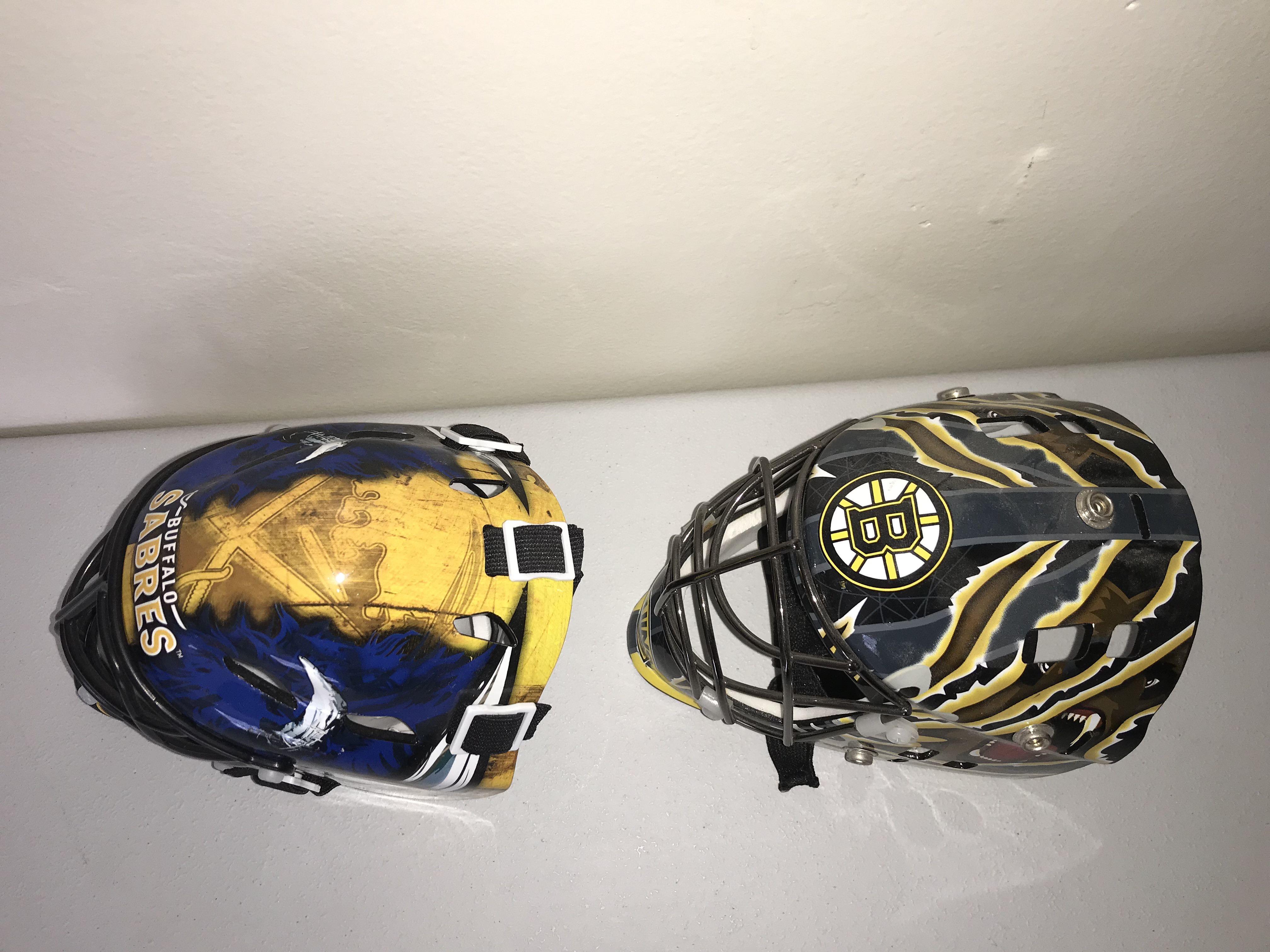 Franklin Sports street hockey goalie masks featuring National Hockey League team branding, early 21st century. The masks are constructed of molded plastic shells with black metal wire cages, internal foam padding, and adjustable elastic head straps. One mask displays Buffalo Sabres graphics including the primary logo and wordmark, while the other features Boston Bruins logos with stylized bear claw designs. Both items include the Franklin brand script, official NHL shield logos, and manufacturing labels.
