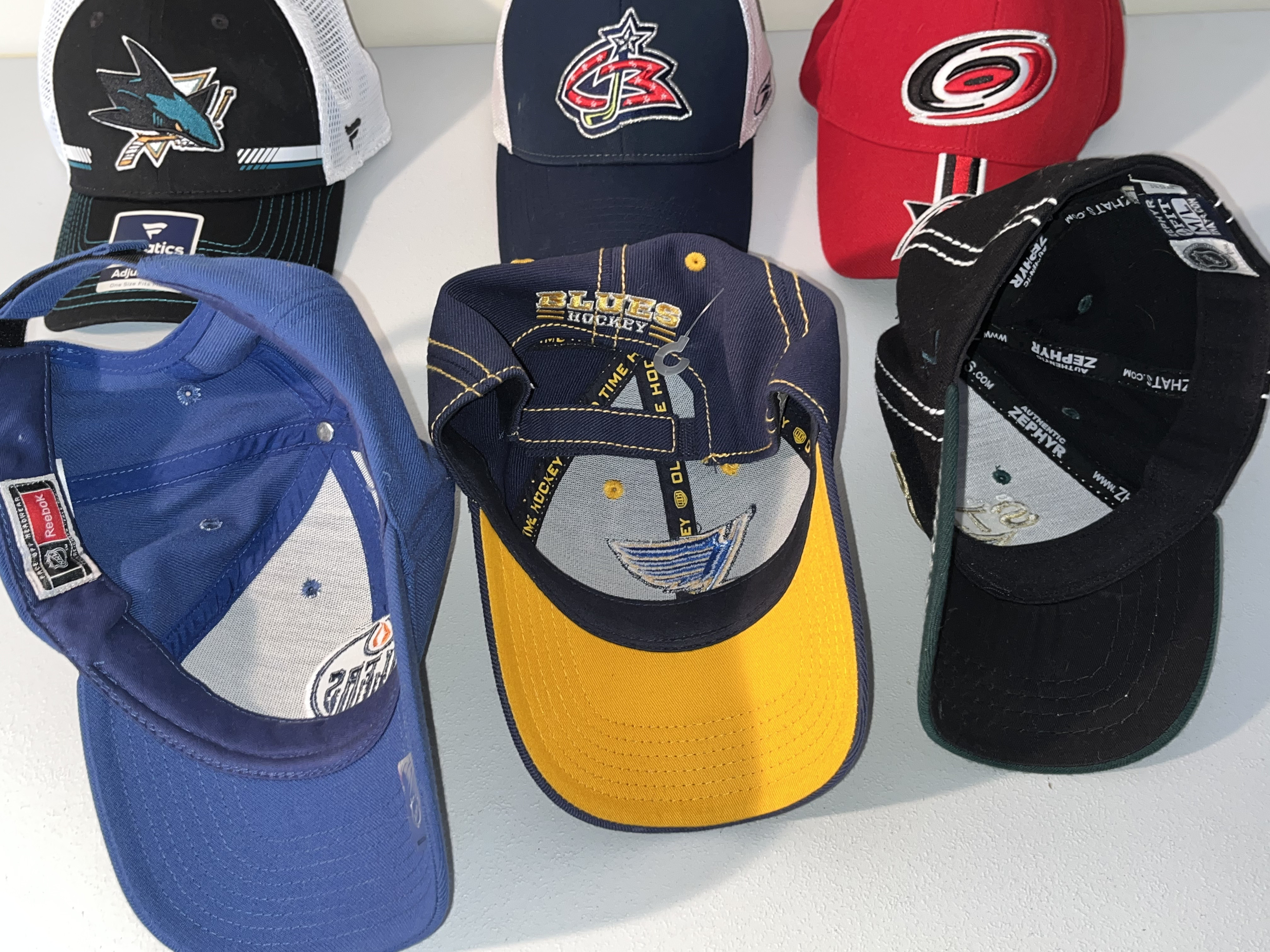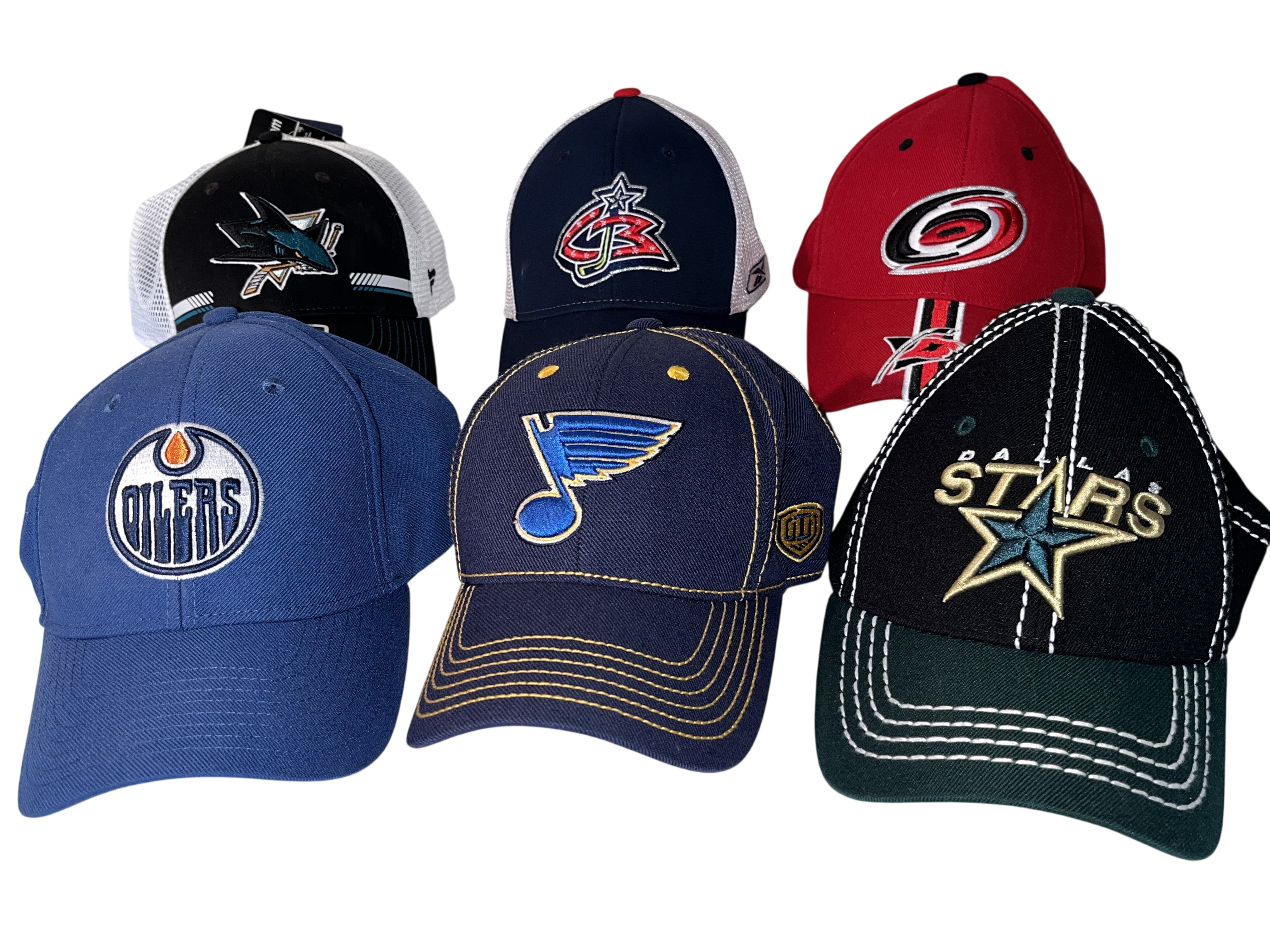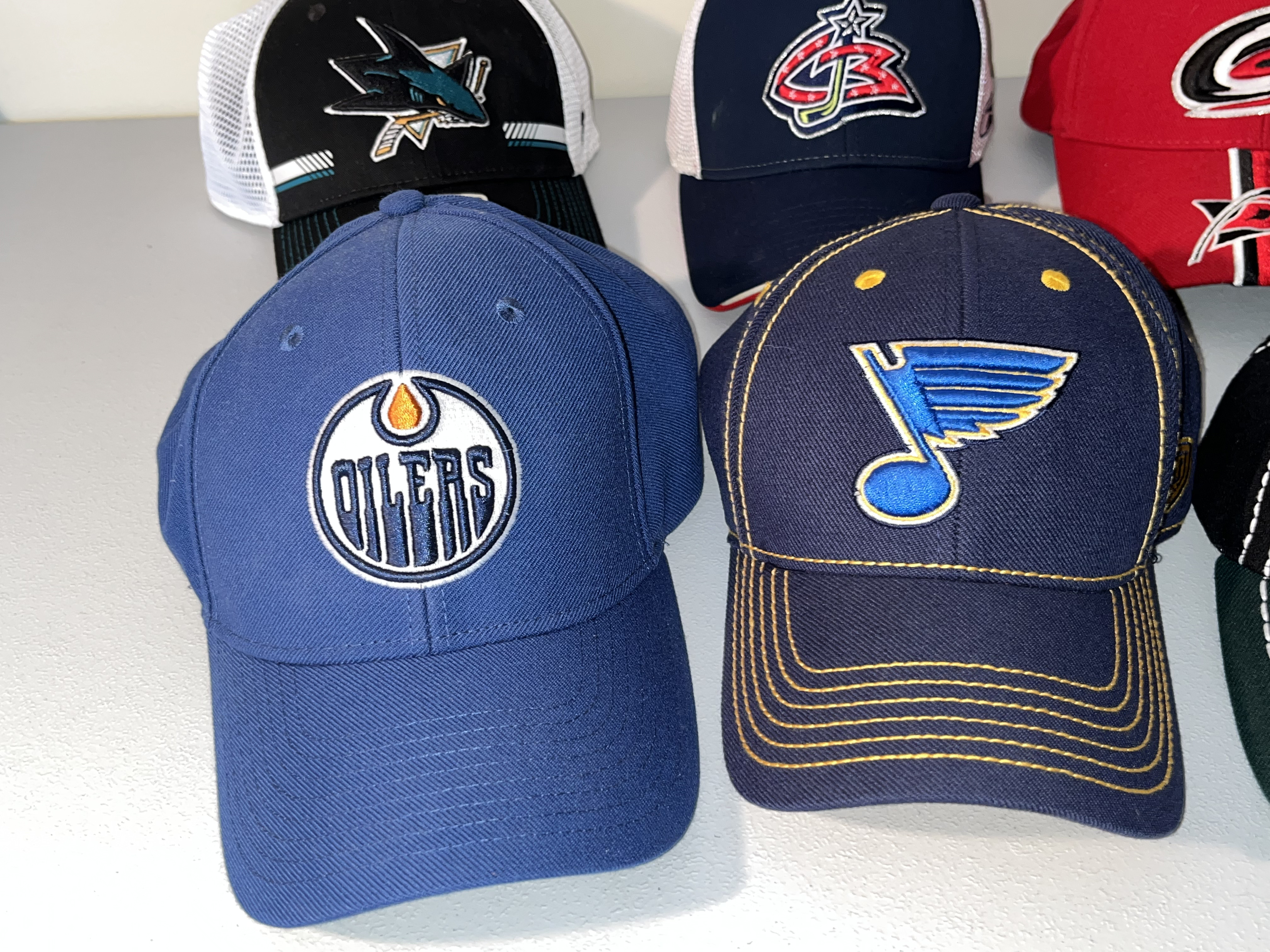 A collection of NHL team baseball caps from various franchises including the Oilers, Blues, Stars, Sharks, Blue Jackets, and Hurricanes.
