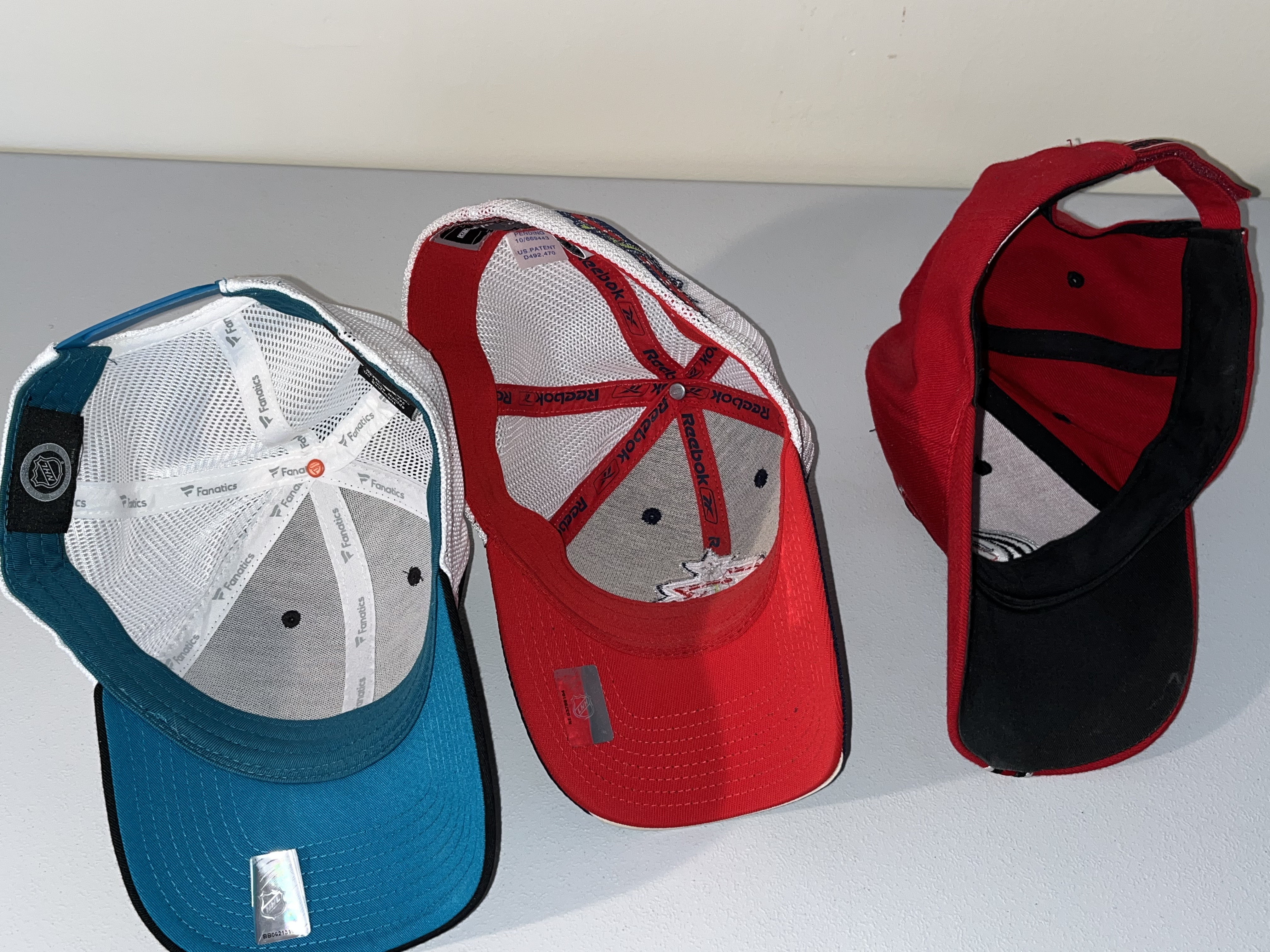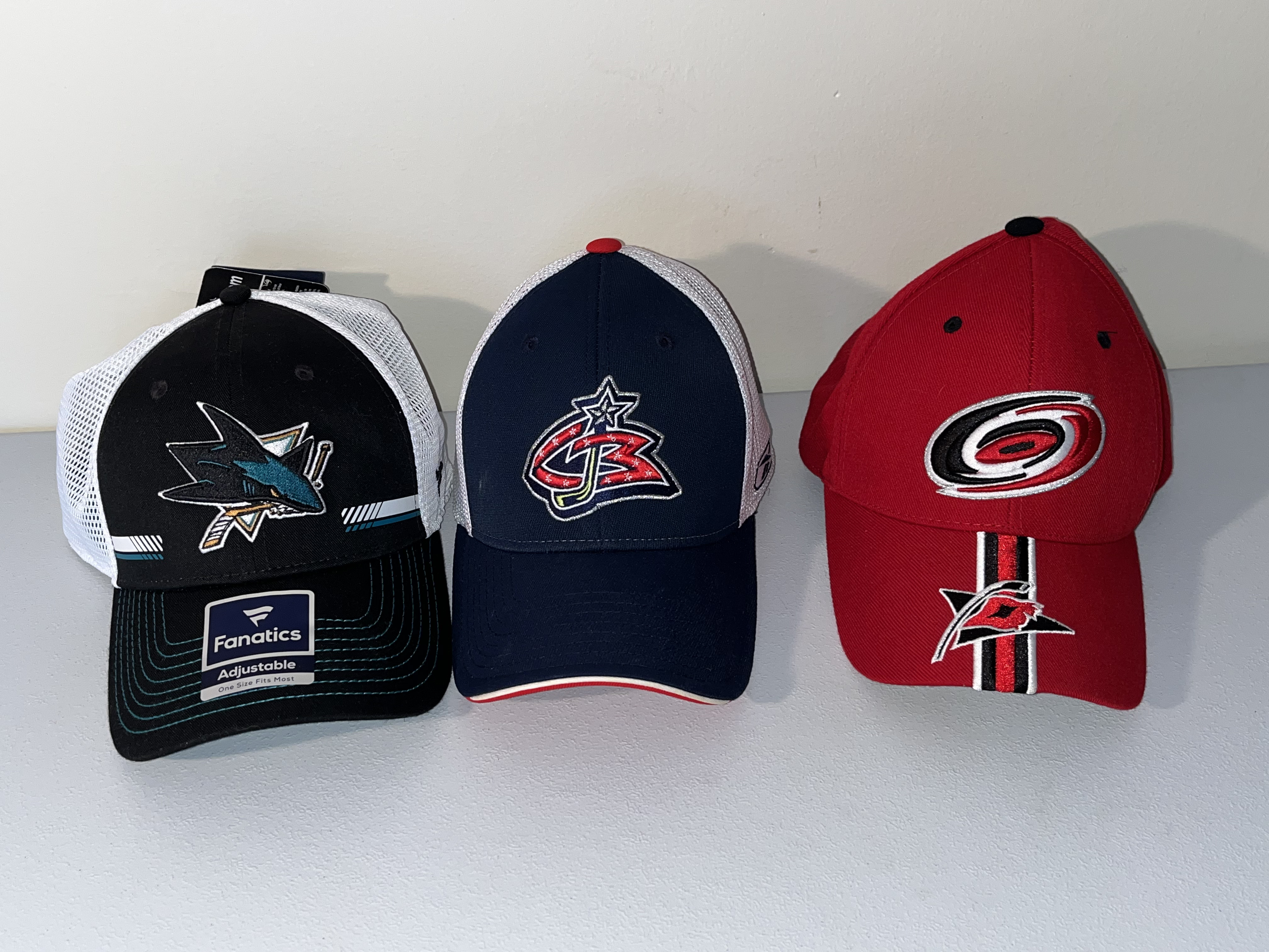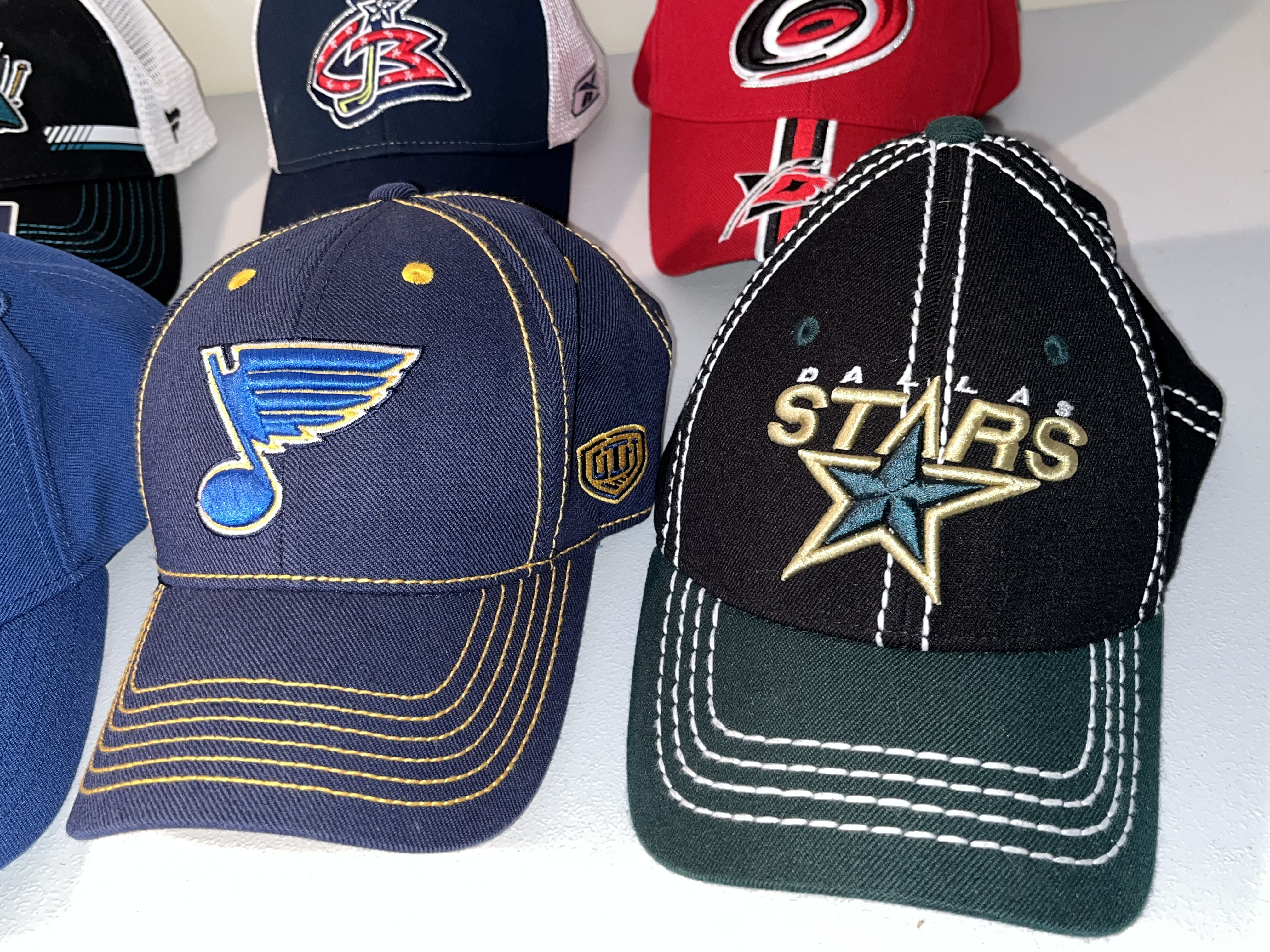 A collection of NHL team baseball caps from various franchises including the Oilers, Blues, Stars, Sharks, Blue Jackets, and Hurricanes.