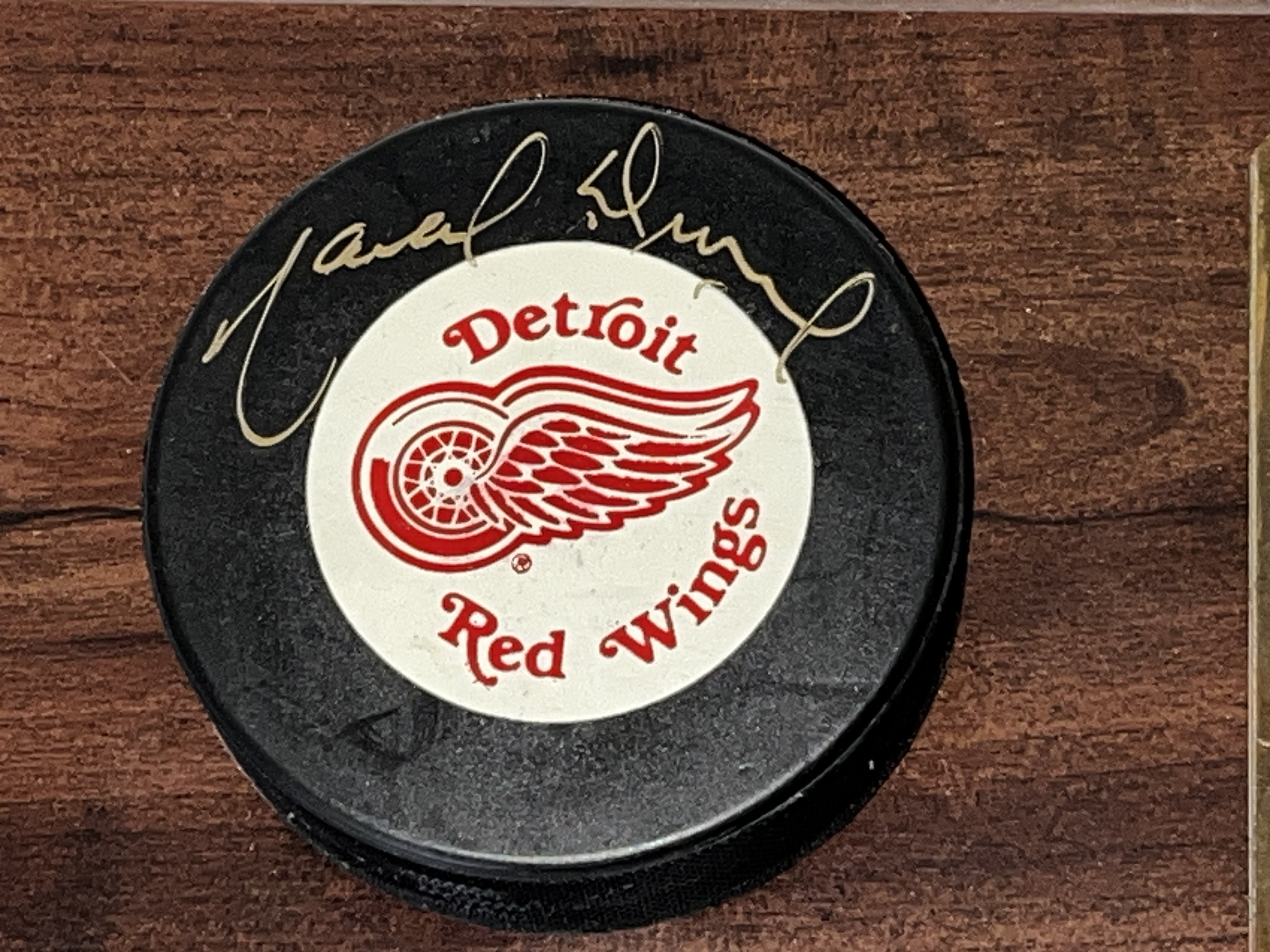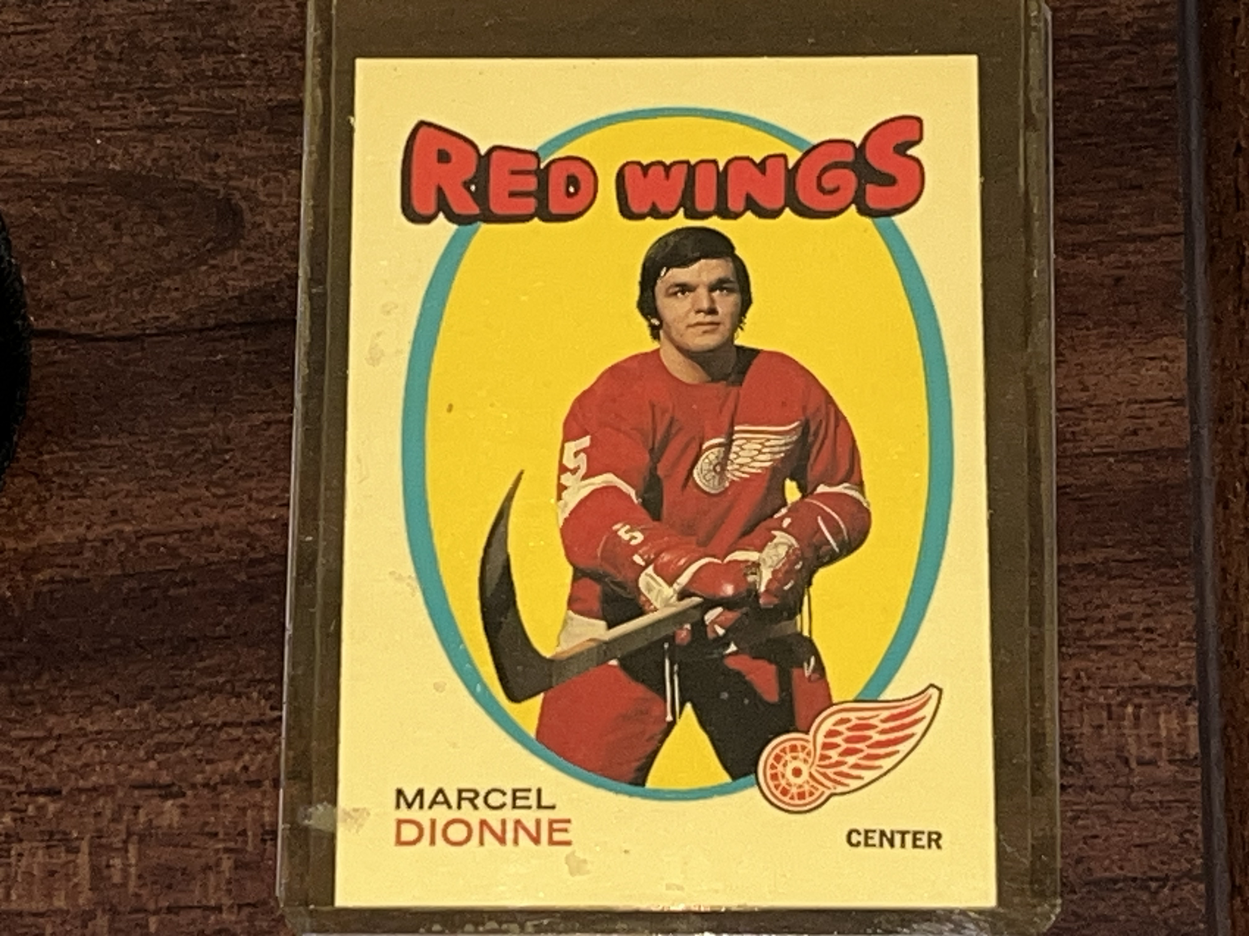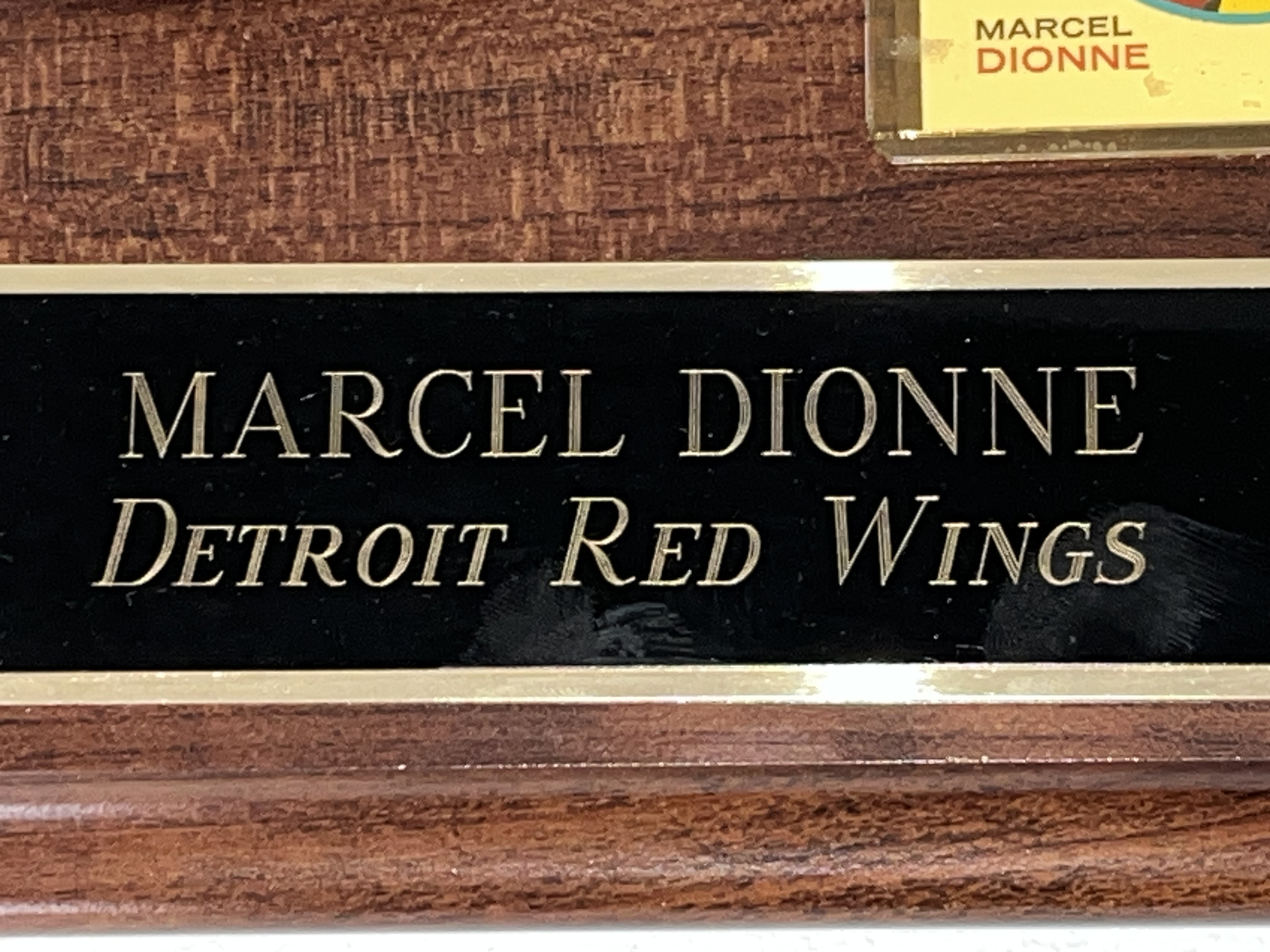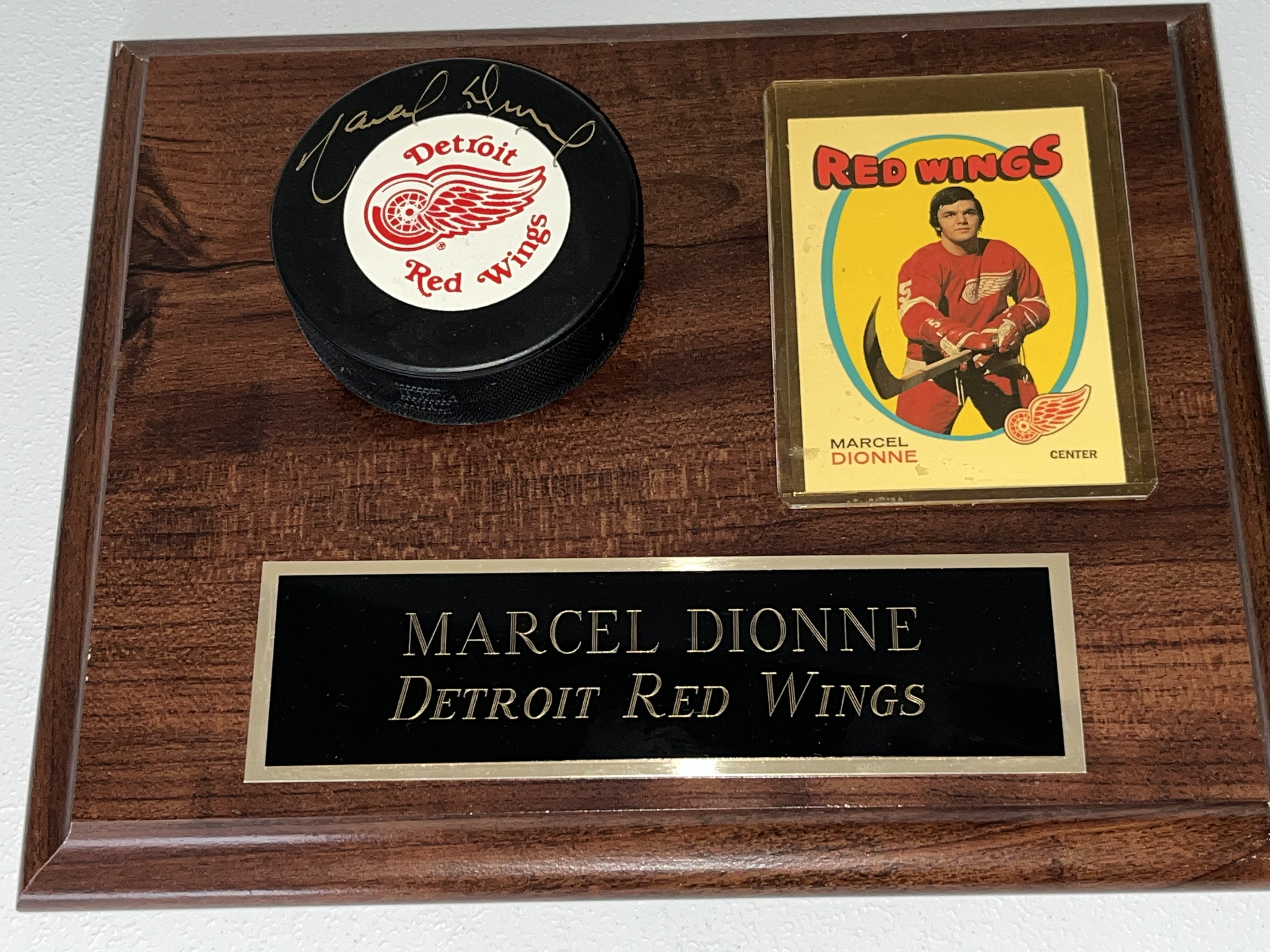 Marcel Dionne Detroit Red Wings commemorative wall plaque featuring an autographed hockey puck and vintage trading card. The assembly includes a hand-signed puck with team logo decal, a 1974-75 Topps Marcel Dionne card number 170, and an engraved metal nameplate. All components are mounted to a beveled wood base; no third-party authentication is provided.