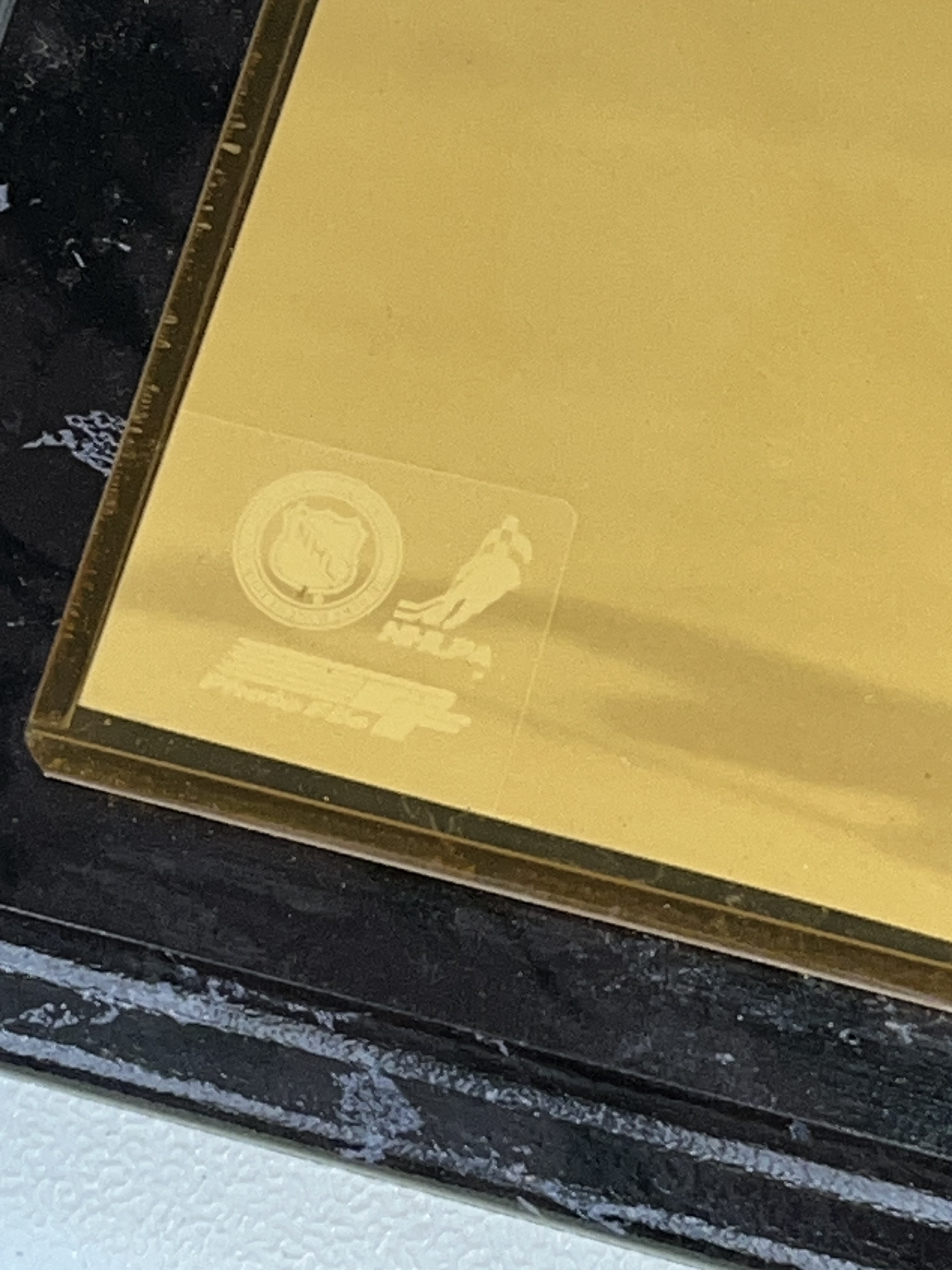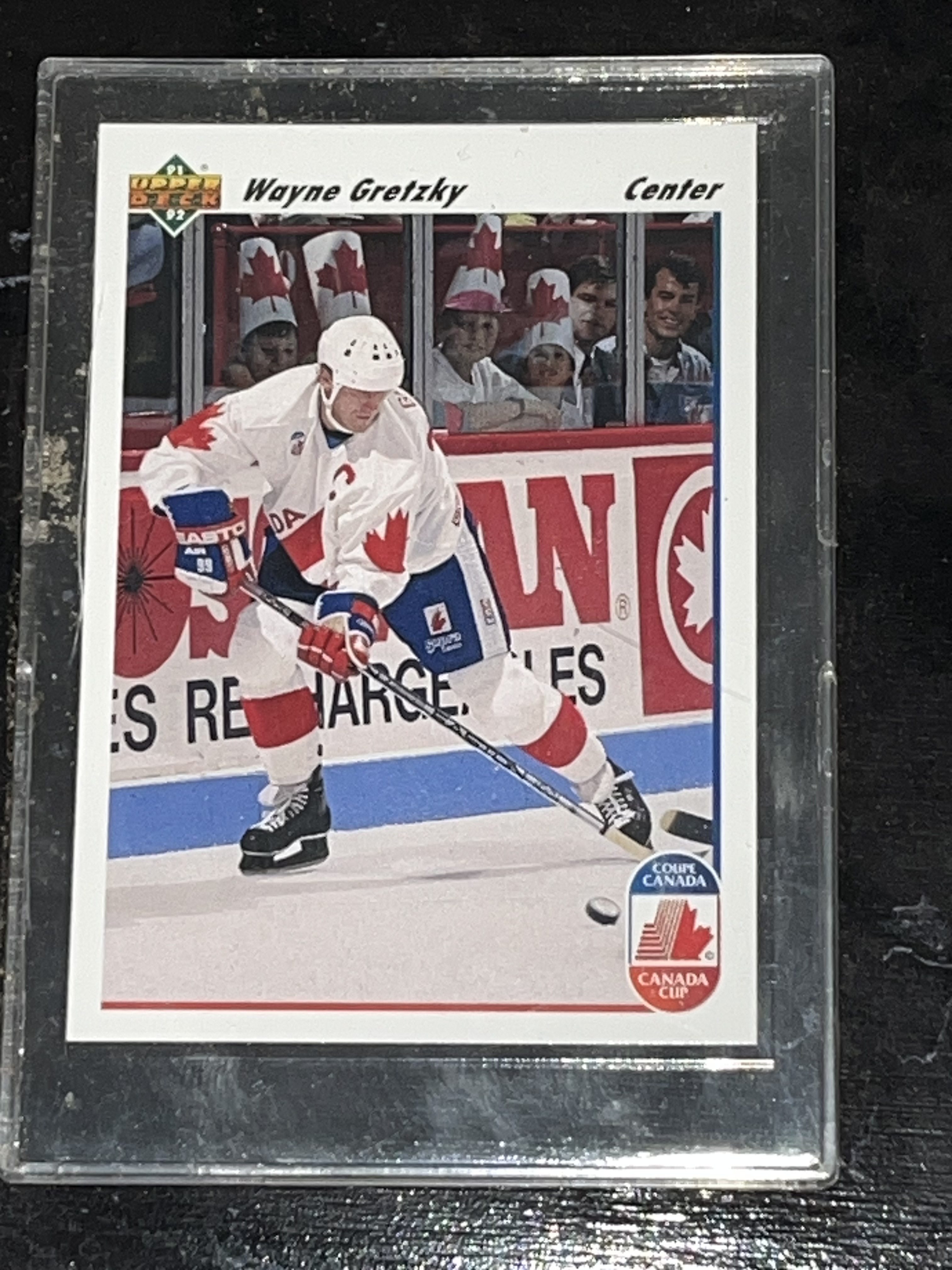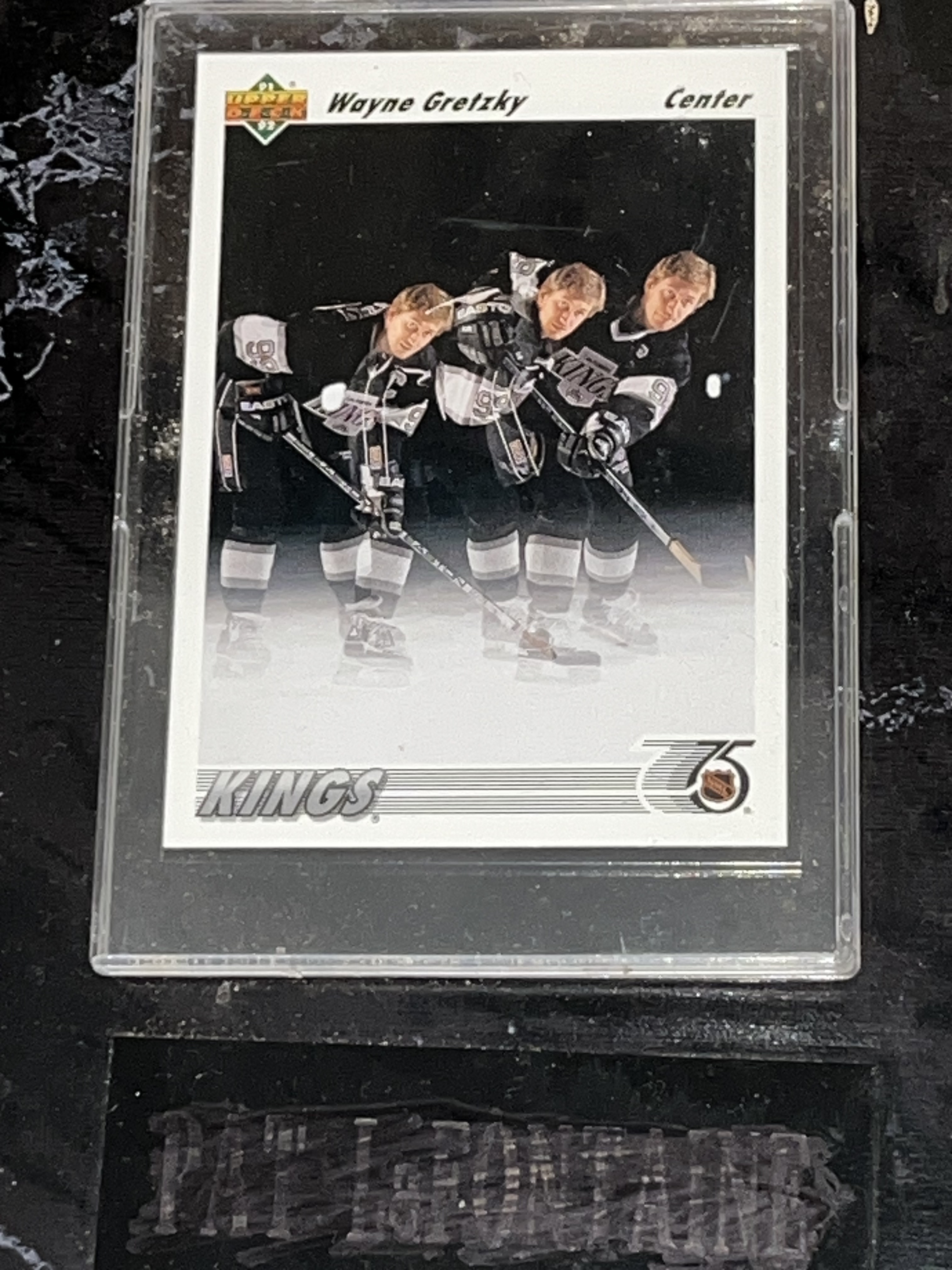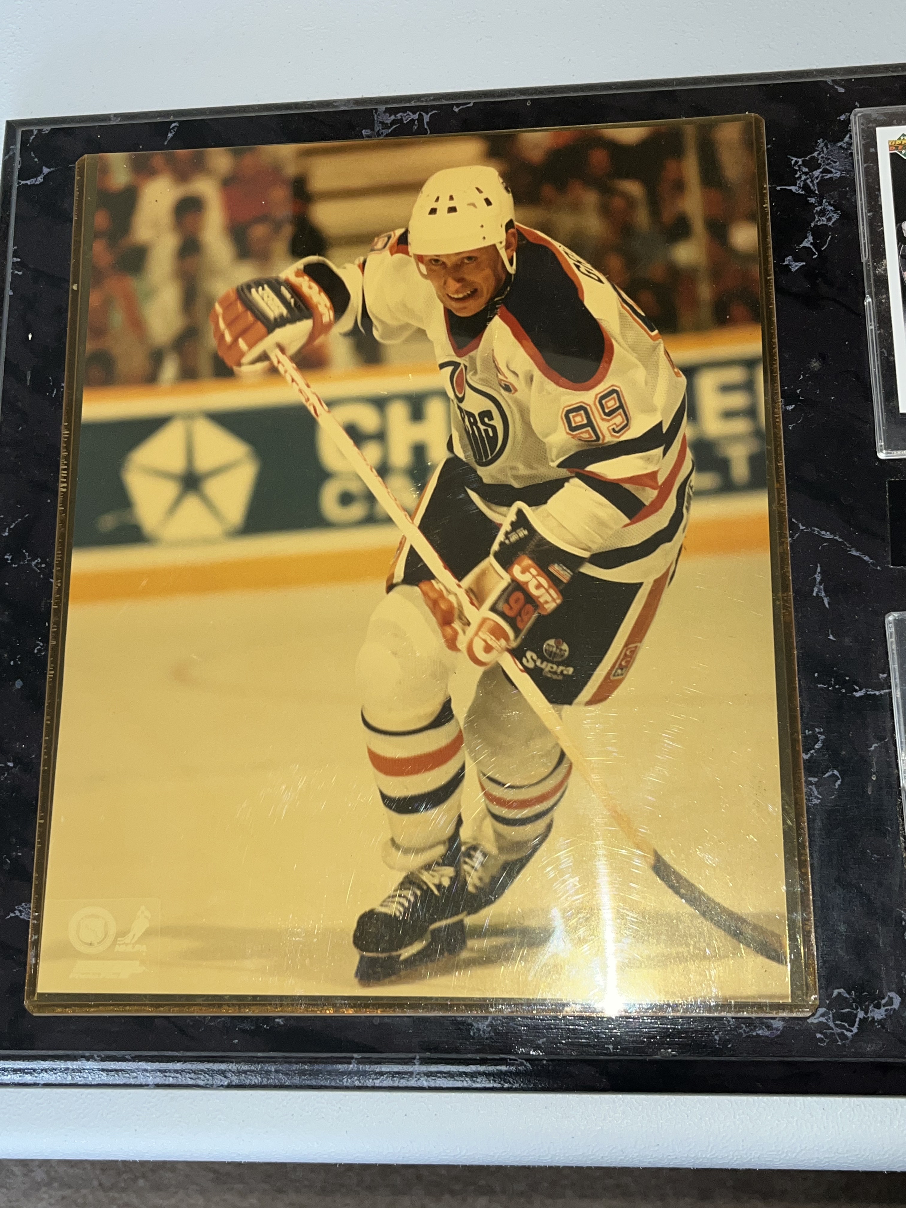Wayne Gretzky sports memorabilia plaque, circa 1992. The assembly features a central metallic-finish photograph of Gretzky in an Edmonton Oilers uniform flanked by two 1991-92 Upper Deck trading cards. The items are mounted on a black marble-patterned wooden base featuring official NHL and NHLPA logos and a mismatched nameplate for Pat LaFontaine.